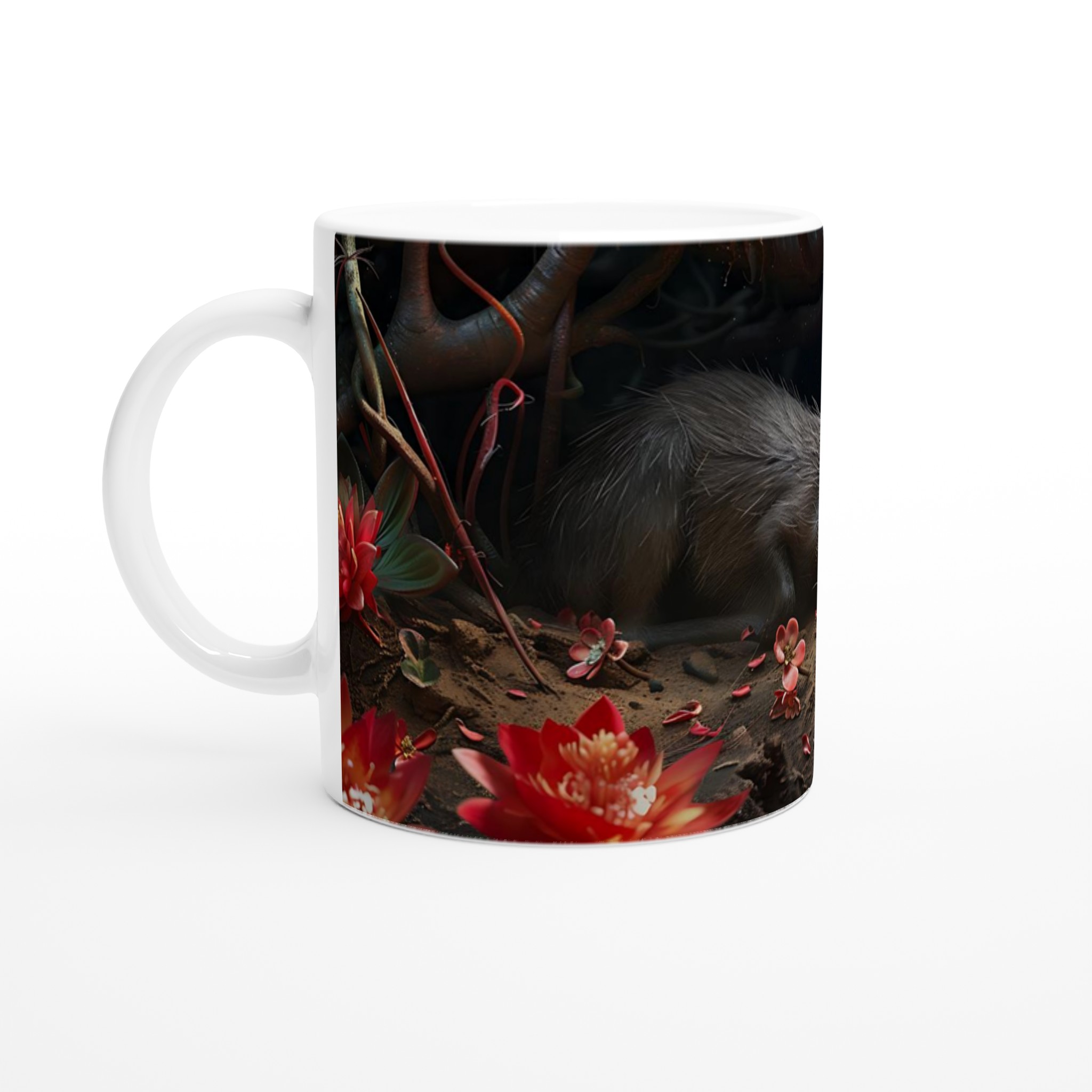 Låt den mystiska charmen från en liten skogsmus som tassar bland djupröda fantasiblommor inspirera din dag. Denna unika design, med sin mörka, drömska palett och oväntade detaljer, ger din fika en touch av förtrollning. Den blanka vita ytan ger ett skarpt och levande tryck som verkligen sticker ut, oavsett om det är en personlig design, ett roligt citat eller en present till någon du tycker om.
