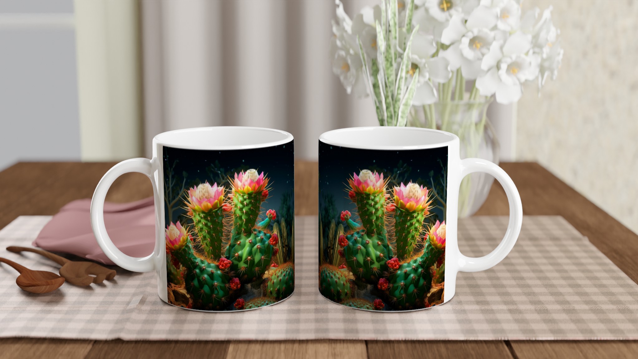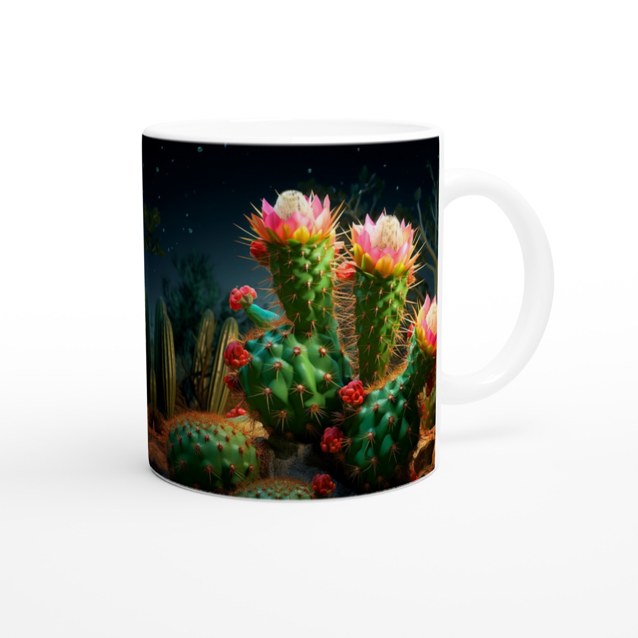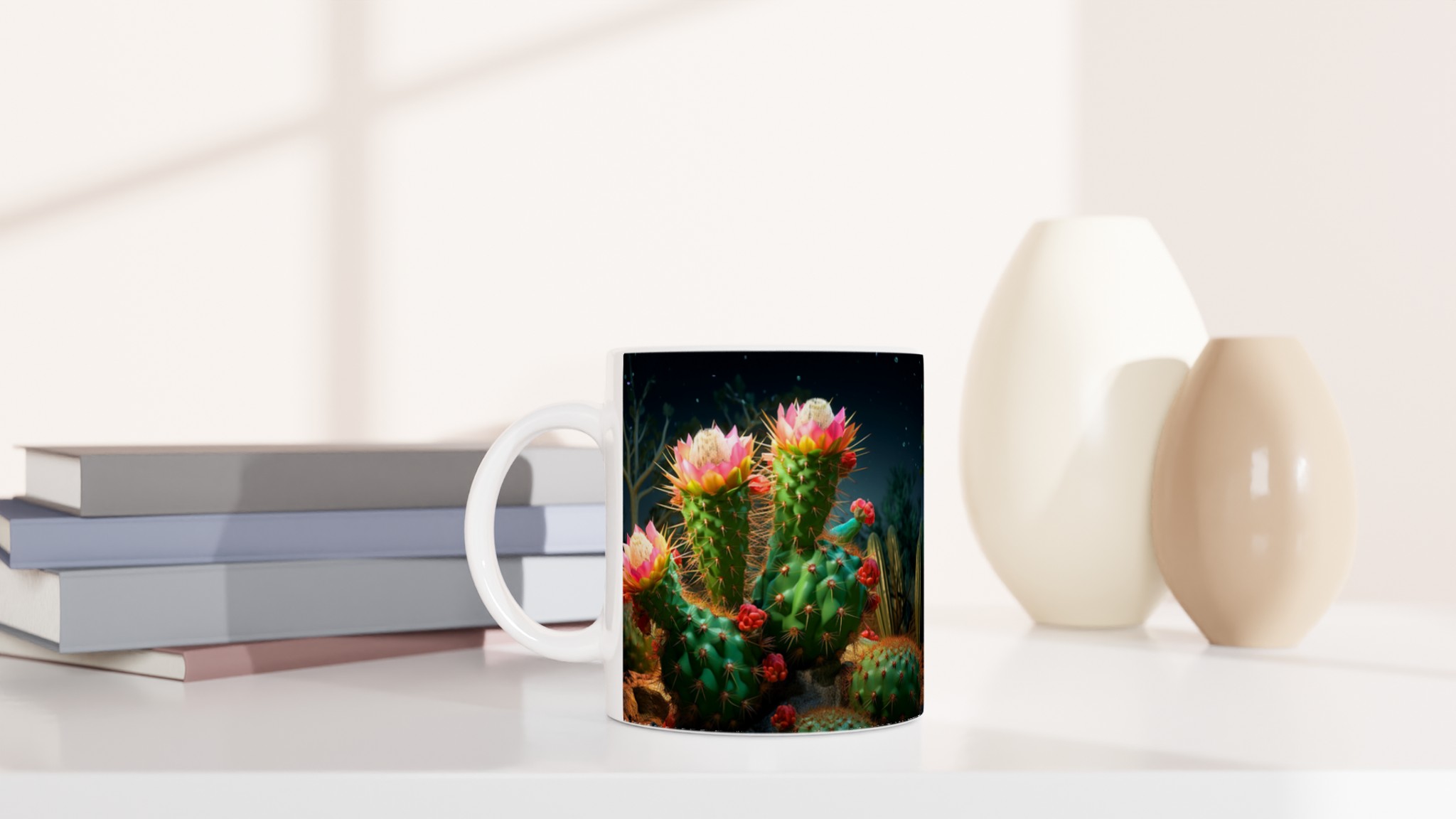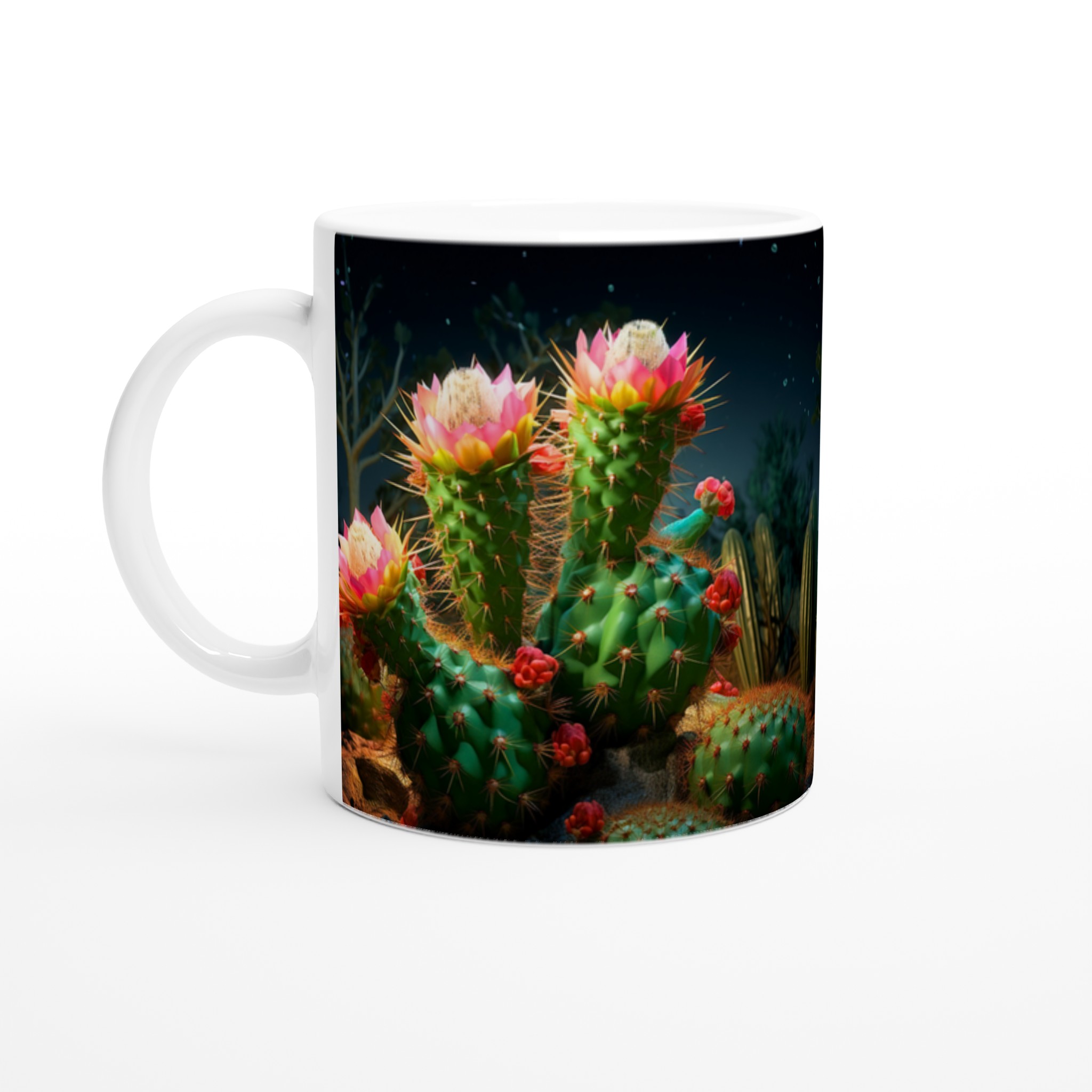 Fånga den fängslande skönheten hos en nattblomstrande kaktus med denna stilrena keramiska mugg. Dess design, inspirerad av den mystiska ökenfloran och dess livfulla rosa blommor mot en mörk bakgrund, förvandlar varje sipp till en stunds avkoppling. Perfekt för morgonkaffet, kvällens varma choklad eller när du bara vill njuta av en kopp te. Den blanka vita ytan gör att trycken framhävs med klara och levande färger, som håller sig fina även efter många turer i mikron och diskmaskinen.