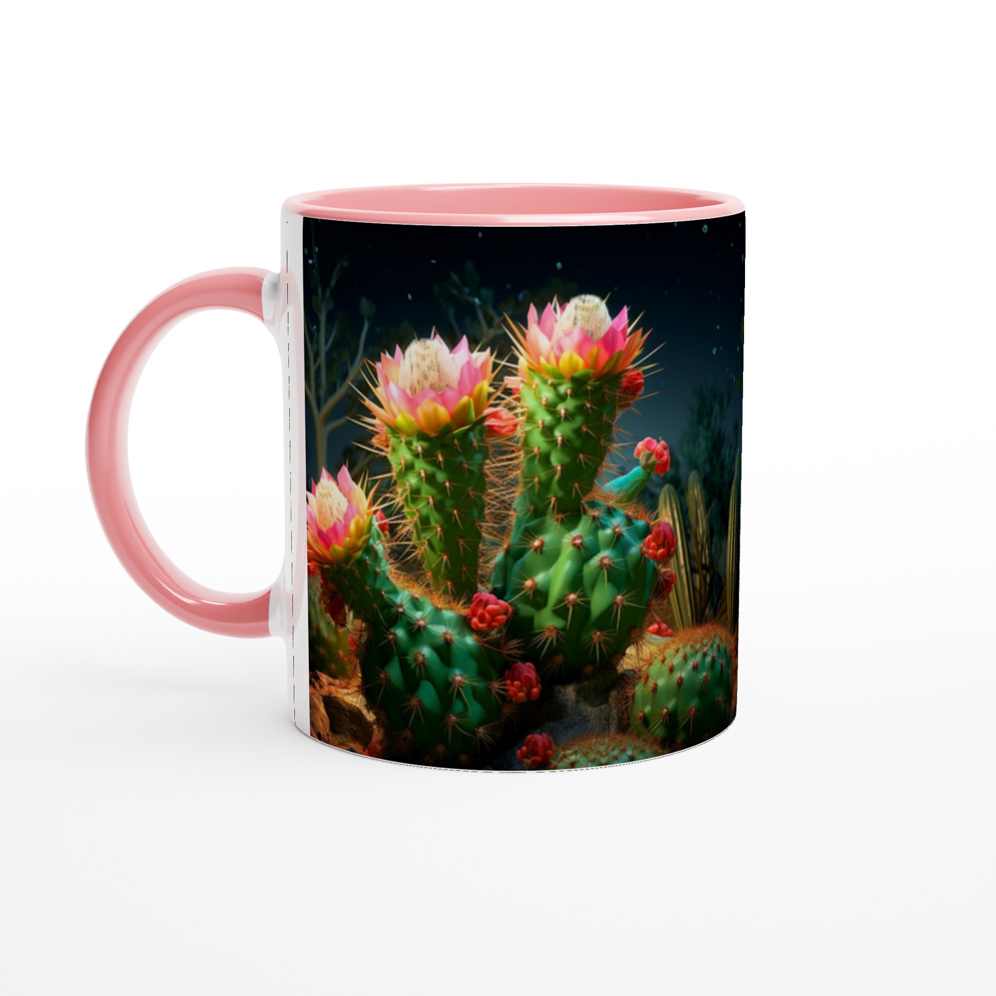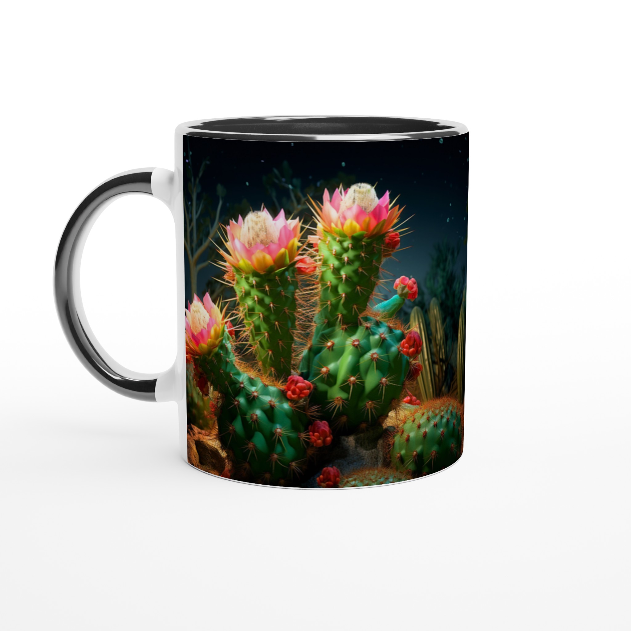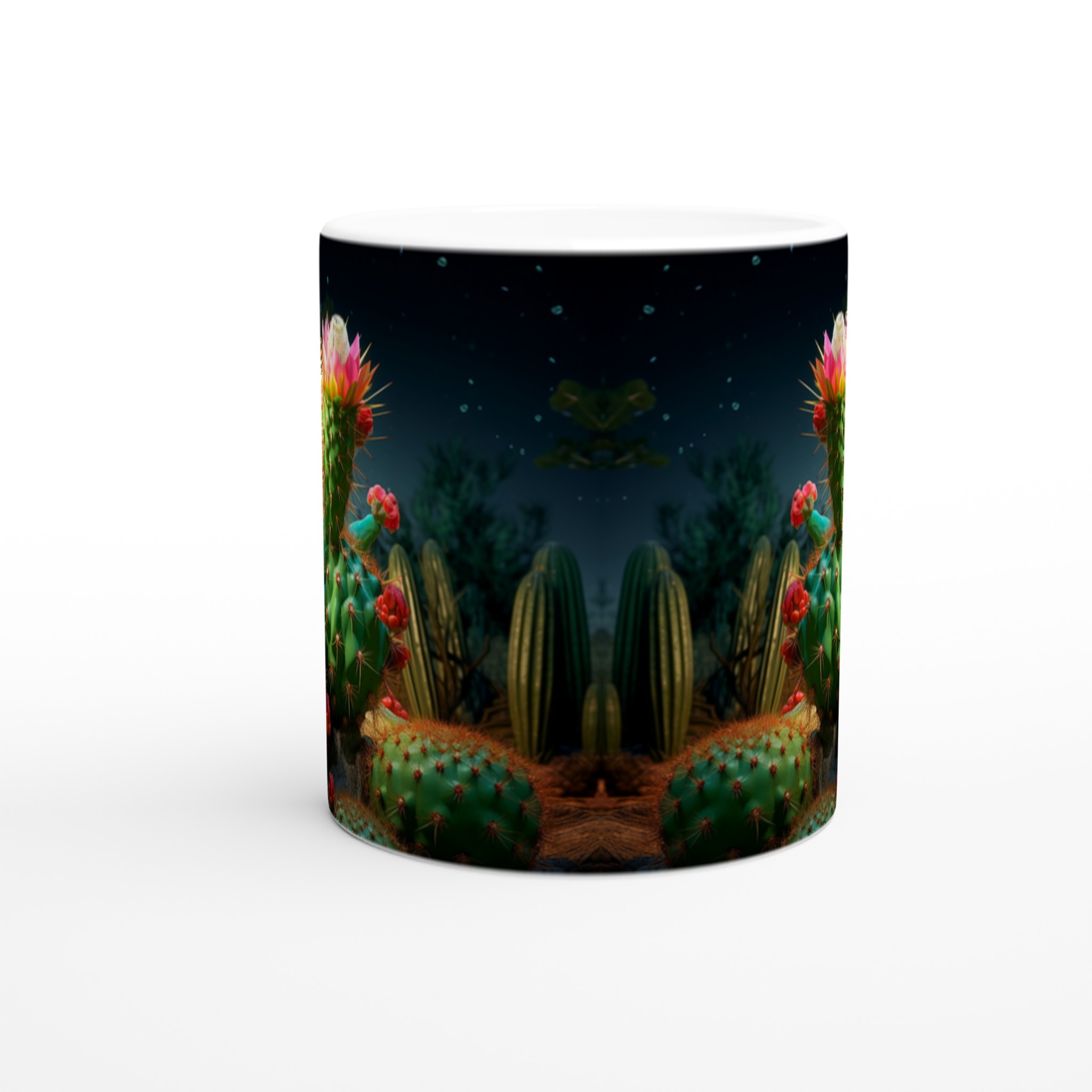 Fånga den fängslande skönheten hos en nattblomstrande kaktus med denna stilrena keramiska mugg. Dess design, inspirerad av den mystiska ökenfloran och dess livfulla rosa blommor mot en mörk bakgrund, förvandlar varje sipp till en stunds avkoppling. Perfekt för morgonkaffet, kvällens varma choklad eller när du bara vill njuta av en kopp te. Den blanka vita ytan gör att trycken framhävs med klara och levande färger, som håller sig fina även efter många turer i mikron och diskmaskinen.