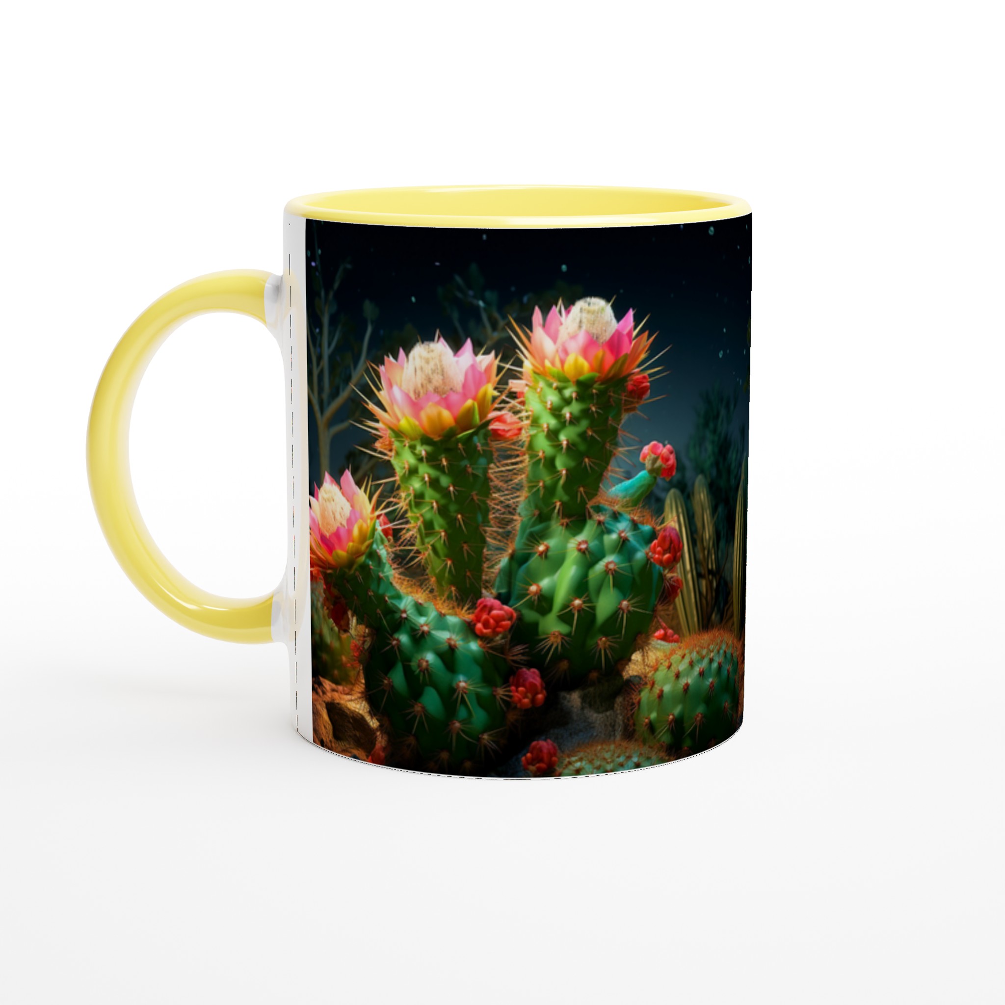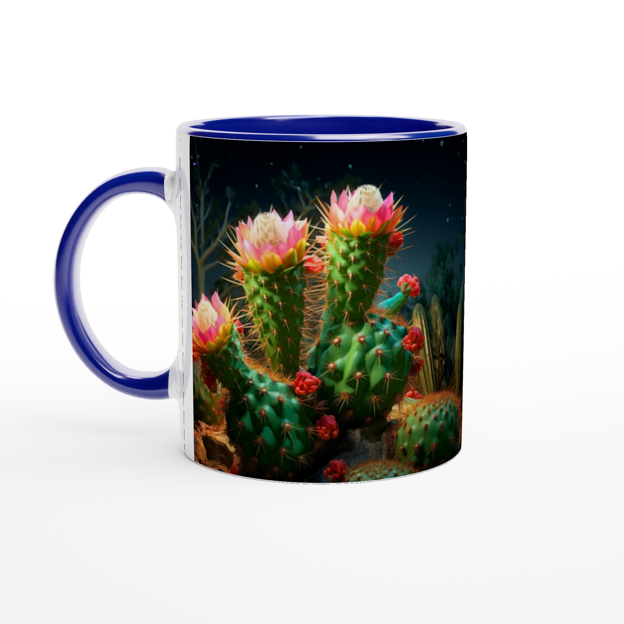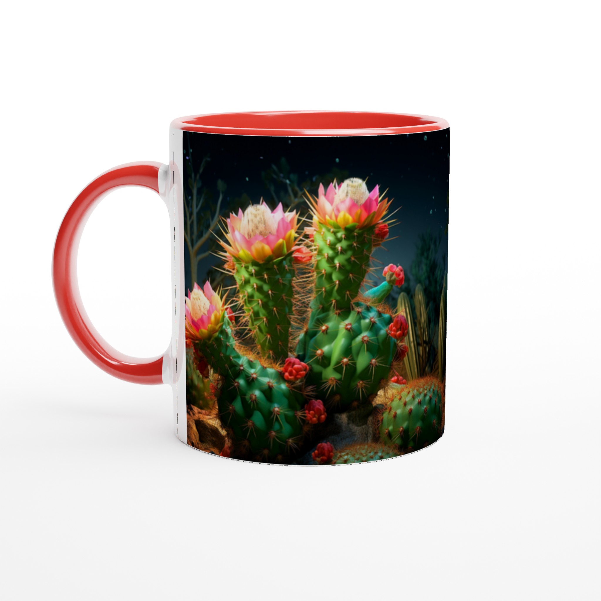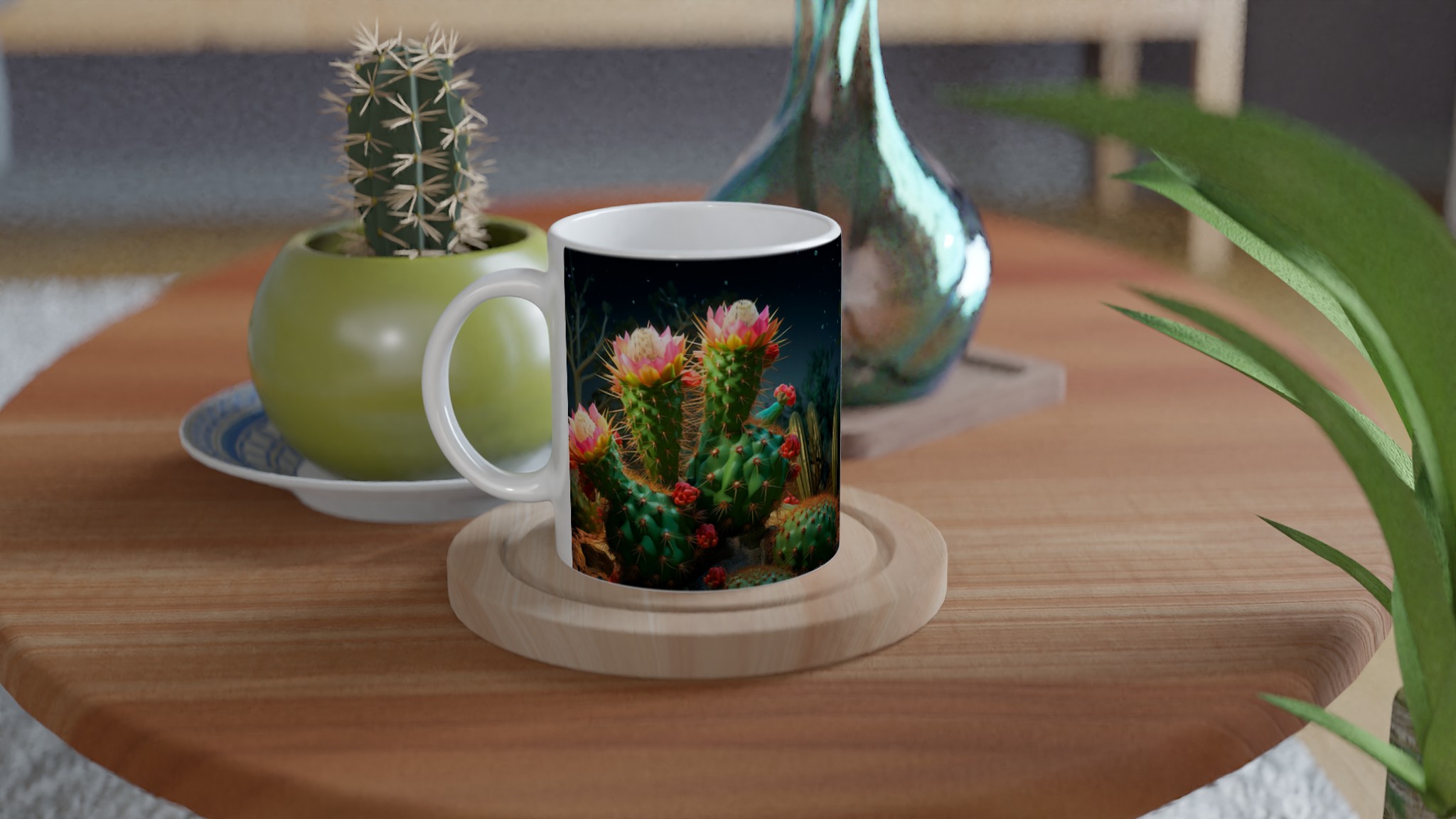 Fånga den fängslande skönheten hos en nattblomstrande kaktus med denna stilrena keramiska mugg. Dess design, inspirerad av den mystiska ökenfloran och dess livfulla rosa blommor mot en mörk bakgrund, förvandlar varje sipp till en stunds avkoppling. Perfekt för morgonkaffet, kvällens varma choklad eller när du bara vill njuta av en kopp te. Den blanka vita ytan gör att trycken framhävs med klara och levande färger, som håller sig fina även efter många turer i mikron och diskmaskinen.