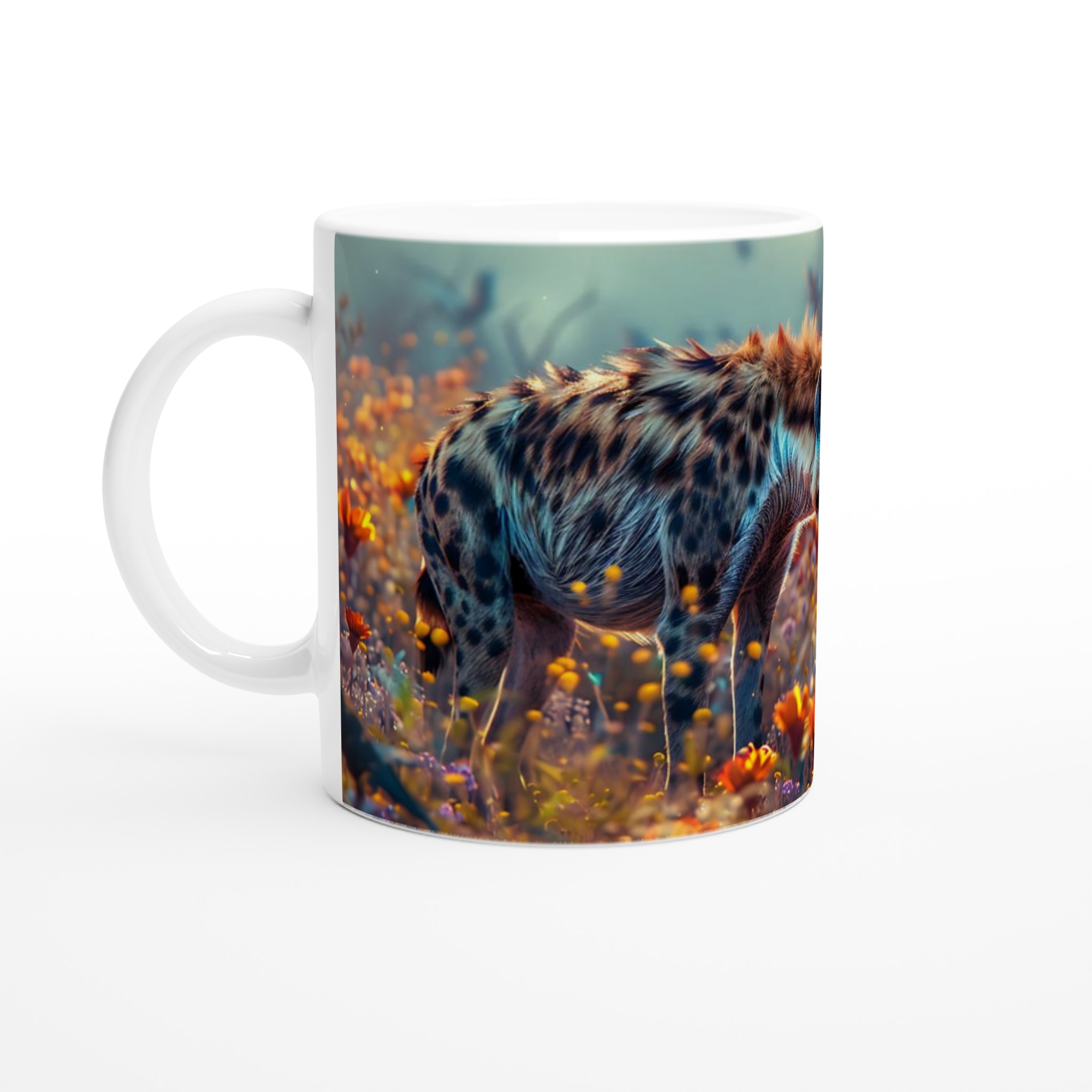 Inspirerad av den fängslande mystiken hos en hyena omgiven av ett drömskt blomsterlandskap, ger denna mugg en touch av vild skönhet till din vardag. De levande färgerna och det eteriska skenet fångar ögat och bjuder in till kontemplation med varje klunk. Den blanka vita ytan ger ett skarpt och levande tryck som verkligen sticker ut, oavsett om det är en personlig design, ett roligt citat eller en present till någon du tycker om.