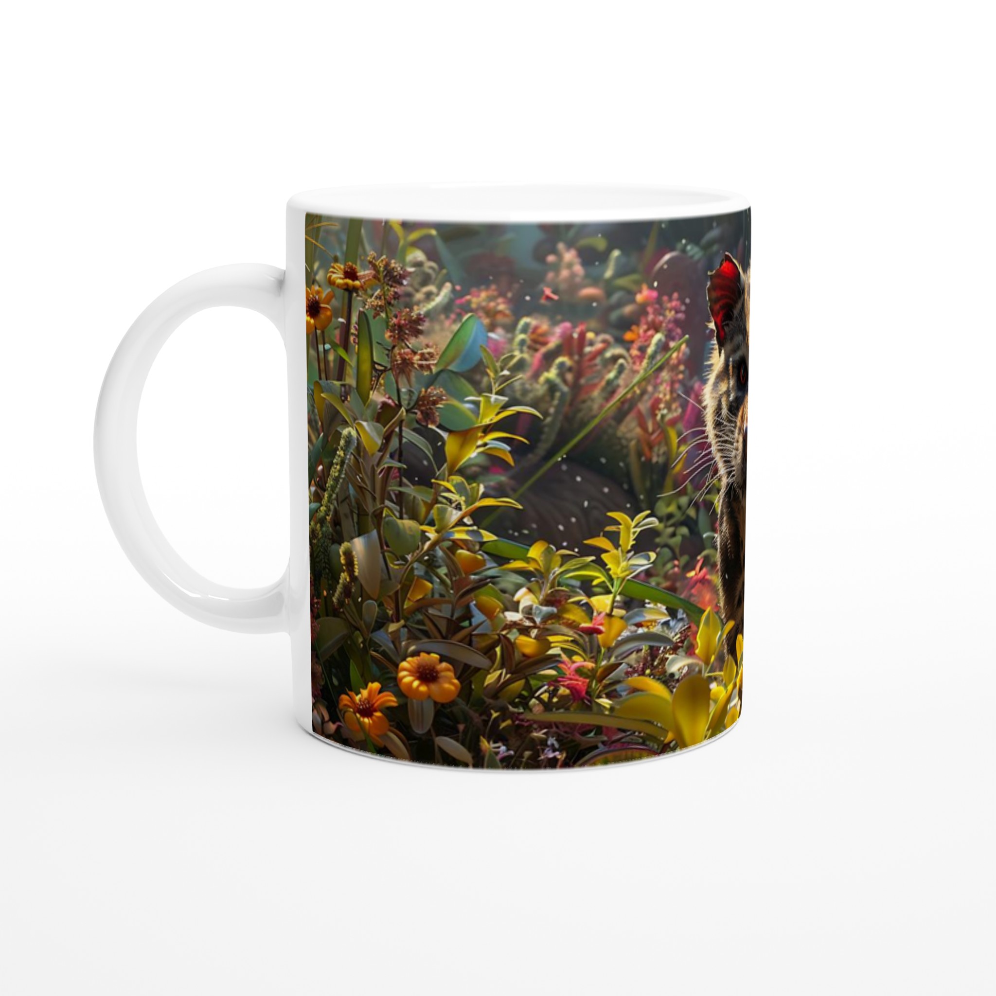 Inspirerad av den mystiska skönheten hos en leopardkatt som smyger fram ur en färgsprakande blomsterträdgård, fångar denna mugg naturens vildhet och charm. De varma tonerna av guld, rött och grönt i blommorna och kattens vaksamma blick ger en känsla av äventyr till din dag.