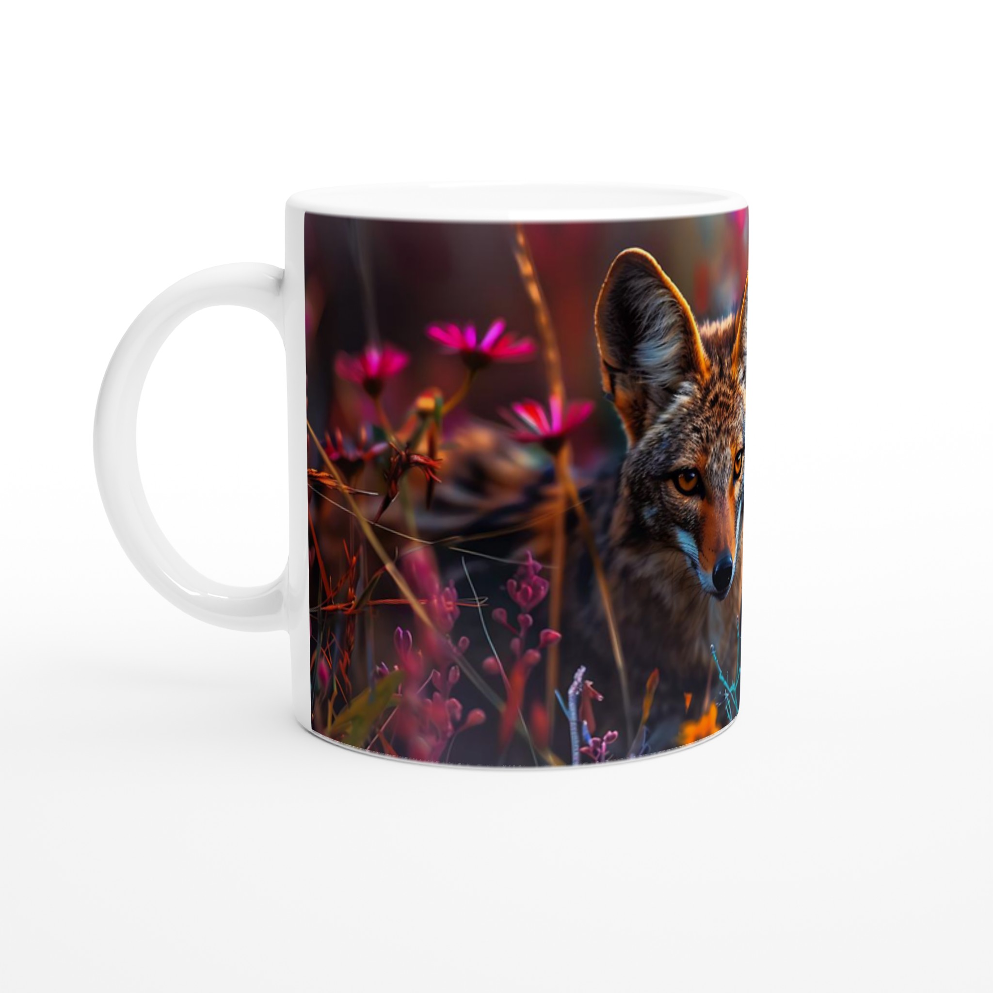 Inspirerad av den mystiska skönheten hos en prärievarg omgiven av en förtrollande äng med blommor i blommande rosa, orange och lila, fångar denna mugg en känsla av vildmark och magi. Den blanka vita ytan ger ett skarpt och levande tryck som verkligen sticker ut, oavsett om det är en personlig design, ett roligt citat eller en present till någon du tycker om.