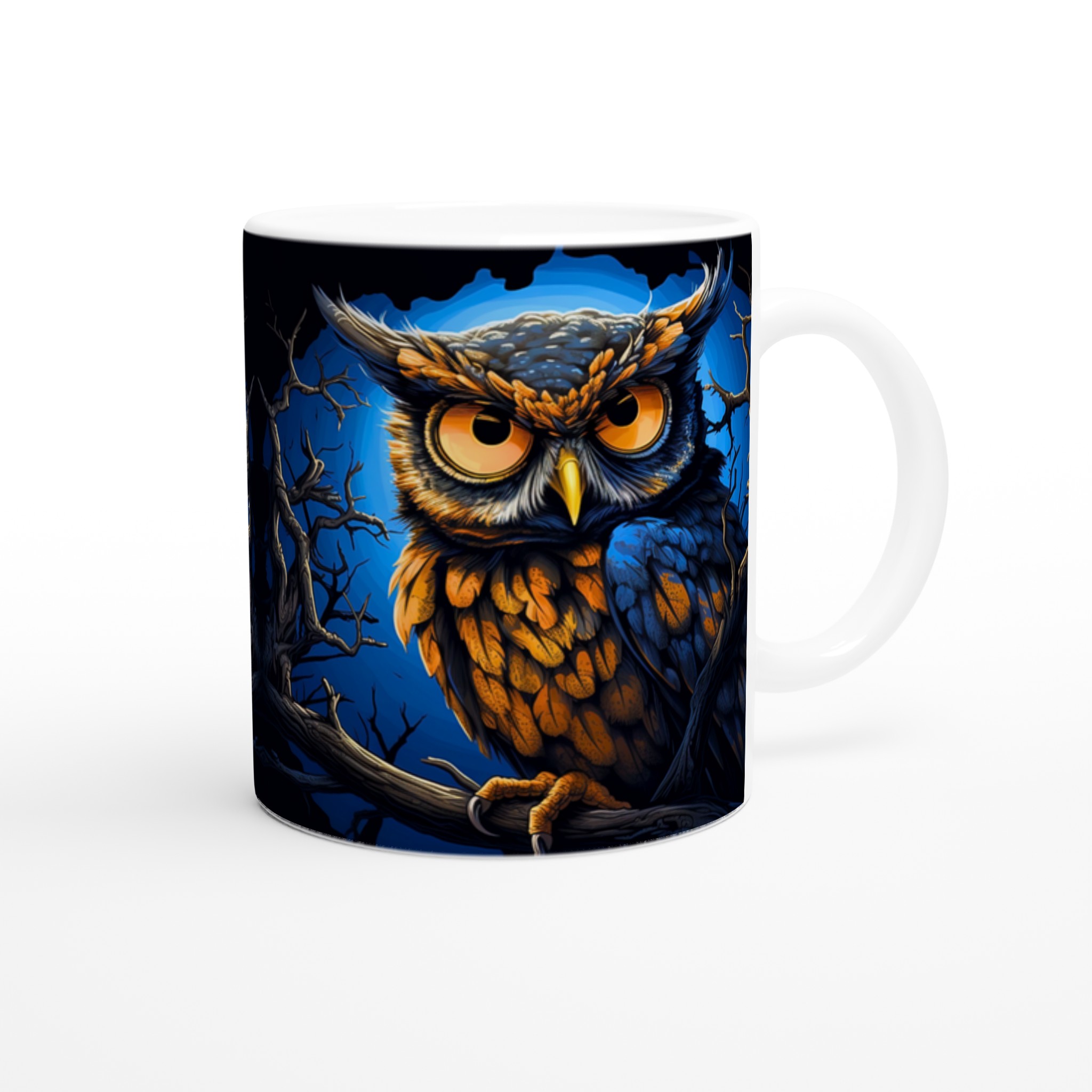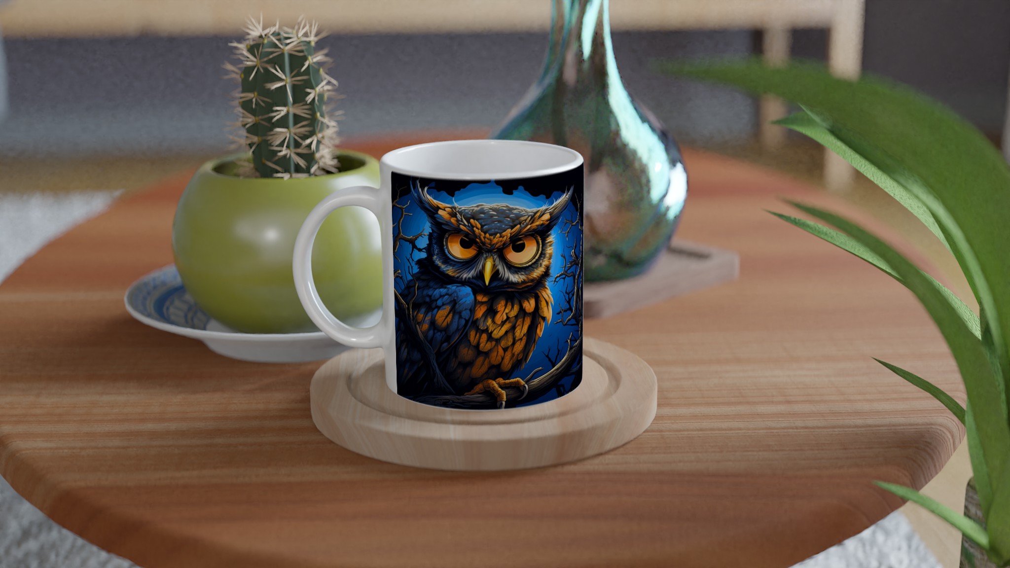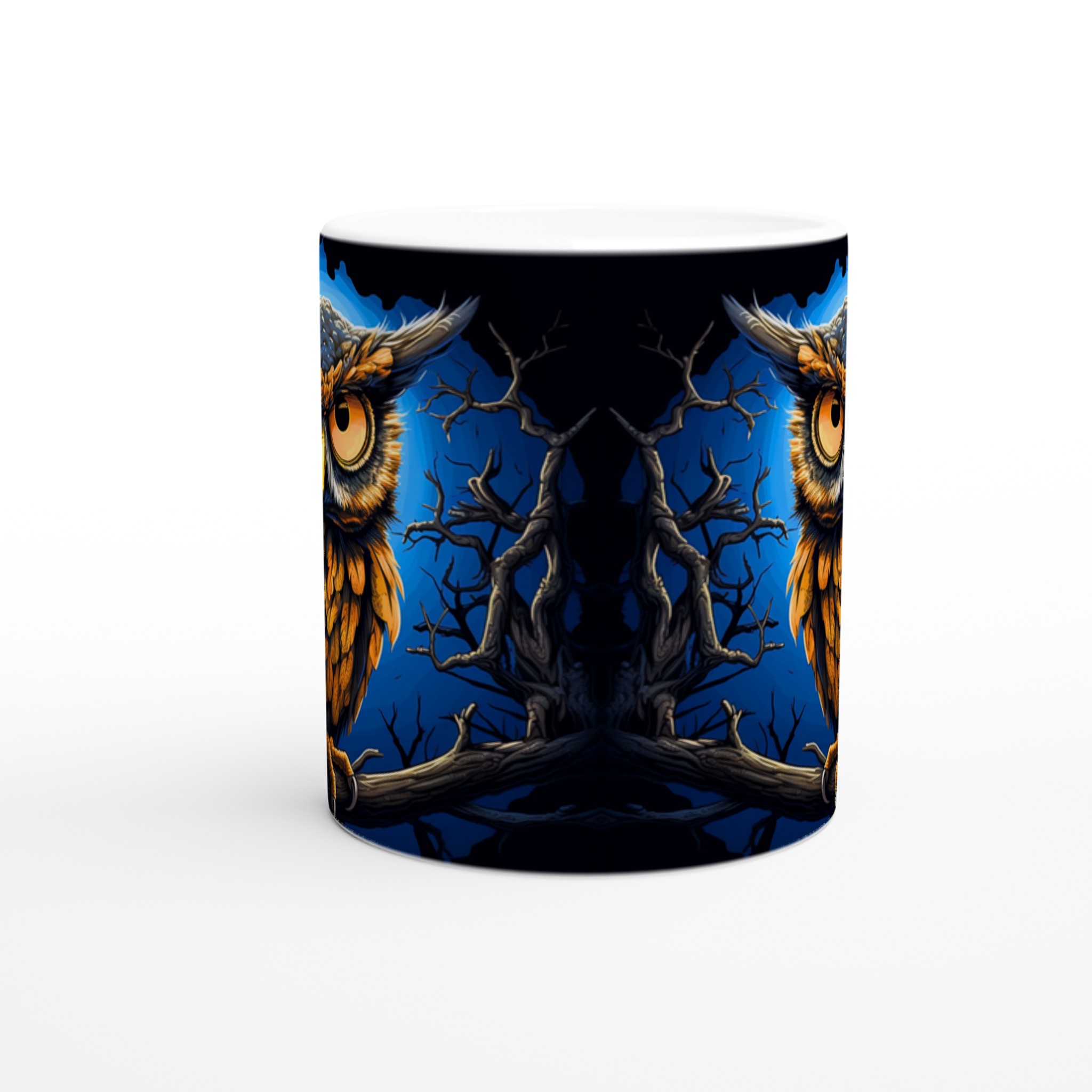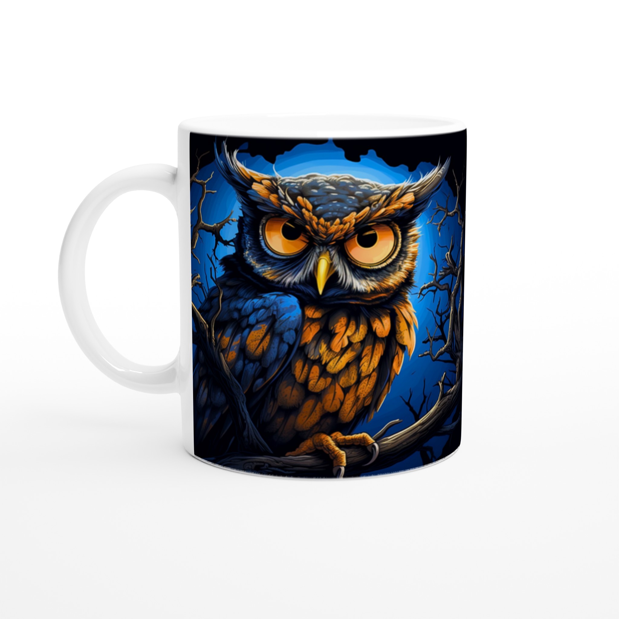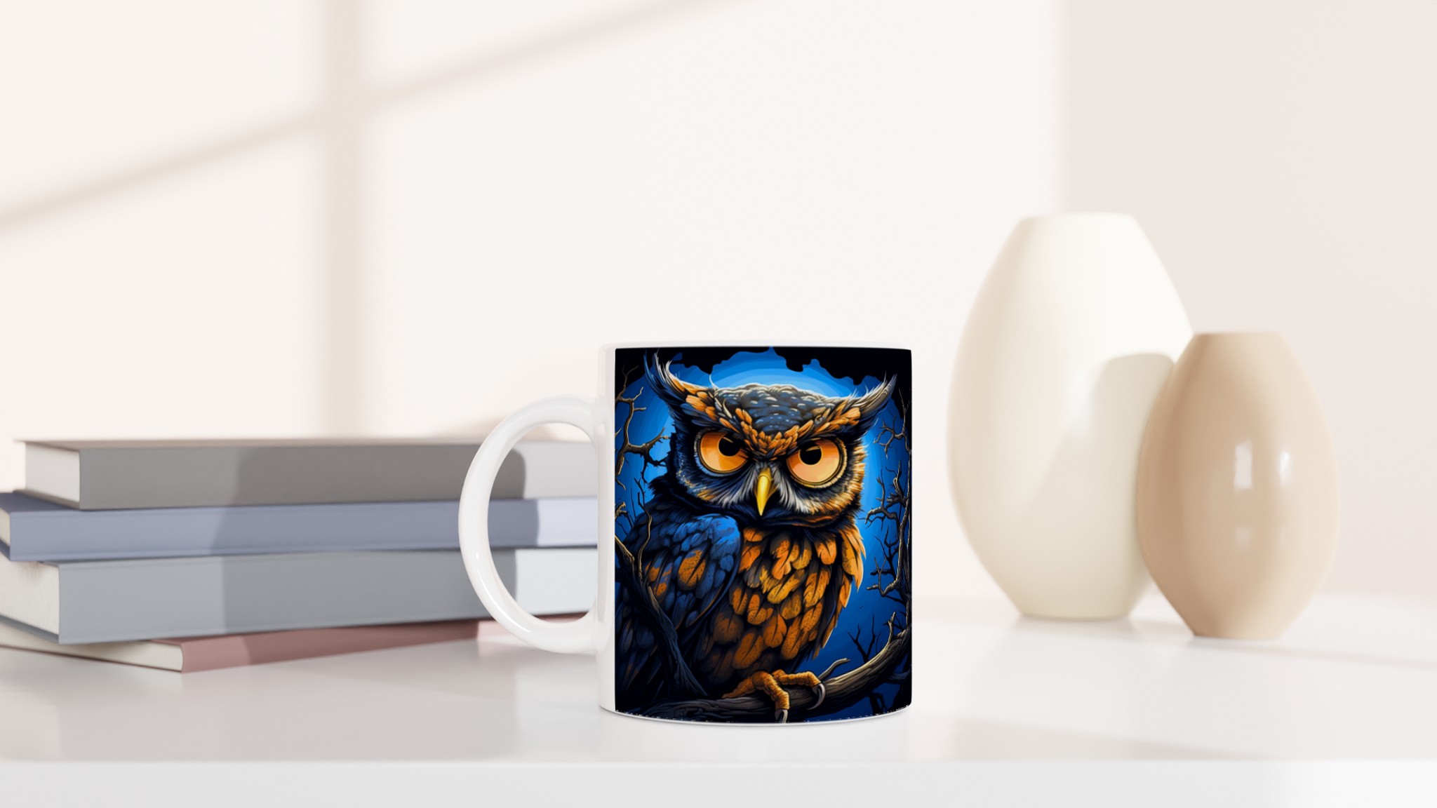 Fånga mystiken med vår unika keramiska mugg, prydd med en fängslande uggla vars intensiva orange ögon lyser upp mot en djupblå bakgrund. Denna mugg är inte bara en behållare för din favoritdryck, utan också ett konstverk som för tankarna till nordiska nätter och sagolika skogar.