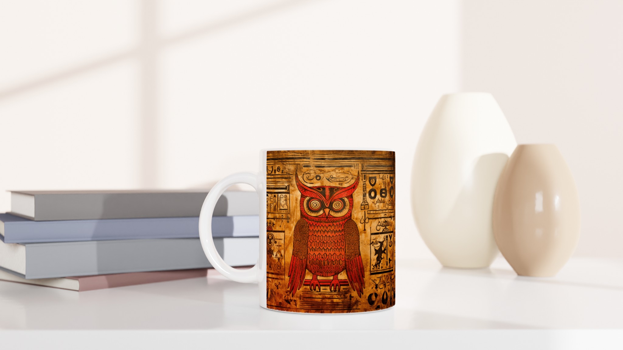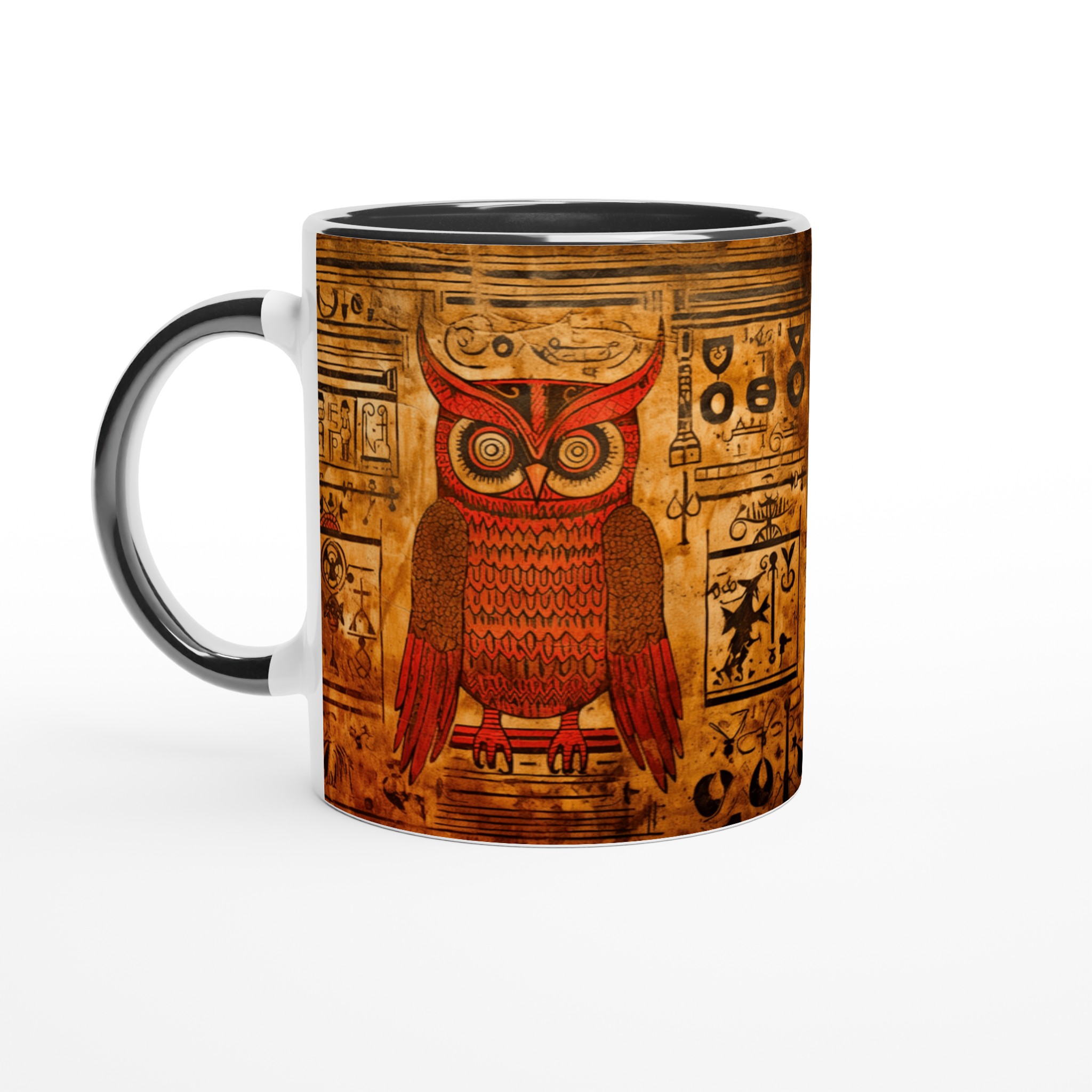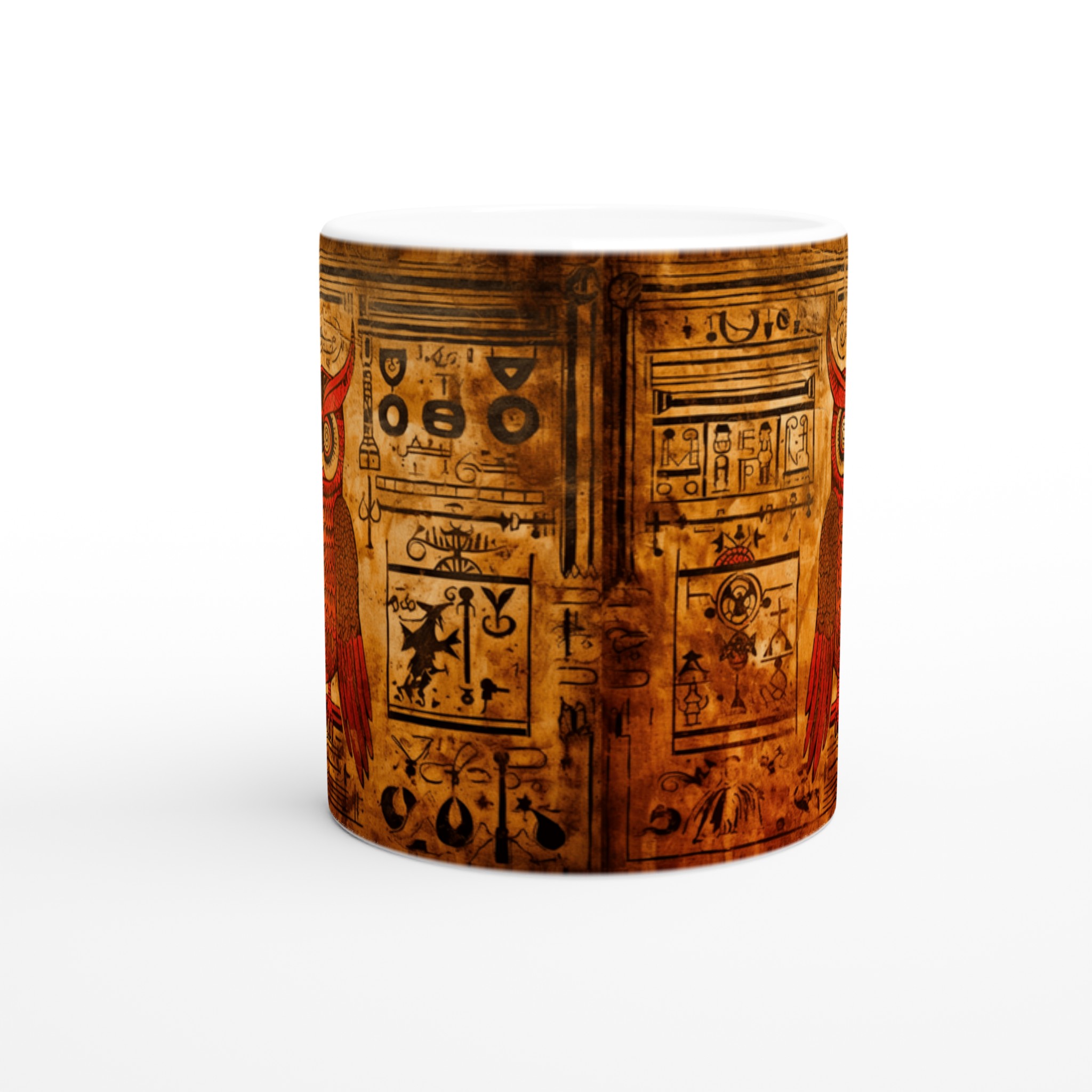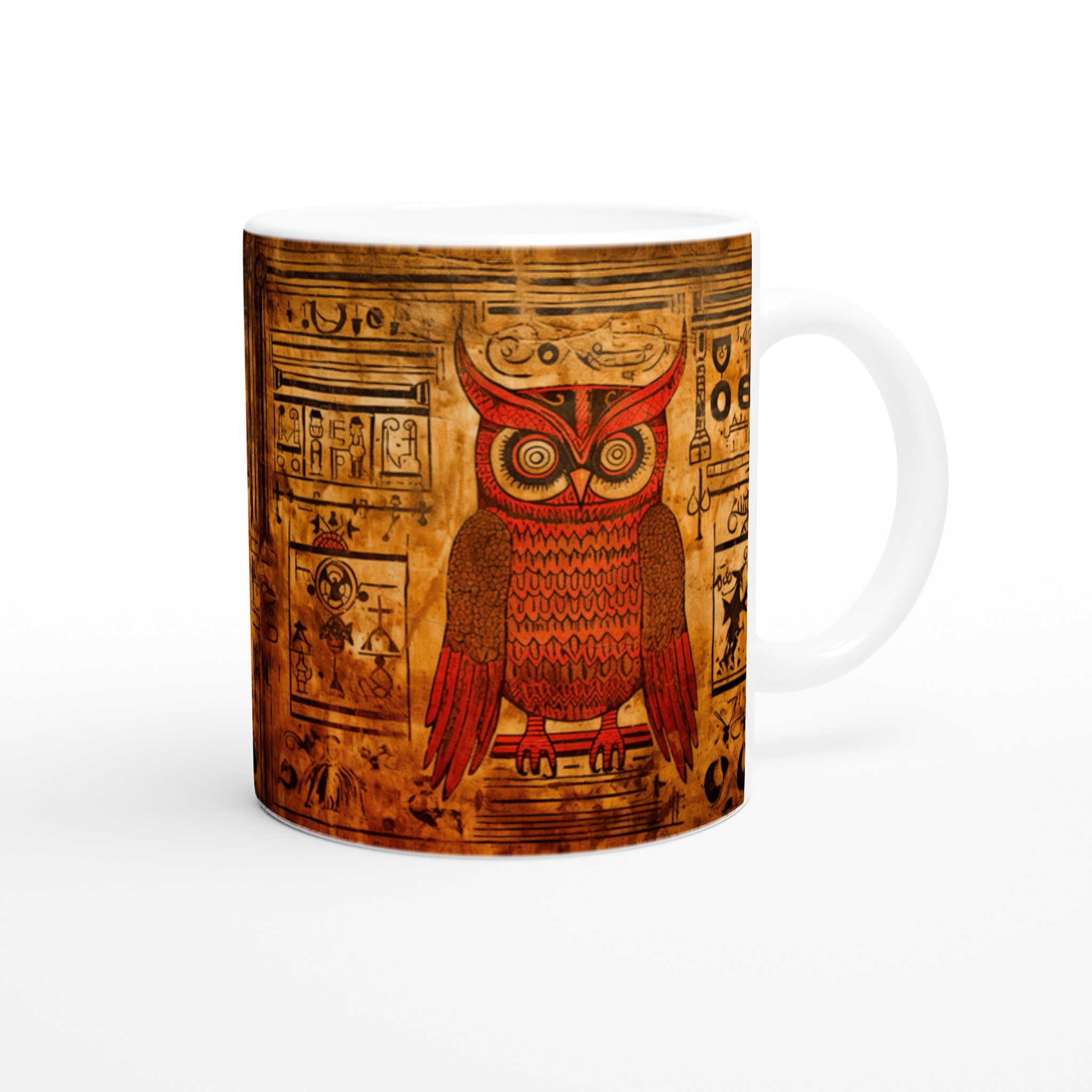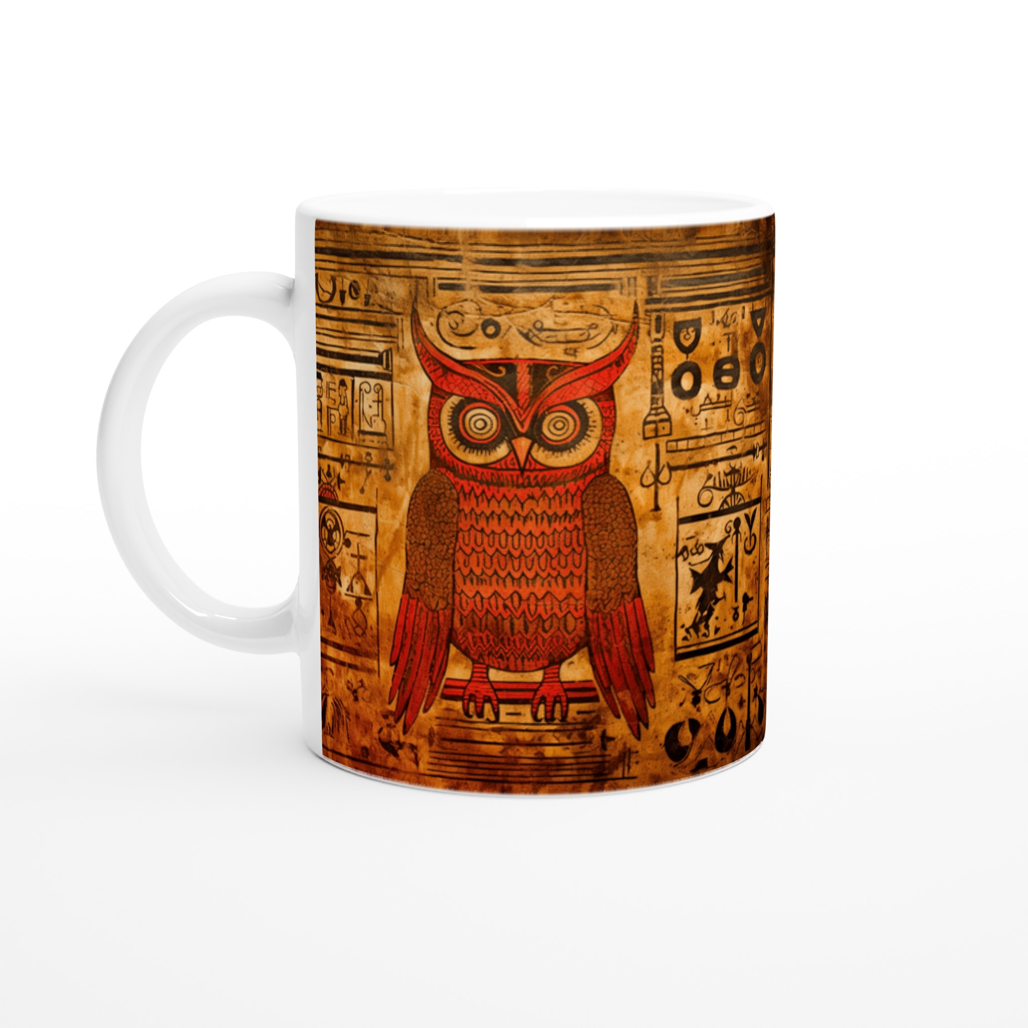 Väck din inre visdom med denna unika keramiska mugg, prydd med en mystisk uggla och forntida symboler som för tankarna till svunna civilisationer. Den rika, jordnära färgpaletten och den intrikata designen ger varje klunk en känsla av äventyr och tidlöshet. Perfekt för morgonkaffet, kvällens varma choklad eller när du bara vill njuta av en kopp te. Den blanka ytan framhäver trycken med klara och levande färger, som håller sig fina även efter många turer i mikron och diskmaskinen.