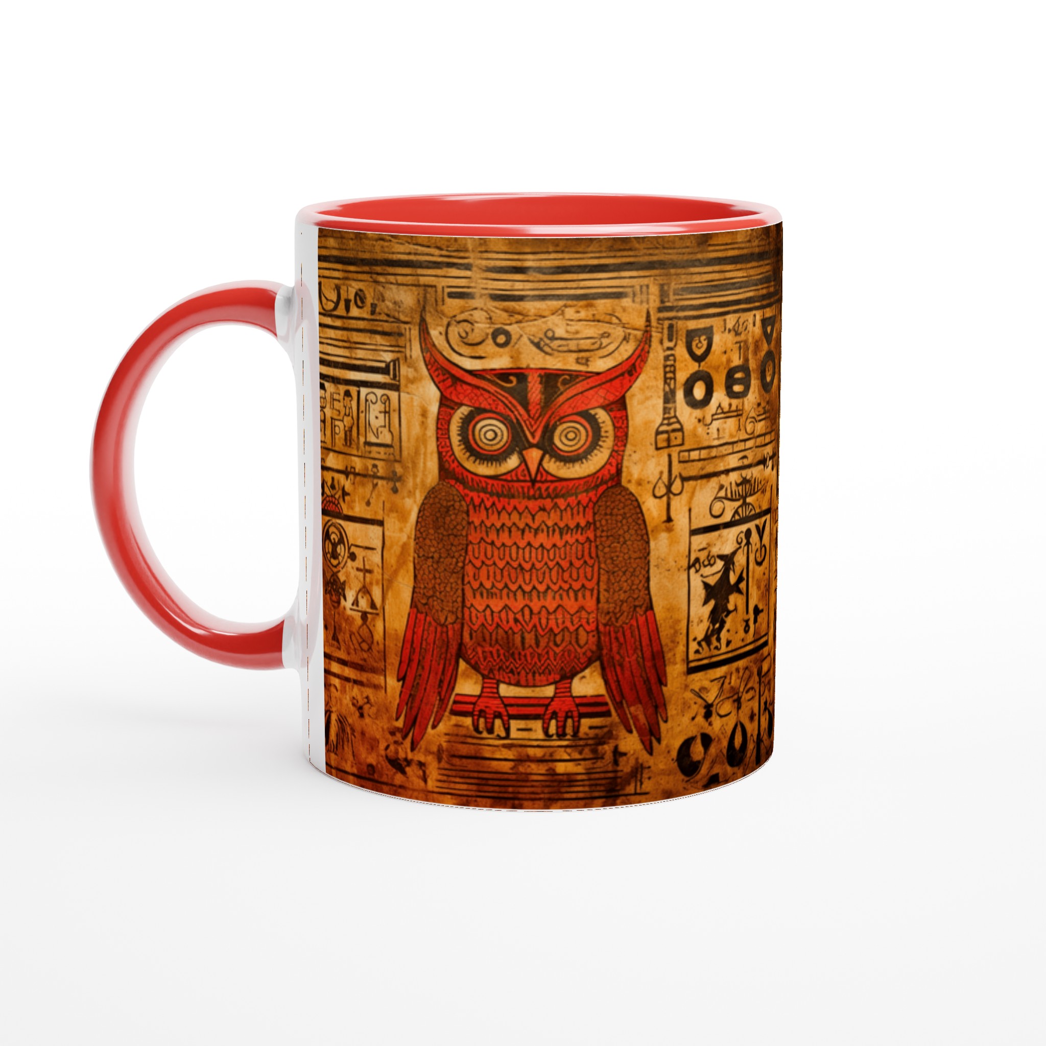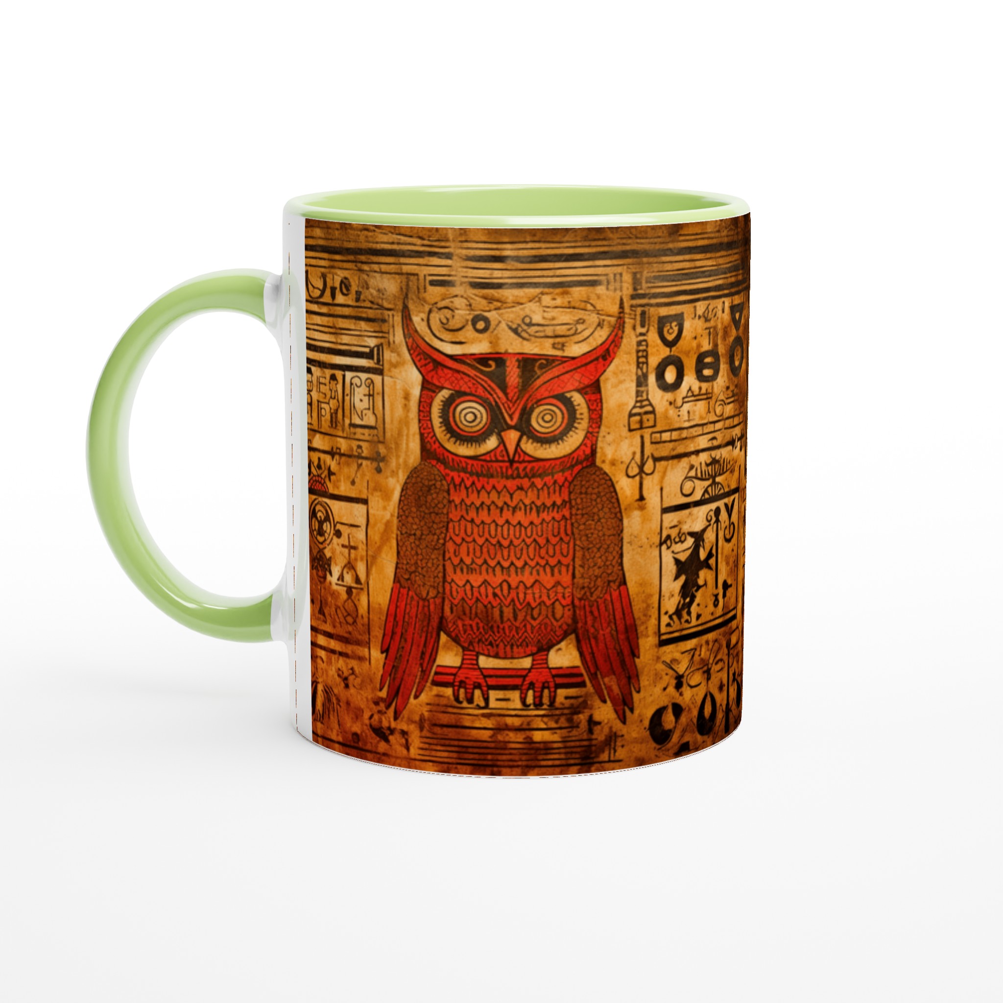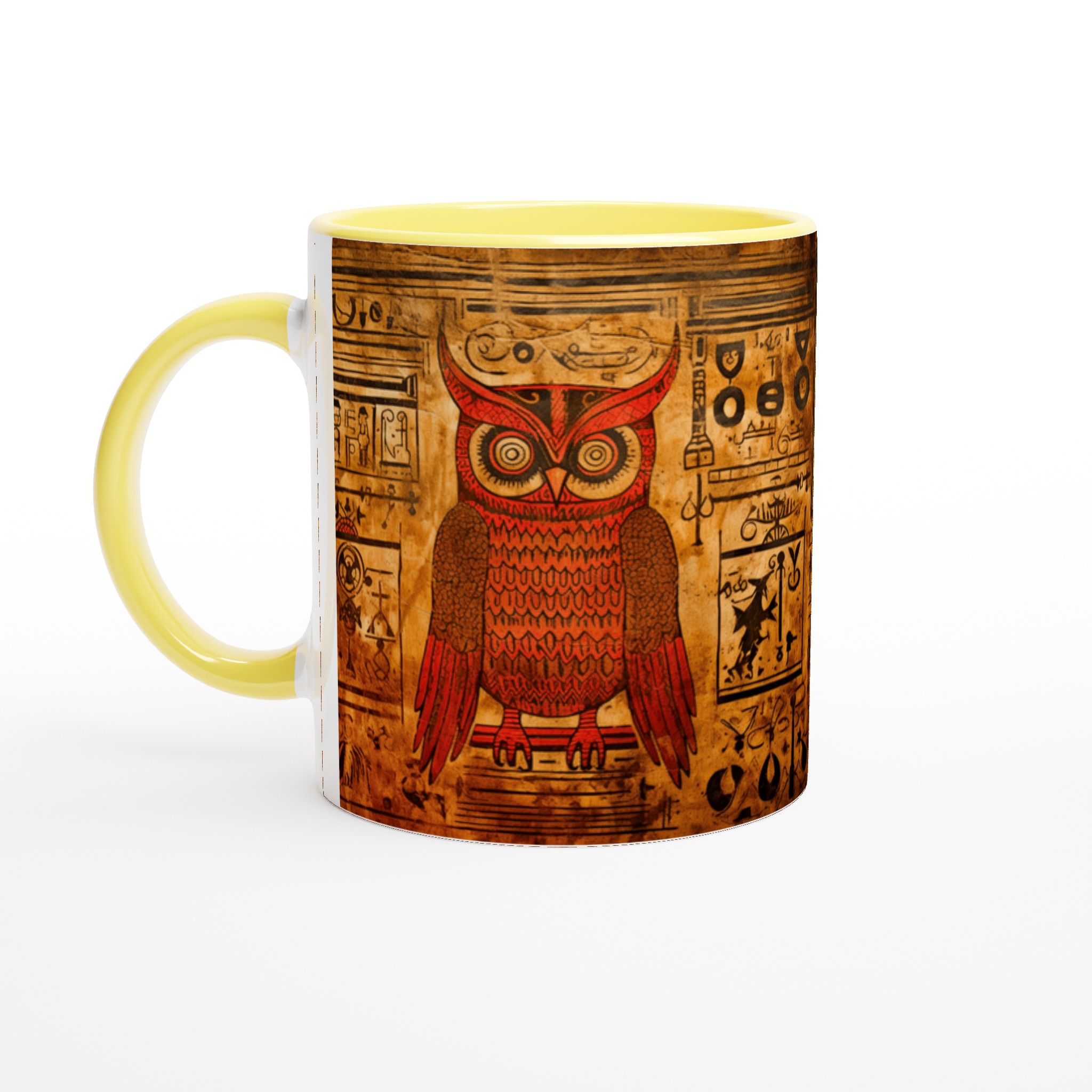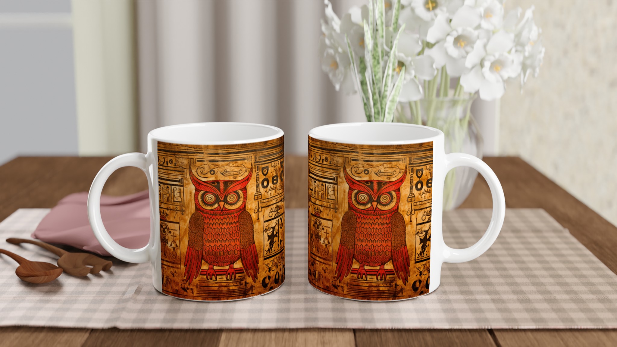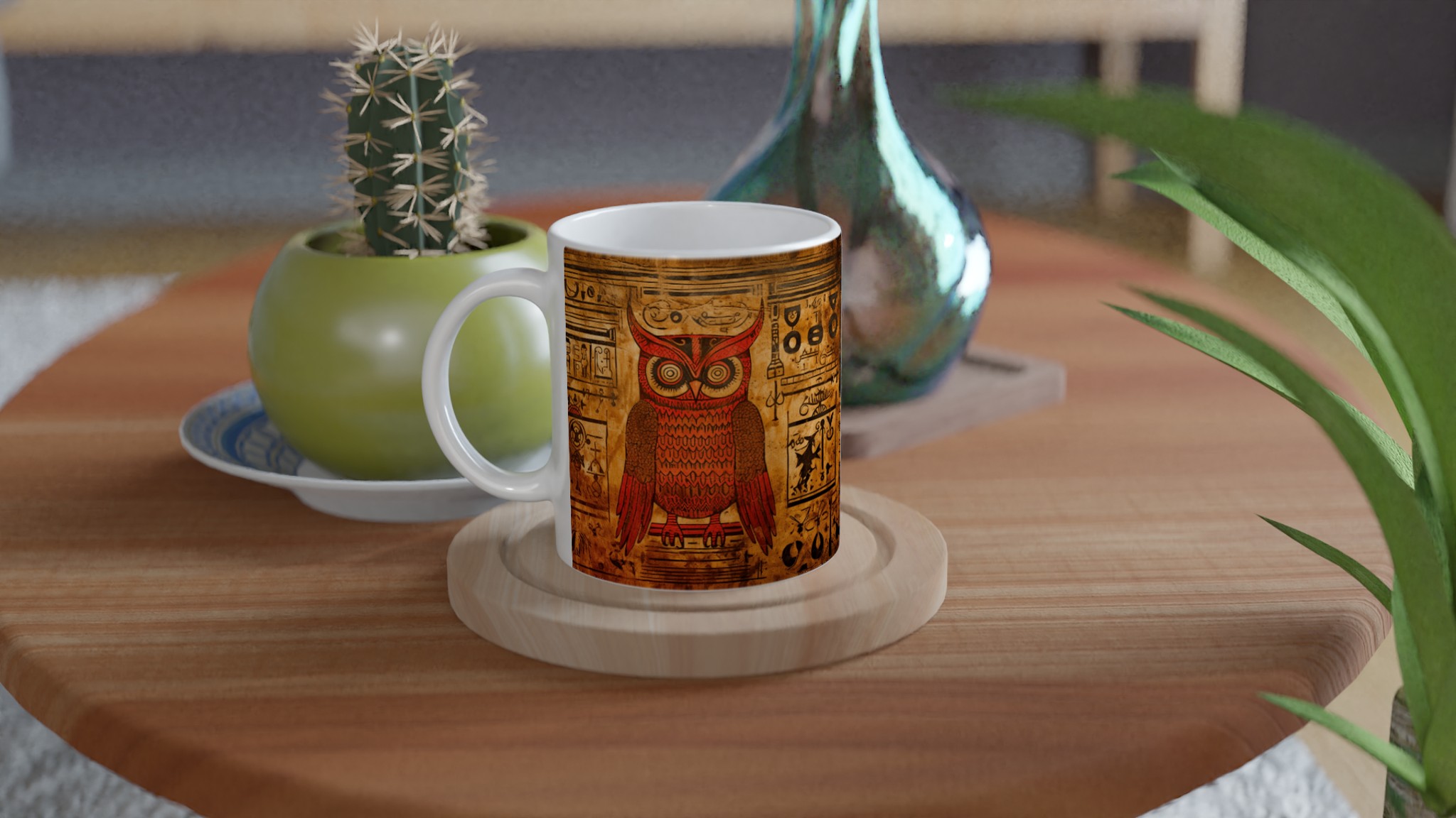 Väck din inre visdom med denna unika keramiska mugg, prydd med en mystisk uggla och forntida symboler som för tankarna till svunna civilisationer. Den rika, jordnära färgpaletten och den intrikata designen ger varje klunk en känsla av äventyr och tidlöshet. Perfekt för morgonkaffet, kvällens varma choklad eller när du bara vill njuta av en kopp te. Den blanka ytan framhäver trycken med klara och levande färger, som håller sig fina även efter många turer i mikron och diskmaskinen.
