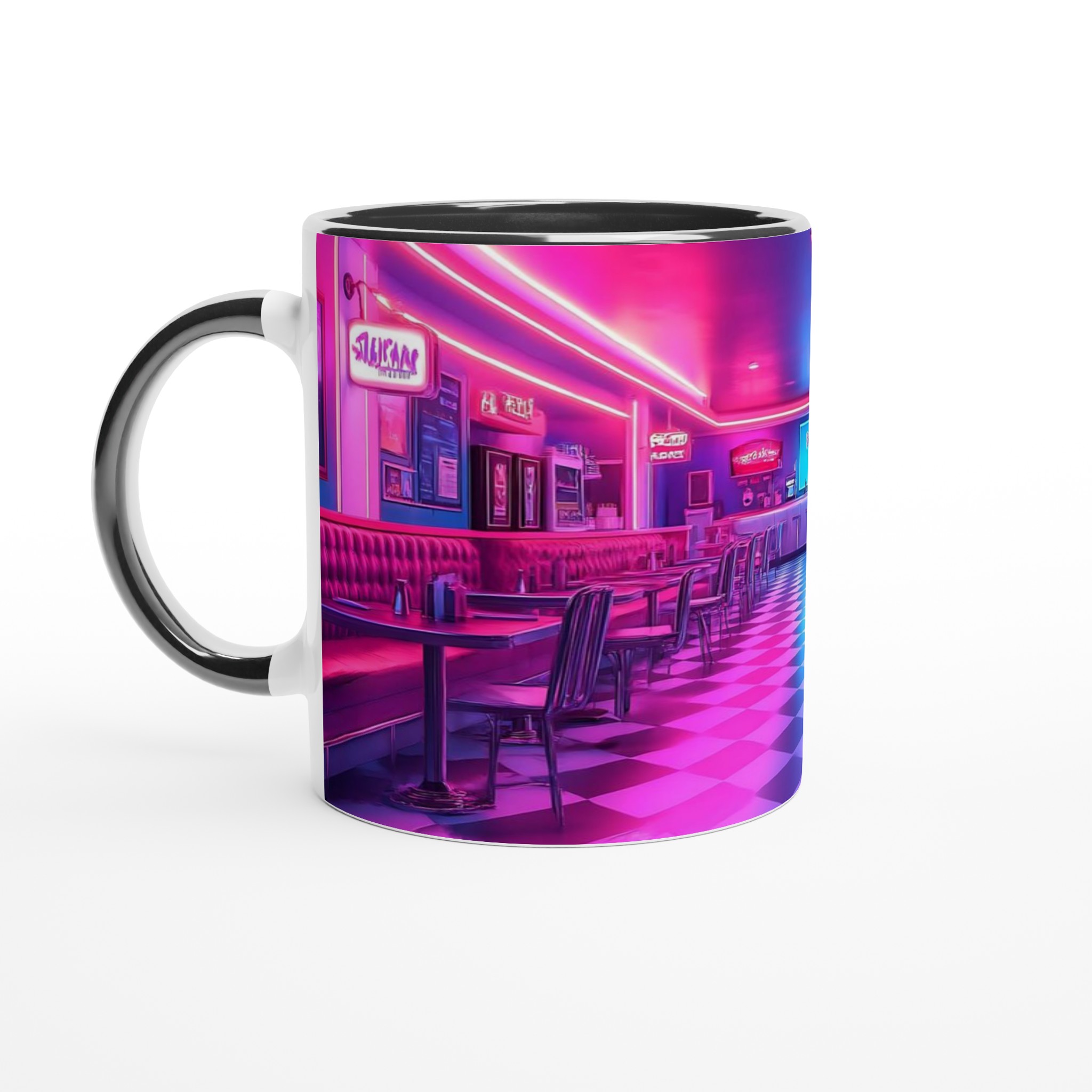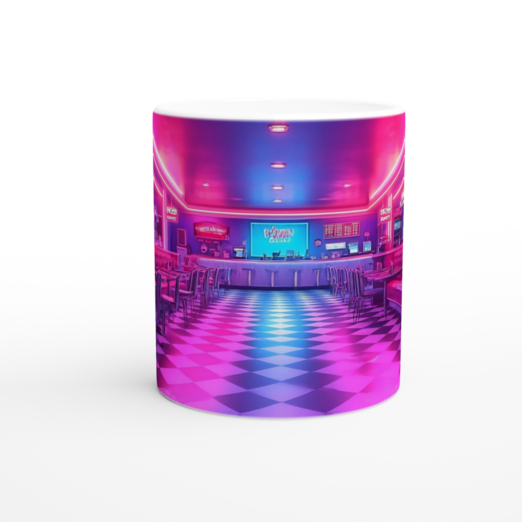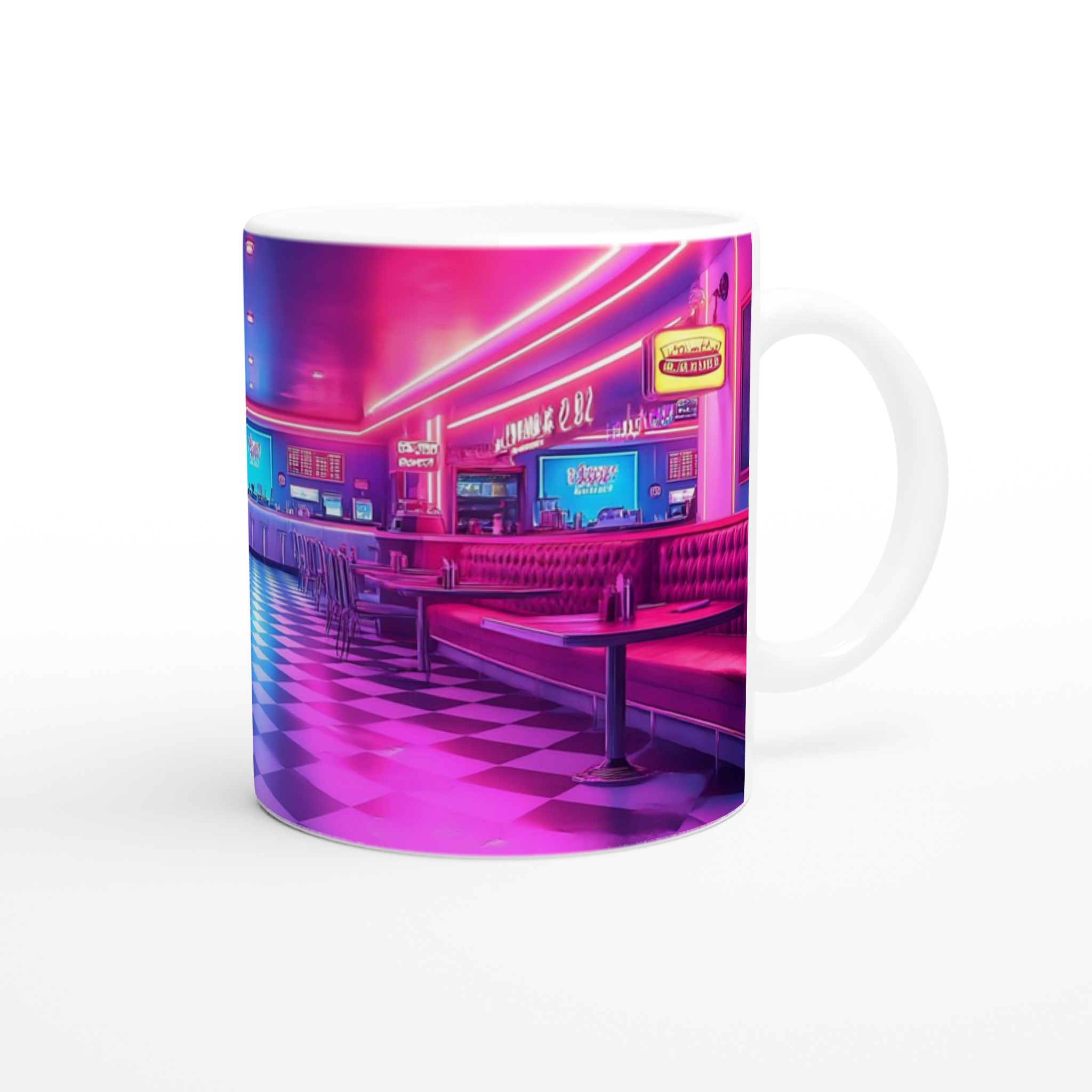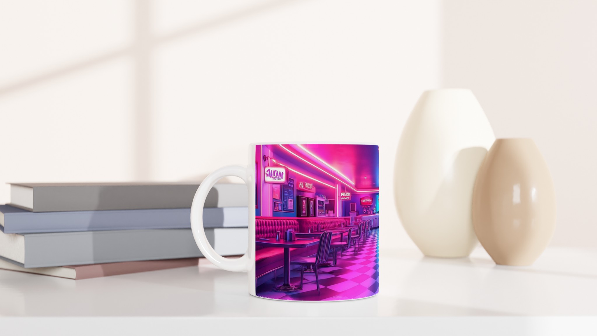 Inspirerad av den pulserande energin från en retro-diner i neon, bjuder denna mugg in till en explosion av färg och nostalgi. Föreställ dig den glödande atmosfären, de djupa lila tonerna och de klara rosa neonskyltarna – allt fångat i en mugg som lyser upp din dag. Den blanka vita ytan ger ett skarpt och levande tryck som verkligen sticker ut, oavsett om det är en personlig design, ett roligt citat eller en present till någon du tycker om.