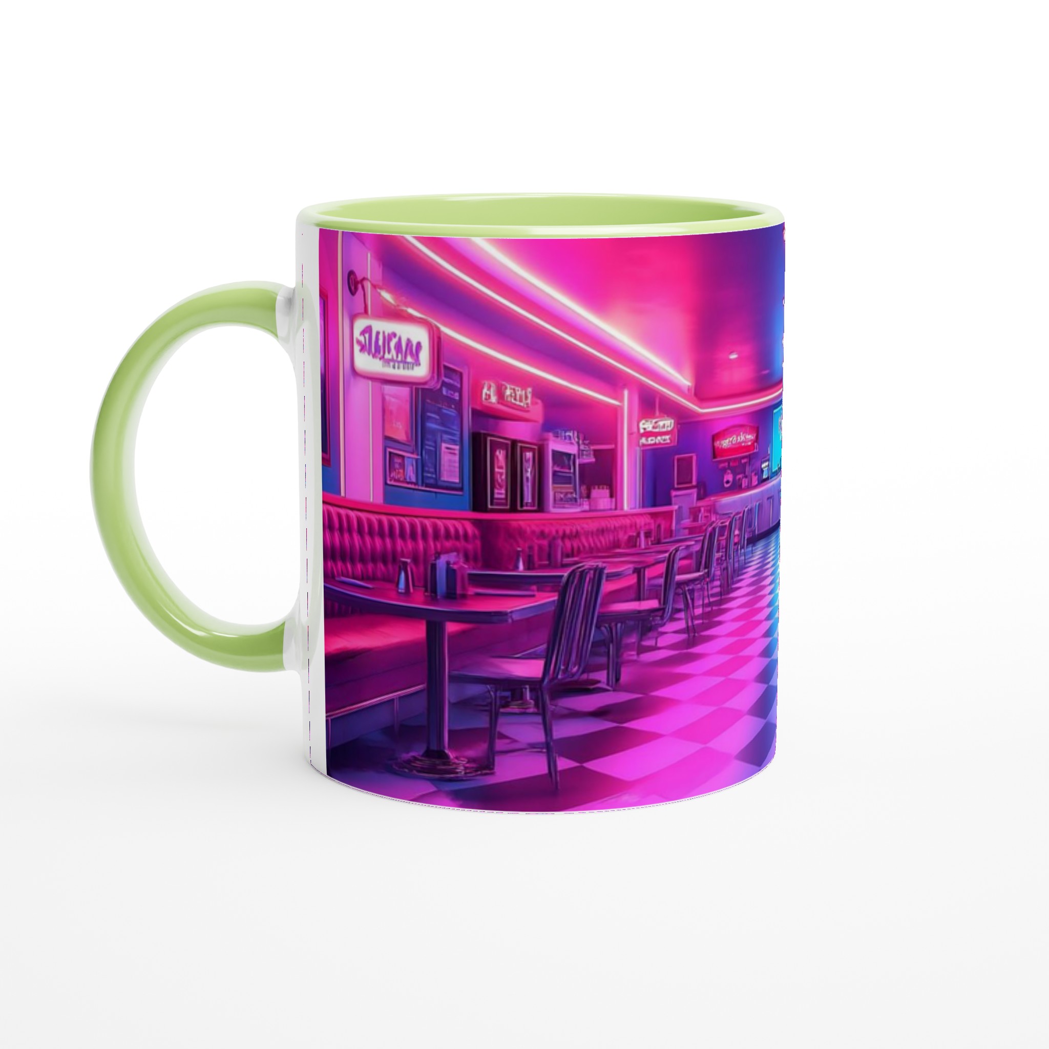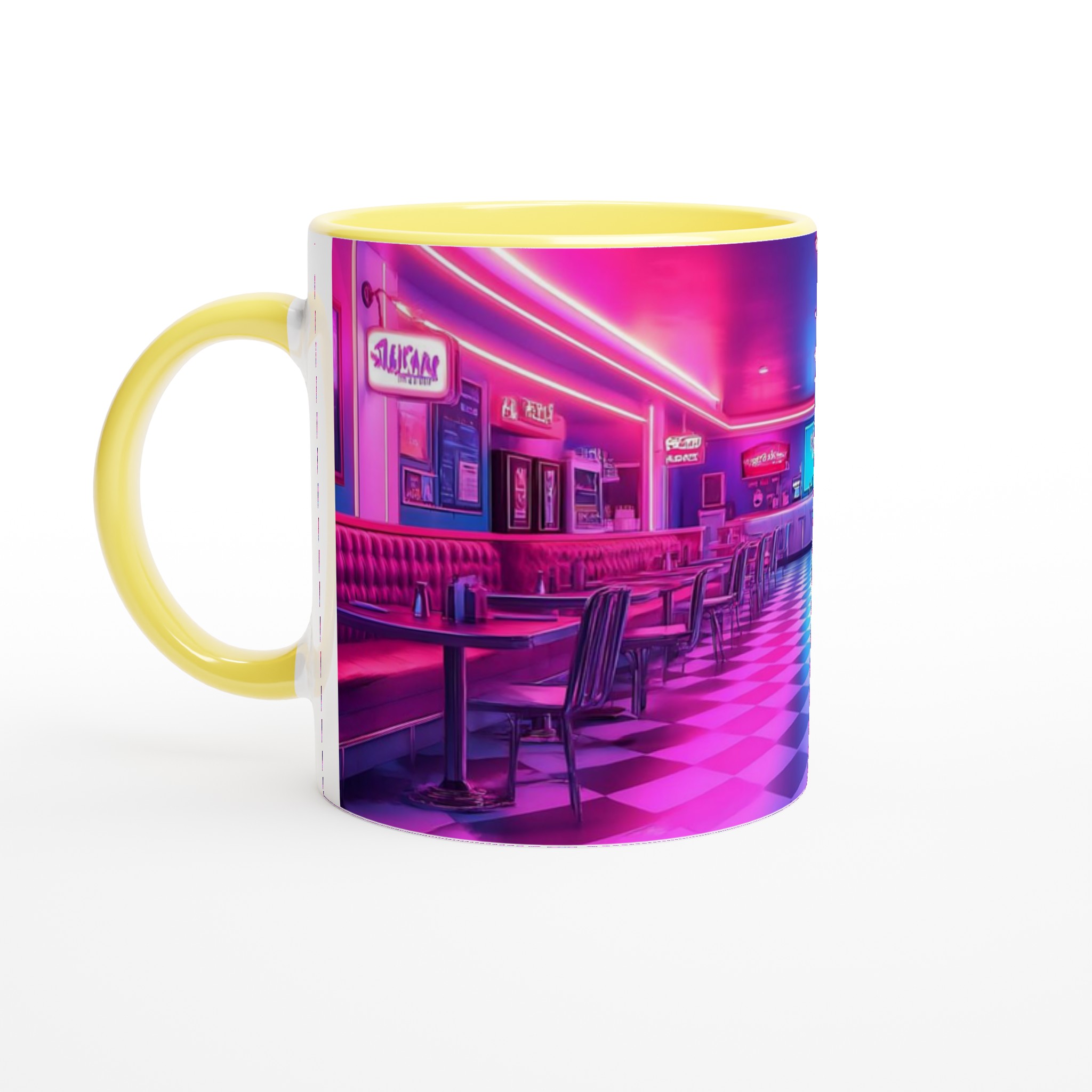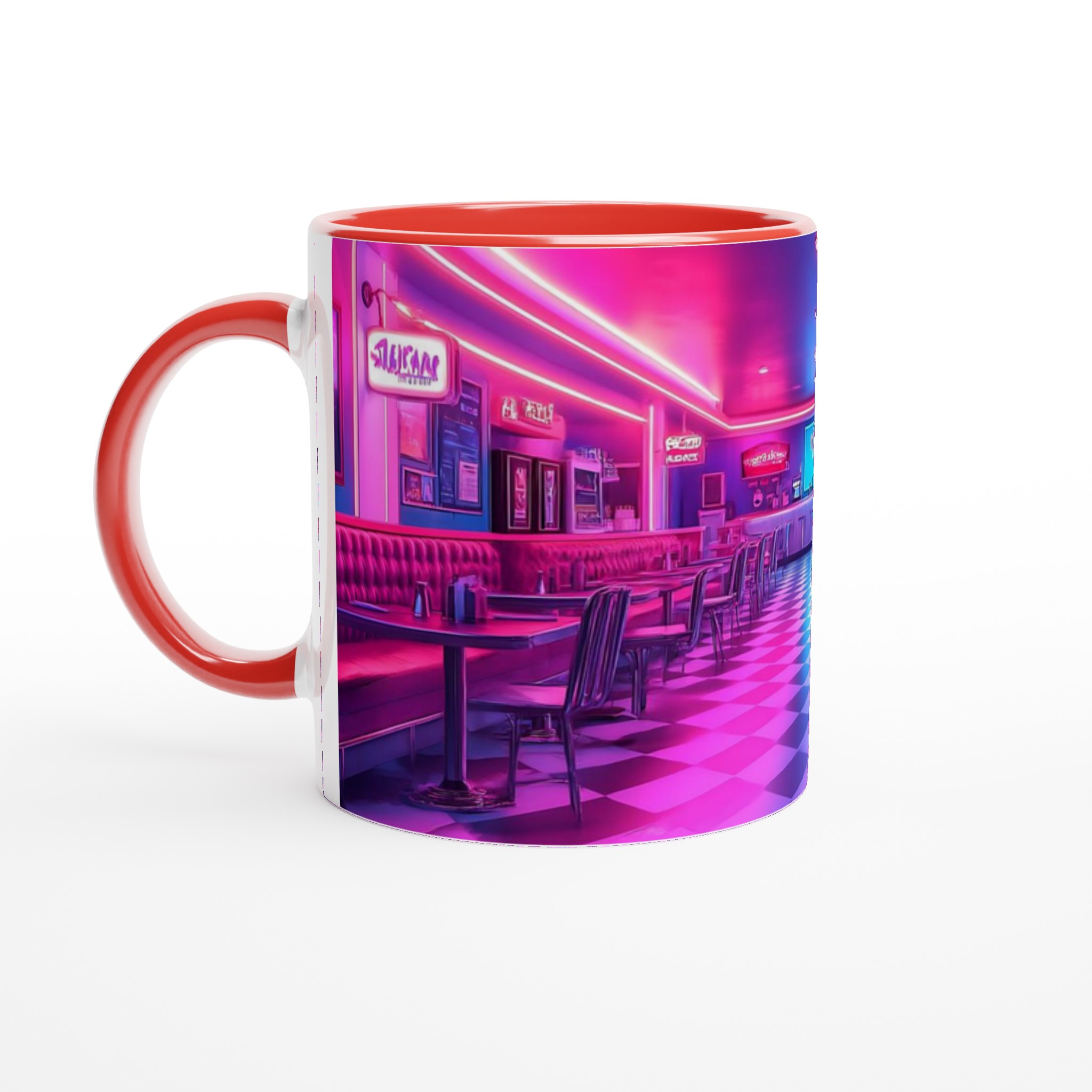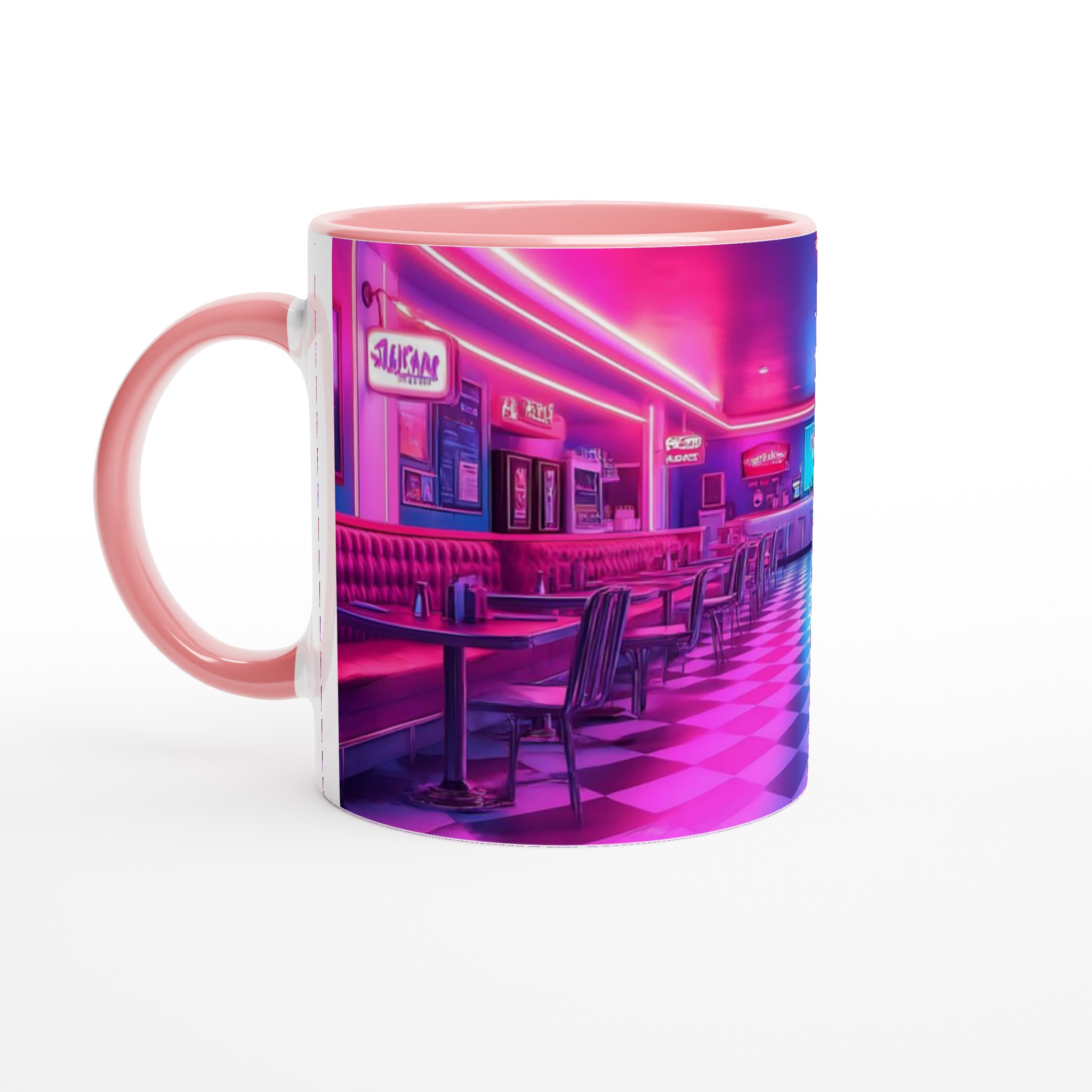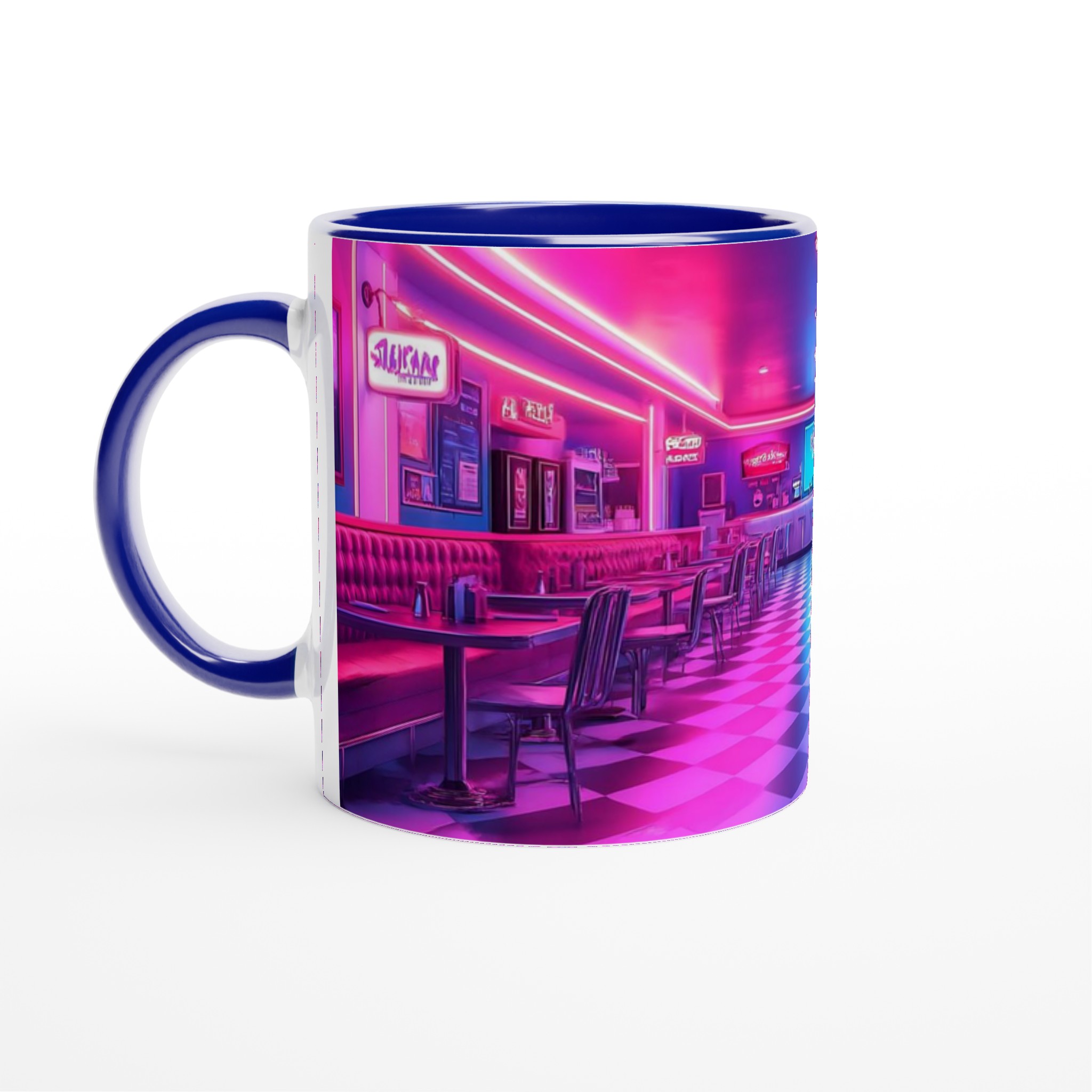Inspirerad av den pulserande energin från en retro-diner i neon, bjuder denna mugg in till en explosion av färg och nostalgi. Föreställ dig den glödande atmosfären, de djupa lila tonerna och de klara rosa neonskyltarna – allt fångat i en mugg som lyser upp din dag. Den blanka vita ytan ger ett skarpt och levande tryck som verkligen sticker ut, oavsett om det är en personlig design, ett roligt citat eller en present till någon du tycker om.