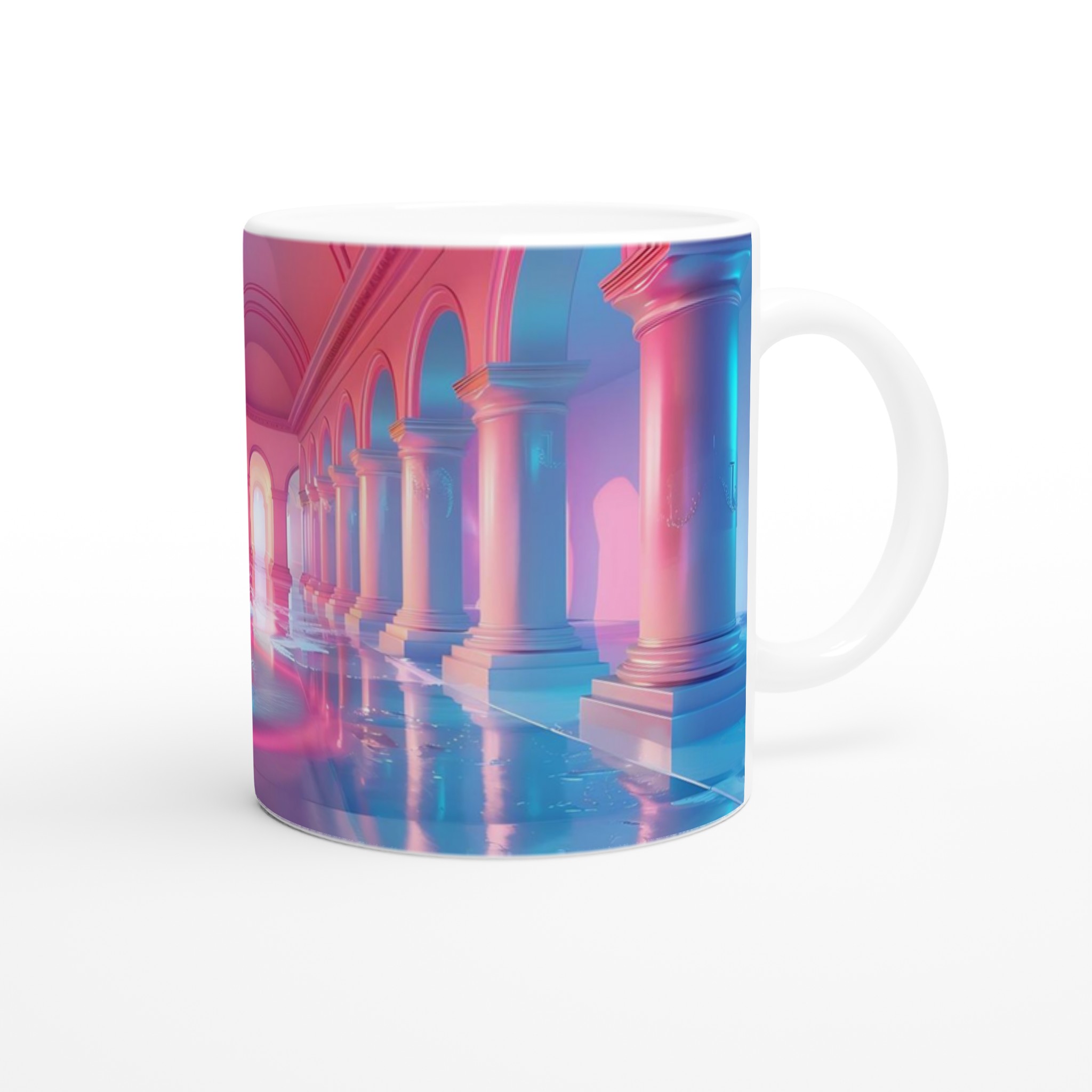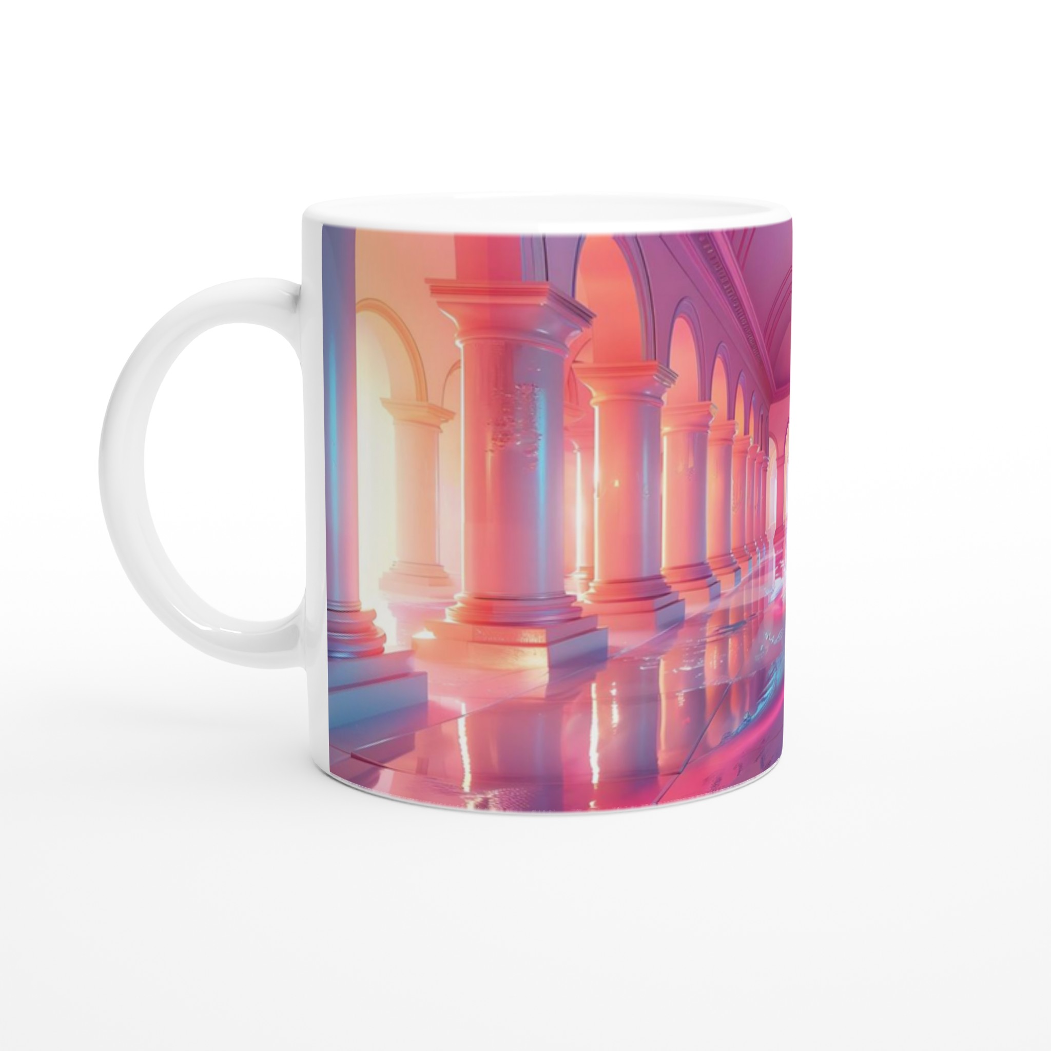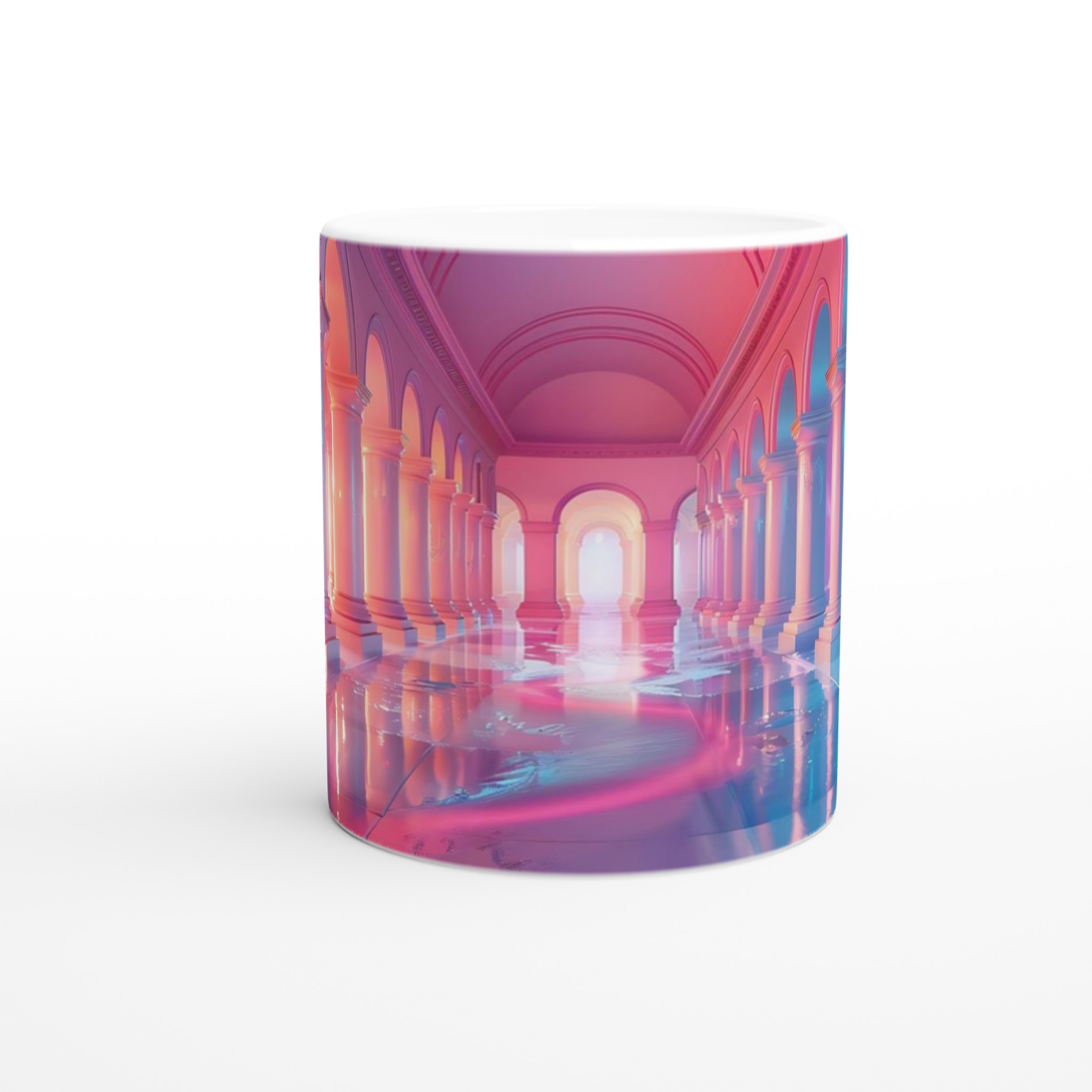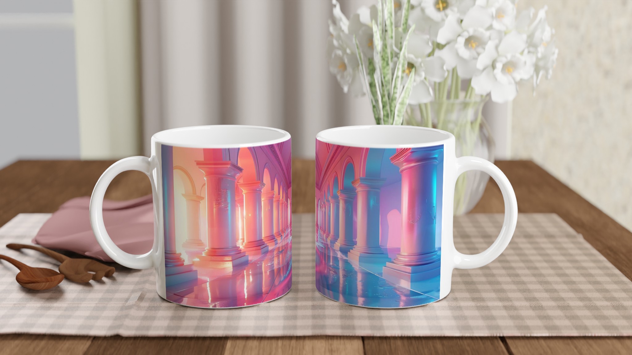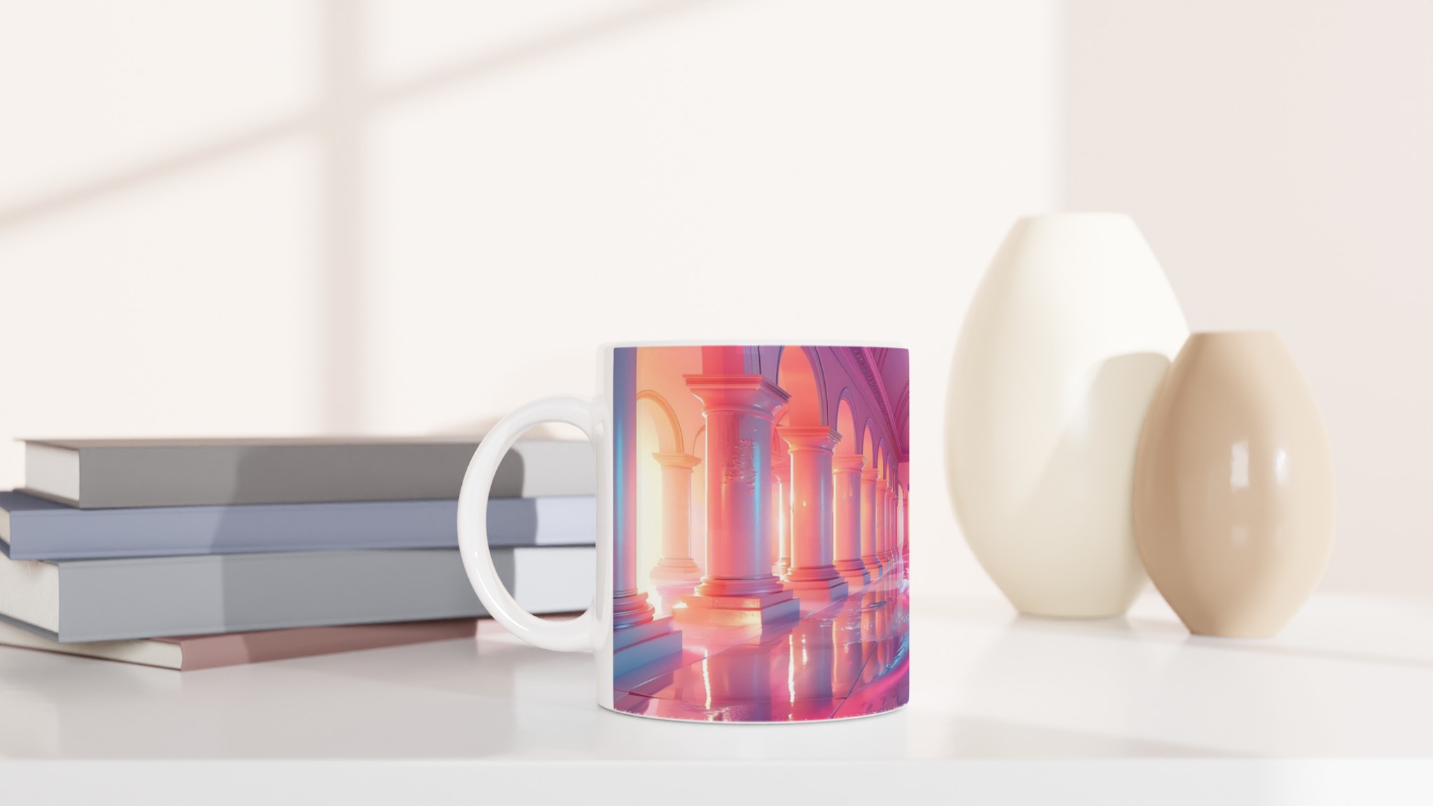 Stig in i en värld av drömska neonfärger varje gång du tar en klunk! Den här stilrena keramiska muggen, inspirerad av arkitektonisk skönhet och levande ljus, blir snabbt en vardagsfavorit. Perfekt för morgonkaffet, kvällens varma choklad eller när du bara vill njuta av en kopp te. Den blanka vita ytan gör att trycken framhävs med klara och levande färger, som håller sig fina även efter många turer i mikron och diskmaskinen.