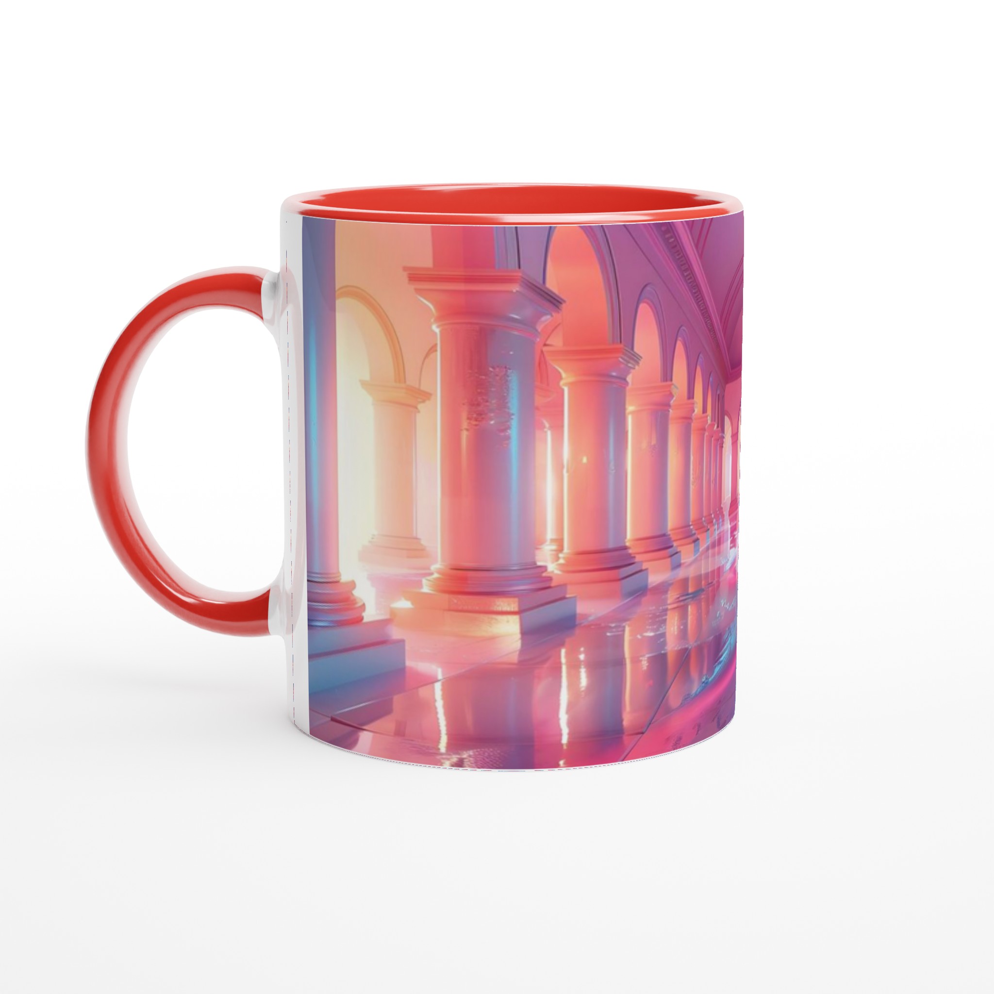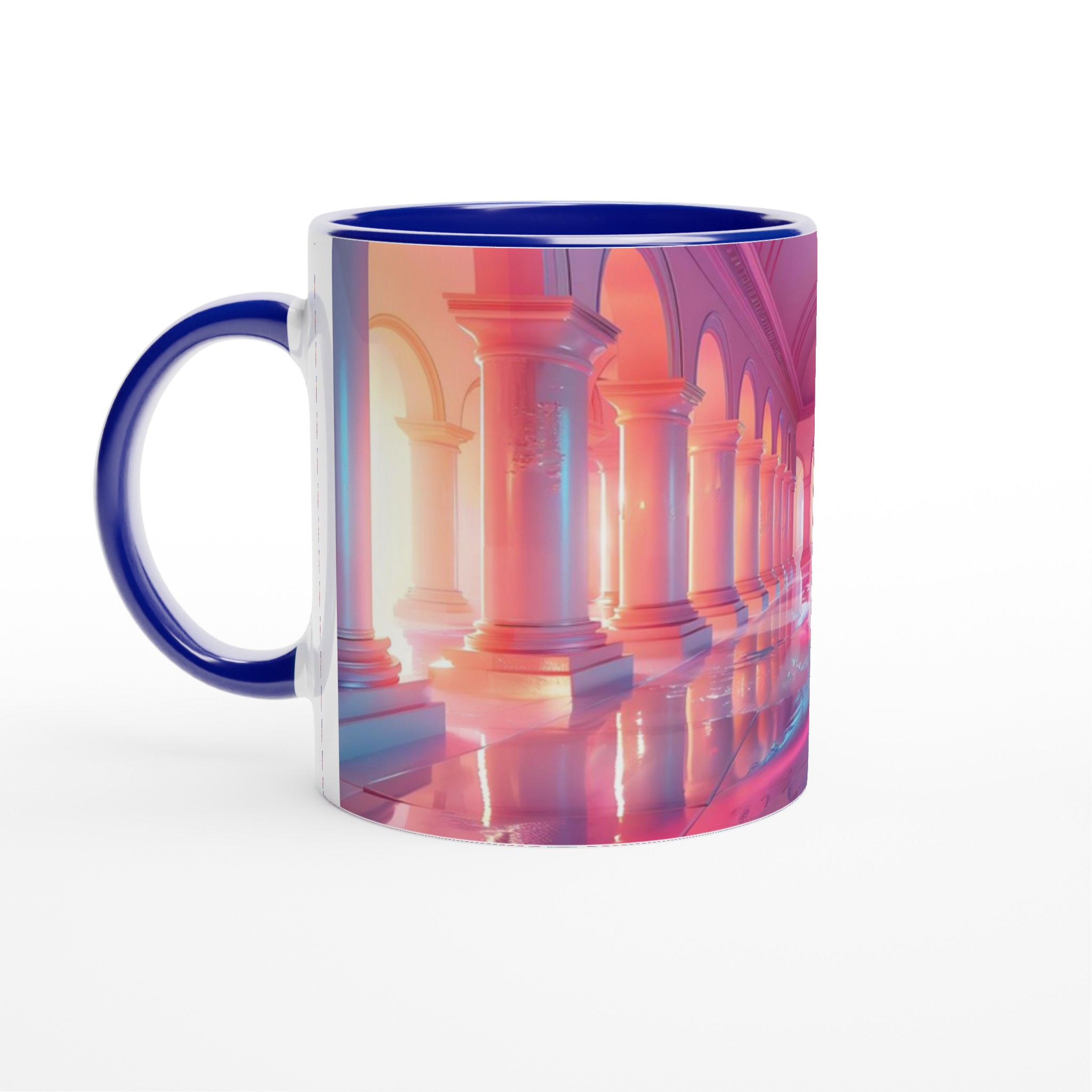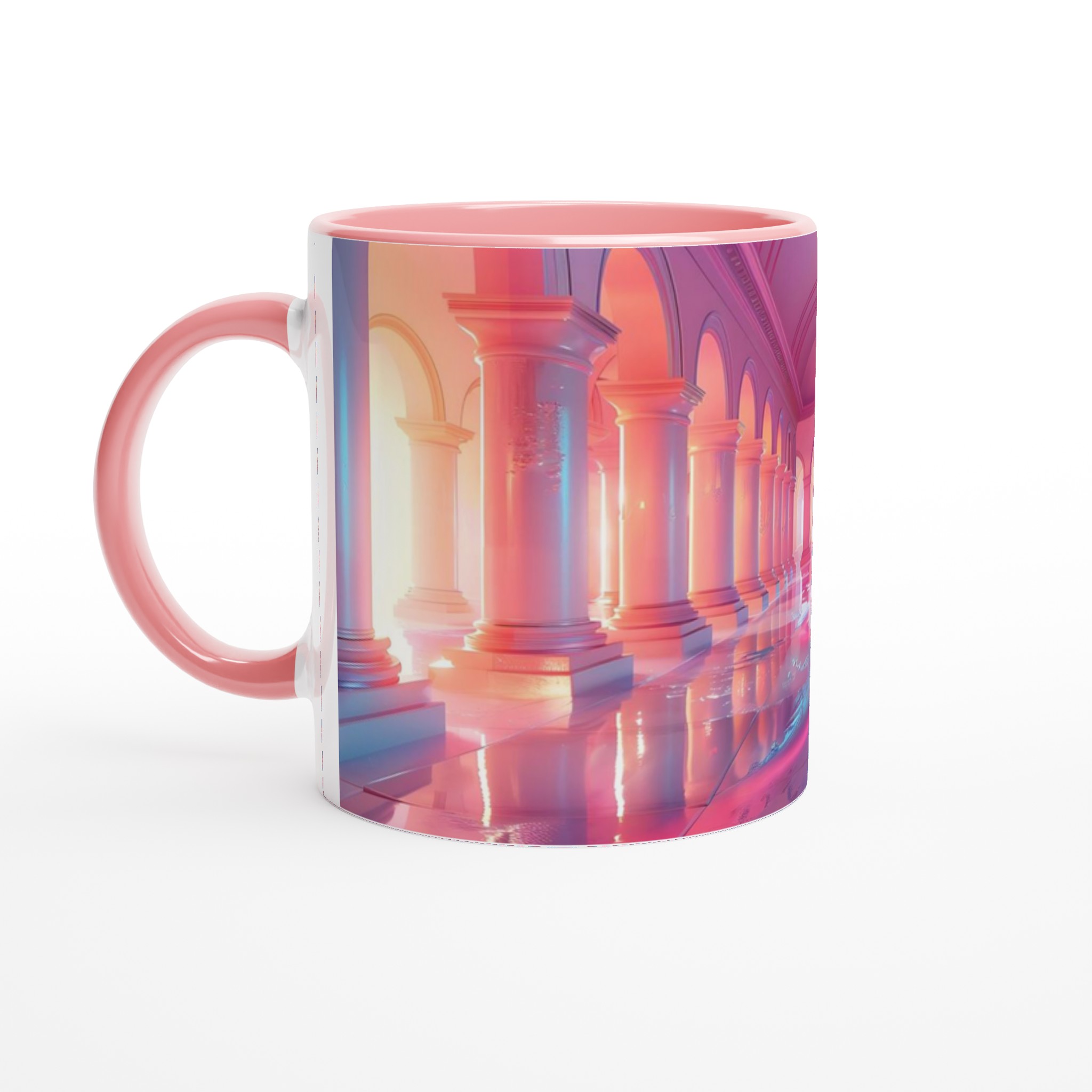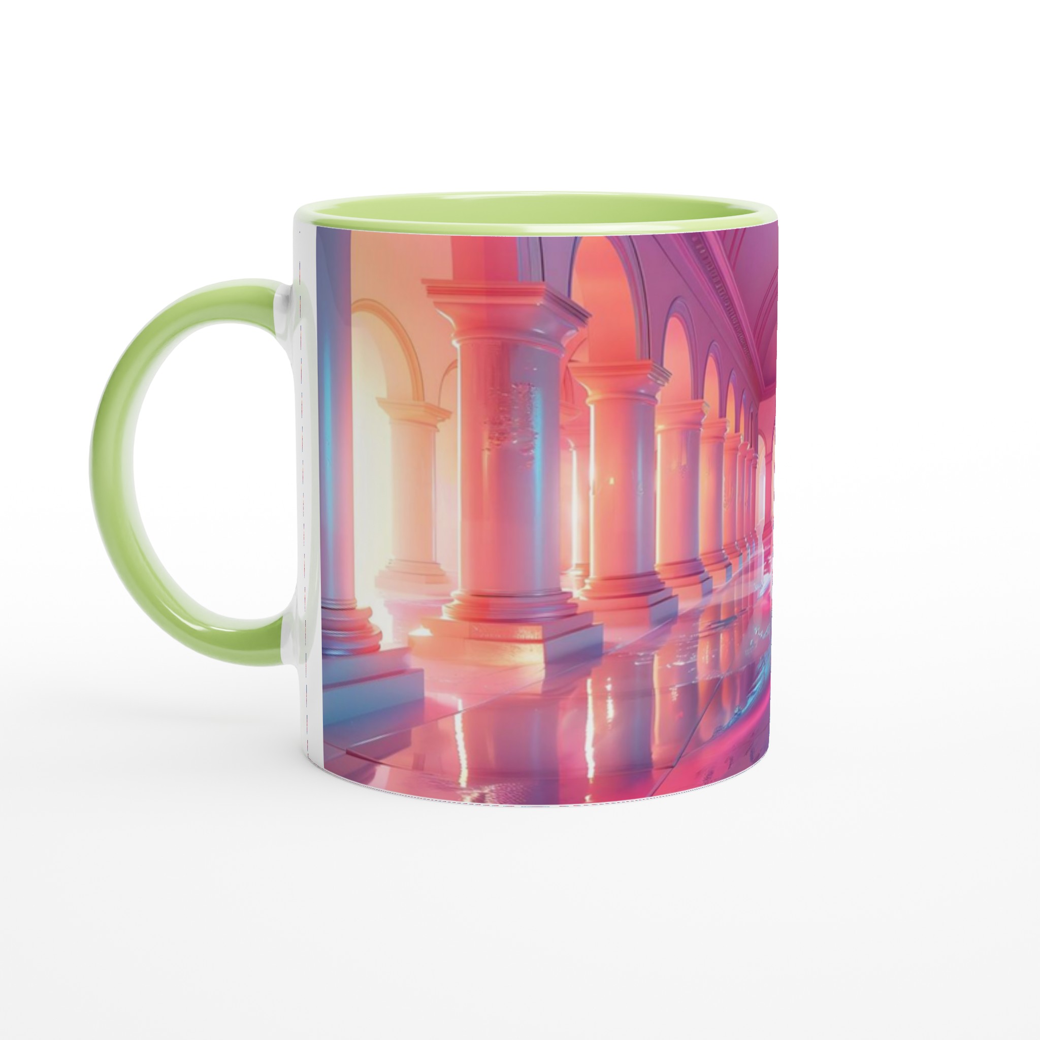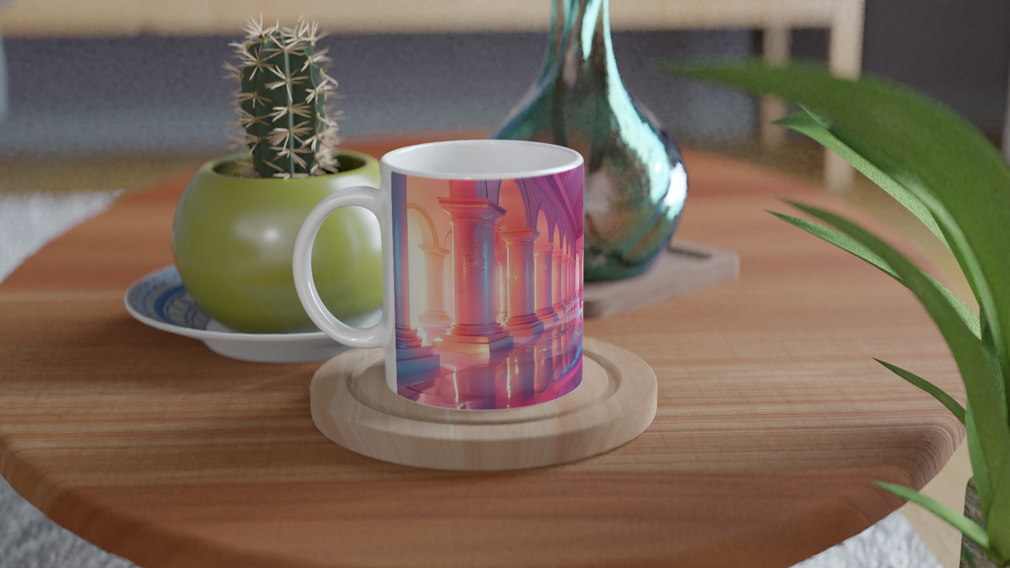 Stig in i en värld av drömska neonfärger varje gång du tar en klunk! Den här stilrena keramiska muggen, inspirerad av arkitektonisk skönhet och levande ljus, blir snabbt en vardagsfavorit. Perfekt för morgonkaffet, kvällens varma choklad eller när du bara vill njuta av en kopp te. Den blanka vita ytan gör att trycken framhävs med klara och levande färger, som håller sig fina även efter många turer i mikron och diskmaskinen.