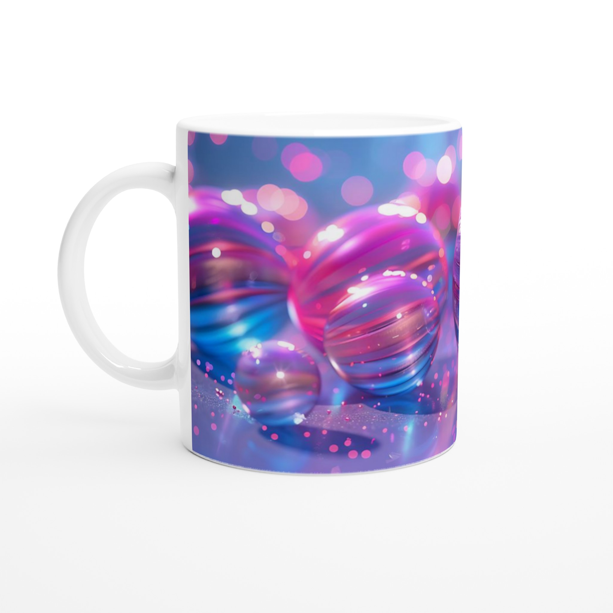 Inspirerad av nattens magi och stadens neonljus, fångar denna mugg den livfulla energin av rosa och blått i en glittrande dans. Den blanka vita ytan ger ett skarpt och levande tryck som verkligen sticker ut, oavsett om det är en personlig design, ett roligt citat eller en present till någon du tycker om.