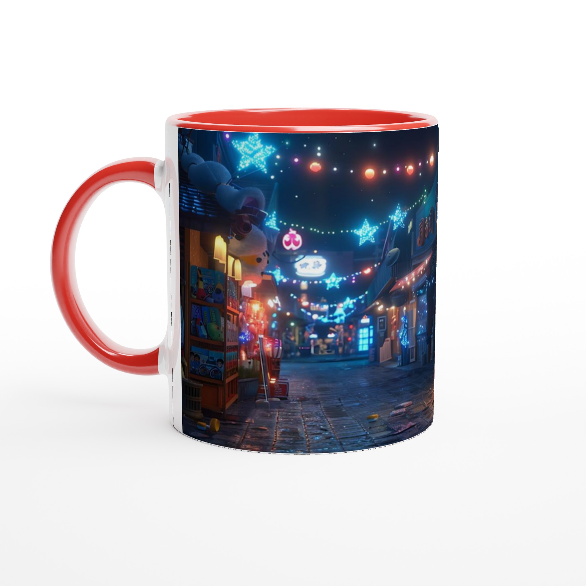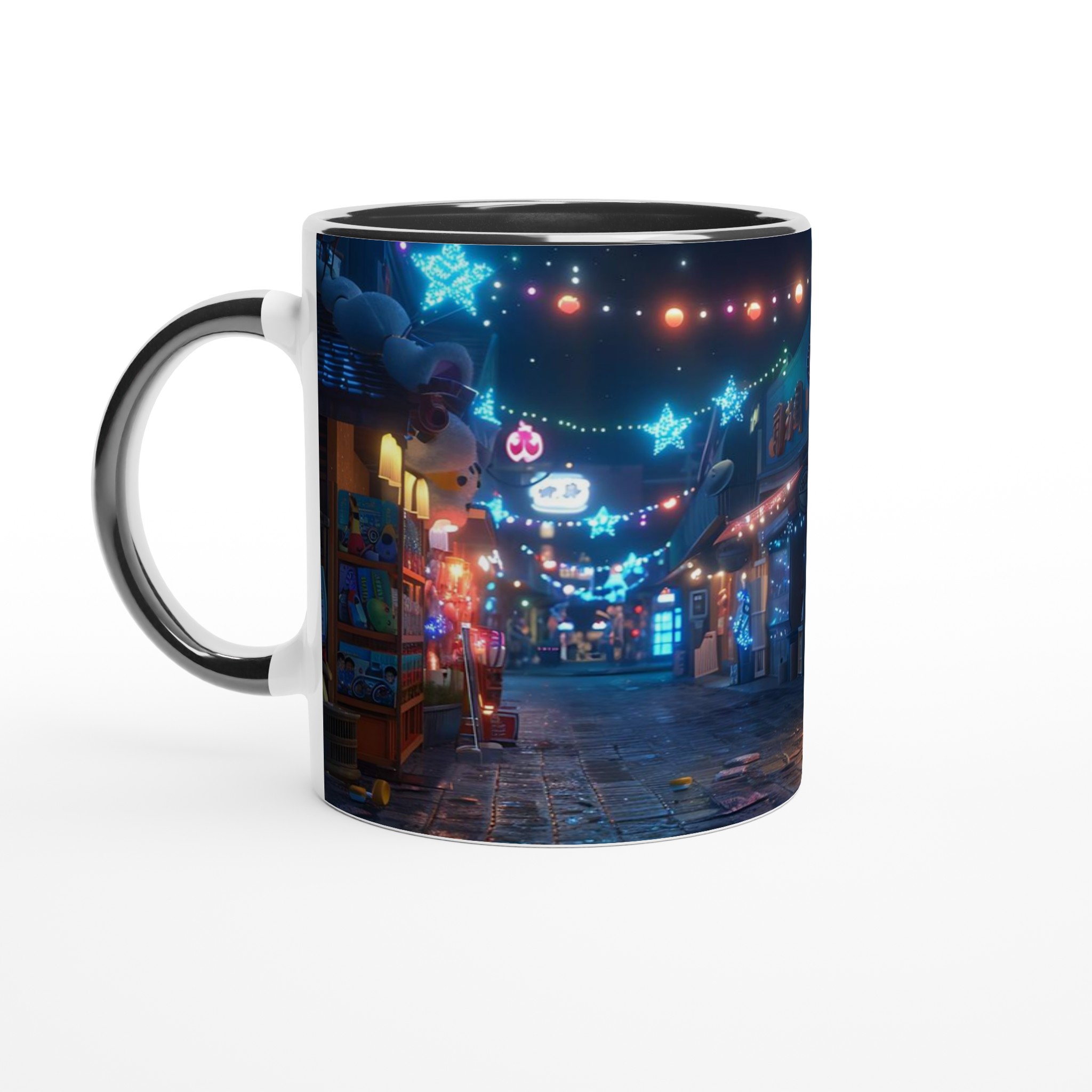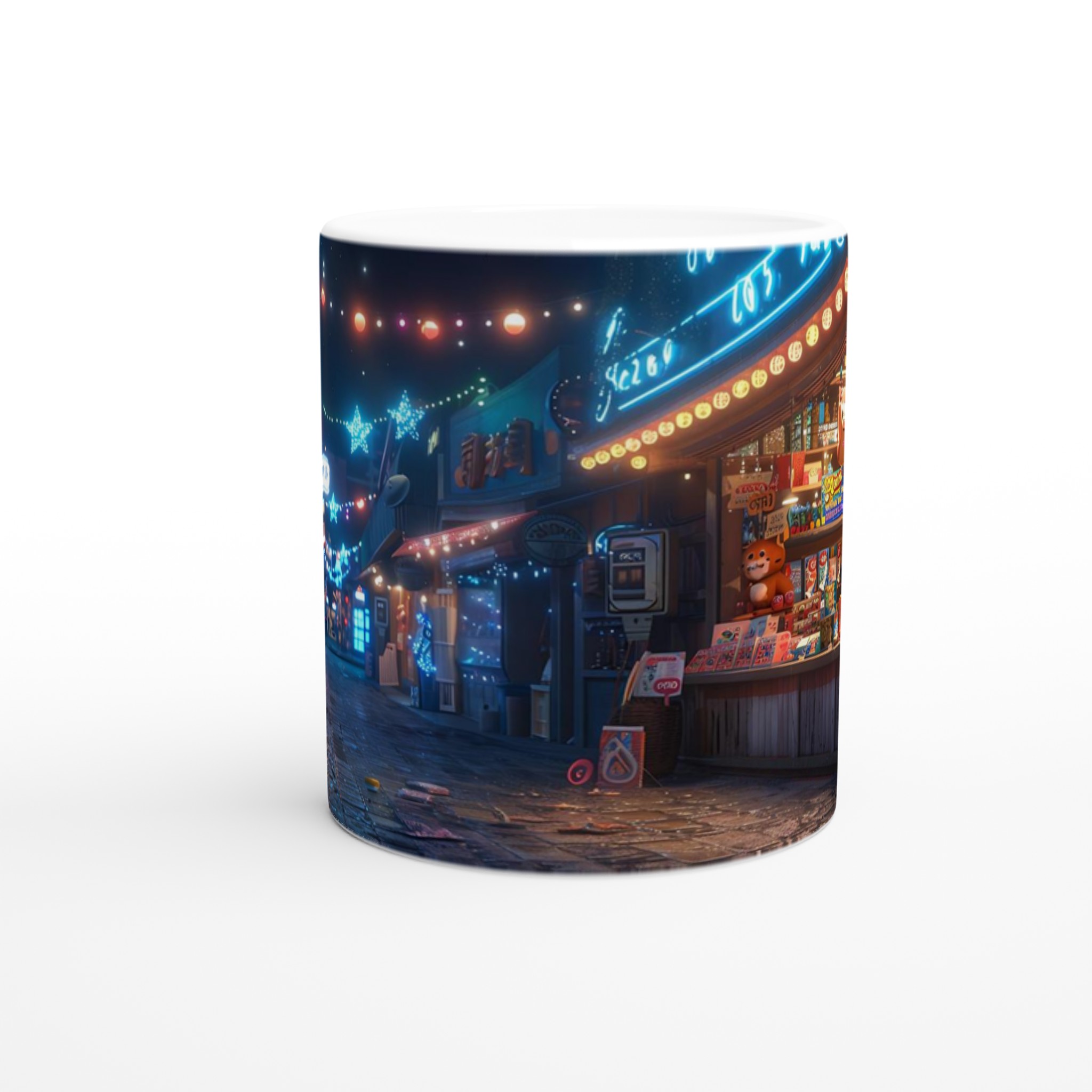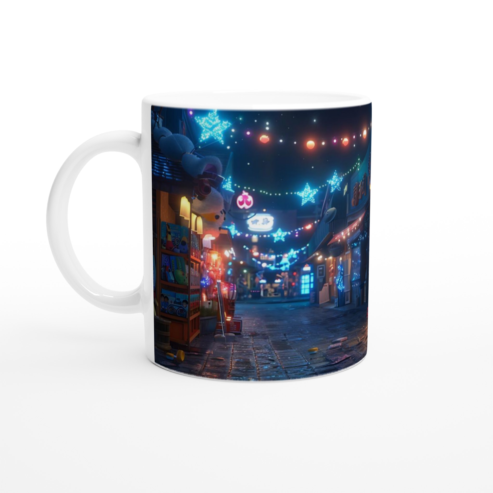 Fånga magin från en glittrande nattmarknad varje gång du tar en klunk med vår Keramiska Mugg. Inspirerad av de livliga neonskyltarna och stjärnhimlen i en drömlik gränd, förvandlar denna mugg ditt morgonkaffe, kvällens varma choklad eller tekoppen till en stund av ren förtrollning. Den blanka ytan framhäver tryck med klara och levande färger, som håller sig fina även efter otaliga turer i mikron och diskmaskinen, redo att sprida glädje dag efter dag.