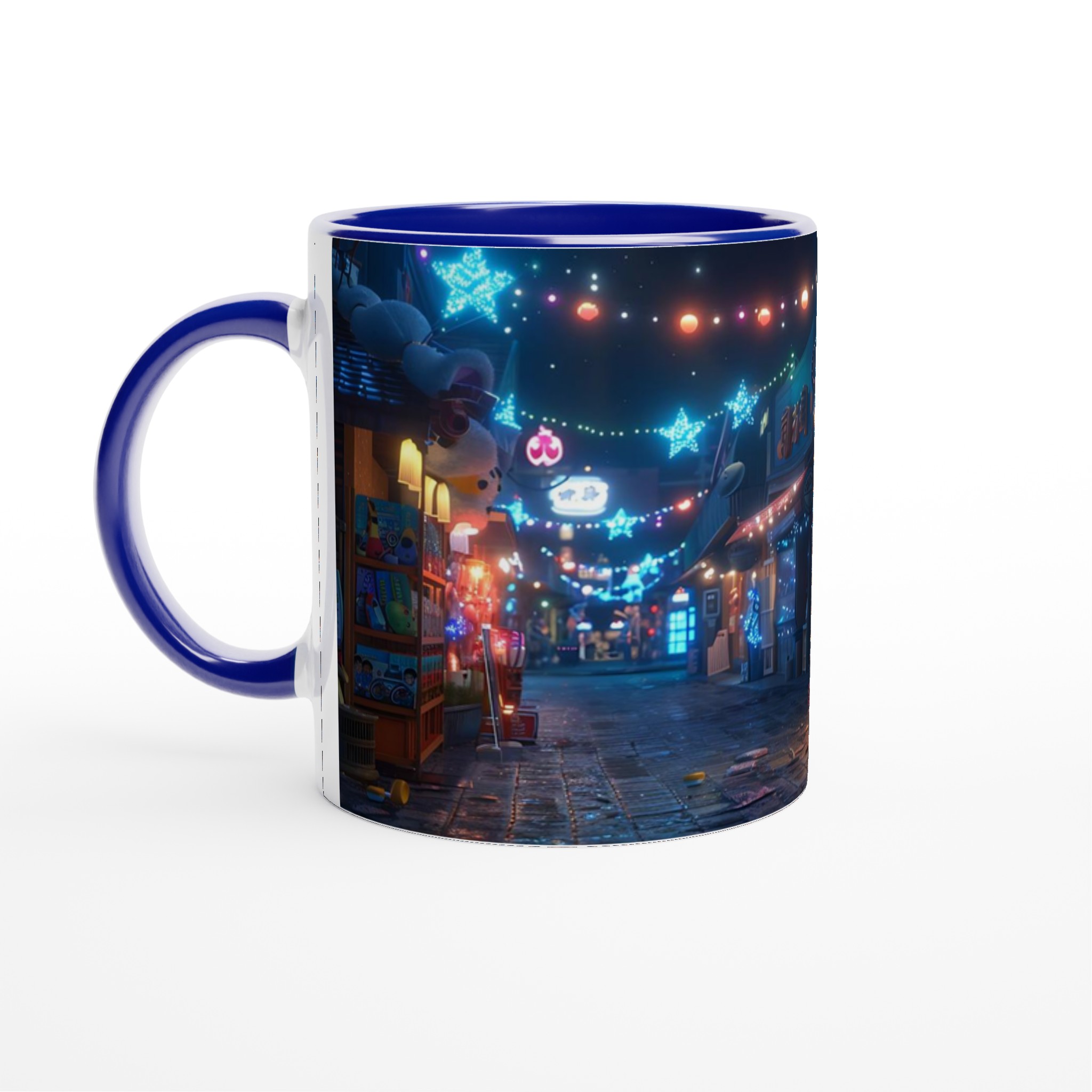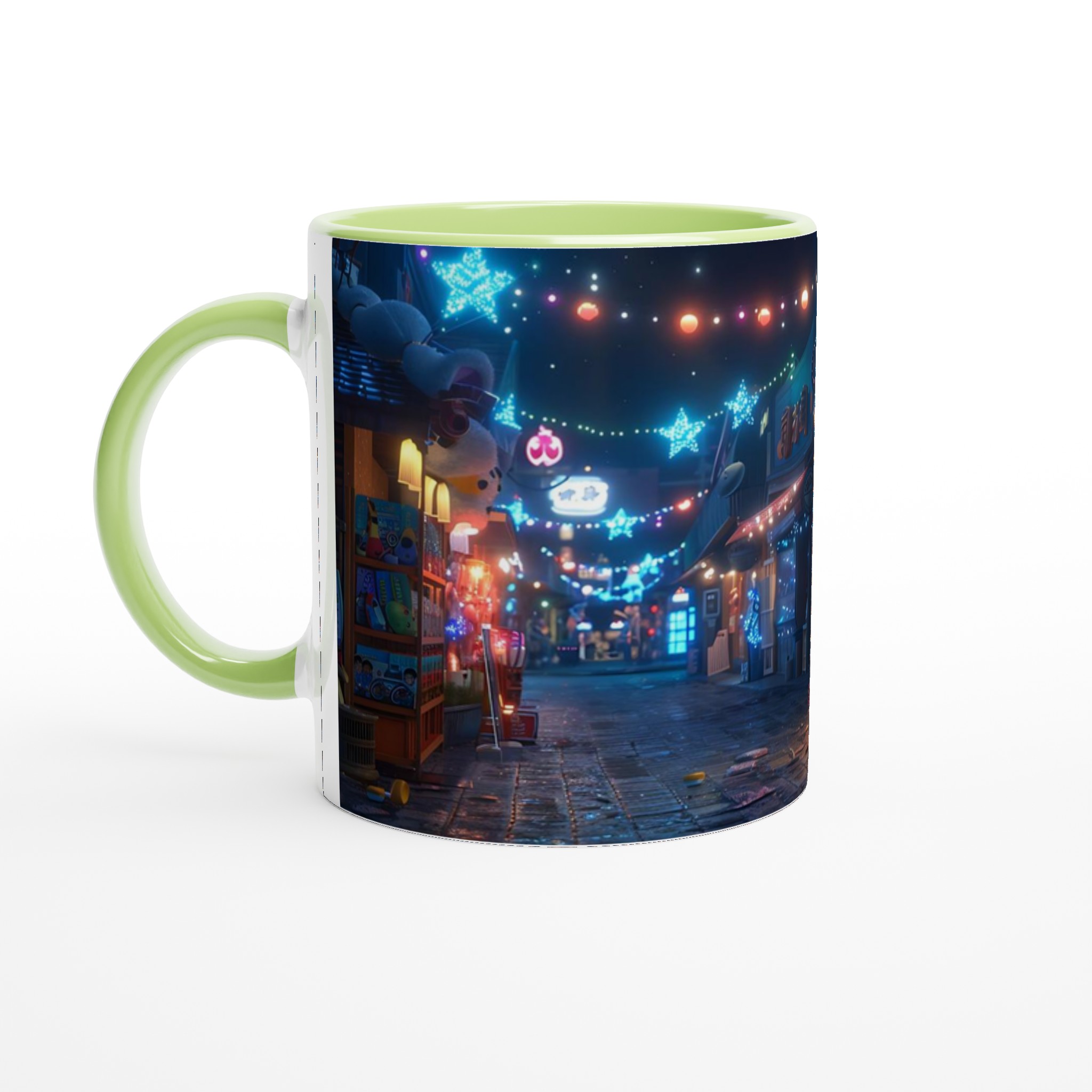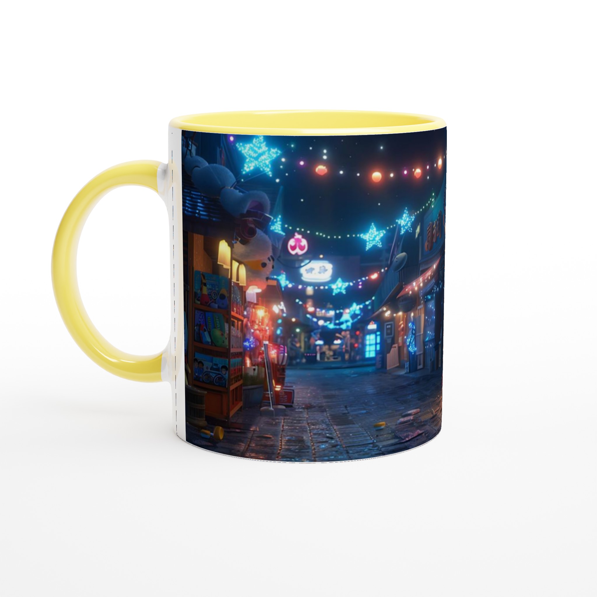 Fånga magin från en glittrande nattmarknad varje gång du tar en klunk med vår Keramiska Mugg. Inspirerad av de livliga neonskyltarna och stjärnhimlen i en drömlik gränd, förvandlar denna mugg ditt morgonkaffe, kvällens varma choklad eller tekoppen till en stund av ren förtrollning. Den blanka ytan framhäver tryck med klara och levande färger, som håller sig fina även efter otaliga turer i mikron och diskmaskinen, redo att sprida glädje dag efter dag.