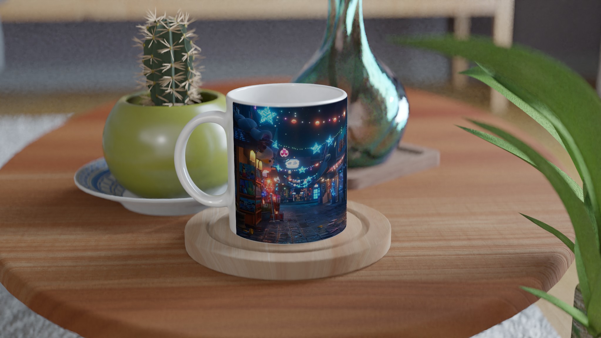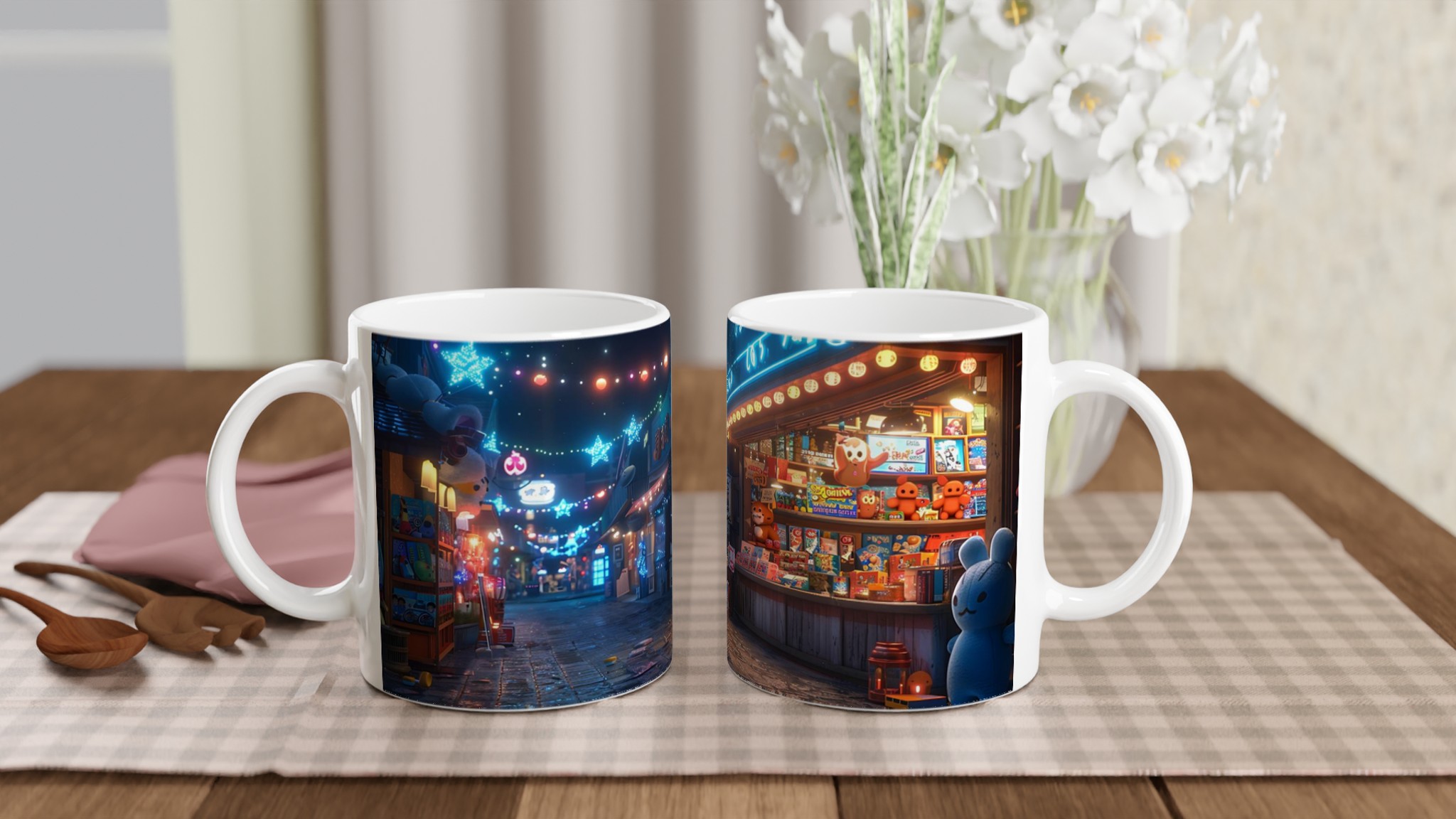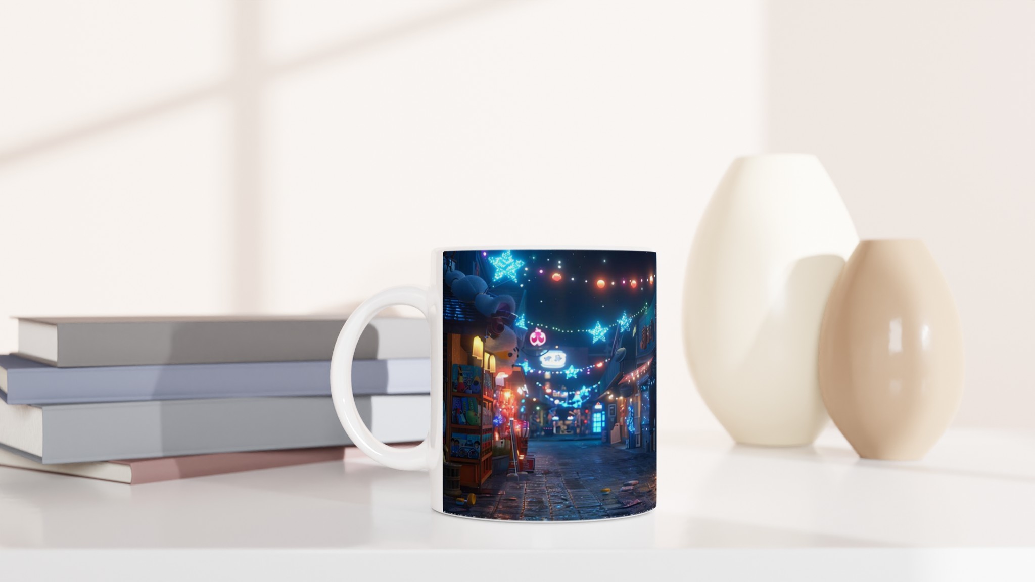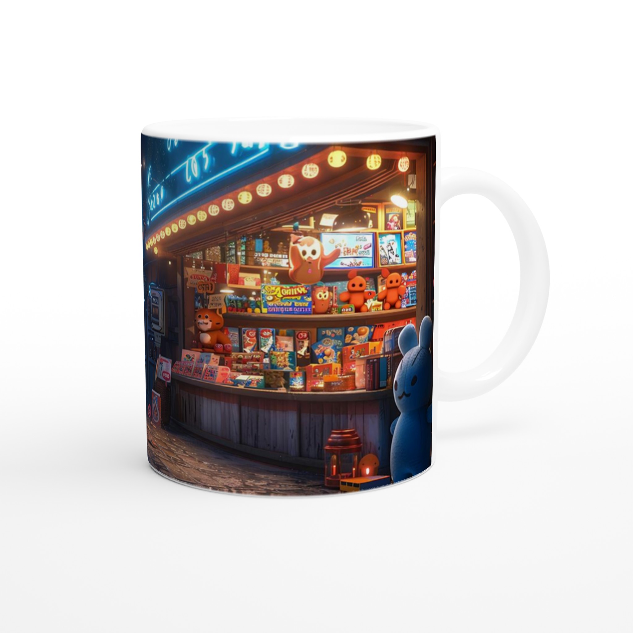 Fånga magin från en glittrande nattmarknad varje gång du tar en klunk med vår Keramiska Mugg. Inspirerad av de livliga neonskyltarna och stjärnhimlen i en drömlik gränd, förvandlar denna mugg ditt morgonkaffe, kvällens varma choklad eller tekoppen till en stund av ren förtrollning. Den blanka ytan framhäver tryck med klara och levande färger, som håller sig fina även efter otaliga turer i mikron och diskmaskinen, redo att sprida glädje dag efter dag.