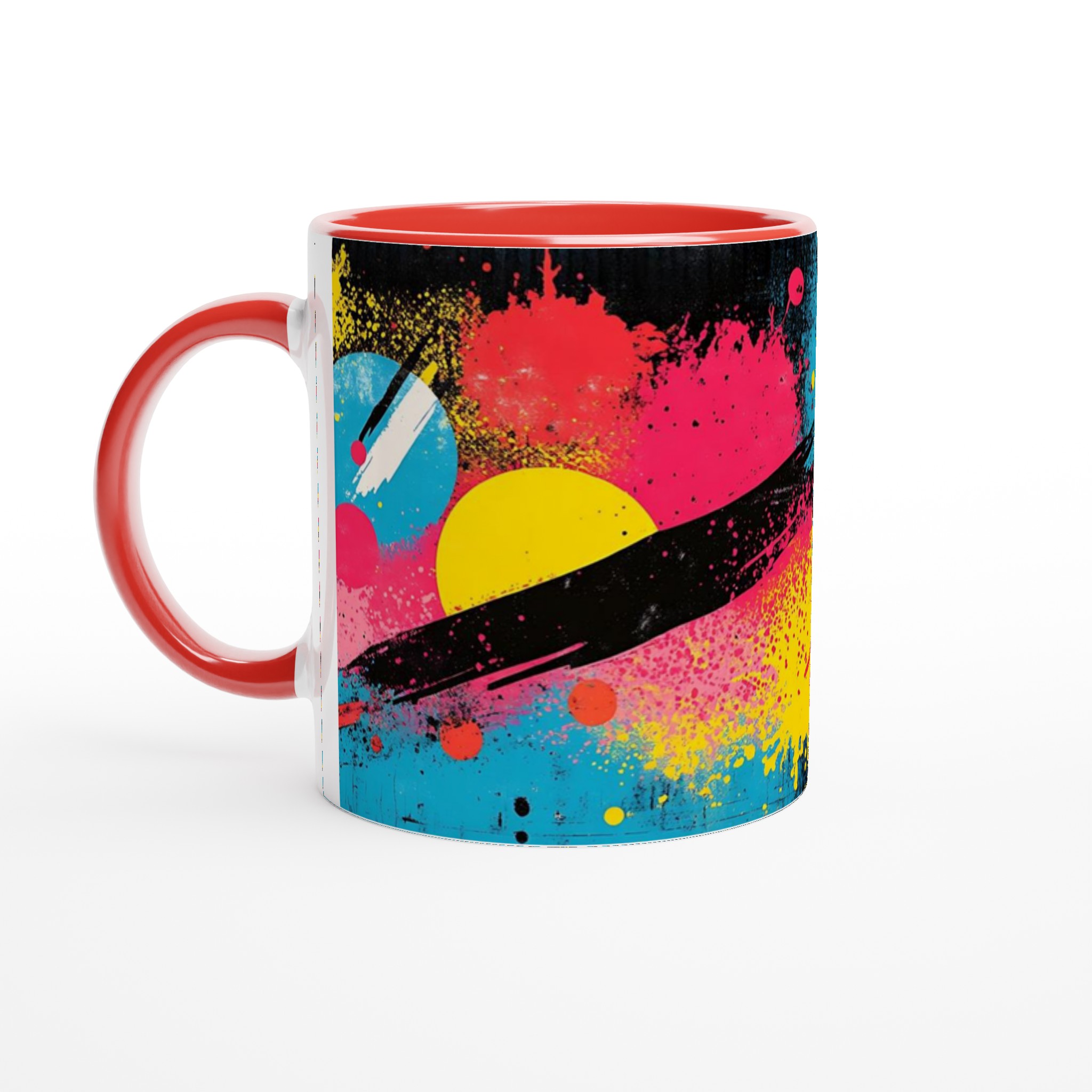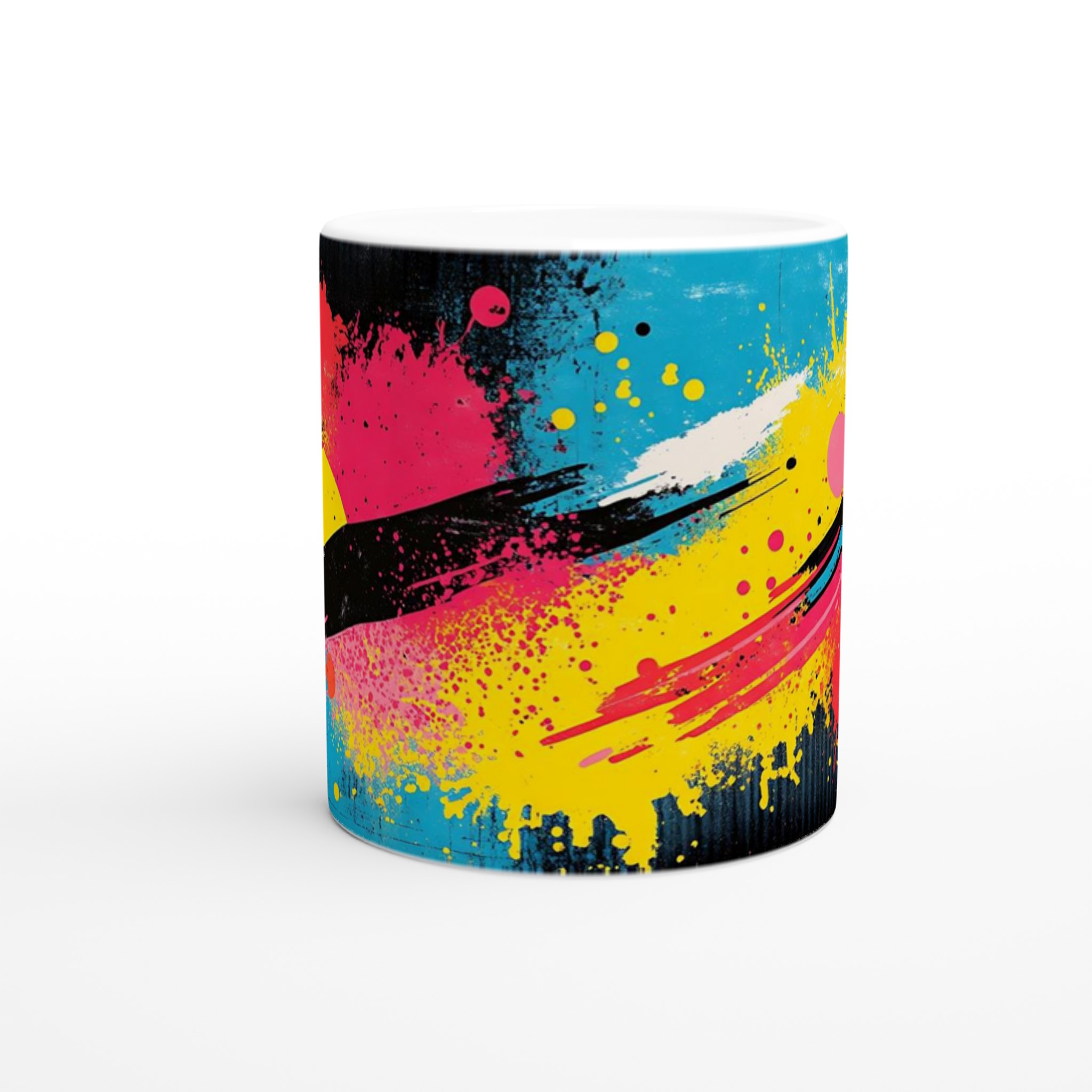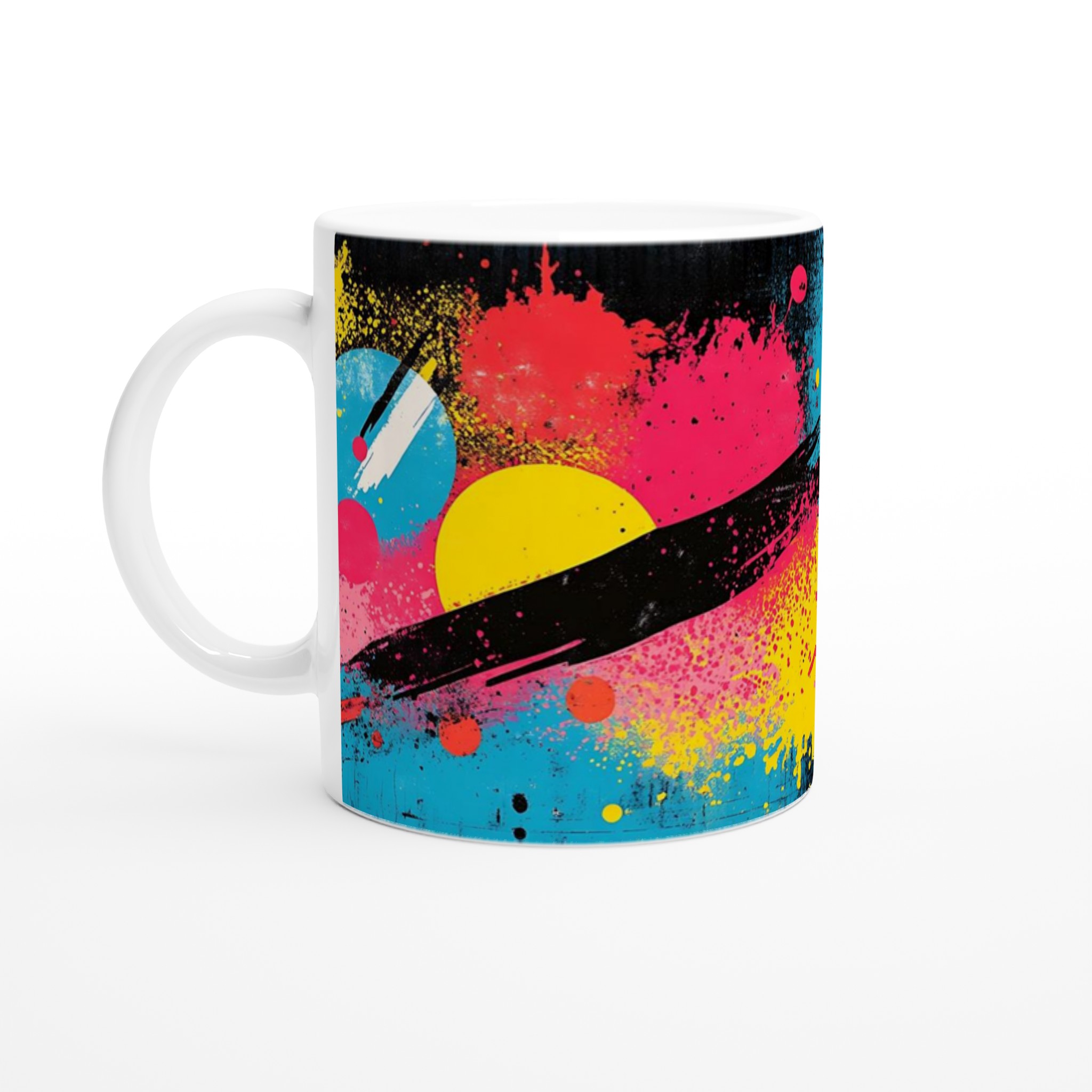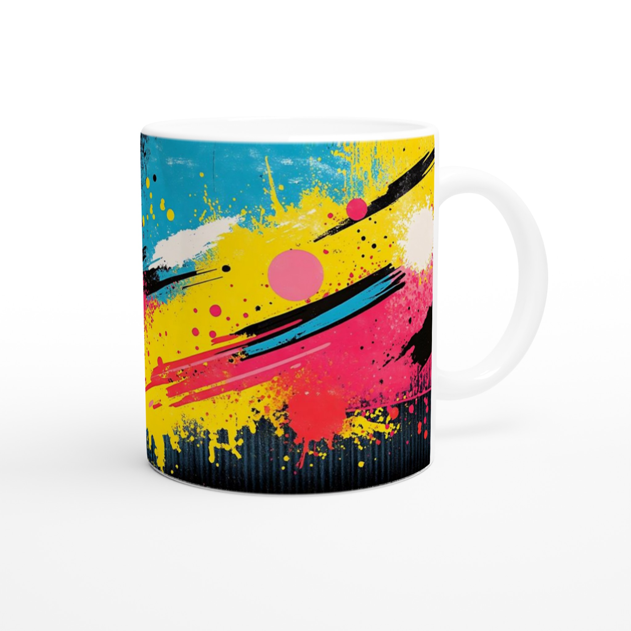 Inspirerad av den energifyllda och livfulla neonpopkonsten med stänk av gult, rosa, rött och blått mot en djup svart bakgrund, är denna mugg en explosion av färg och glädje. Den blanka vita ytan ger ett skarpt och levande tryck som verkligen sticker ut, oavsett om det är en personlig design, ett roligt citat eller en present till någon du tycker om.