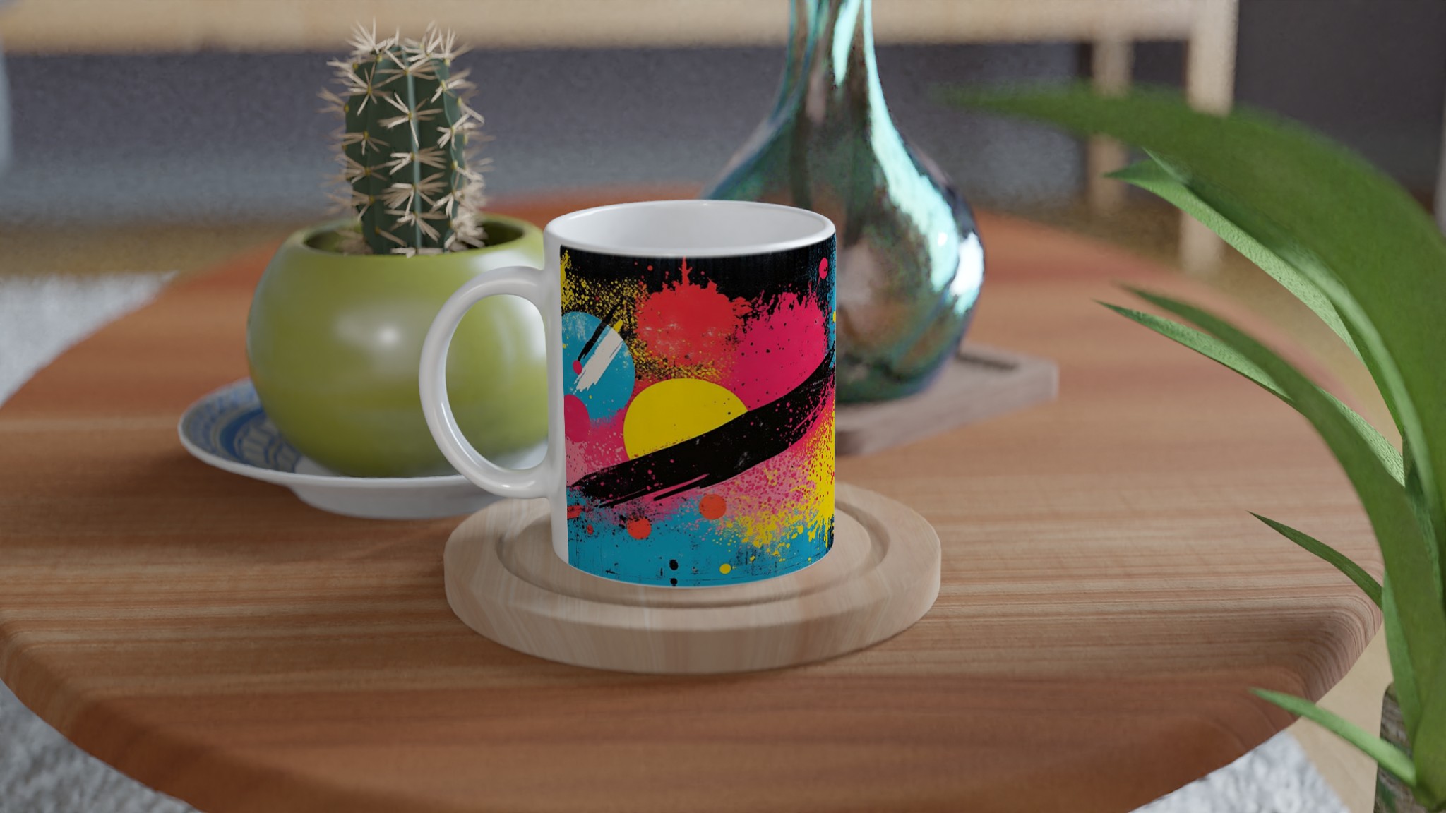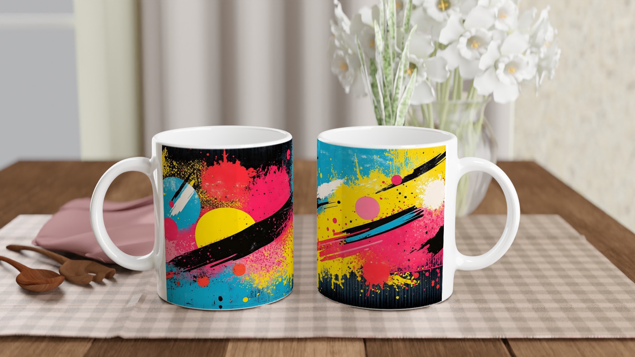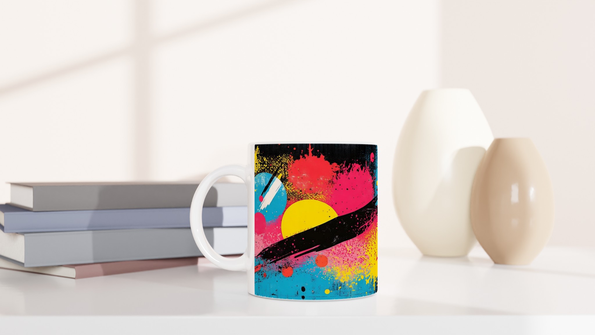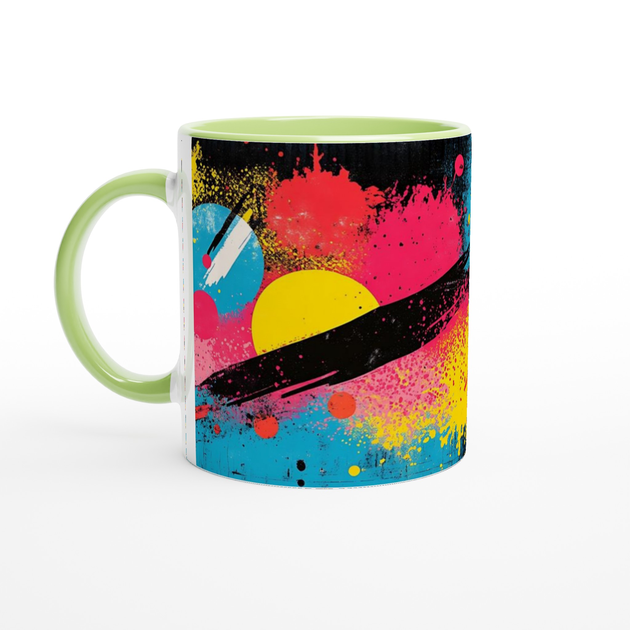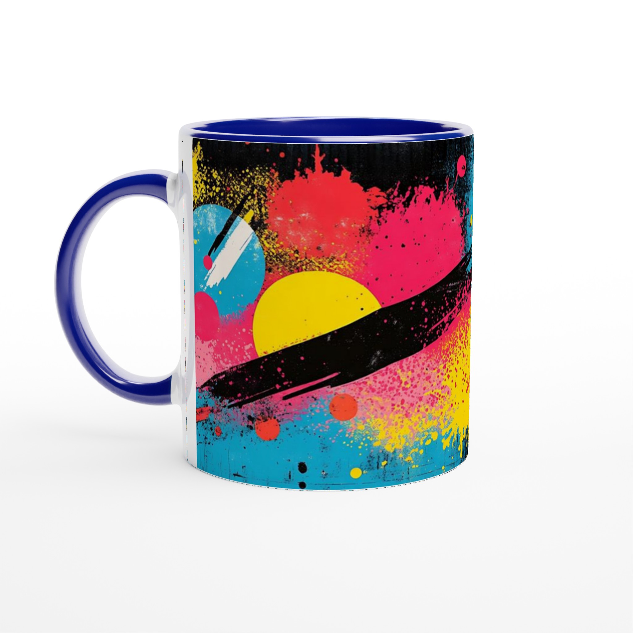 Inspirerad av den energifyllda och livfulla neonpopkonsten med stänk av gult, rosa, rött och blått mot en djup svart bakgrund, är denna mugg en explosion av färg och glädje. Den blanka vita ytan ger ett skarpt och levande tryck som verkligen sticker ut, oavsett om det är en personlig design, ett roligt citat eller en present till någon du tycker om.