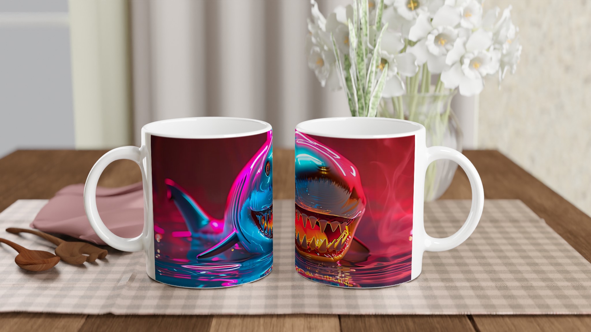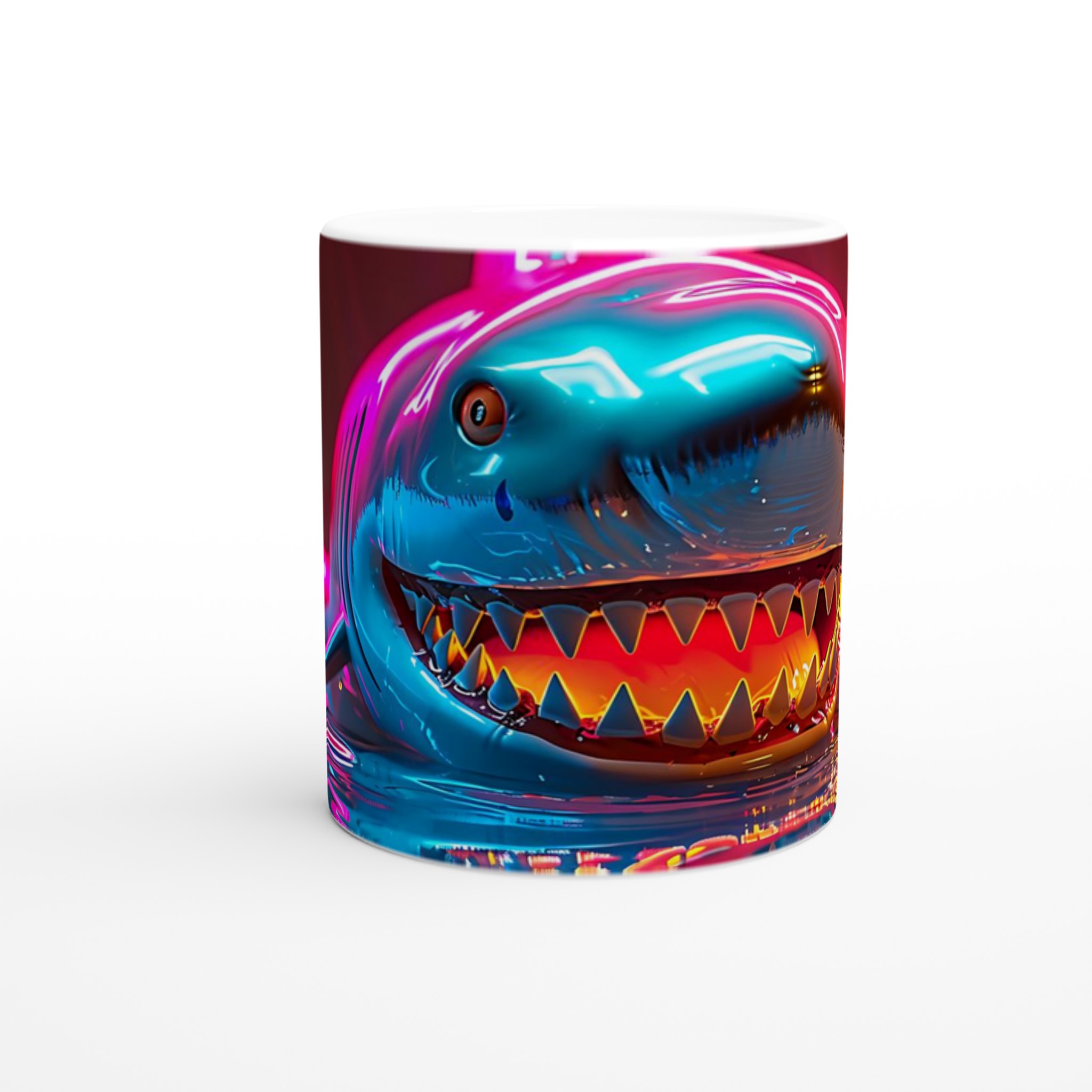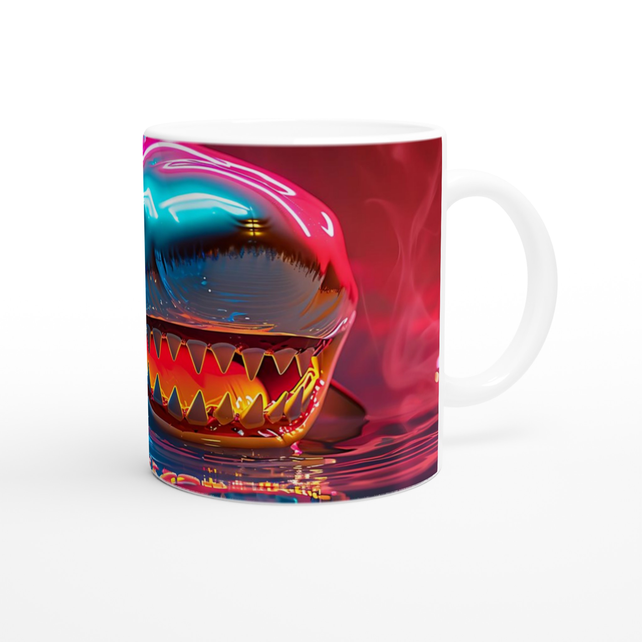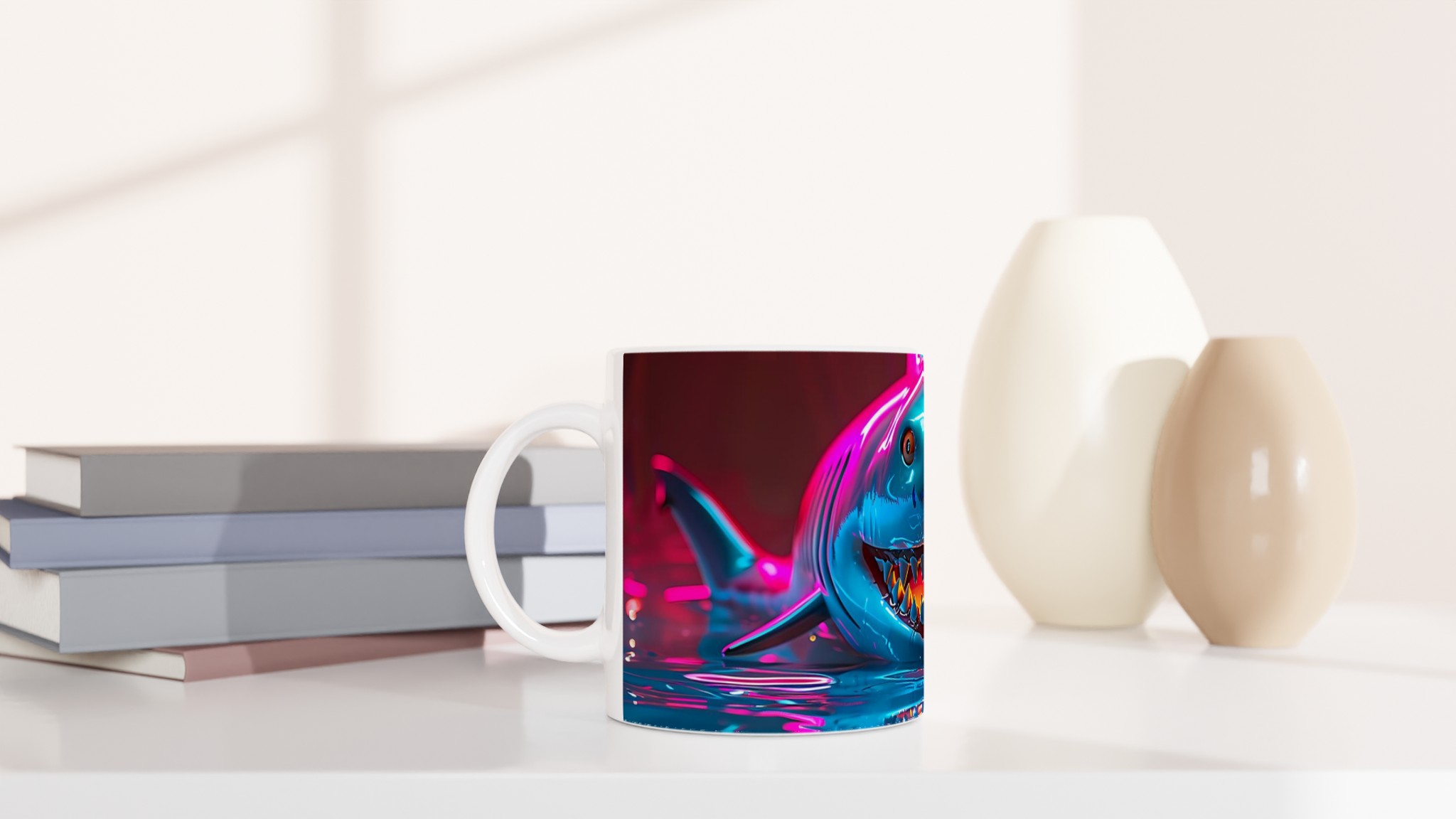 Den blanka vita ytan låter det djärva neonhaj-trycket framträda klart och färgstarkt, vilket gör muggen till en riktig favorit i vardagen. Med en volym på 11 oz (ca 3,25 dl) är den lagom stor för både jobb och hemmabruk. Vår höga kvalitet garanterar att trycket behåller sin lyster även efter otaliga omgångar i både mikrovågsugn och diskmaskin.