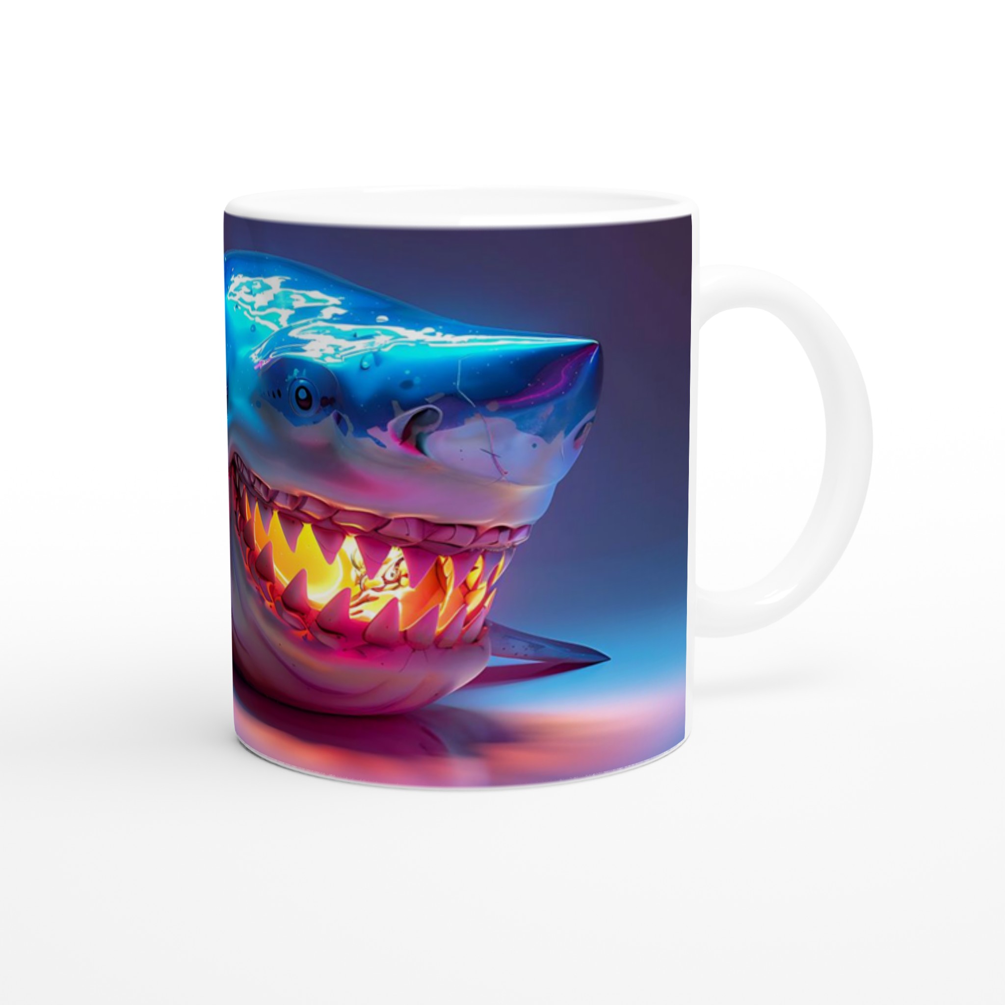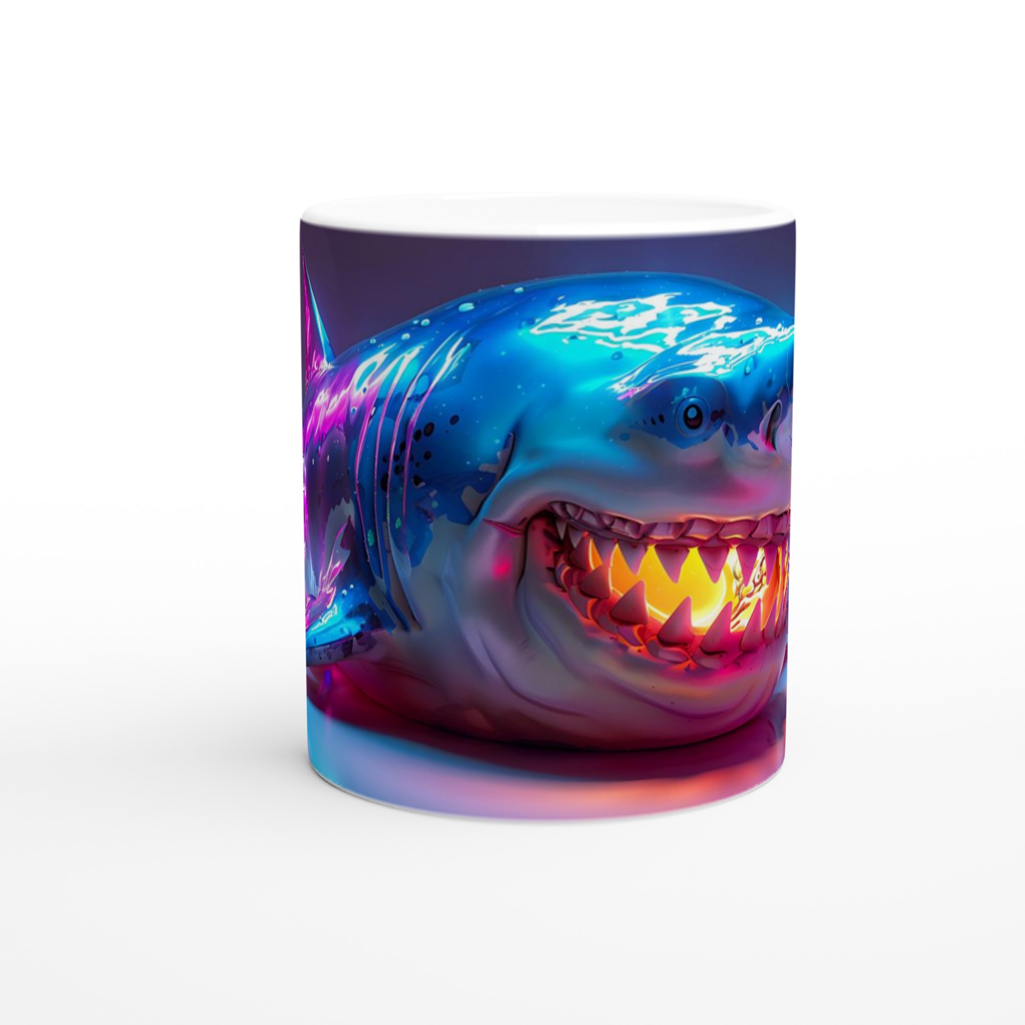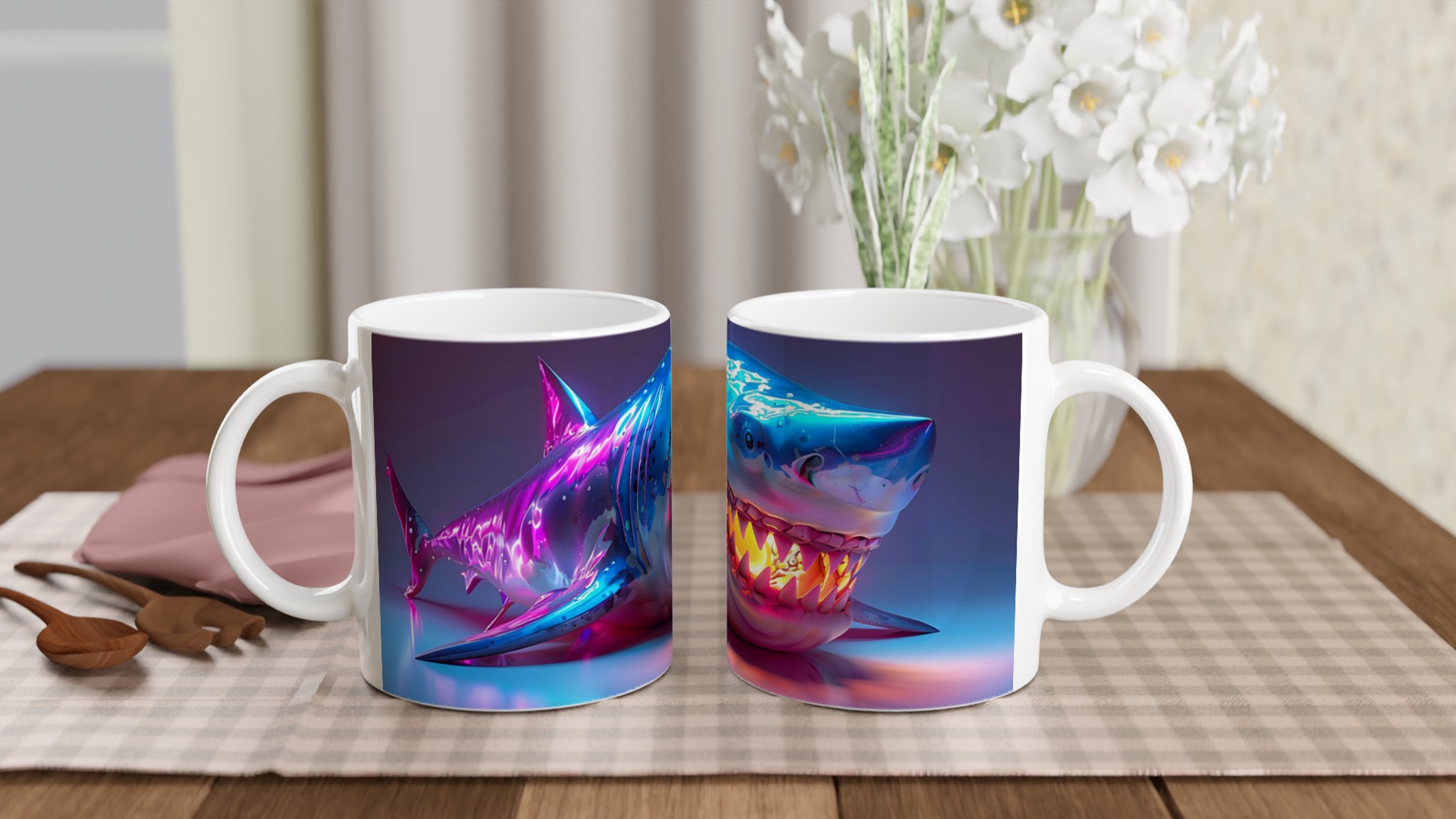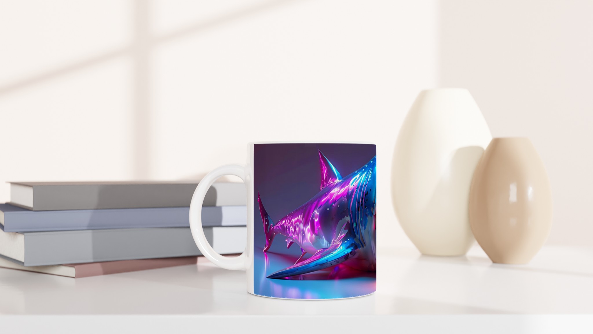 Fånga den elektriska energin i havet med vår ”Neon Shark Attack” keramiska mugg! Denna mugg förvandlar varje dryck till en upplevelse med sin iögonfallande design som föreställer en haj i levande neonblå, rosa och lila toner, med en mun som glöder av eldiga nyanser av orange och gult. Det är den perfekta muggen för att väcka dina sinnen på morgonen, liva upp eftermiddagskaffet, eller ge en oväntad twist till din kvällschoklad.