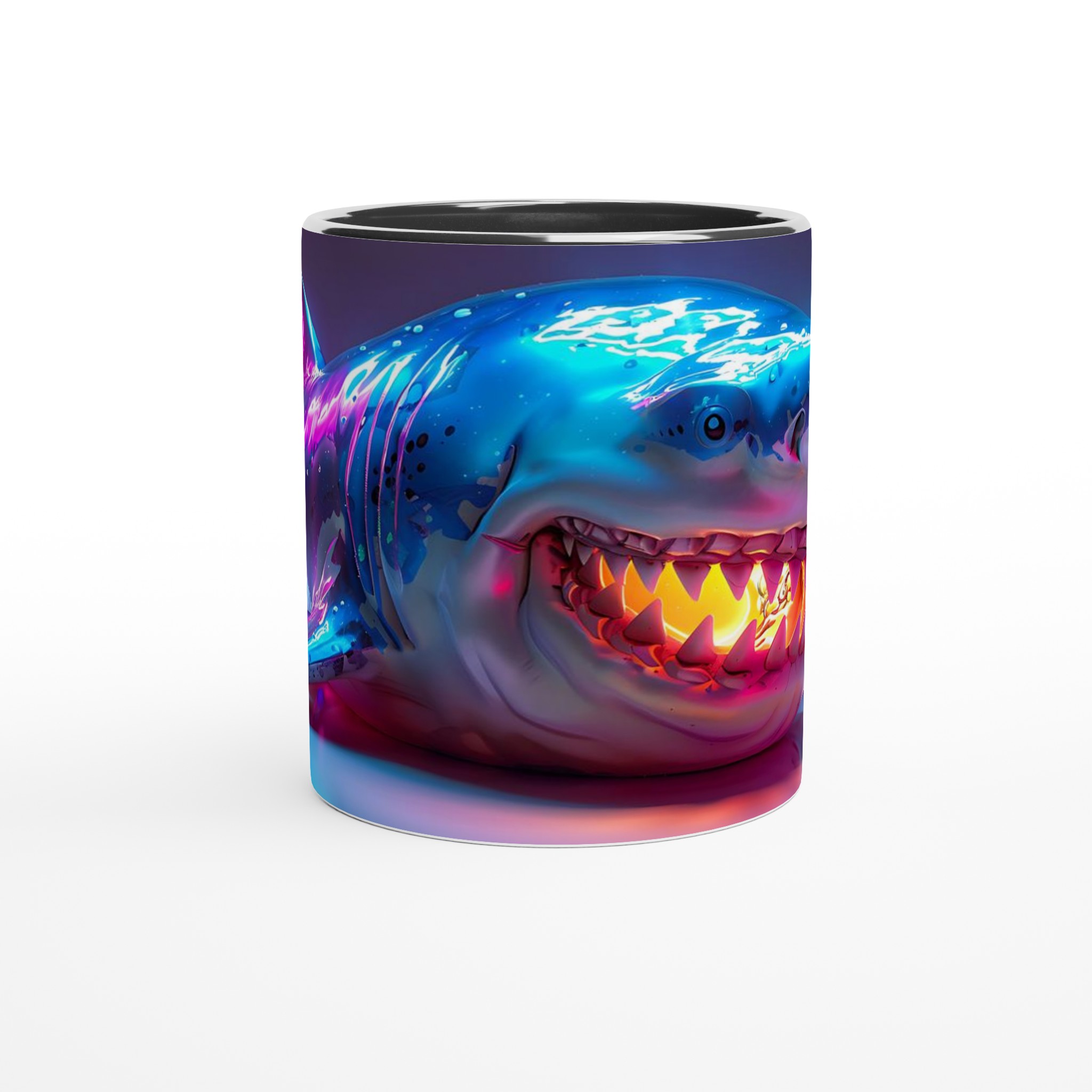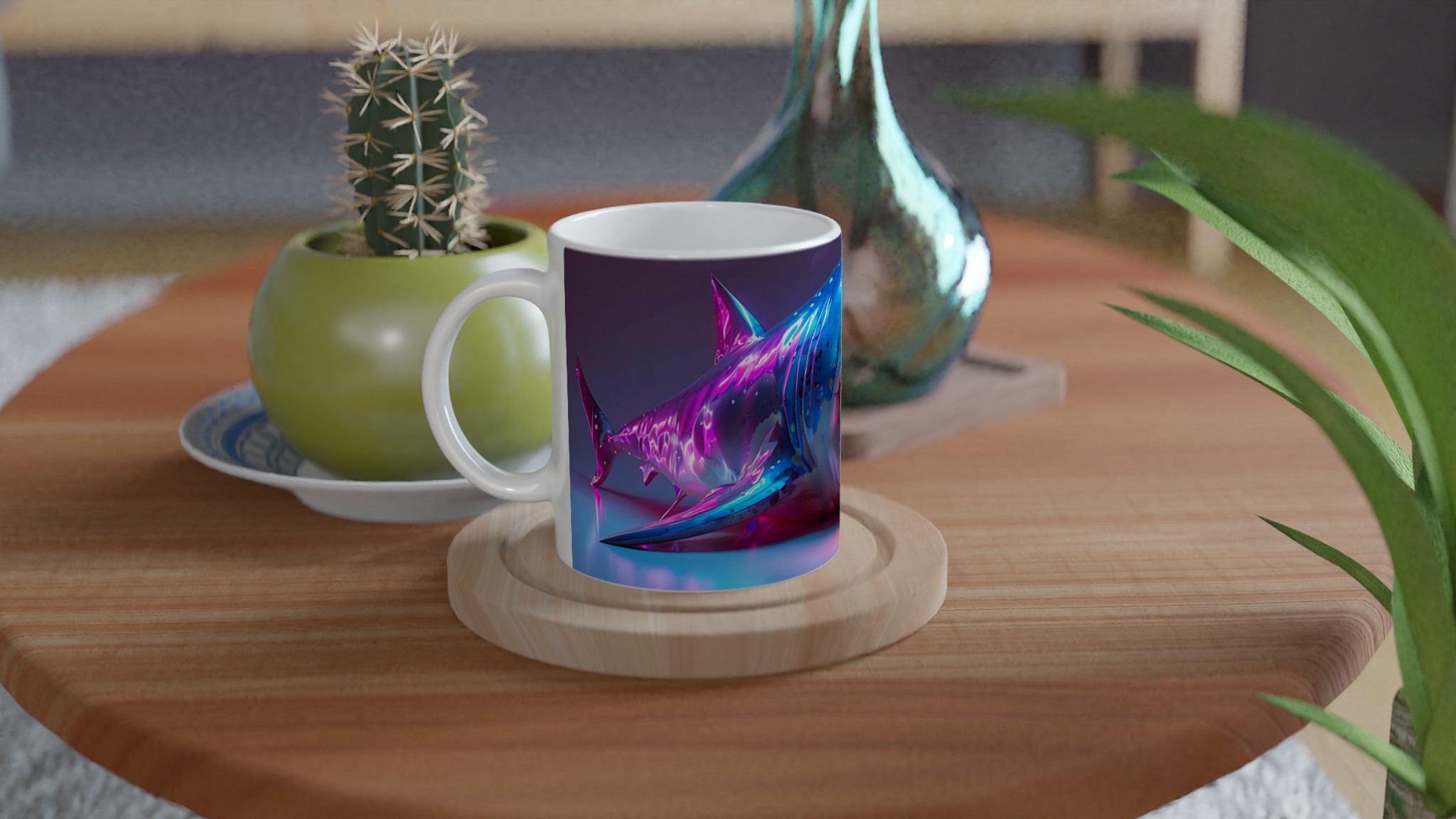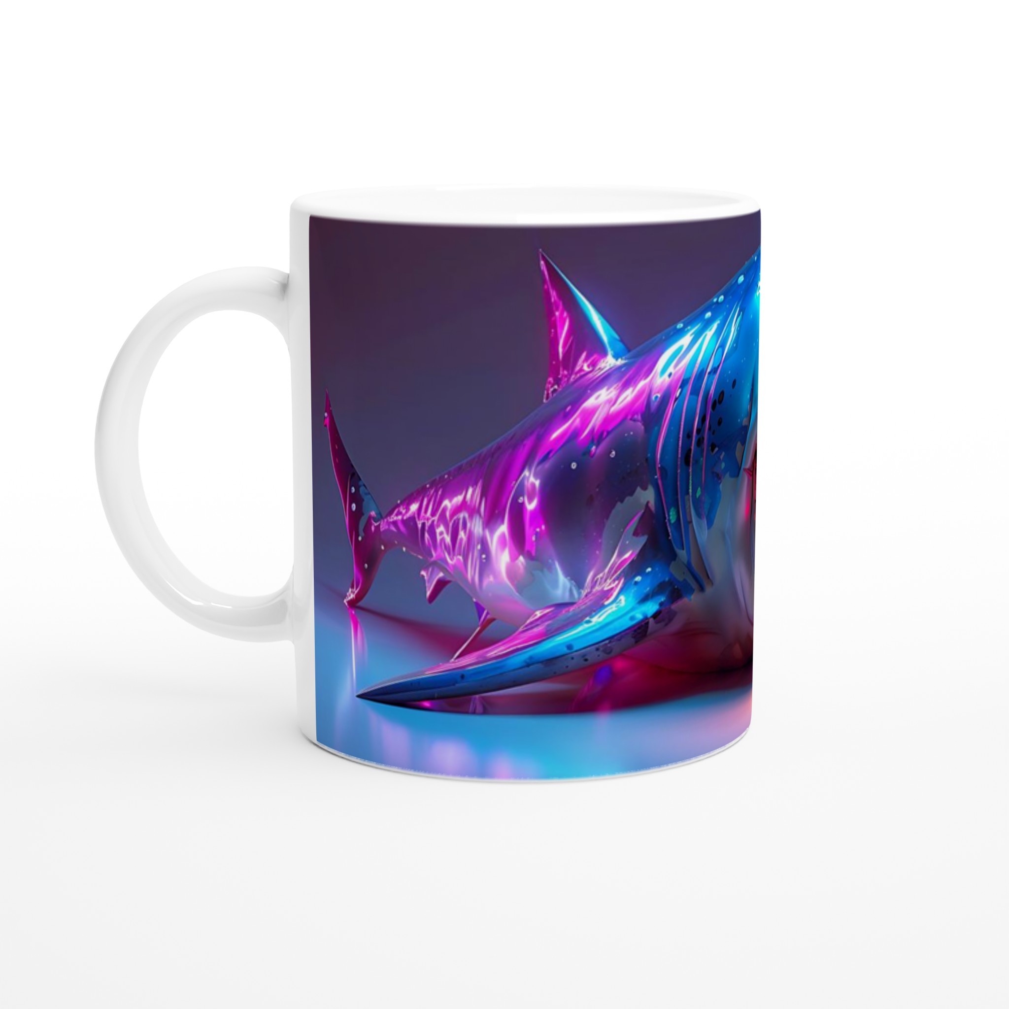 Fånga den elektriska energin i havet med vår ”Neon Shark Attack” keramiska mugg! Denna mugg förvandlar varje dryck till en upplevelse med sin iögonfallande design som föreställer en haj i levande neonblå, rosa och lila toner, med en mun som glöder av eldiga nyanser av orange och gult. Det är den perfekta muggen för att väcka dina sinnen på morgonen, liva upp eftermiddagskaffet, eller ge en oväntad twist till din kvällschoklad.