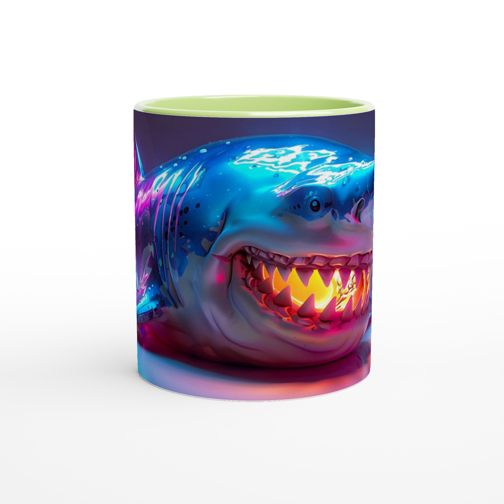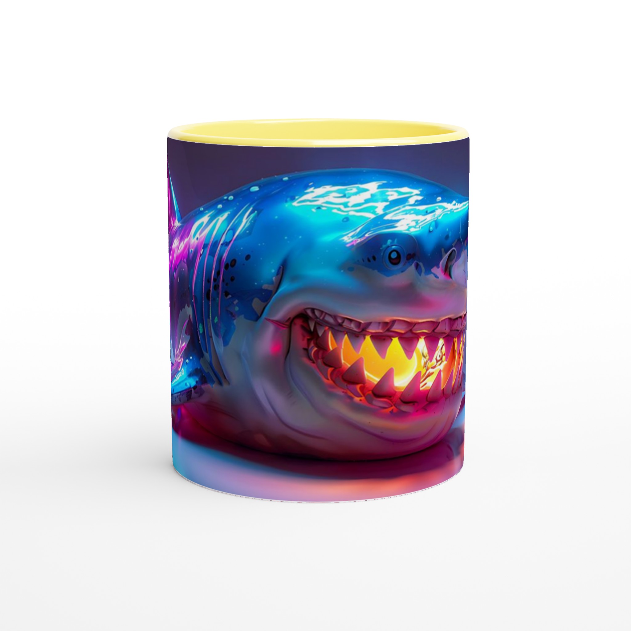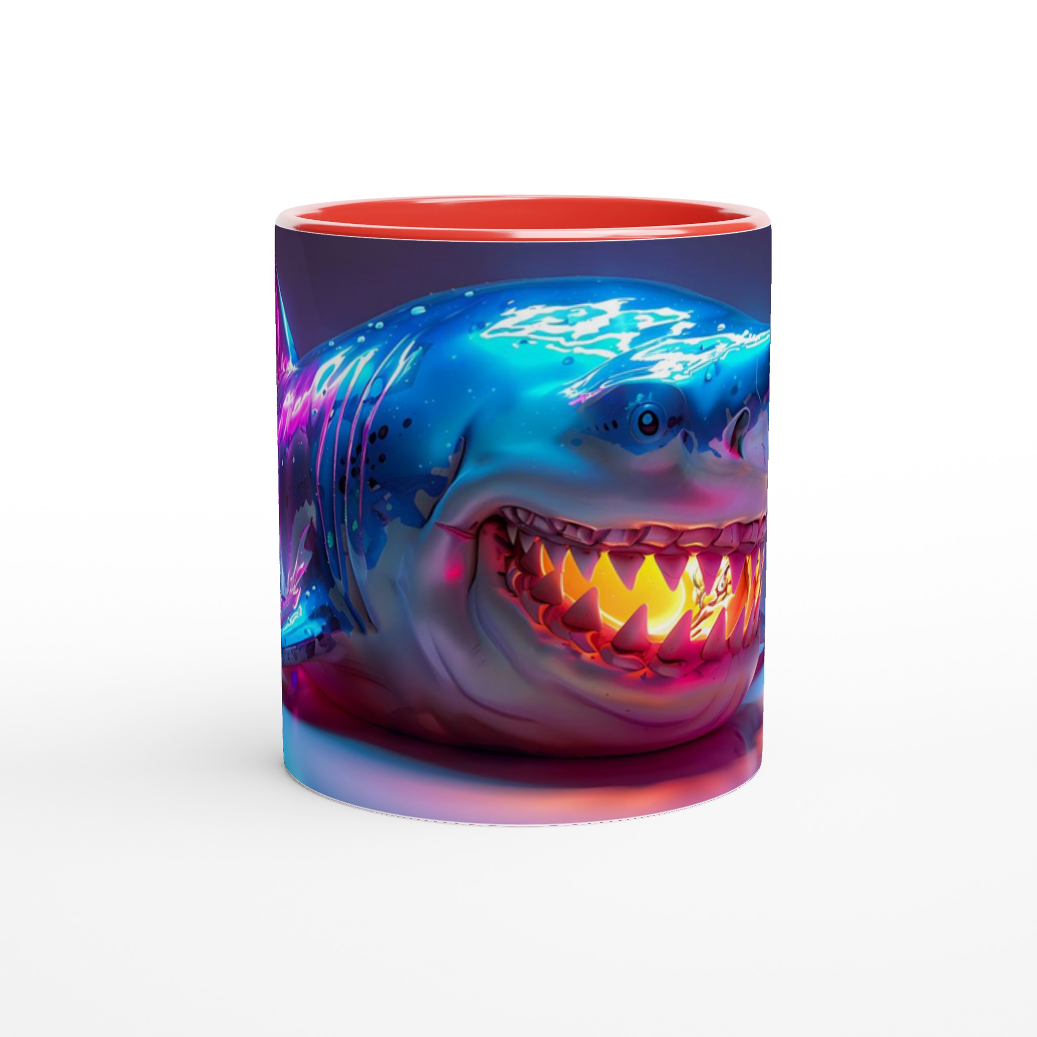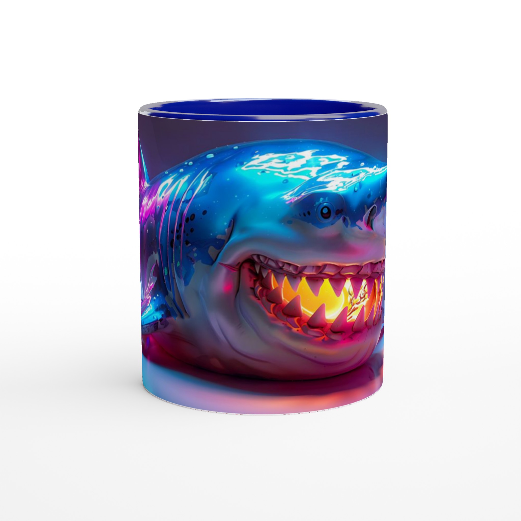 Fånga den elektriska energin i havet med vår ”Neon Shark Attack” keramiska mugg! Denna mugg förvandlar varje dryck till en upplevelse med sin iögonfallande design som föreställer en haj i levande neonblå, rosa och lila toner, med en mun som glöder av eldiga nyanser av orange och gult. Det är den perfekta muggen för att väcka dina sinnen på morgonen, liva upp eftermiddagskaffet, eller ge en oväntad twist till din kvällschoklad.