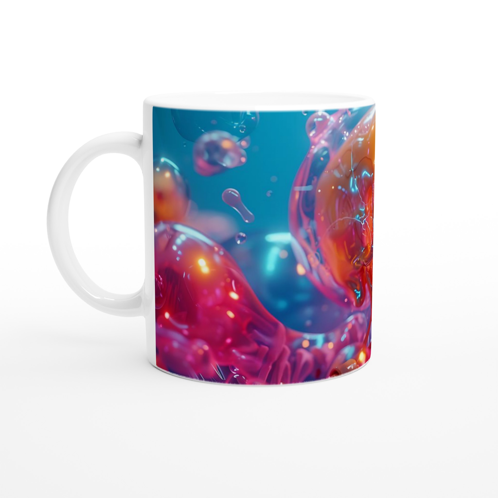 Denna mugg fångar den glödande energin från neonkonst, med en design inspirerad av ett hypnotiserande neonrosa och orange döskallemotiv som tycks sväva i en bubblande, surrealistisk undervattensvärld. Den blanka vita ytan ger ett skarpt och levande tryck som verkligen sticker ut, oavsett om det är en personlig design, ett roligt citat eller en present till någon du tycker om.