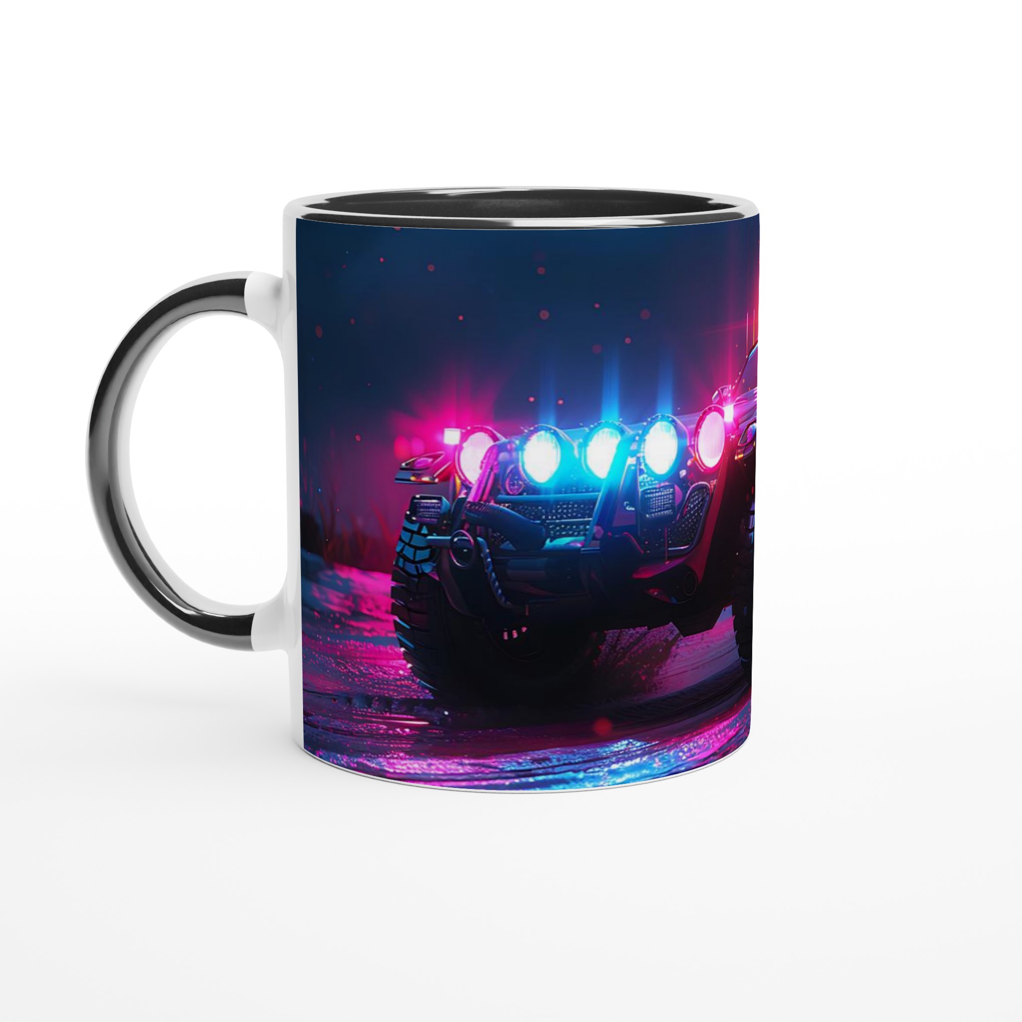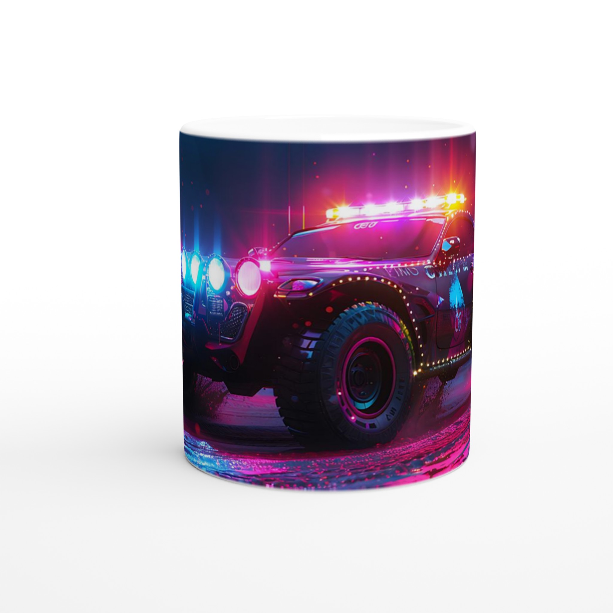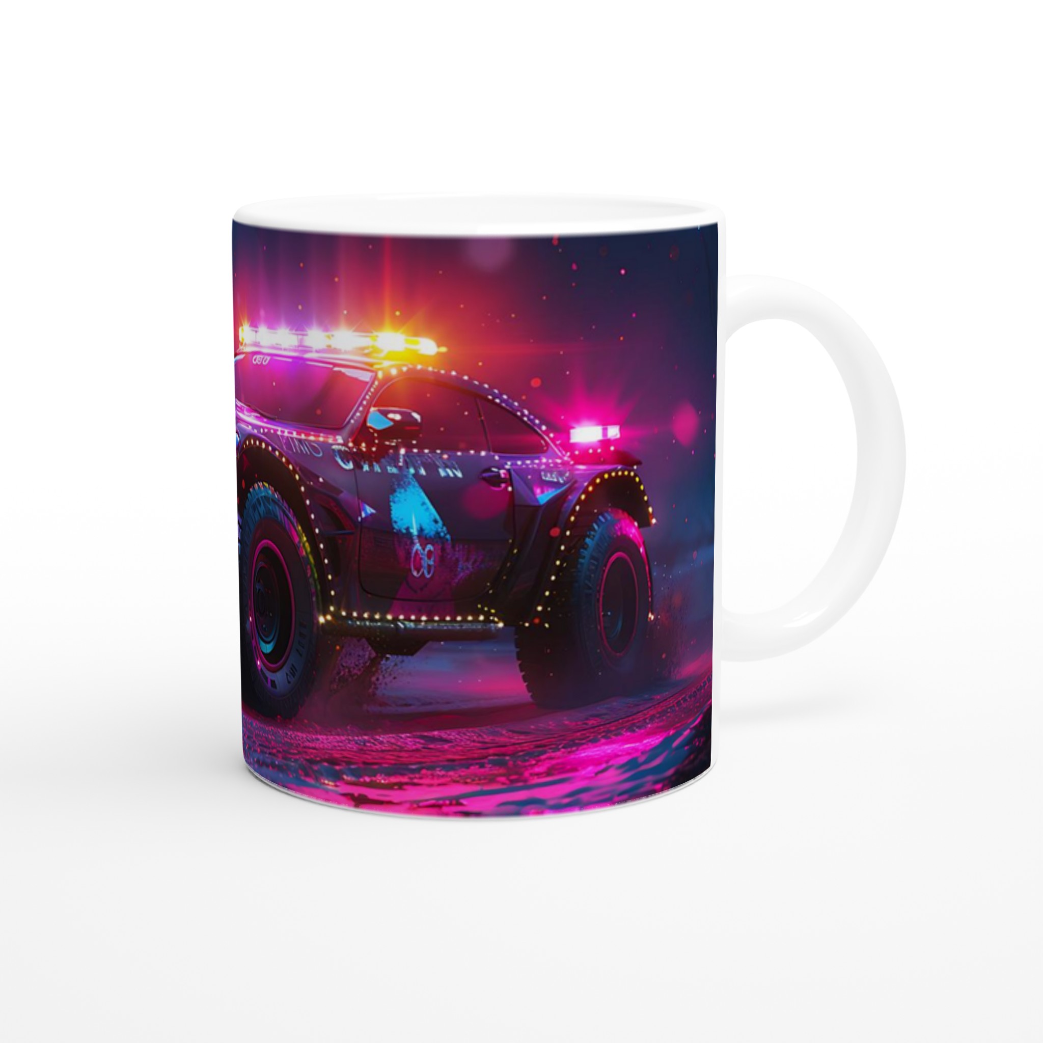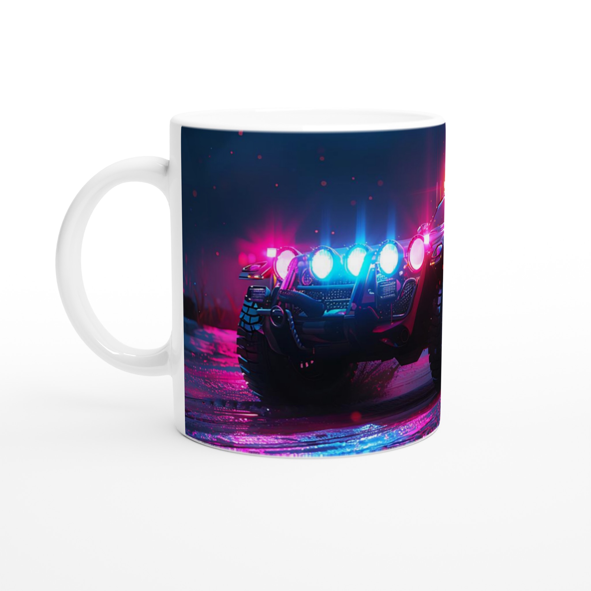 Ta med den pulserande energin från en neonupplyst nattkörning in i din vardag med denna spektakulära keramiska mugg. Den fångar den råa, cyberpunk-inspirerade estetiken av ett off-road fordon badat i djupt magenta och elektriskt blått ljus, vilket gör varje klunk till en upplevelse. Perfekt för morgonkaffet, kvällens varma choklad eller när du bara vill njuta av en kopp te. Den blanka vita ytan gör att trycken framhävs med klara och levande färger, som håller sig fina även efter många turer i mikron och diskmaskinen.