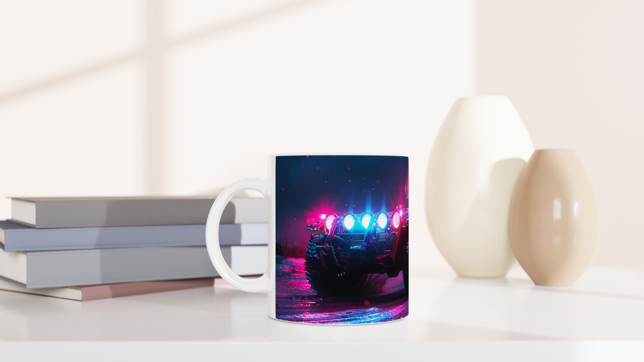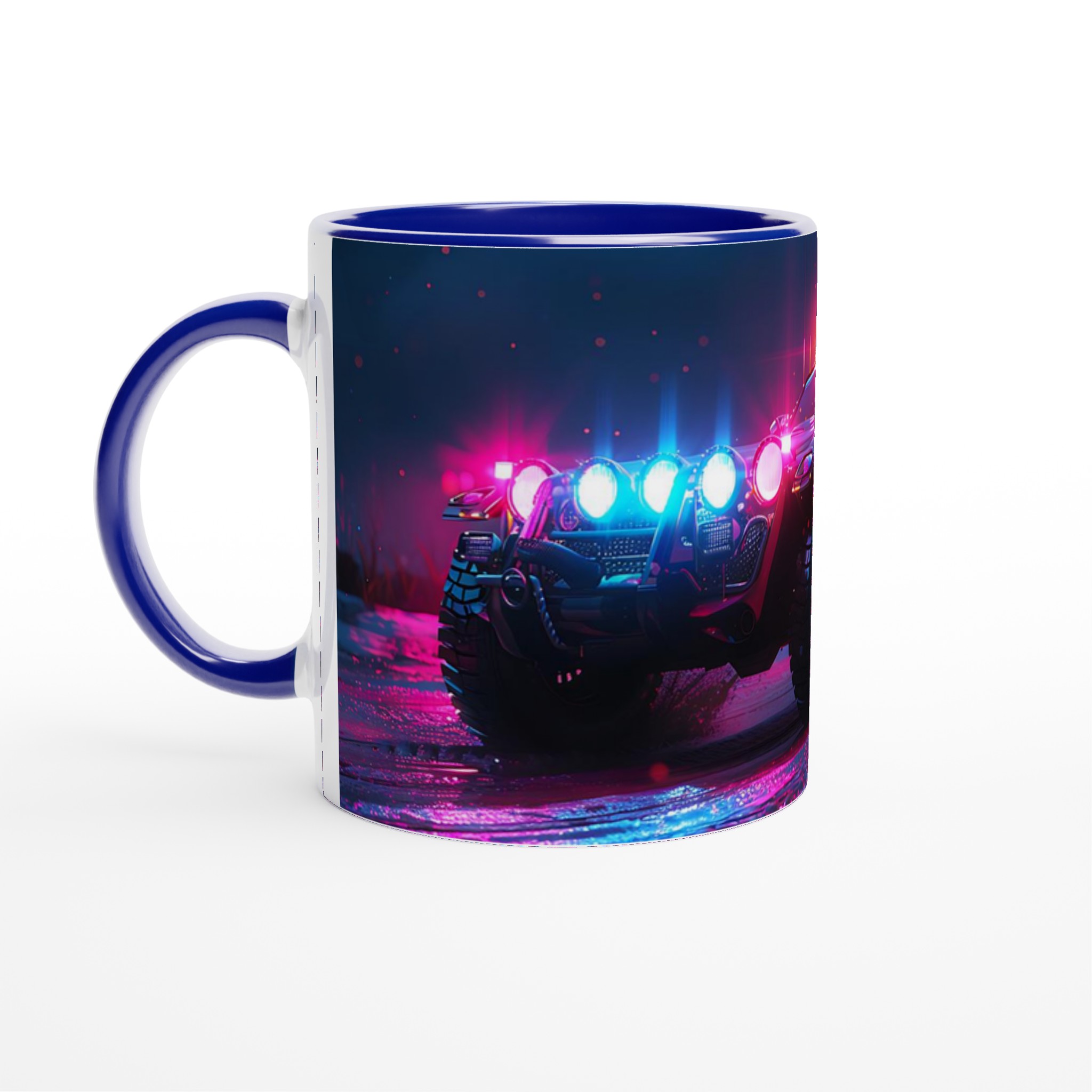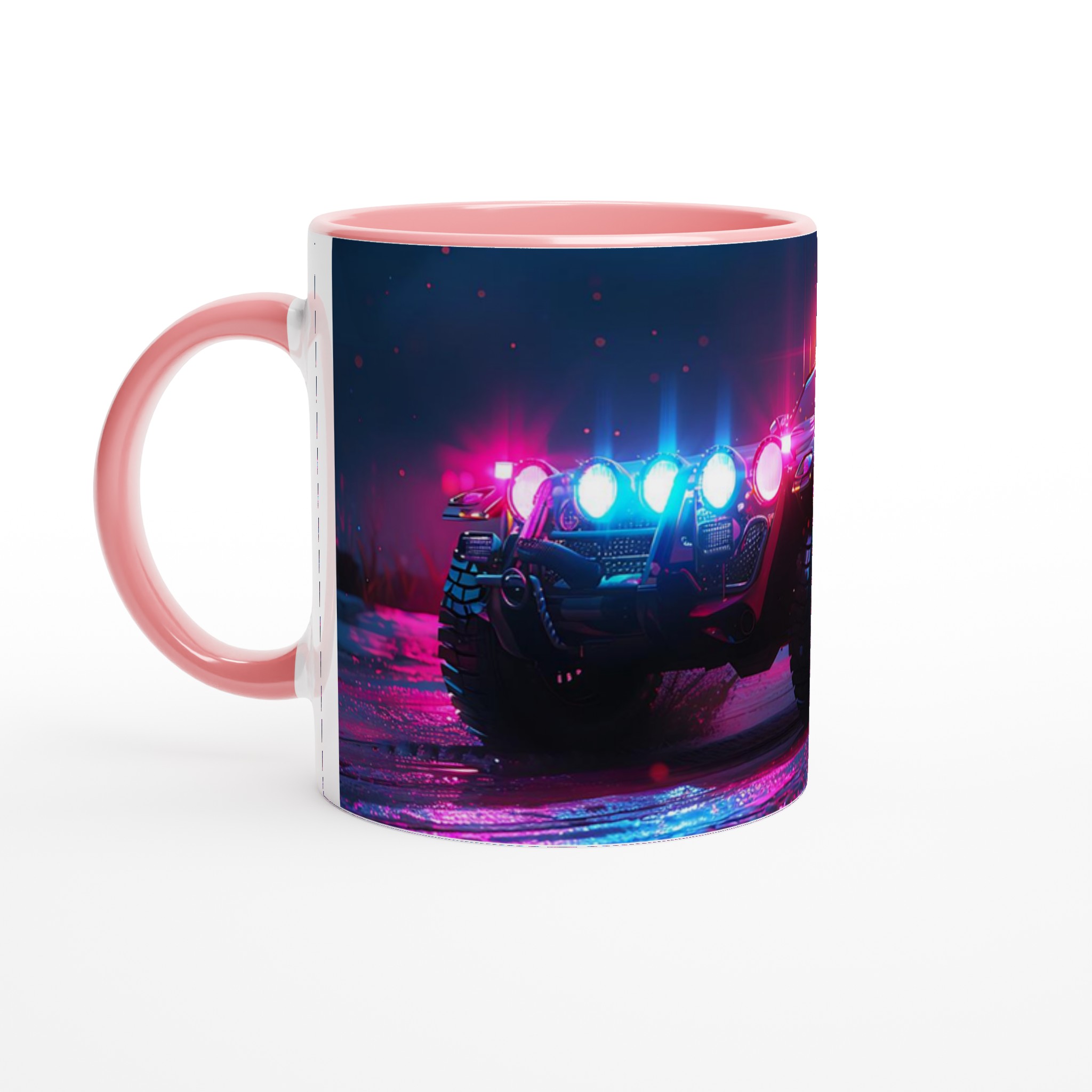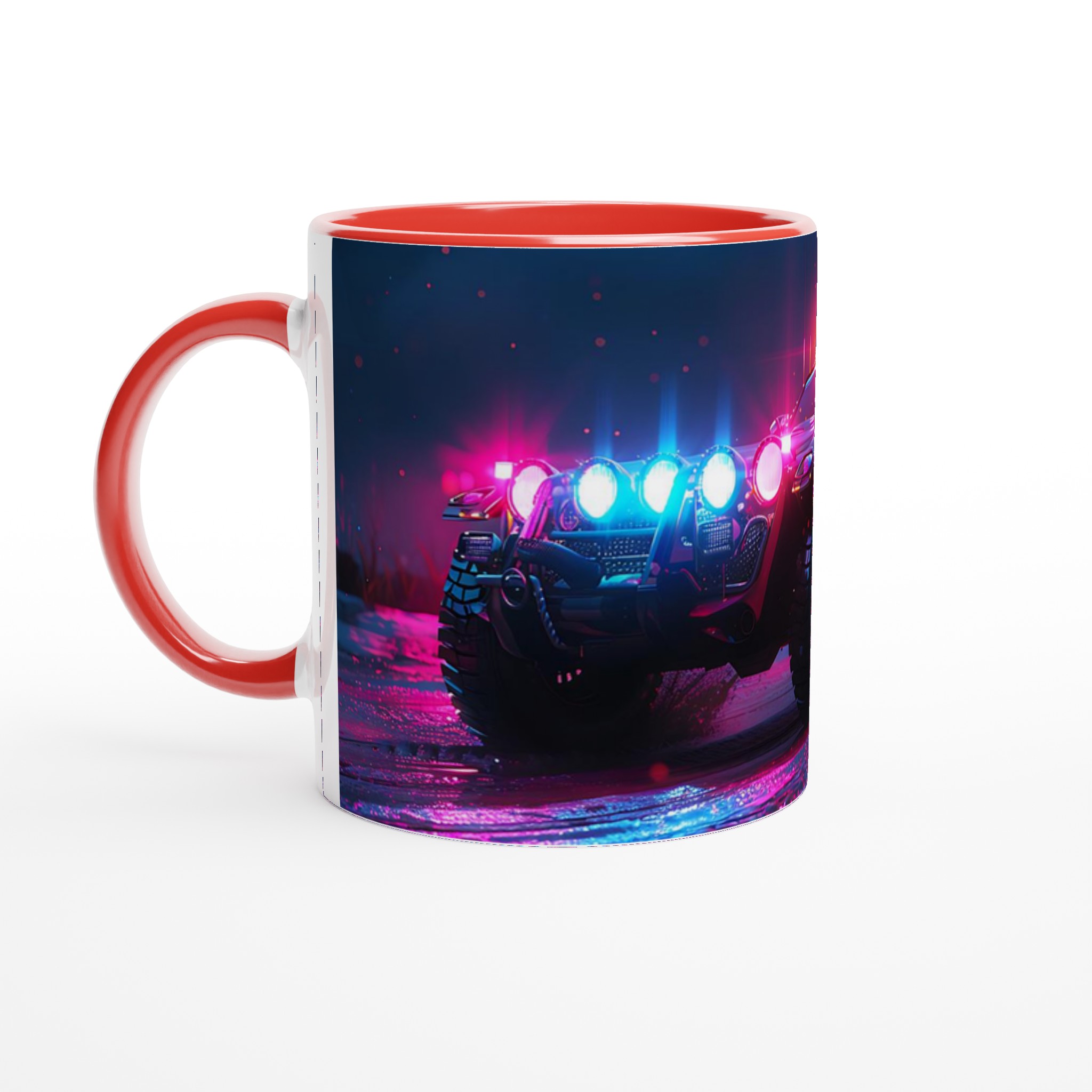 Ta med den pulserande energin från en neonupplyst nattkörning in i din vardag med denna spektakulära keramiska mugg. Den fångar den råa, cyberpunk-inspirerade estetiken av ett off-road fordon badat i djupt magenta och elektriskt blått ljus, vilket gör varje klunk till en upplevelse. Perfekt för morgonkaffet, kvällens varma choklad eller när du bara vill njuta av en kopp te. Den blanka vita ytan gör att trycken framhävs med klara och levande färger, som håller sig fina även efter många turer i mikron och diskmaskinen.