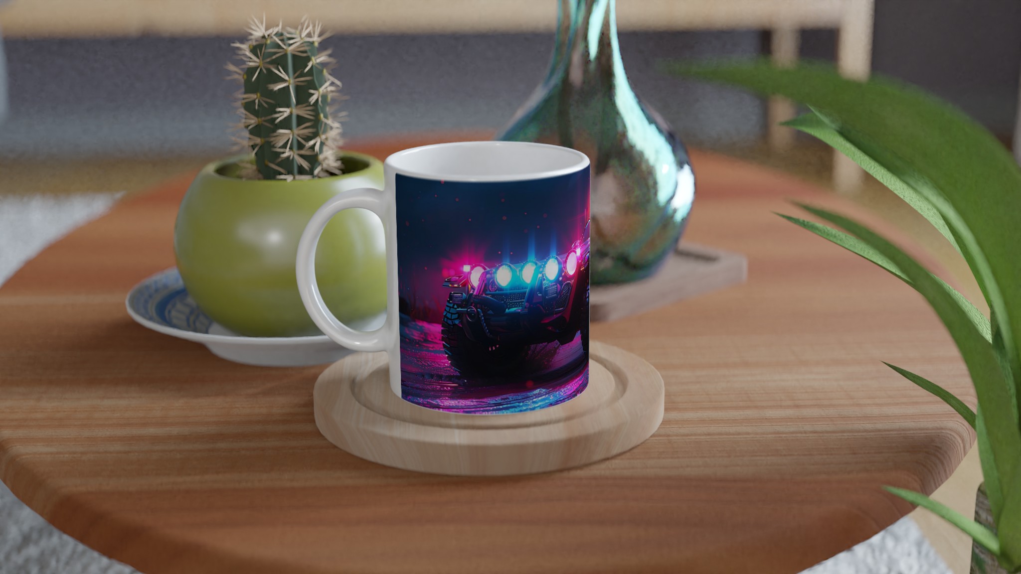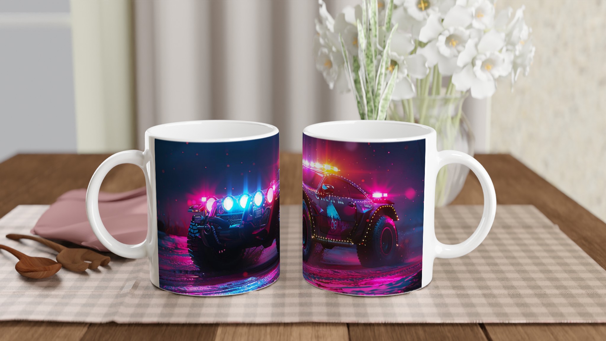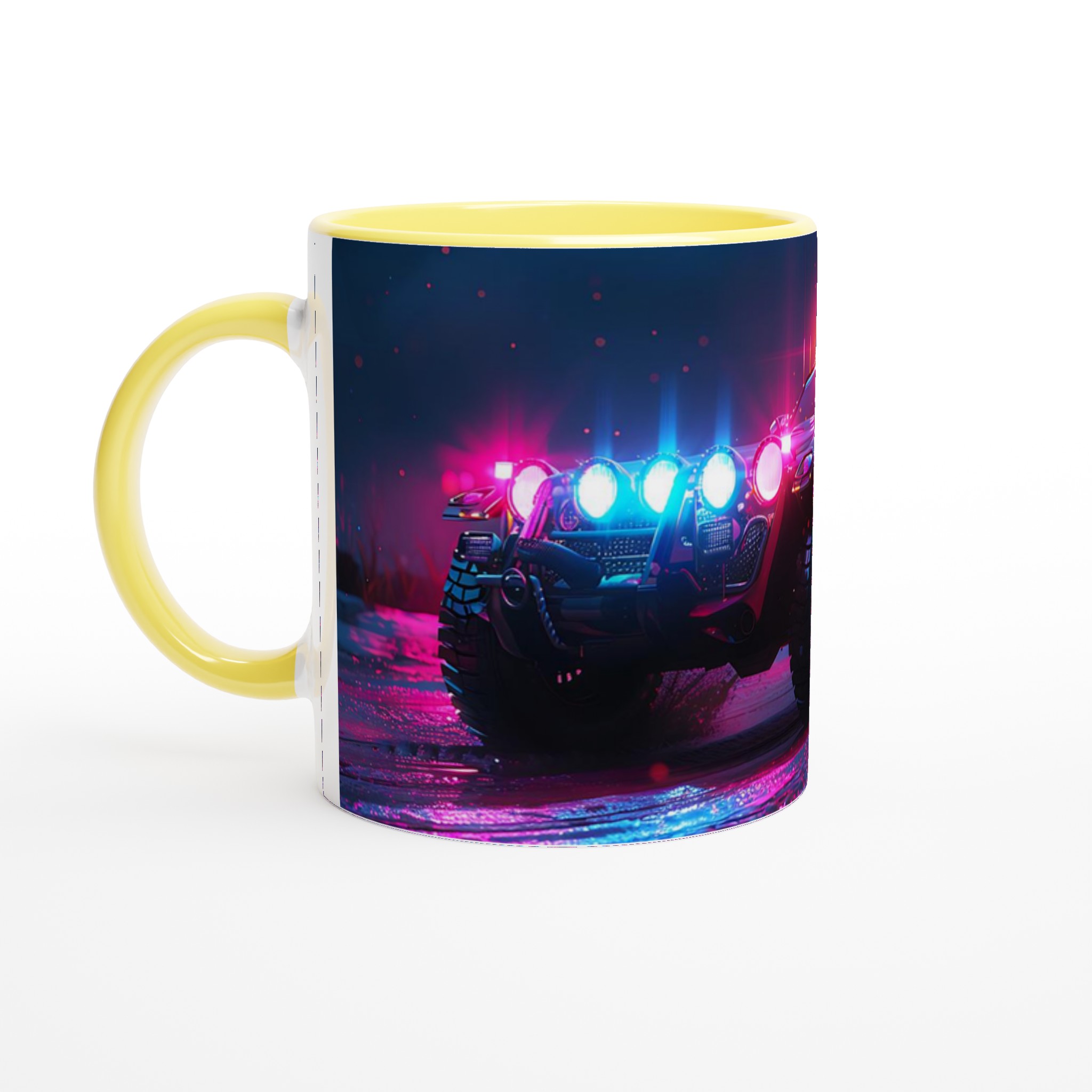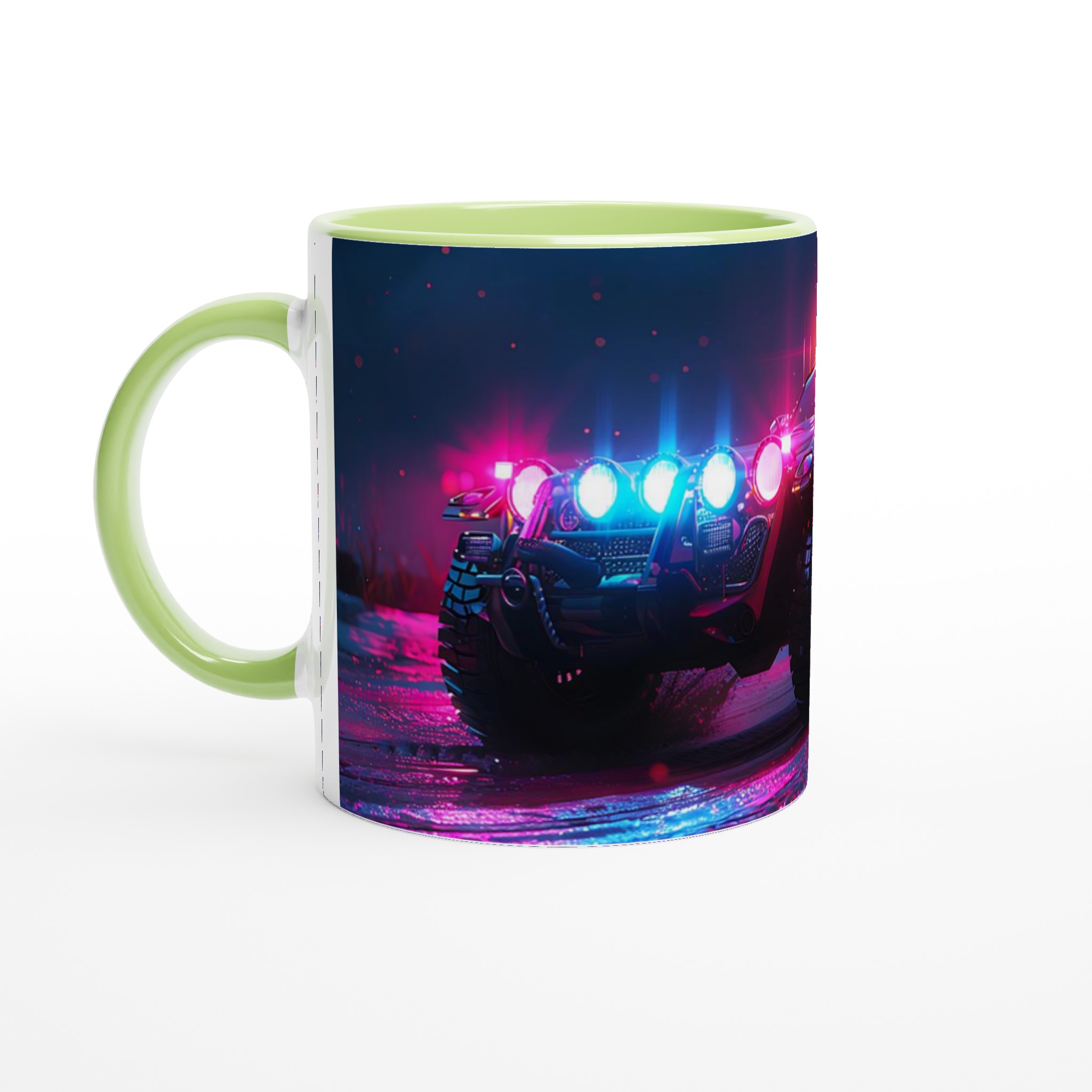 Ta med den pulserande energin från en neonupplyst nattkörning in i din vardag med denna spektakulära keramiska mugg. Den fångar den råa, cyberpunk-inspirerade estetiken av ett off-road fordon badat i djupt magenta och elektriskt blått ljus, vilket gör varje klunk till en upplevelse. Perfekt för morgonkaffet, kvällens varma choklad eller när du bara vill njuta av en kopp te. Den blanka vita ytan gör att trycken framhävs med klara och levande färger, som håller sig fina även efter många turer i mikron och diskmaskinen.