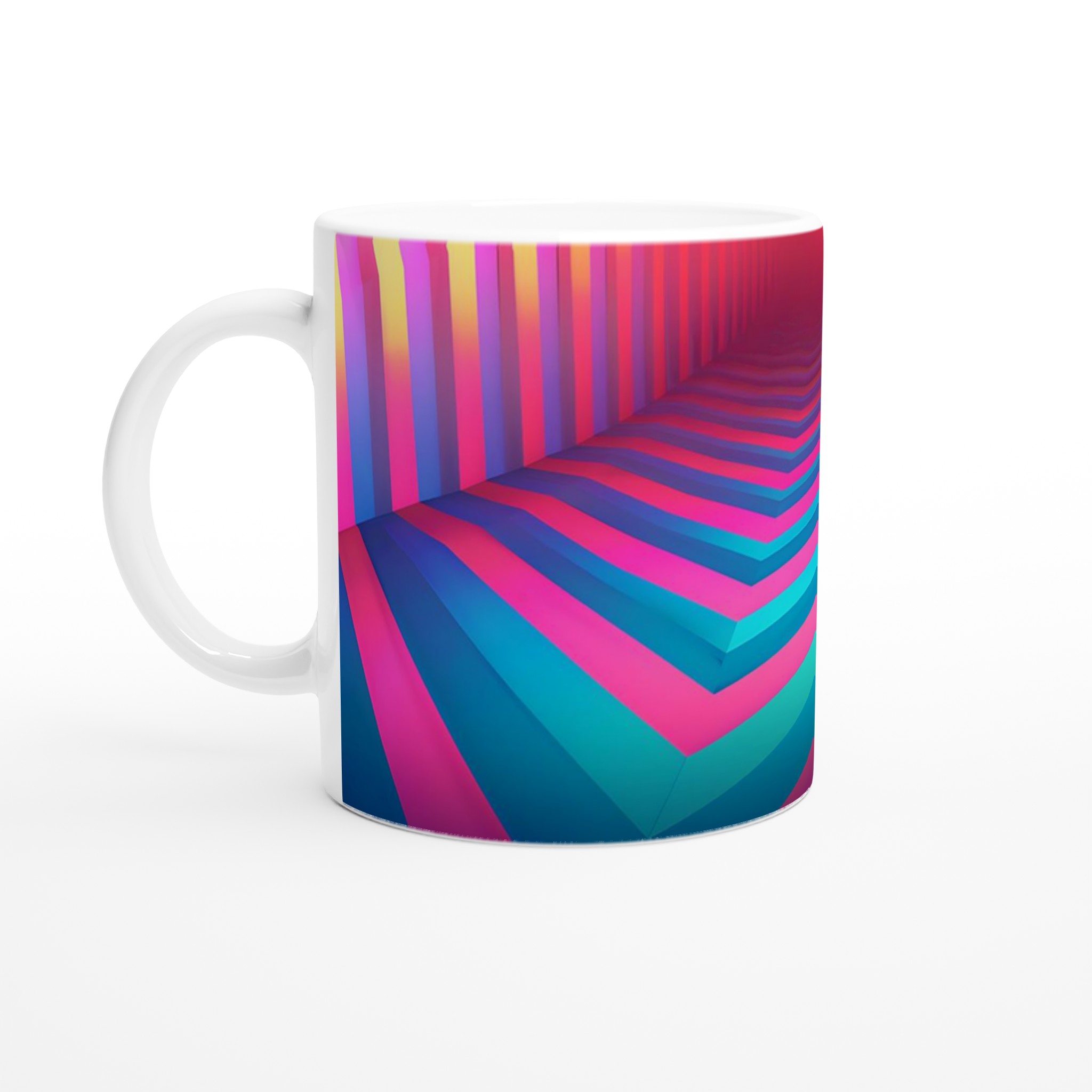 Med en hypnotiserande palett av neonrosa, turkos och djupblått, framkallar denna mugg en känsla av modern energi och dynamik. Den blanka vita ytan ger ett skarpt och levande tryck som verkligen sticker ut, oavsett om det är en personlig design, ett roligt citat eller en present till någon du tycker om.