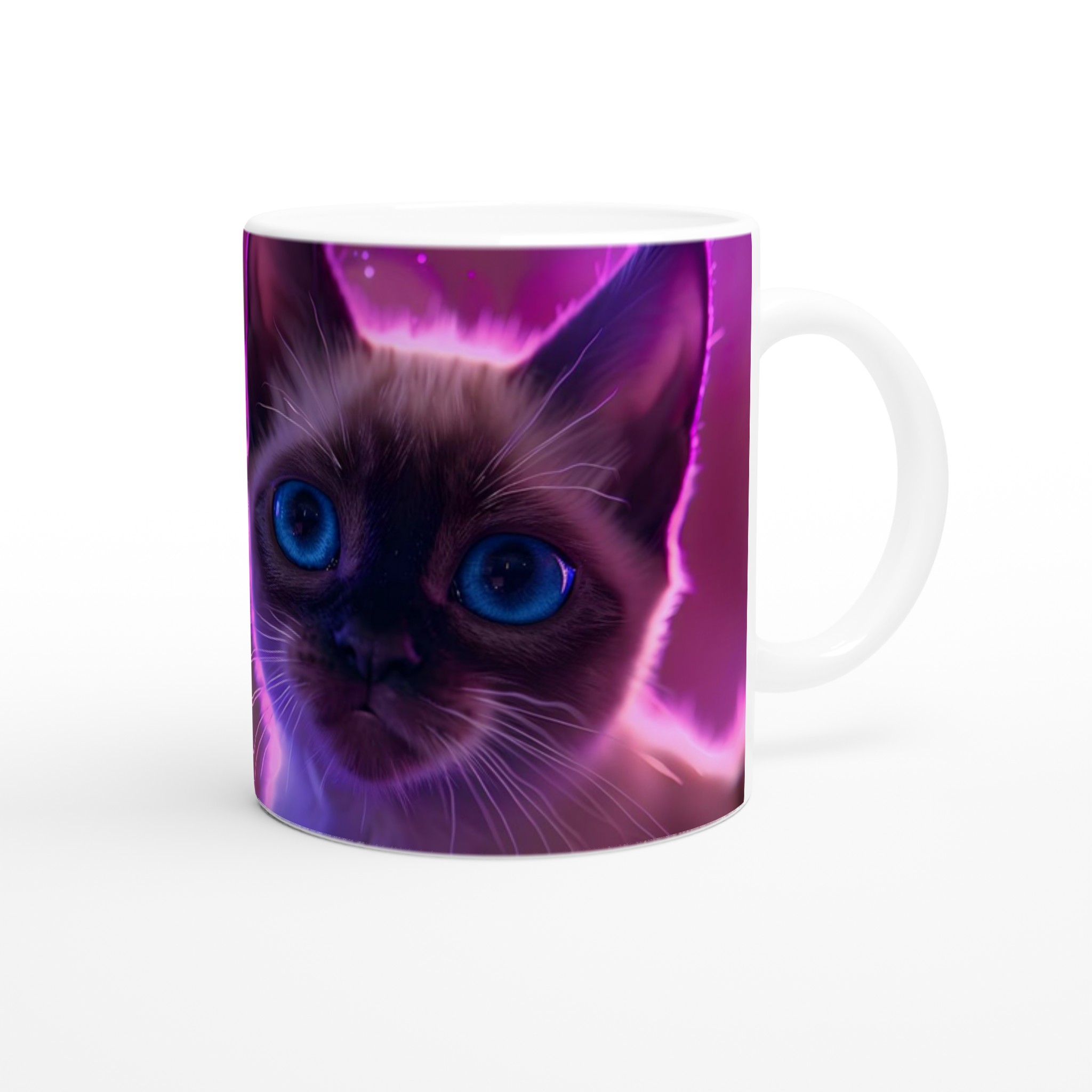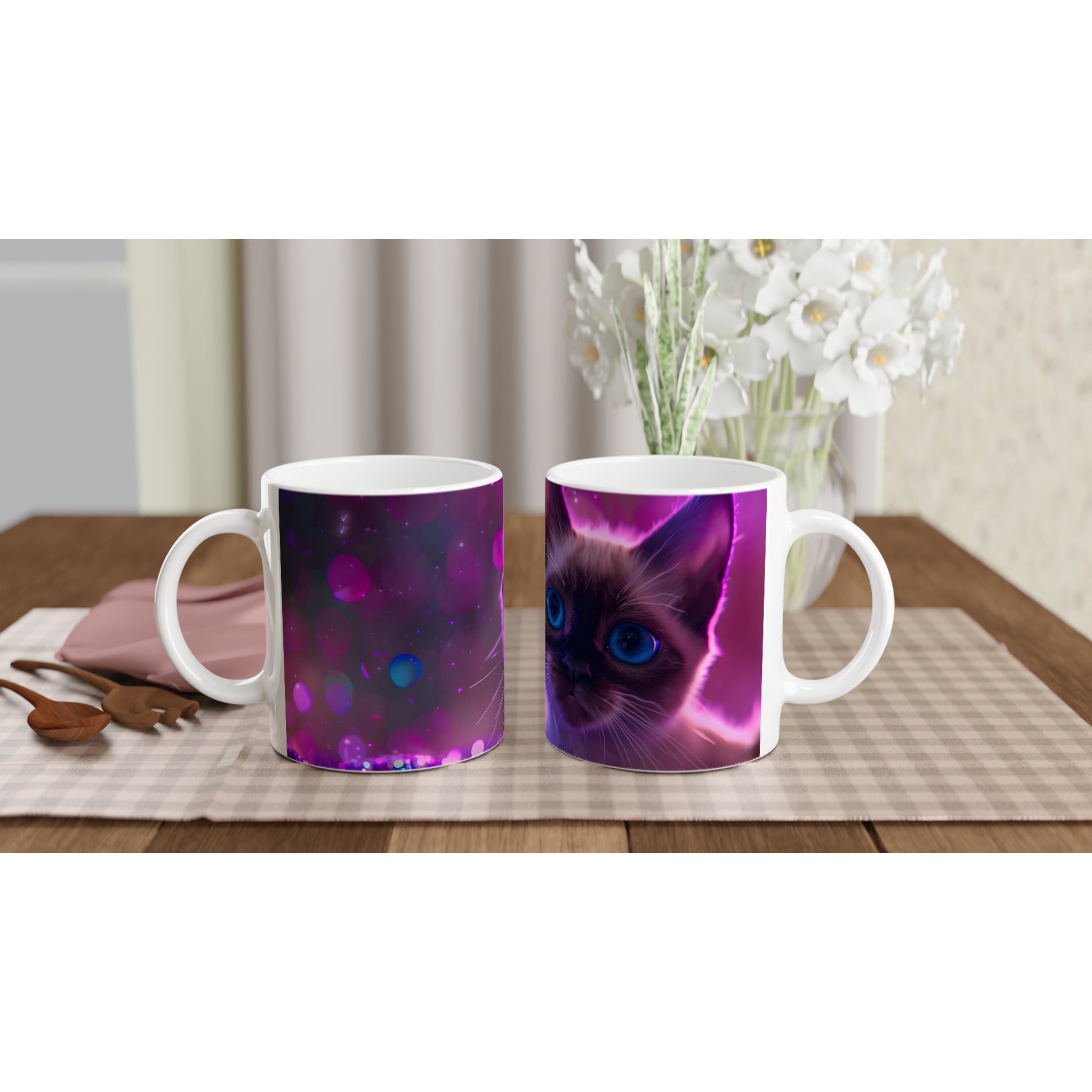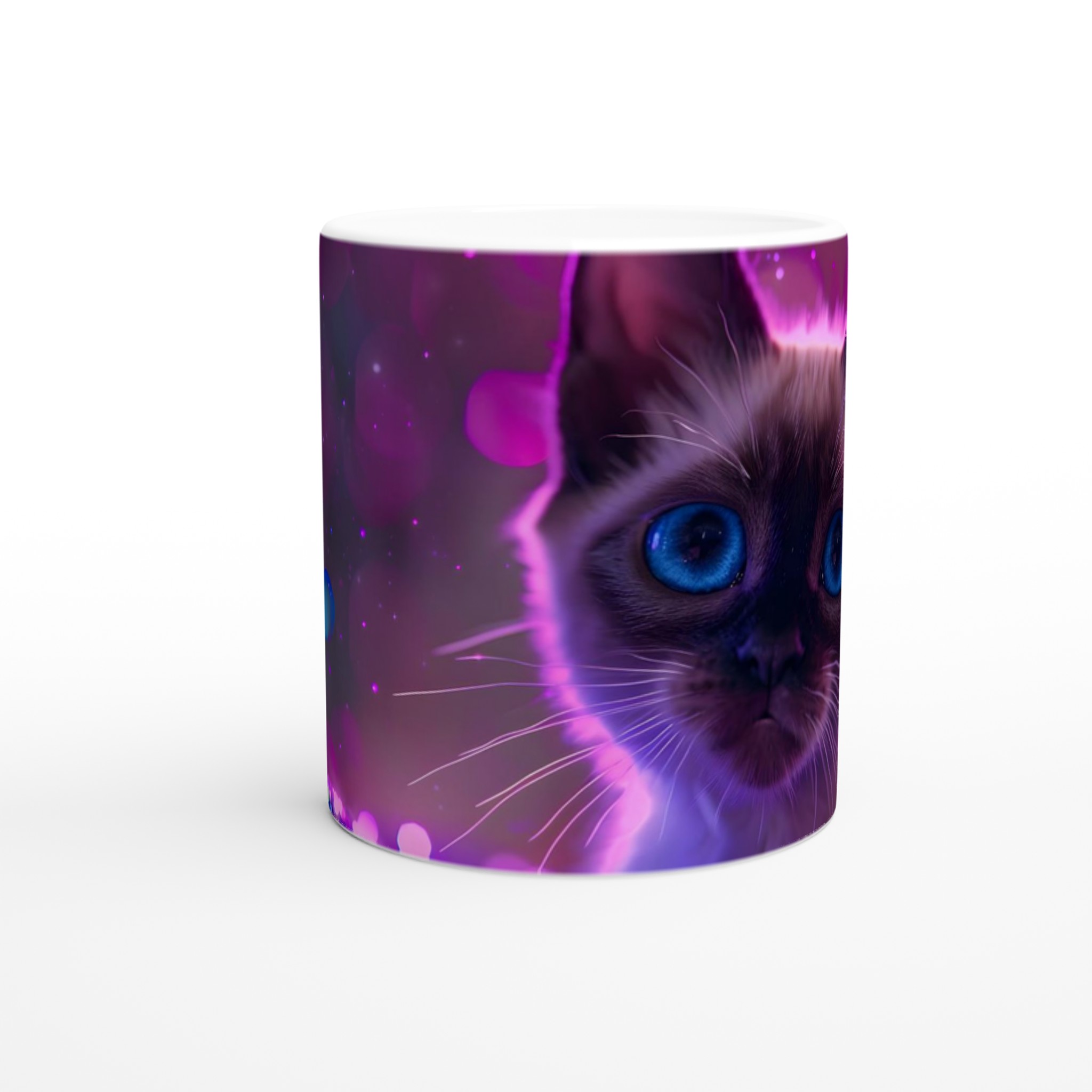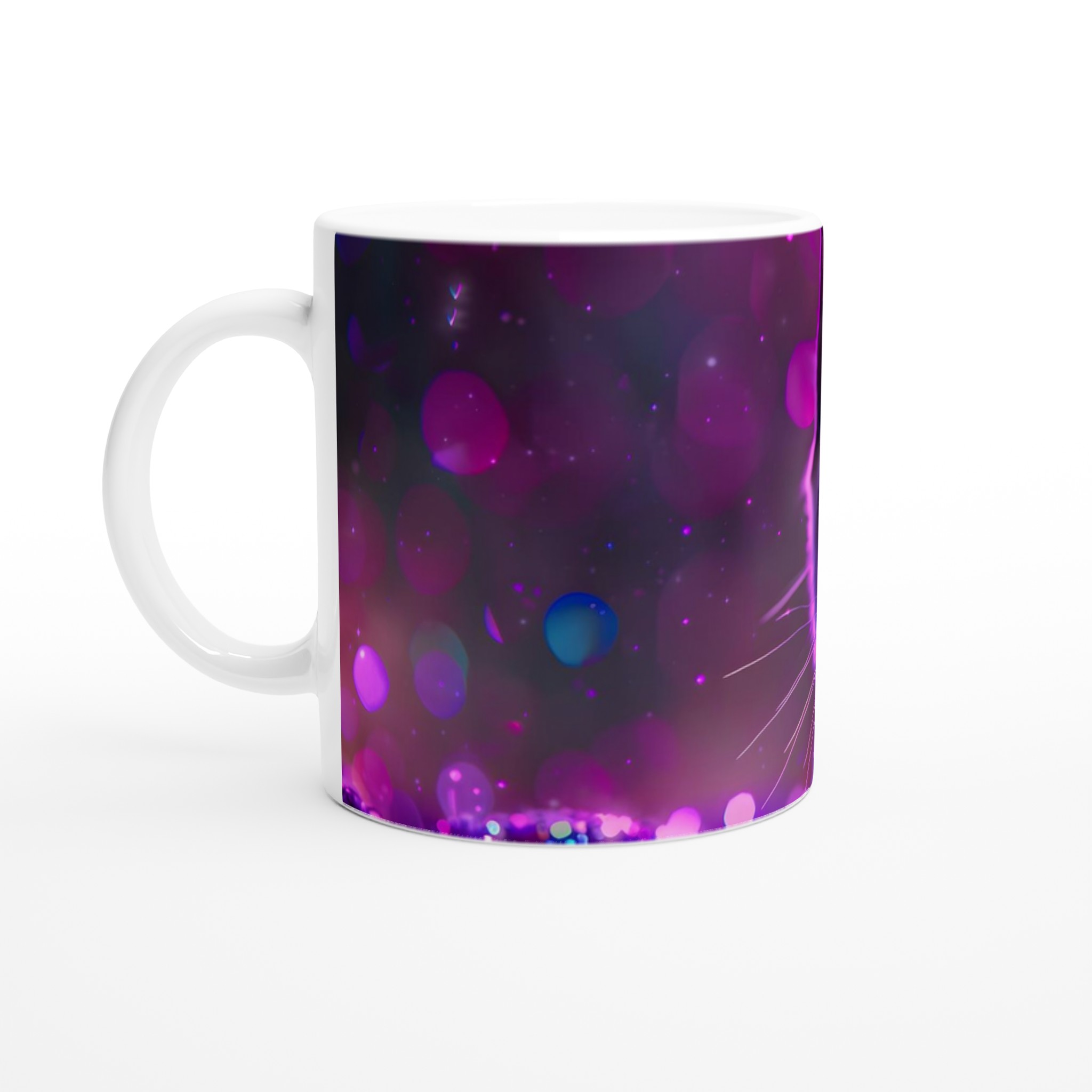 Förvandla varje fikastund till ett magiskt ögonblick med denna fängslande keramikmugg. Med en fantastisk illustration av en katt med intensivt neonblåa ögon mot en drömsk, lila bakgrund fylld med glittrande bokeh-effekter, utstrålar denna mugg en unik sci-fi-inspirerad estetik. Den är perfekt för dig som älskar katter, futuristisk konst och att omge dig med föremål som väcker fantasin.