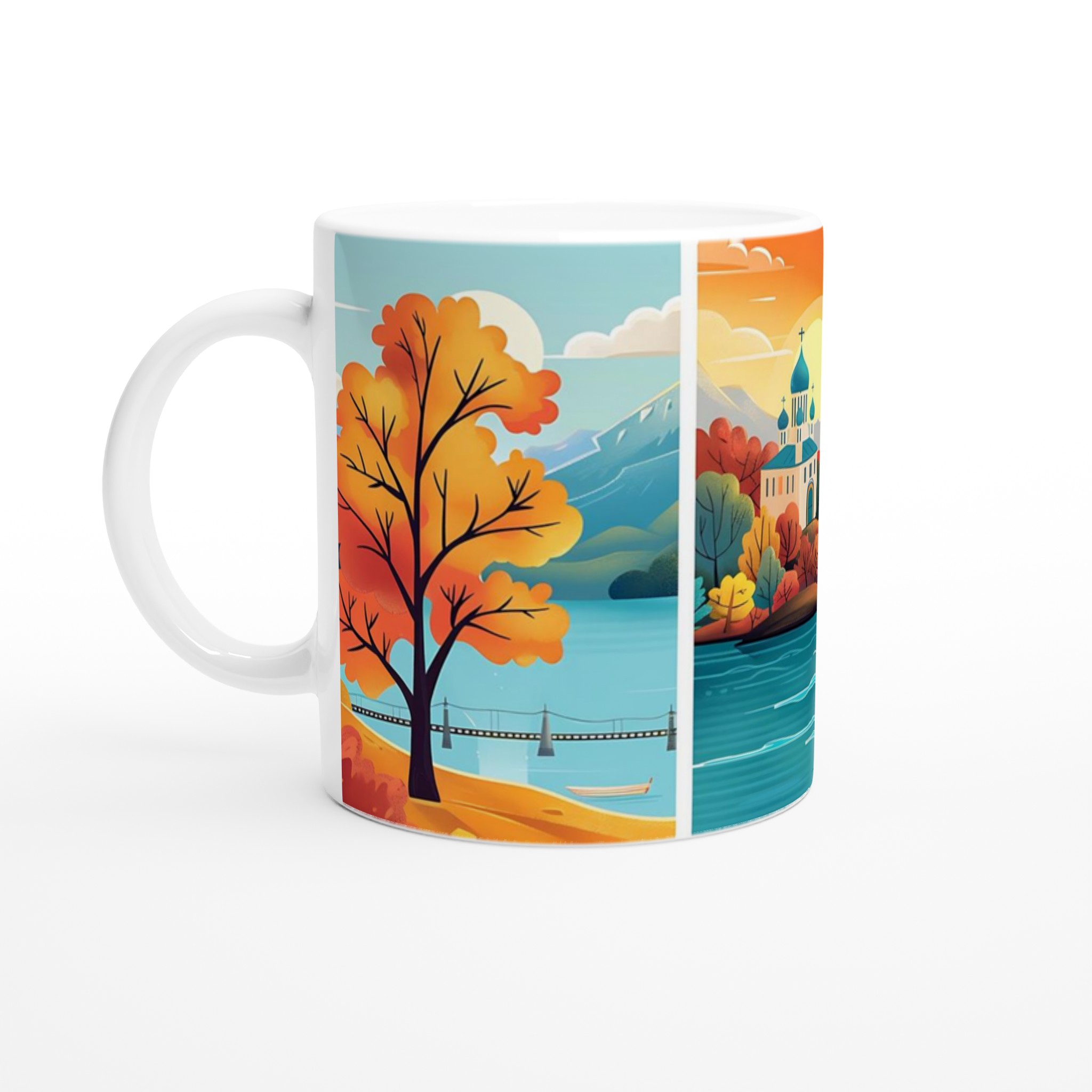 Inspirerad av de fridfulla nordiska landskapen i höstskrud, med mjuka bergsilhuetter och arkitektur som smälter in i naturen, är denna mugg mer än bara en kopp – den är en bit konst för dina dagliga ritualer. Den blanka vita ytan ger ett skarpt och levande tryck som verkligen sticker ut, oavsett om det är en personlig design, ett roligt citat eller en present till någon du tycker om.