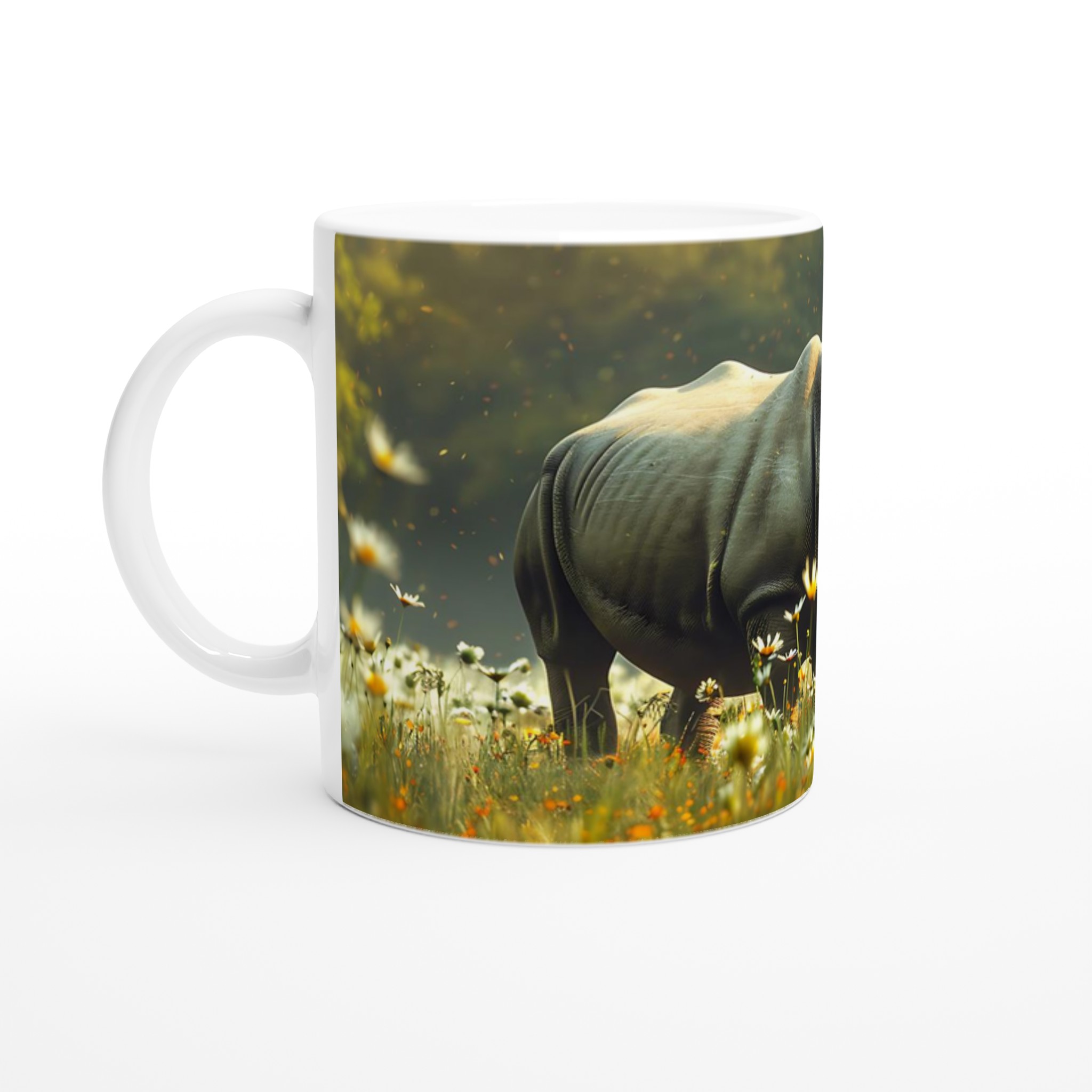Inspirerad av den majestätiska noshörningen i en drömlik blomsteräng, fångar denna mugg en känsla av lugn och vild skönhet. Den blanka vita ytan ger ett skarpt och levande tryck som verkligen sticker ut, oavsett om det är en personlig design, ett roligt citat eller en present till någon du tycker om.
