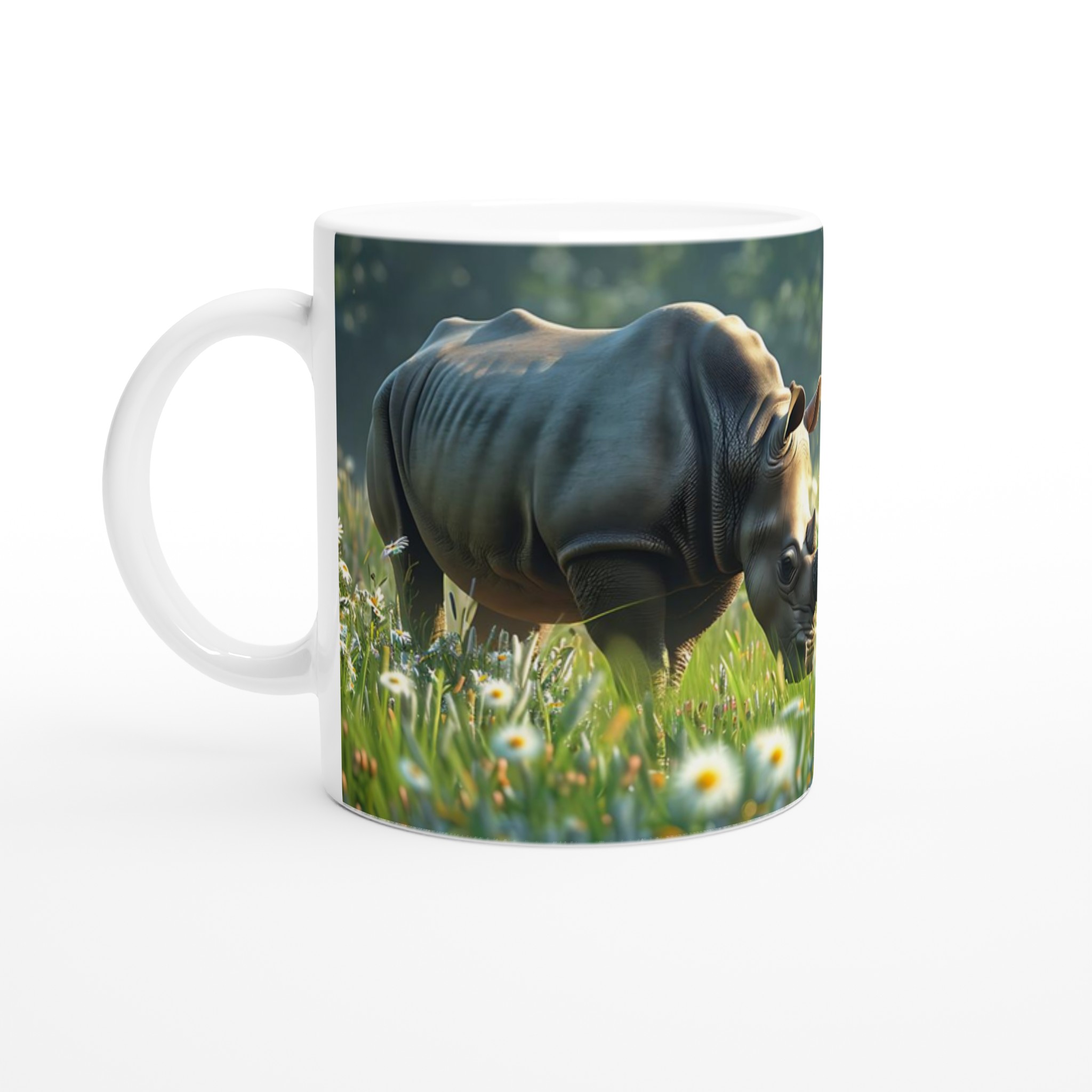 Vår 11 oz keramiska mugg förvandlar varje sipp till en stund av frid med sitt motiv av en majestätisk noshörning i en solbelyst blomsteräng. De mjuka gröna tonerna och de sprudlande vita blommorna skapar en känsla av lugn och natur, perfekt för att starta dagen med en känsla av äventyr och ro. Denna mugg är inte bara en dryckesbehållare, utan ett konstverk som för med sig naturens skönhet direkt till ditt bord.