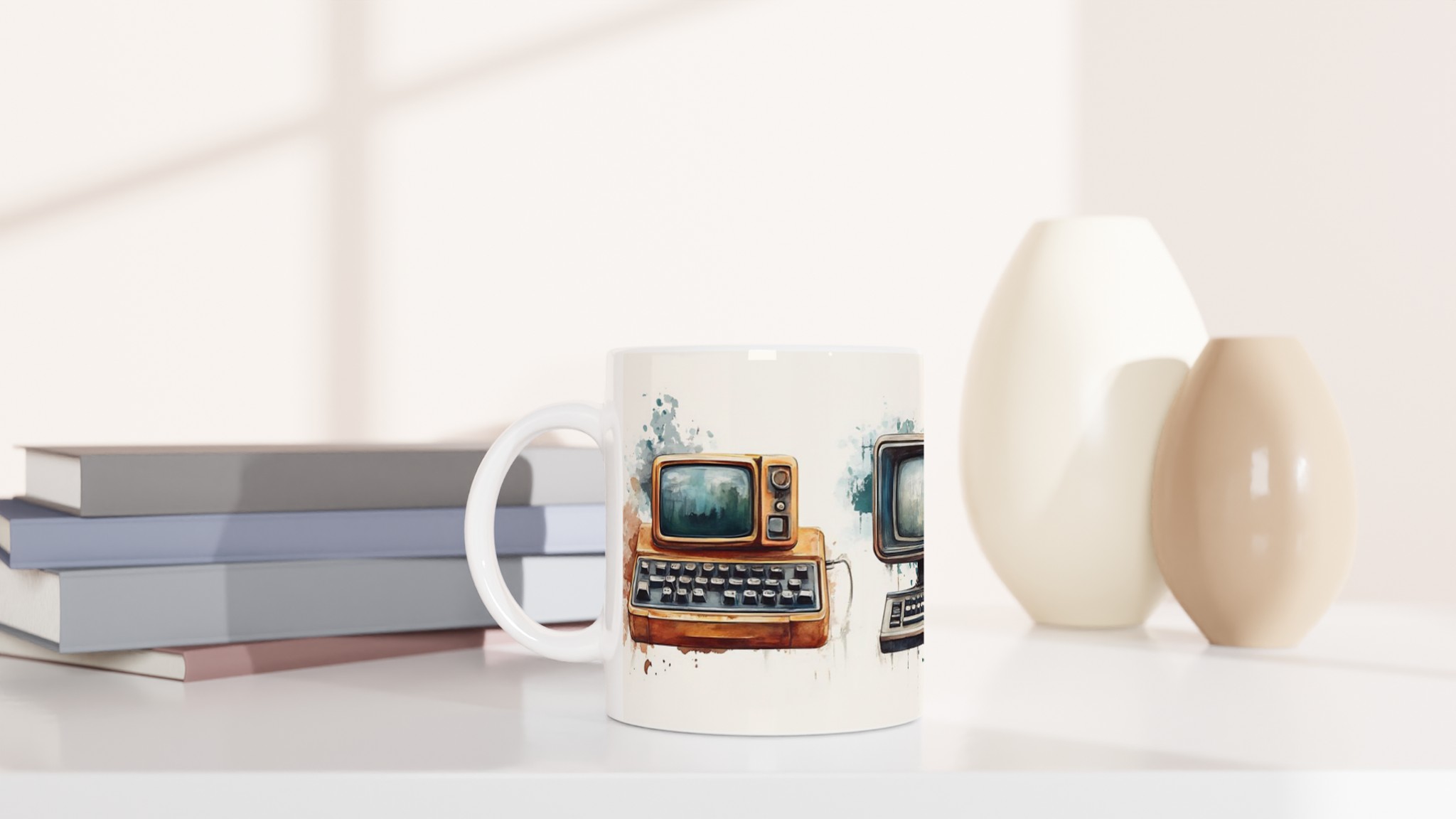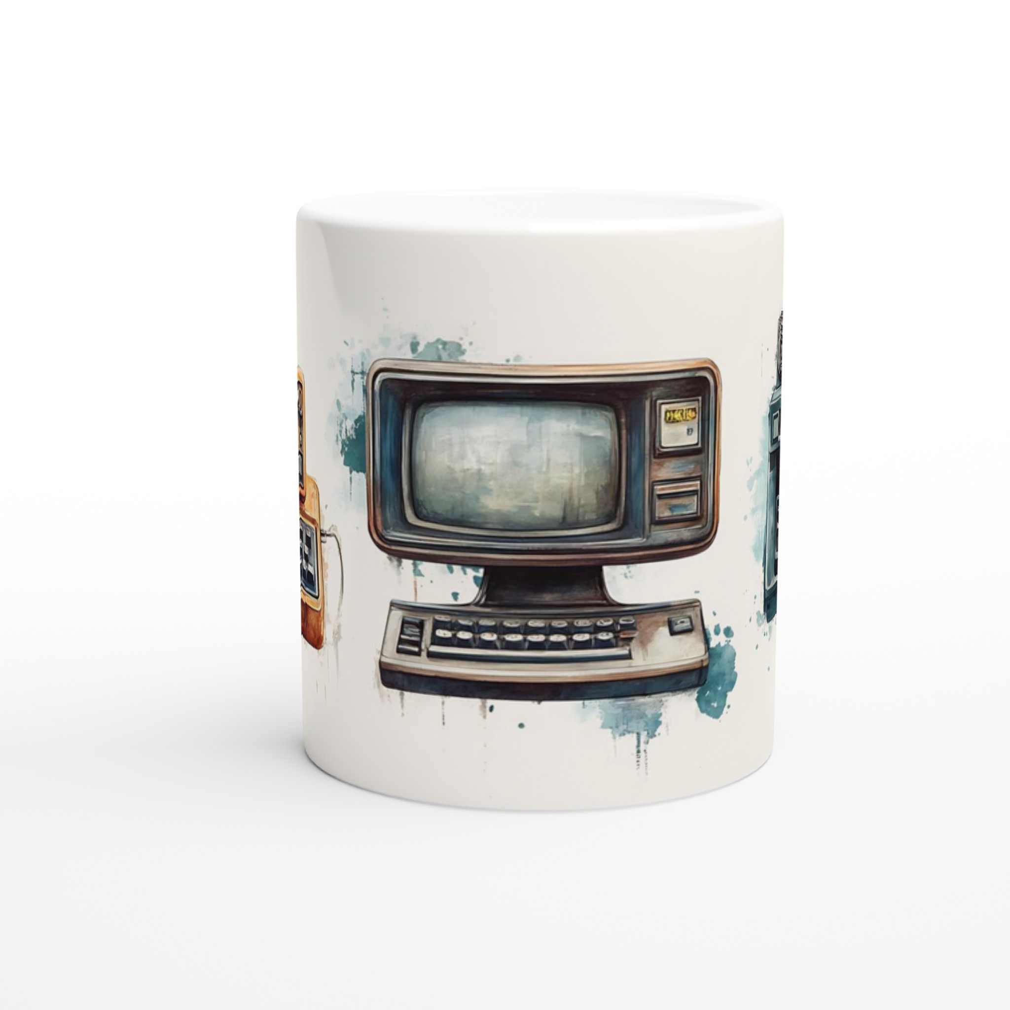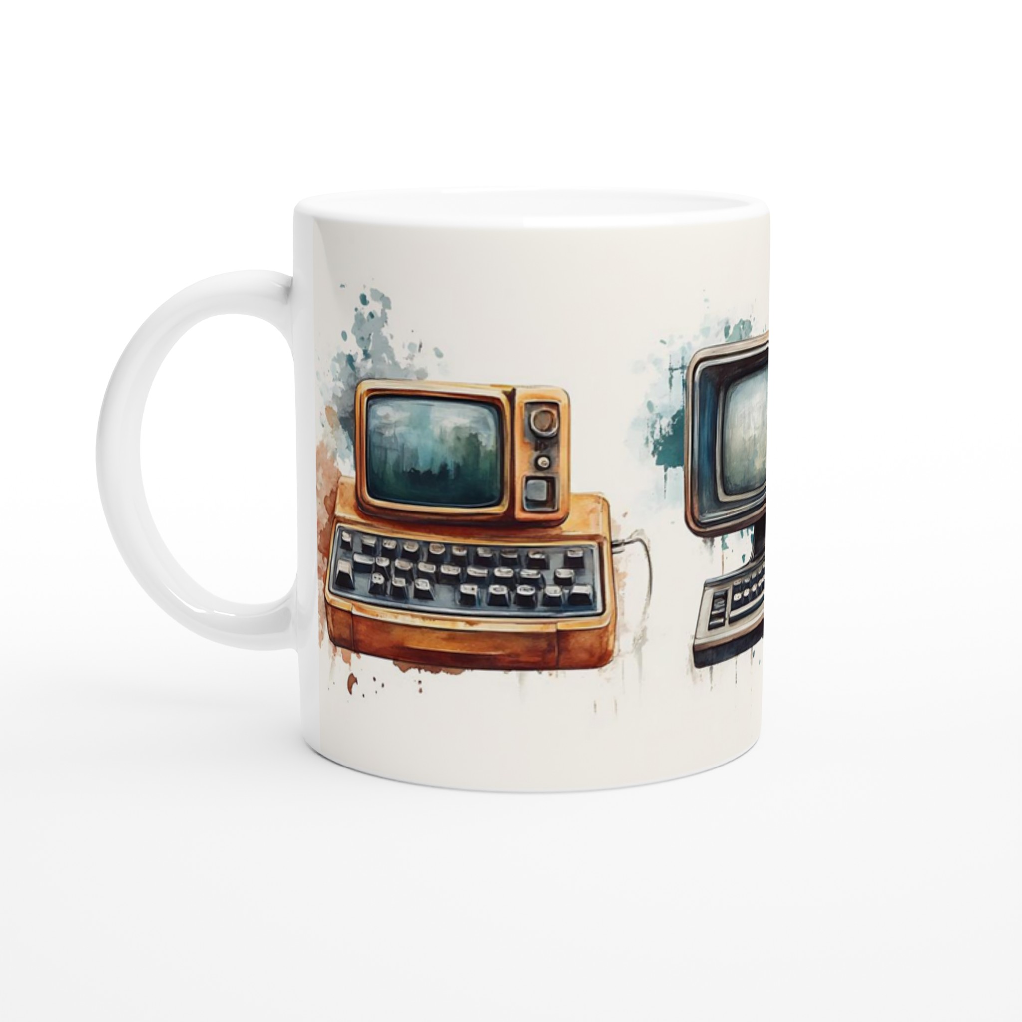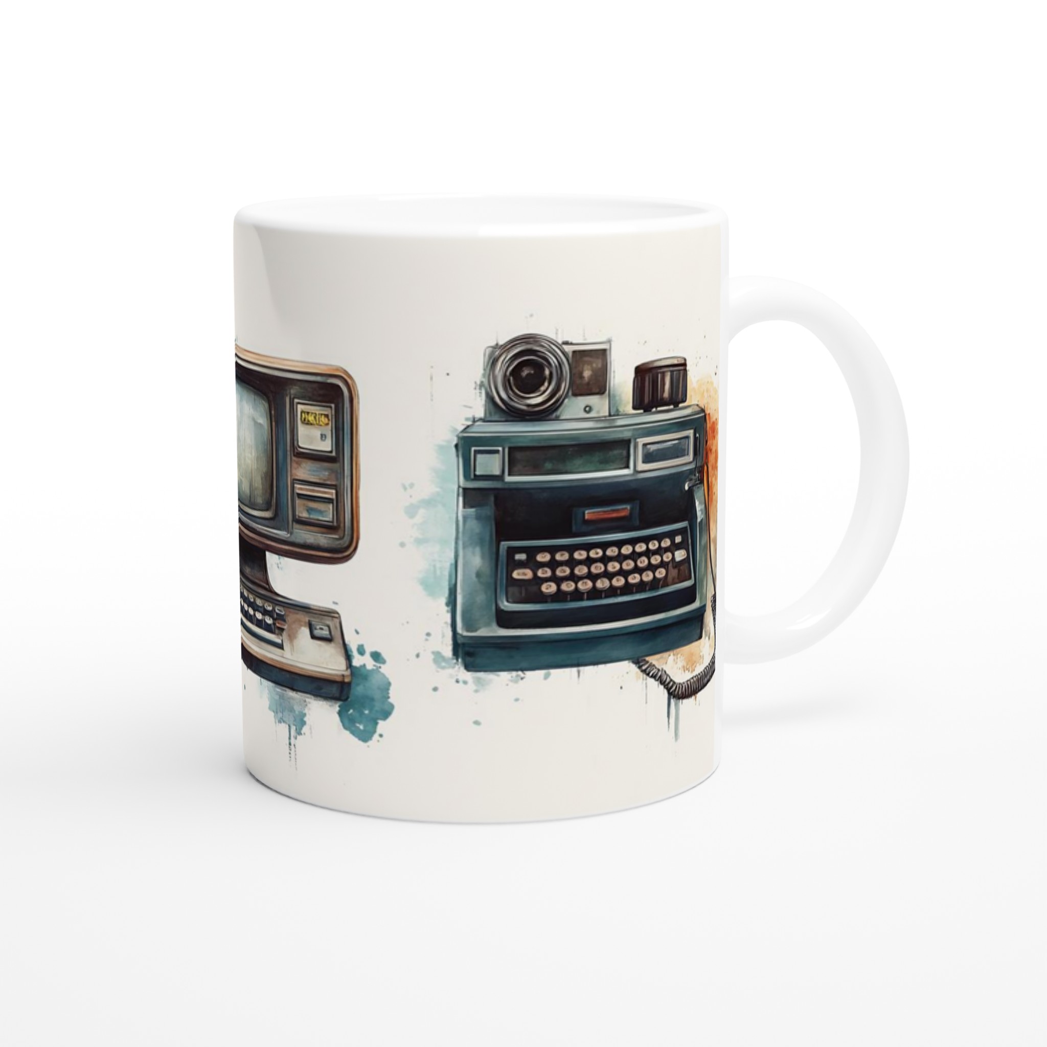 Väck minnen till liv med denna unikt designade keramiska mugg, prydd med charmiga akvarellillustrationer av retro-teknik. Varje mugg fångar den varma, nostalgiska känslan av gamla datorer och skrivmaskiner, presenterade med en konstnärlig touch som smälter in perfekt i både moderna och klassiska hem.