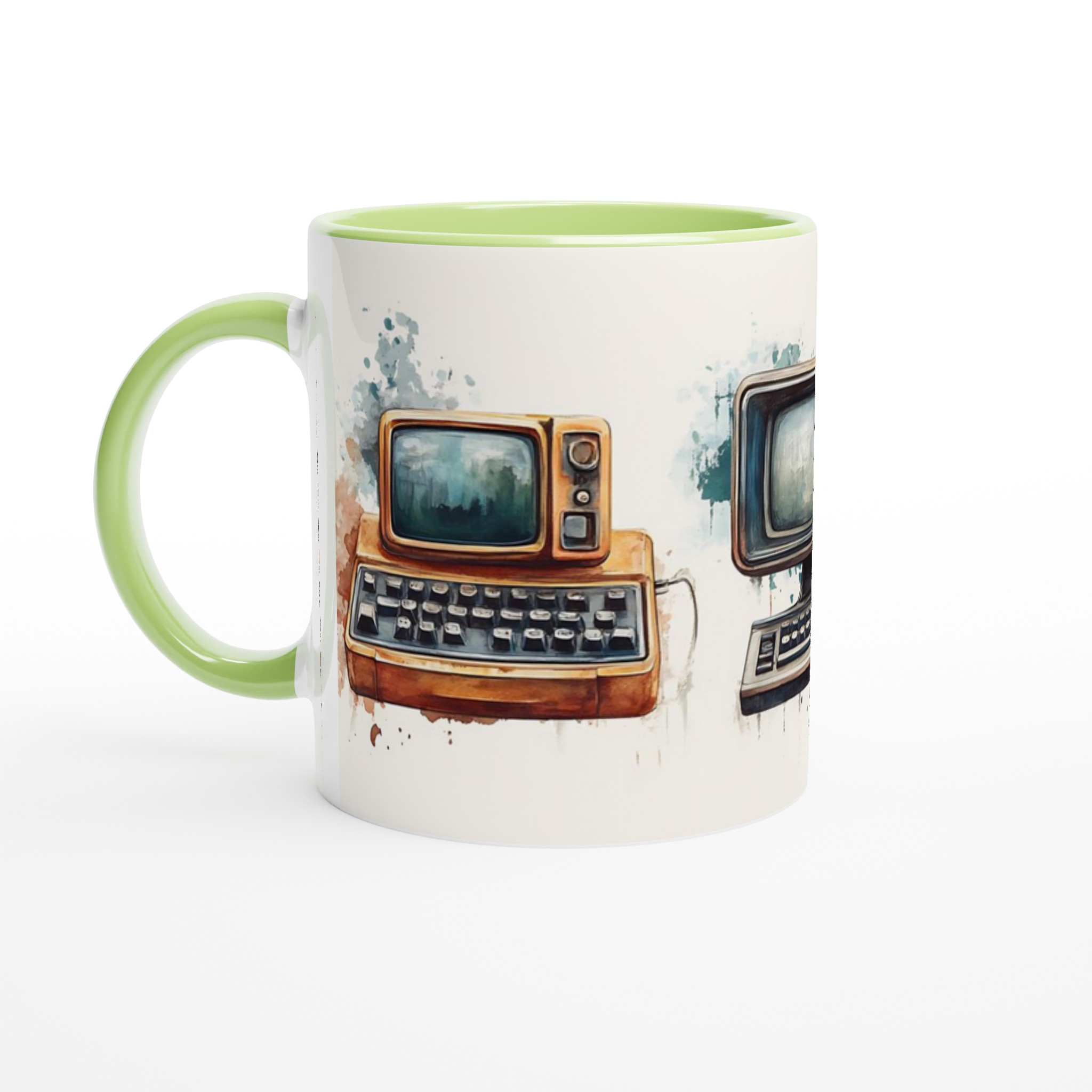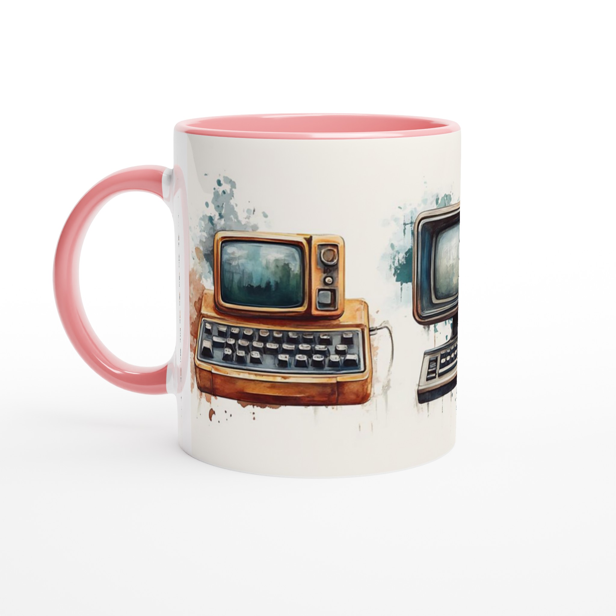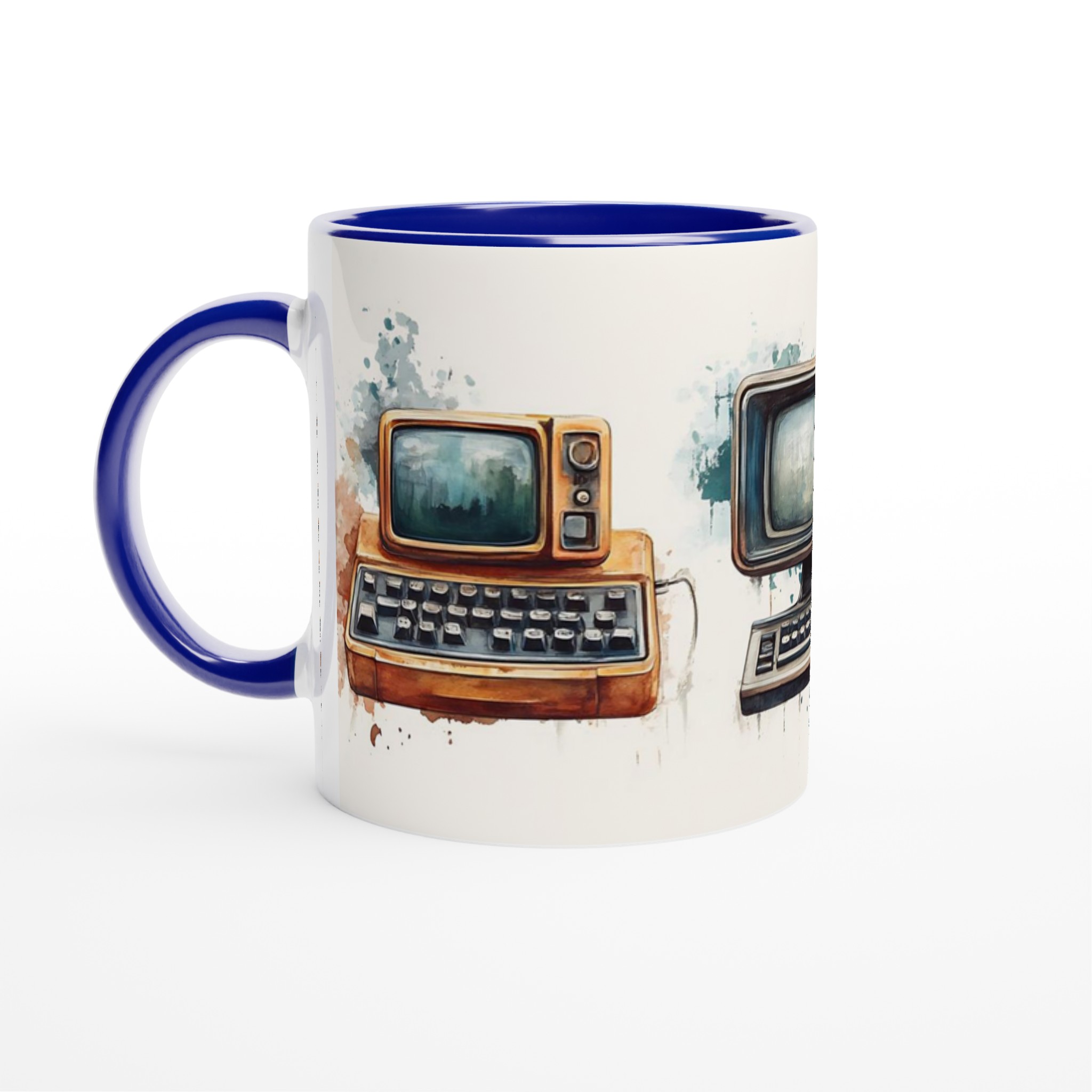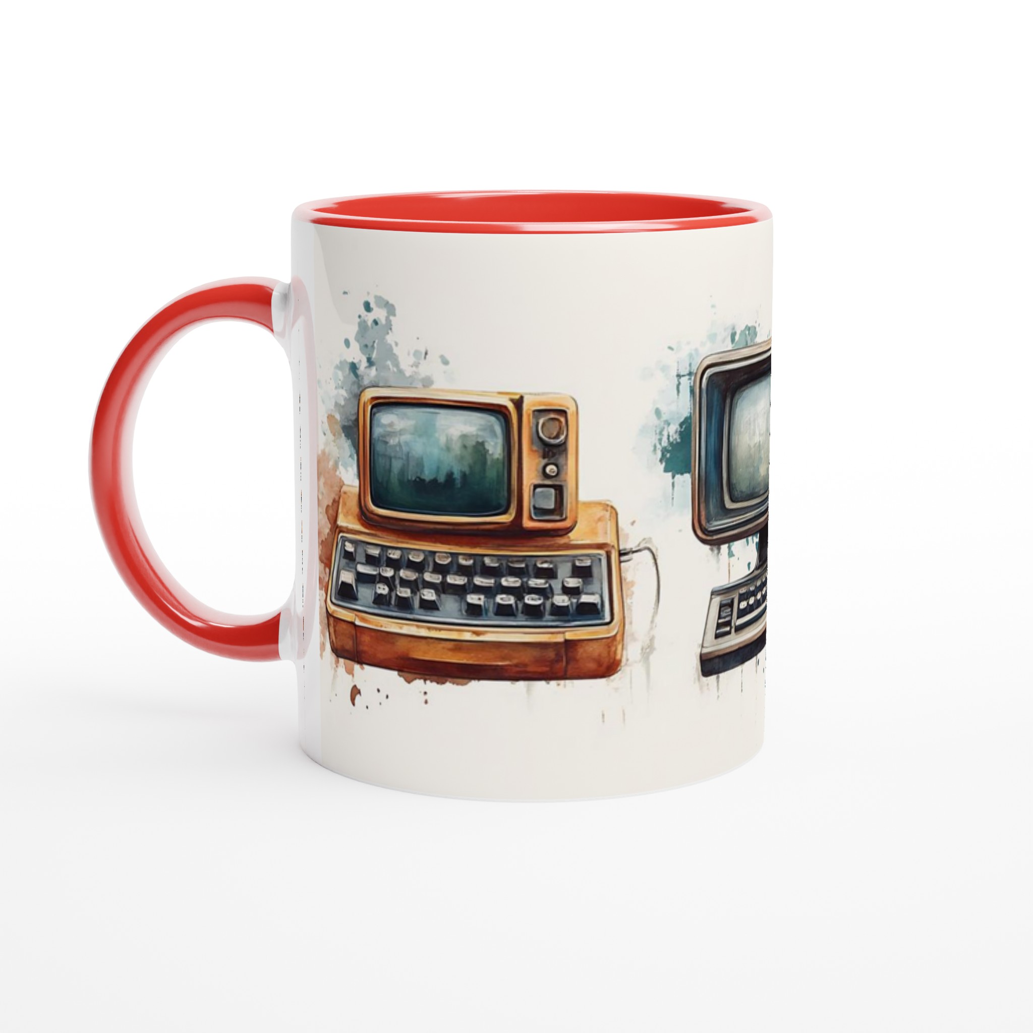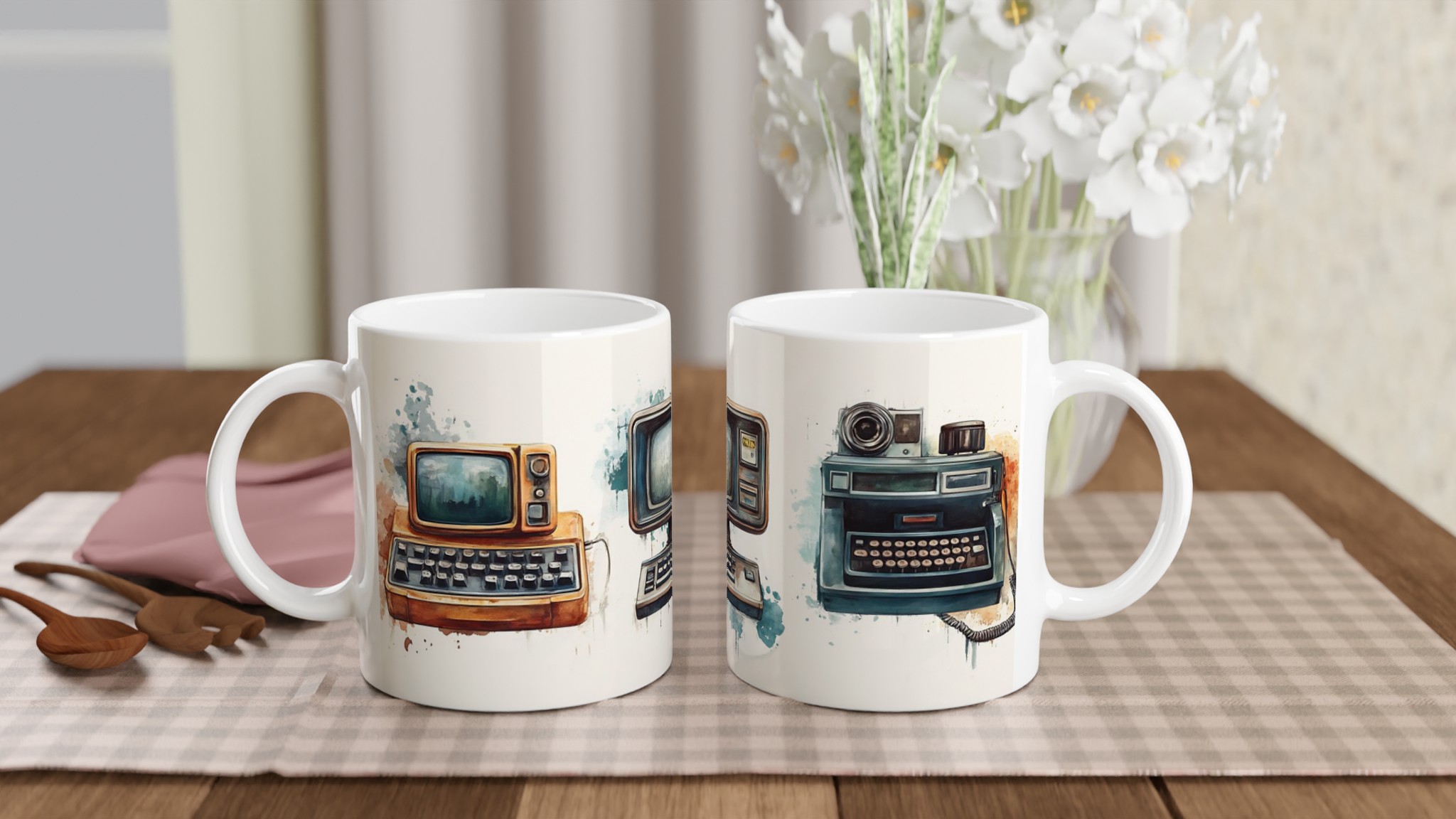 Väck minnen till liv med denna unikt designade keramiska mugg, prydd med charmiga akvarellillustrationer av retro-teknik. Varje mugg fångar den varma, nostalgiska känslan av gamla datorer och skrivmaskiner, presenterade med en konstnärlig touch som smälter in perfekt i både moderna och klassiska hem.