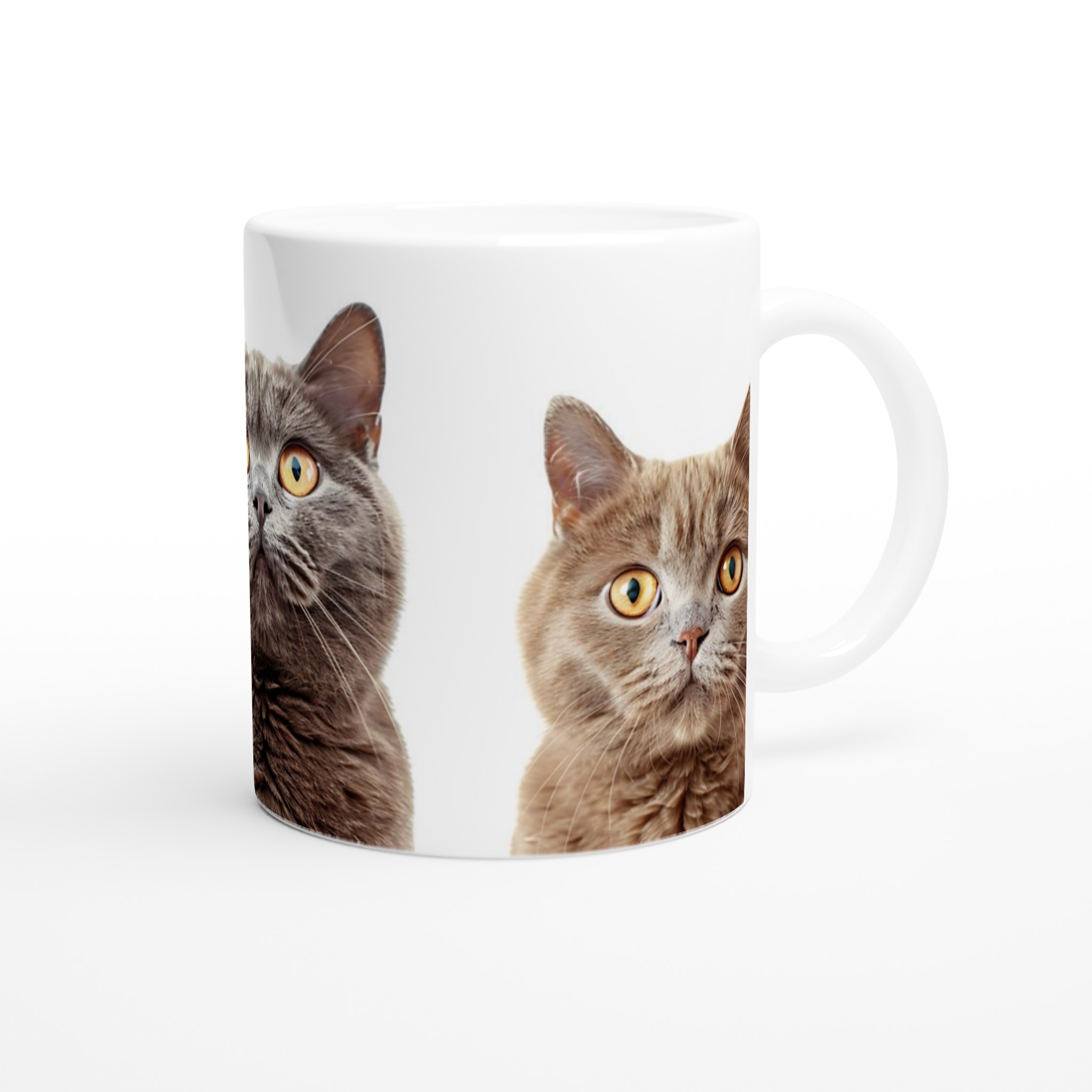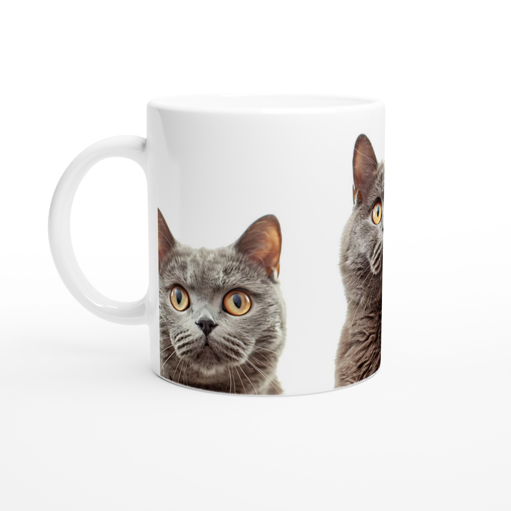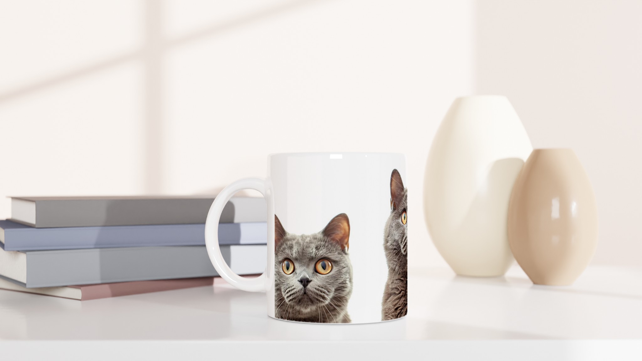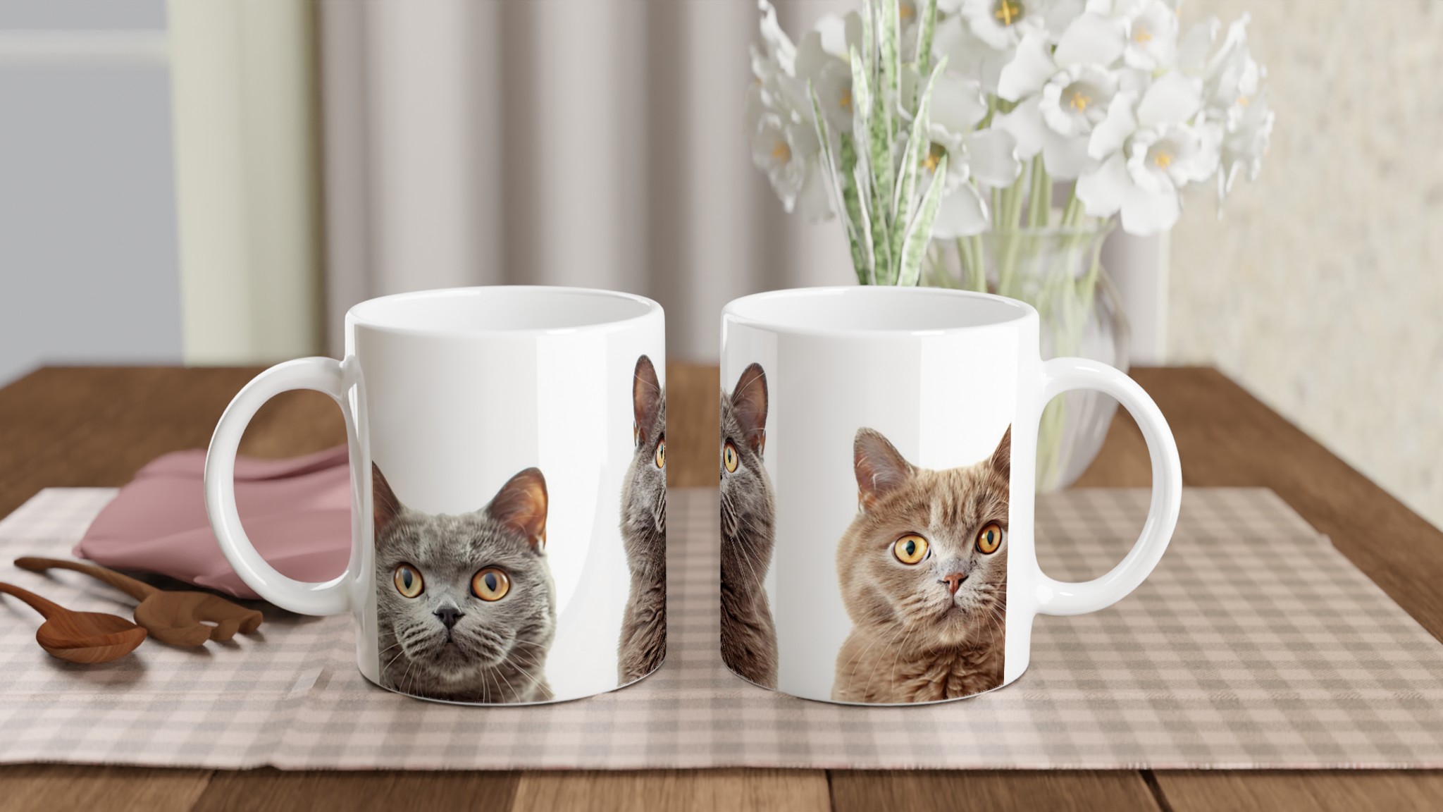 Fånga blickarna med denna charmiga keramiska mugg, prydd med tre par nyfikna kattögon som lovar att väcka glädje vid varje klunk. Denna mugg blir snabbt en vardagsfavorit, perfekt för morgonkaffet, kvällens varma choklad eller när du bara vill njuta av en kopp te. Den blanka vita ytan framhäver tryckets klara och levande färger, som håller sig fina även efter många turer i mikron och diskmaskinen, vilket gör varje ögonblick till en liten stund av glädje.