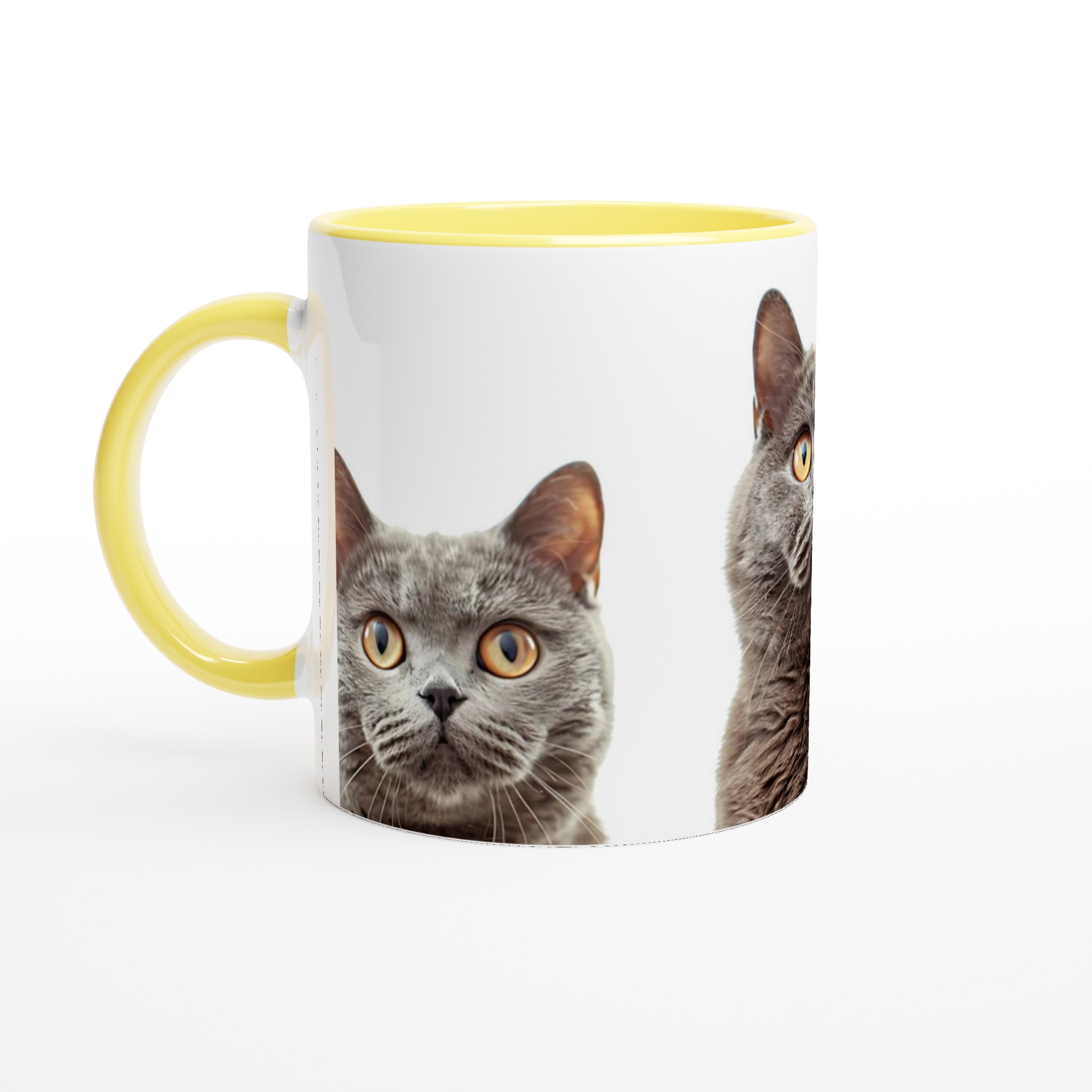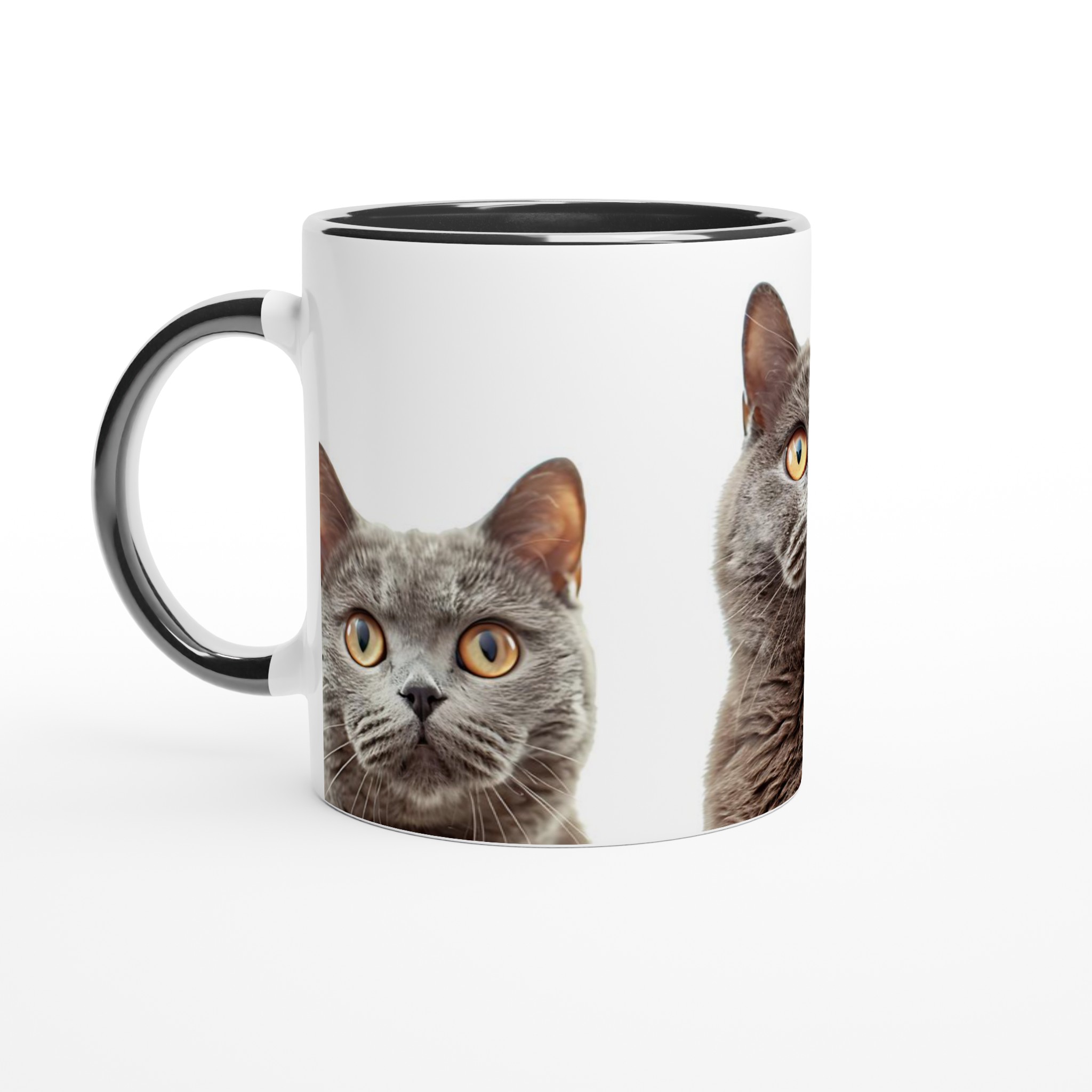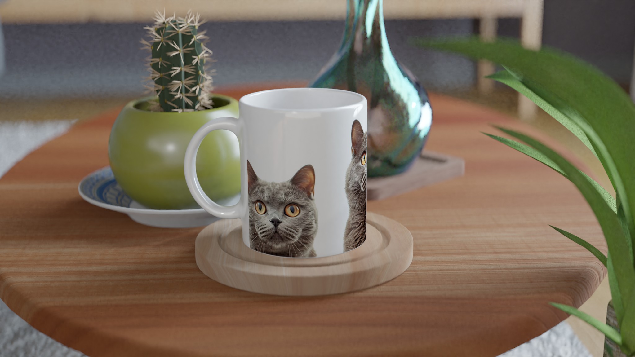 Fånga blickarna med denna charmiga keramiska mugg, prydd med tre par nyfikna kattögon som lovar att väcka glädje vid varje klunk. Denna mugg blir snabbt en vardagsfavorit, perfekt för morgonkaffet, kvällens varma choklad eller när du bara vill njuta av en kopp te. Den blanka vita ytan framhäver tryckets klara och levande färger, som håller sig fina även efter många turer i mikron och diskmaskinen, vilket gör varje ögonblick till en liten stund av glädje.