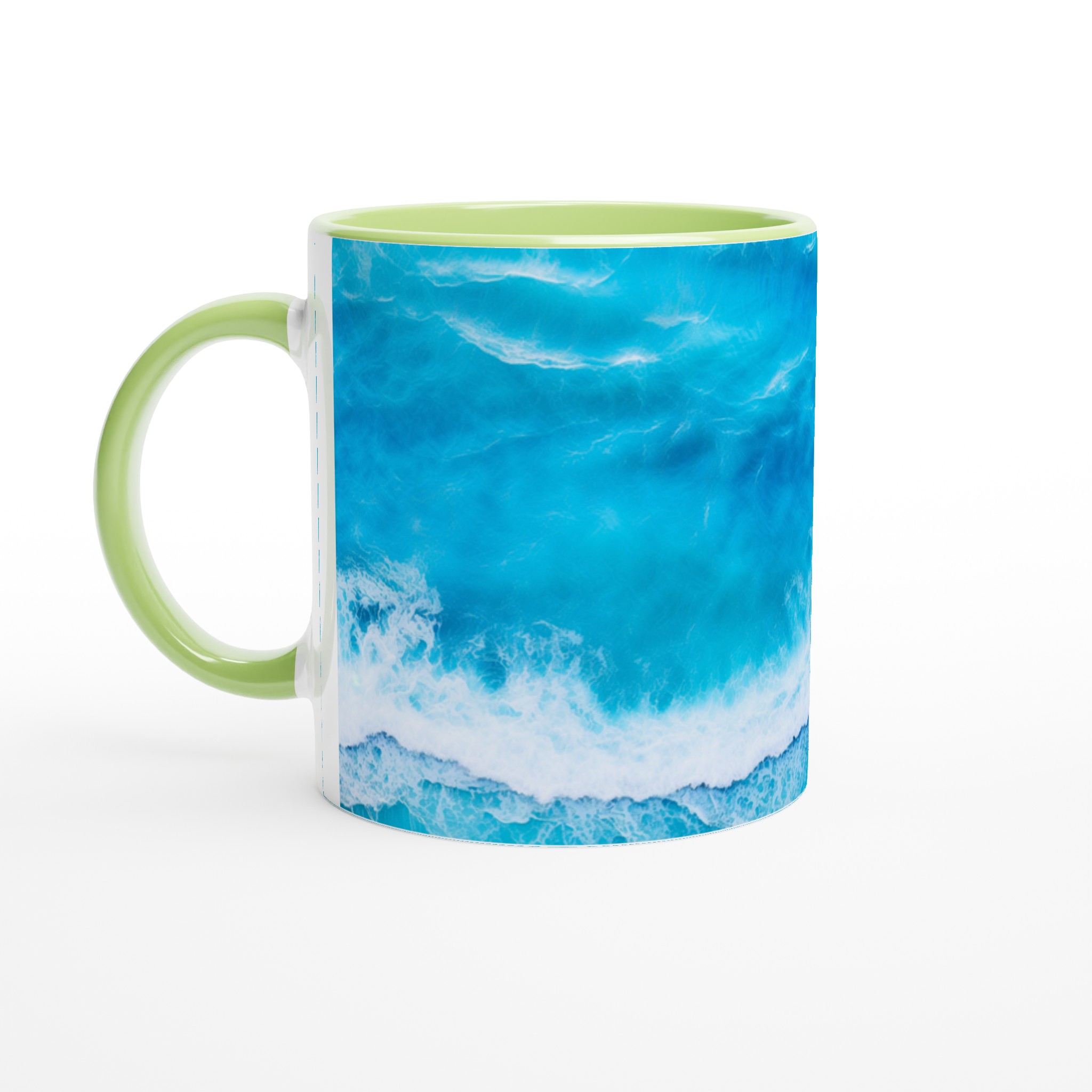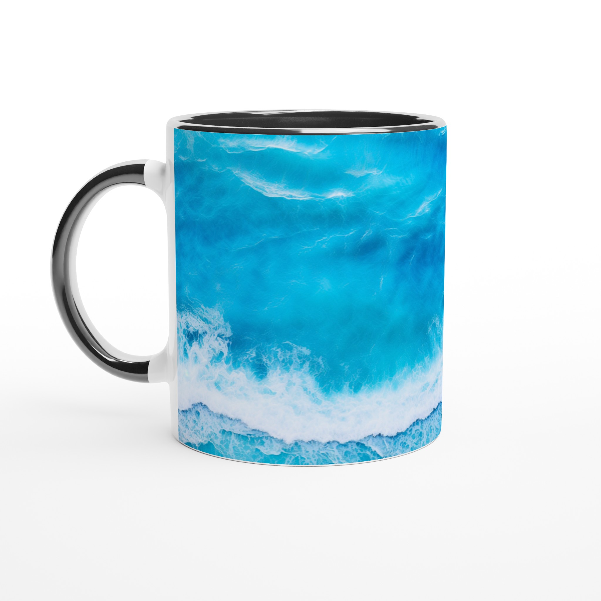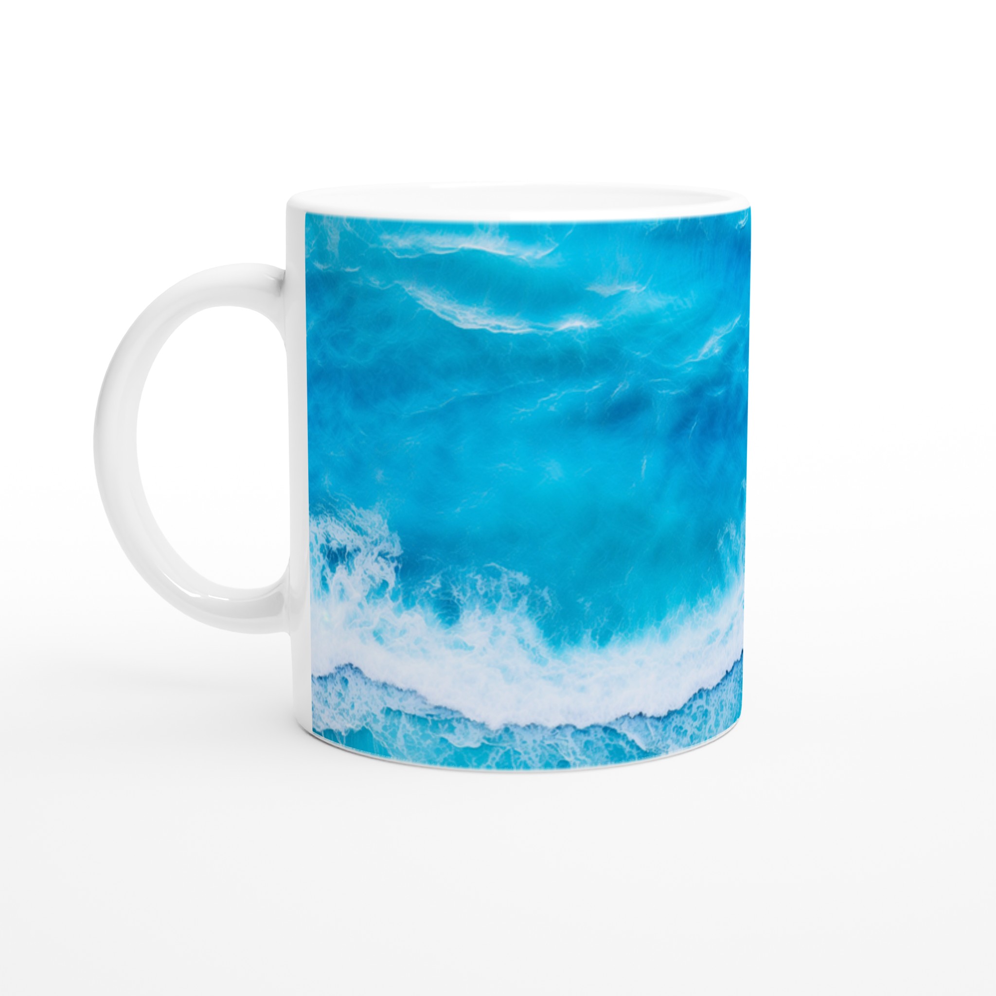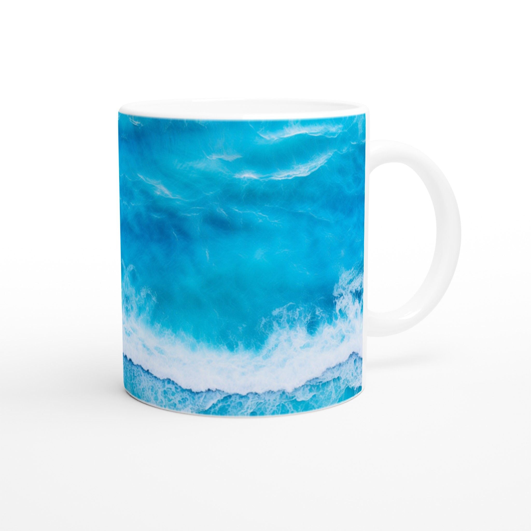 Låt dig svepas med av havets lugn med varje kopp! Denna Keramiska Mugg, prydd med ett hypnotiserande turkost vågmönster, är mer än bara en dryckesbehållare – den är en minivakuum till avkoppling. Perfekt för morgonkaffet, kvällens varma choklad eller när du bara vill njuta av en kopp te. Den blanka vita ytan gör att trycken framhävs med klara och levande färger, som håller sig fina även efter många turer i mikron och diskmaskinen.