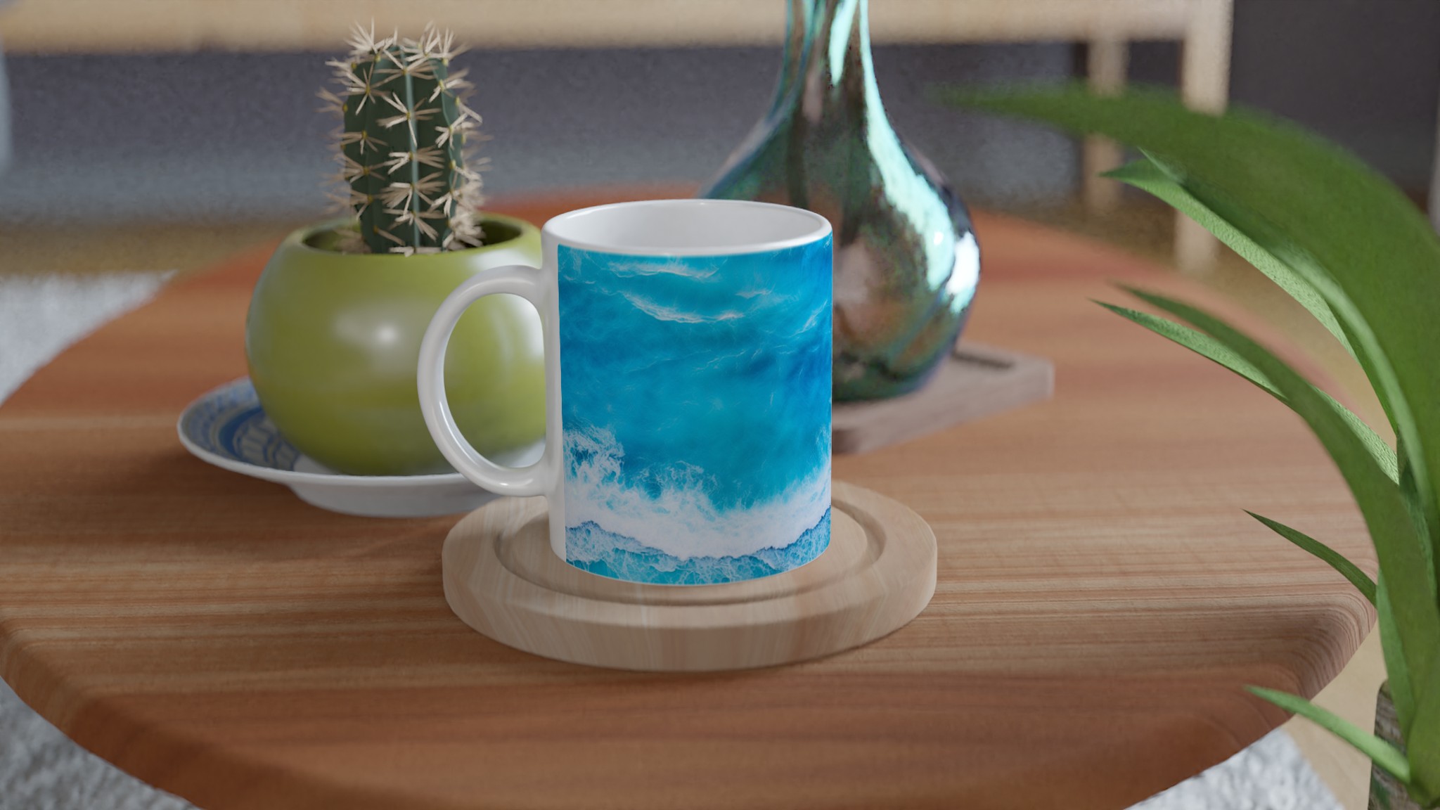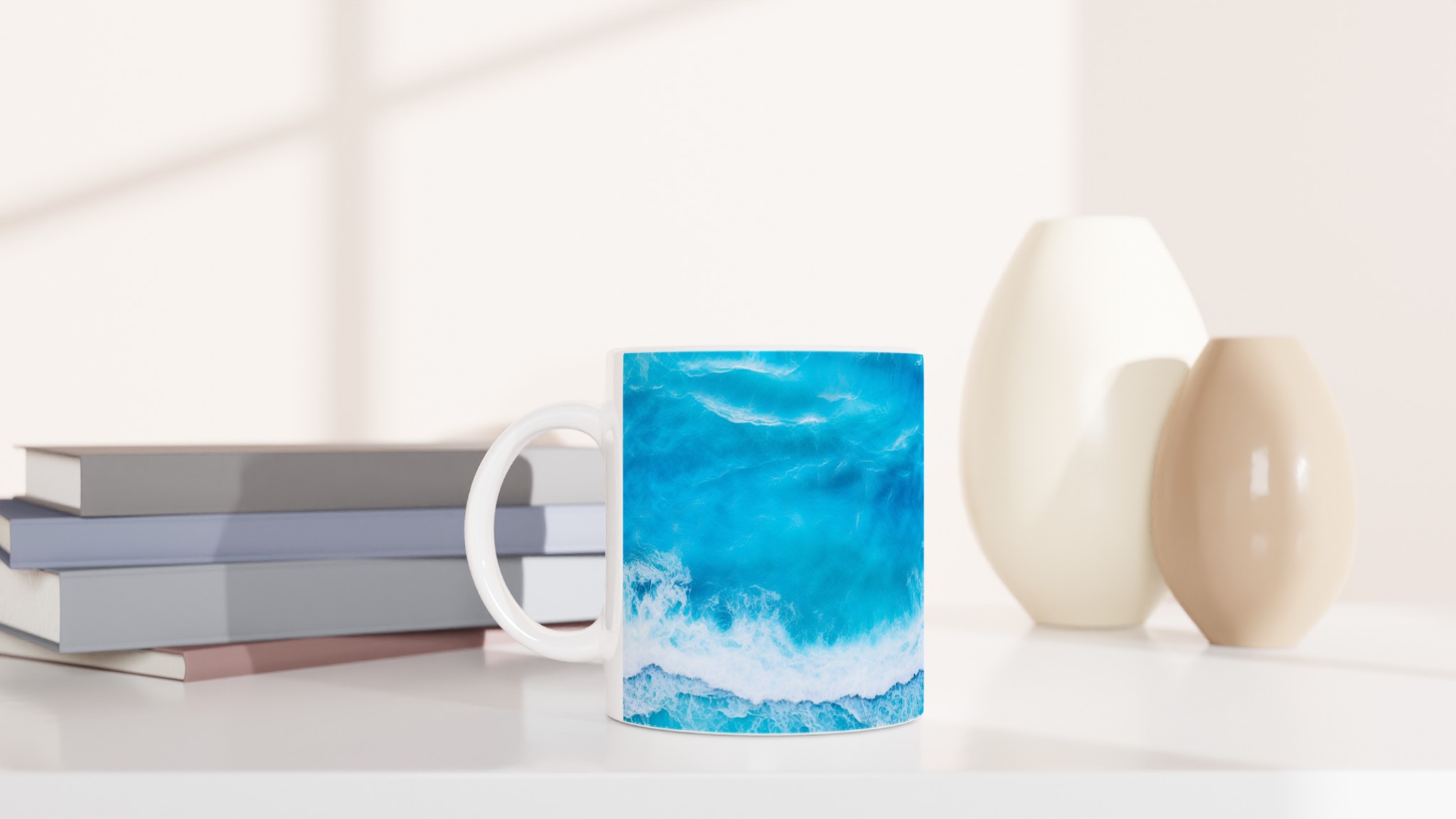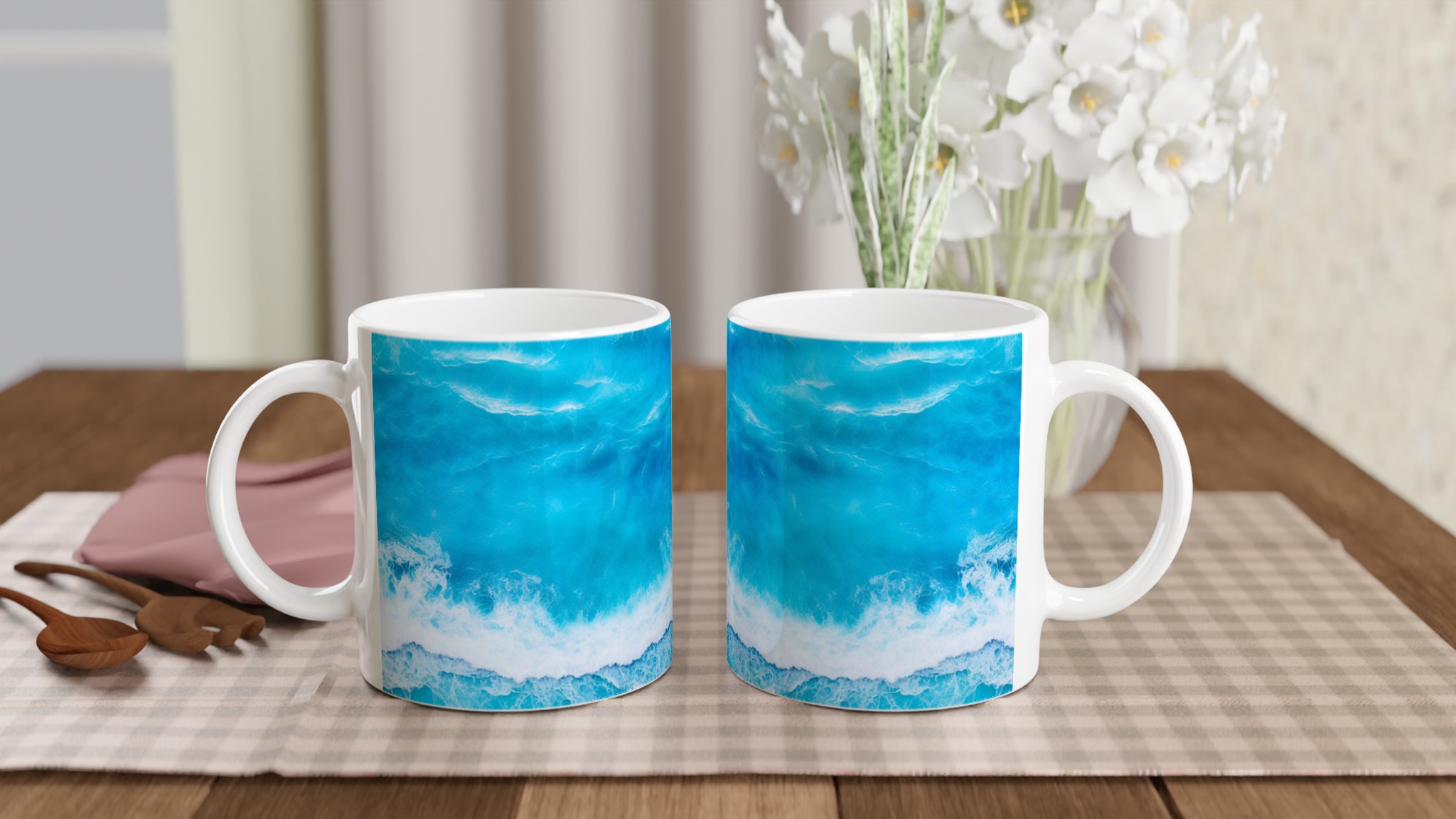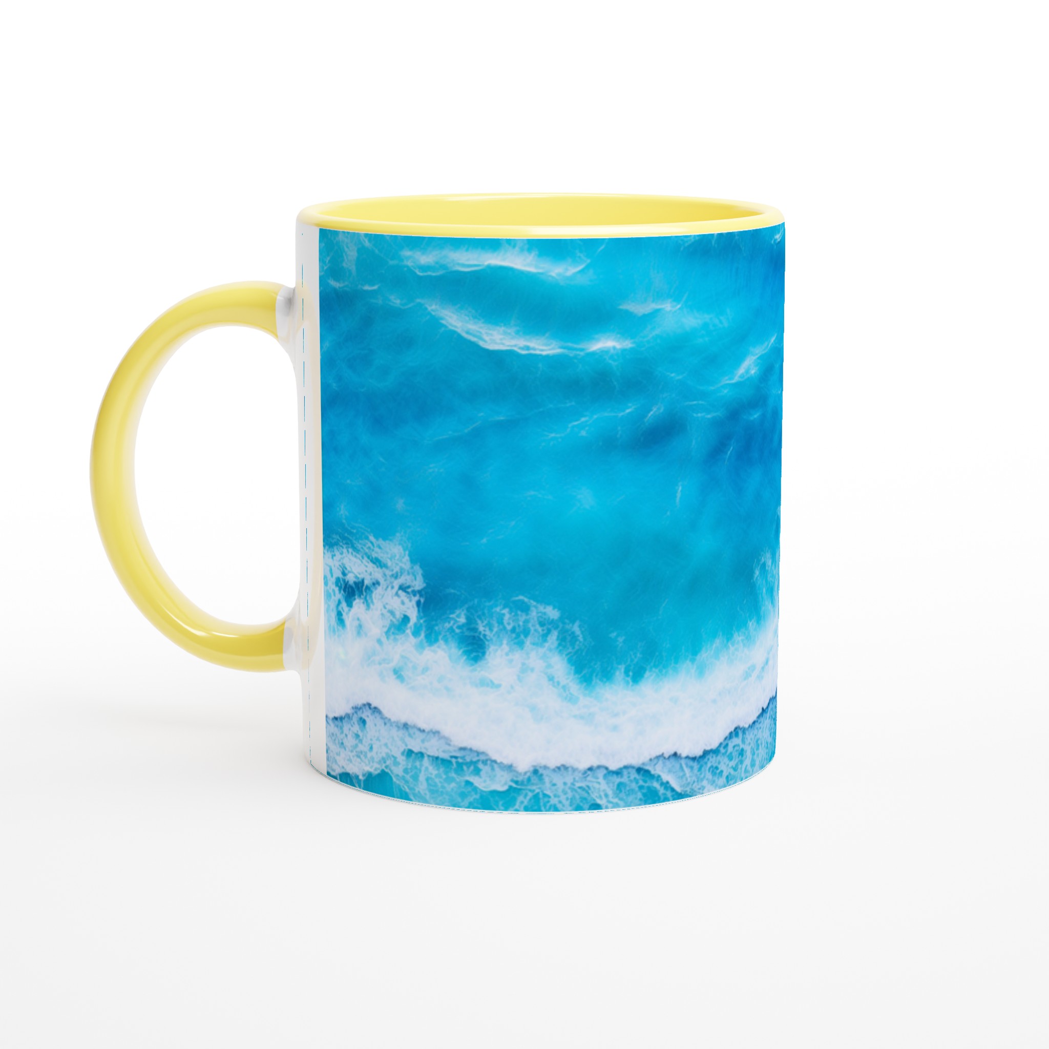 Låt dig svepas med av havets lugn med varje kopp! Denna Keramiska Mugg, prydd med ett hypnotiserande turkost vågmönster, är mer än bara en dryckesbehållare – den är en minivakuum till avkoppling. Perfekt för morgonkaffet, kvällens varma choklad eller när du bara vill njuta av en kopp te. Den blanka vita ytan gör att trycken framhävs med klara och levande färger, som håller sig fina även efter många turer i mikron och diskmaskinen.