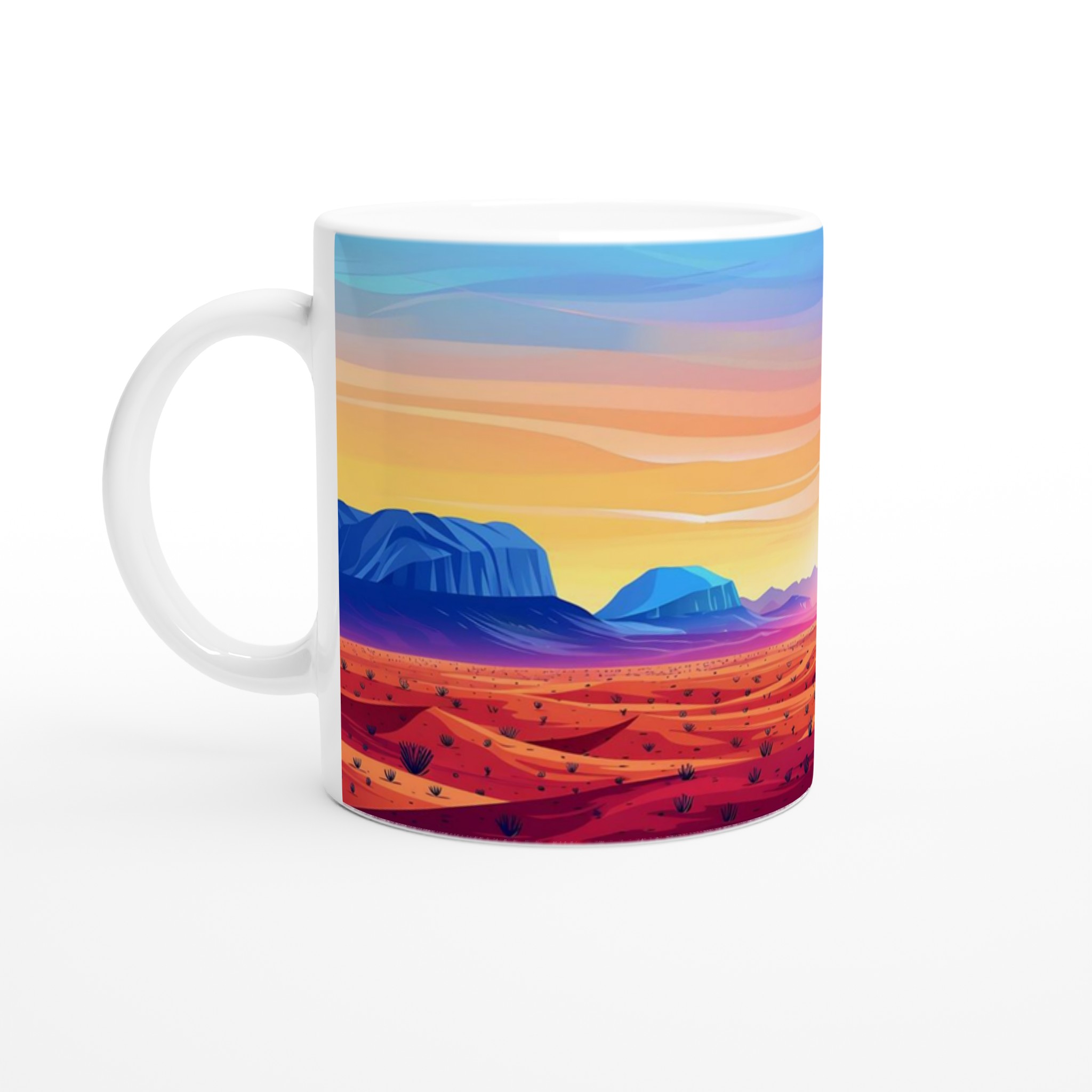 Inspirerad av den lugna skönheten hos en ökenmorgon med dess fantastiska färgövergångar, ger denna mugg en lugnande och färgstark start på din dag. Den blanka vita ytan ger ett skarpt och levande tryck som verkligen sticker ut, oavsett om det är en personlig design, ett roligt citat eller en present till någon du tycker om.
