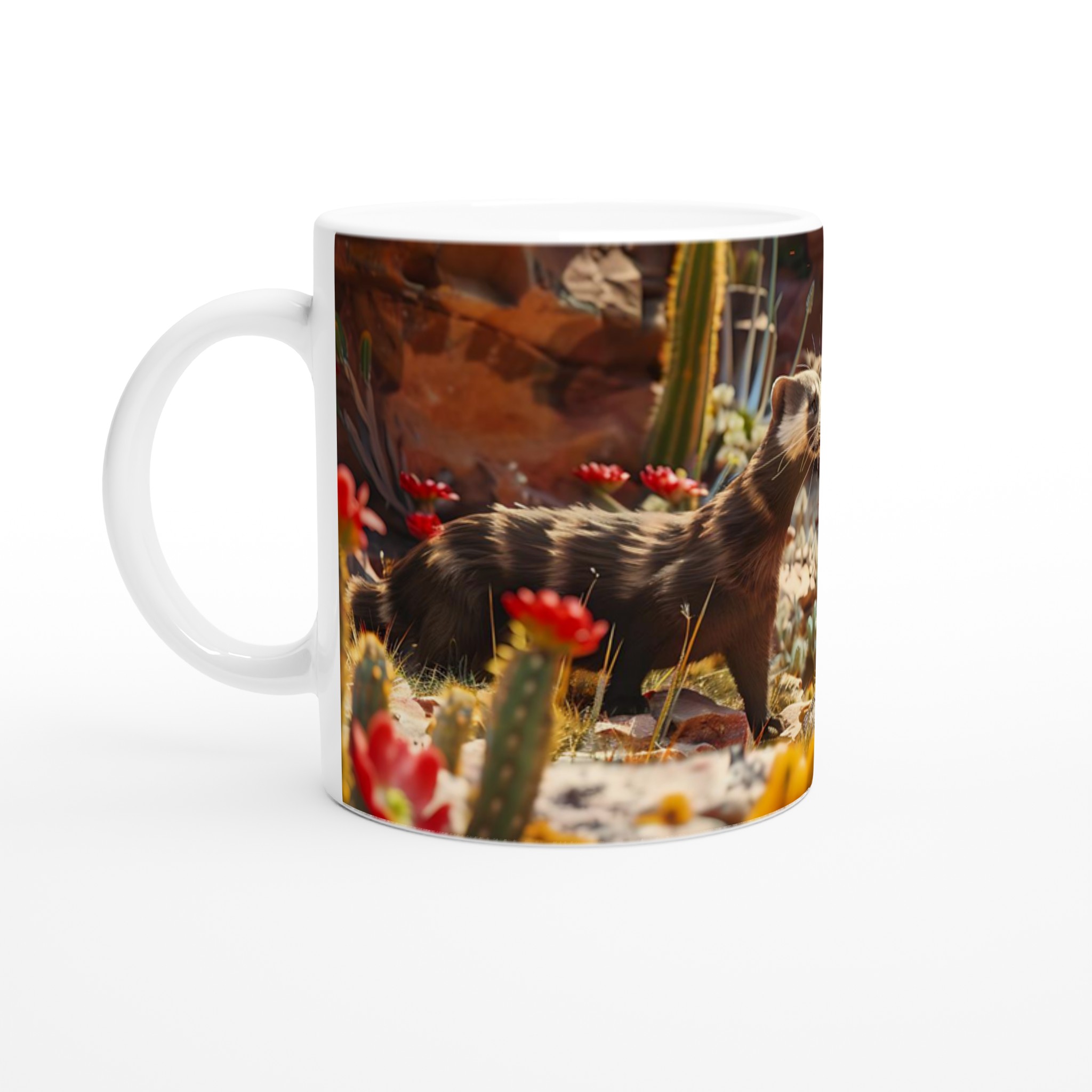 Lyft varje kaffestund med vår premium keramikmugg – stilren, hållbar och skapad för att låta ditt motiv glänsa. Denna mugg fångar den livfulla andan av en ökenvandring, med en charmig vessla bland blommande kaktusar under en solig himmel. Låt dig inspireras av naturens skönhet varje gång du tar en klunk.