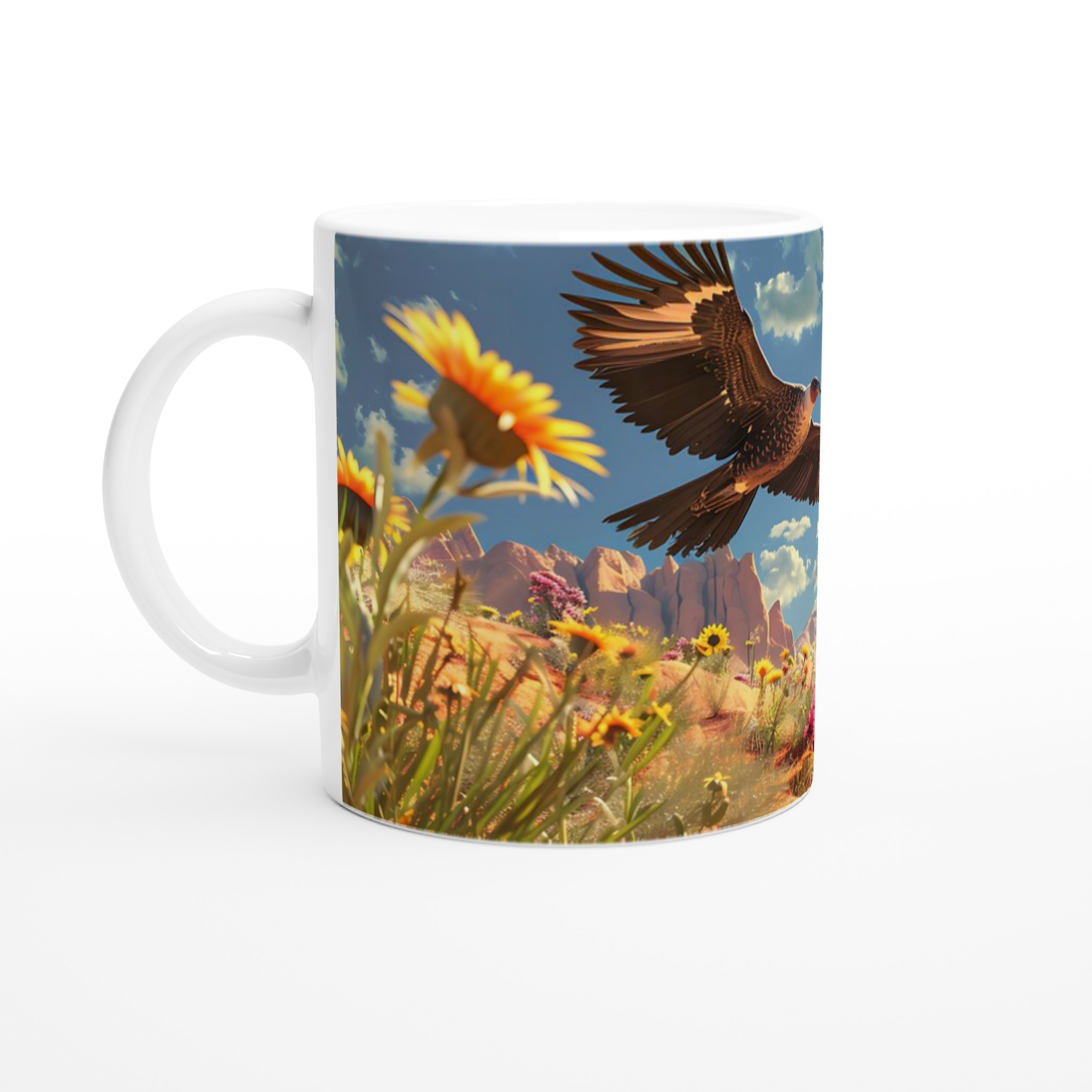 Inspirerad av den majestätiska örnen som svävar fritt över en livlig öken, där blommande kaktusar möter solvarma klippor, ger denna mugg en känsla av äventyr till din vardag. Den blanka ytan ger ett skarpt och levande tryck som verkligen sticker ut, oavsett om det är en personlig design, ett roligt citat eller en present till någon du tycker om.