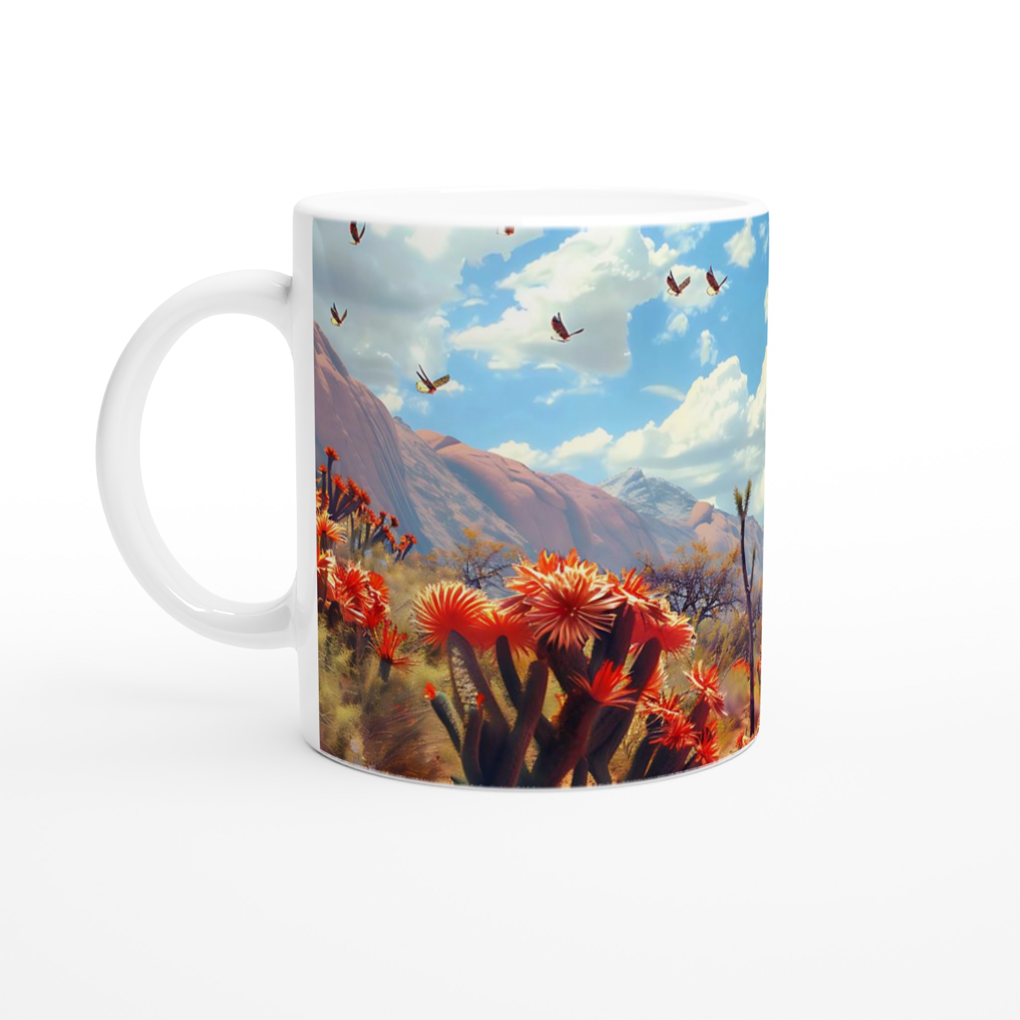 Inspirerad av den majestätiska skönheten i en ökenlandskap där en stolt örn svävar över blomstrande kaktusar under en klarblå himmel, fångar denna mugg äventyr och frihet. Den blanka vita ytan ger ett skarpt och levande tryck som verkligen sticker ut, oavsett om det är en personlig design, ett roligt citat eller en present till någon du tycker om.