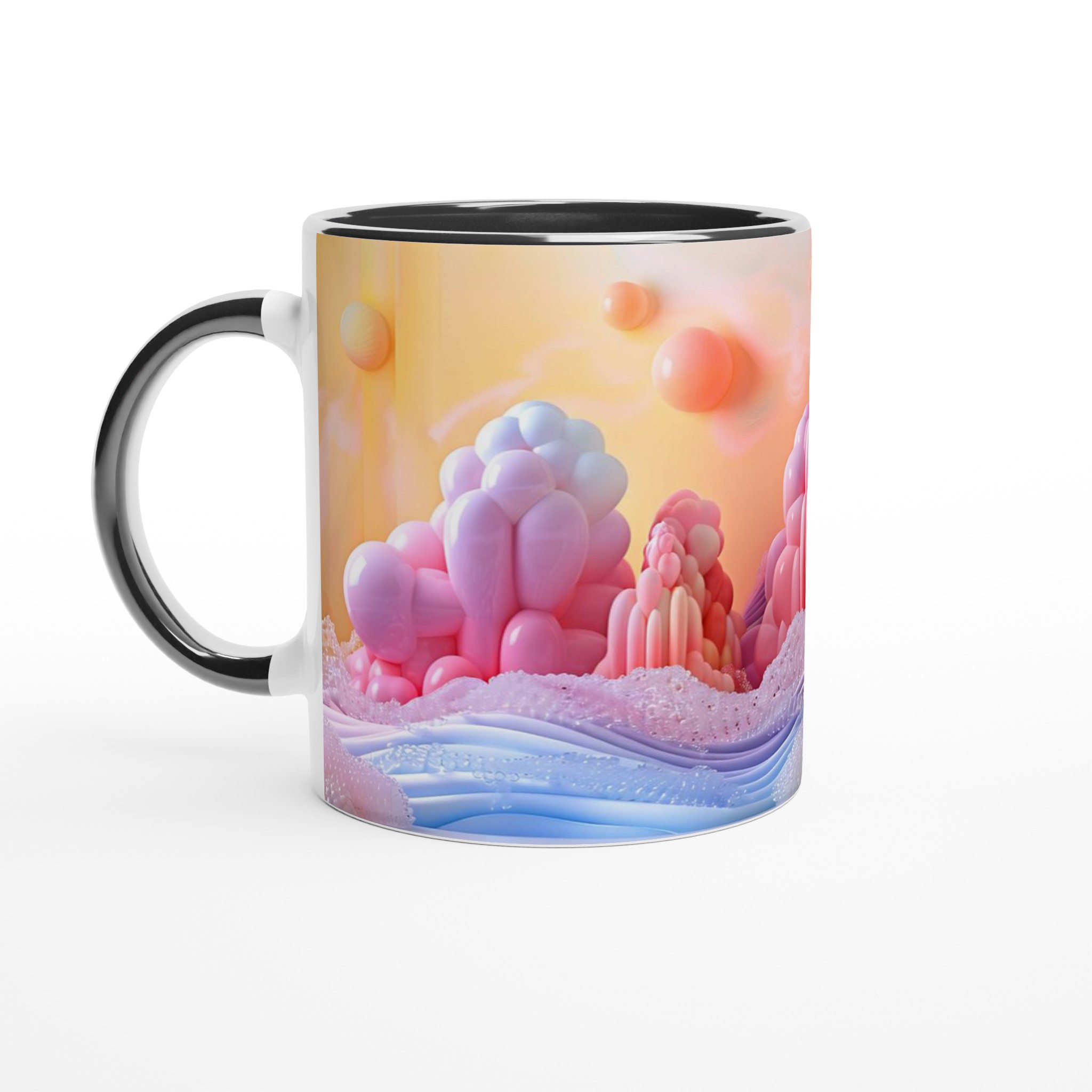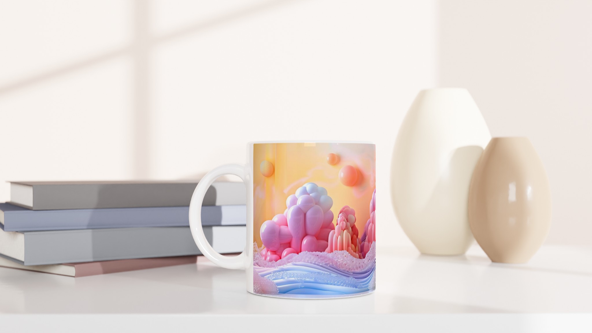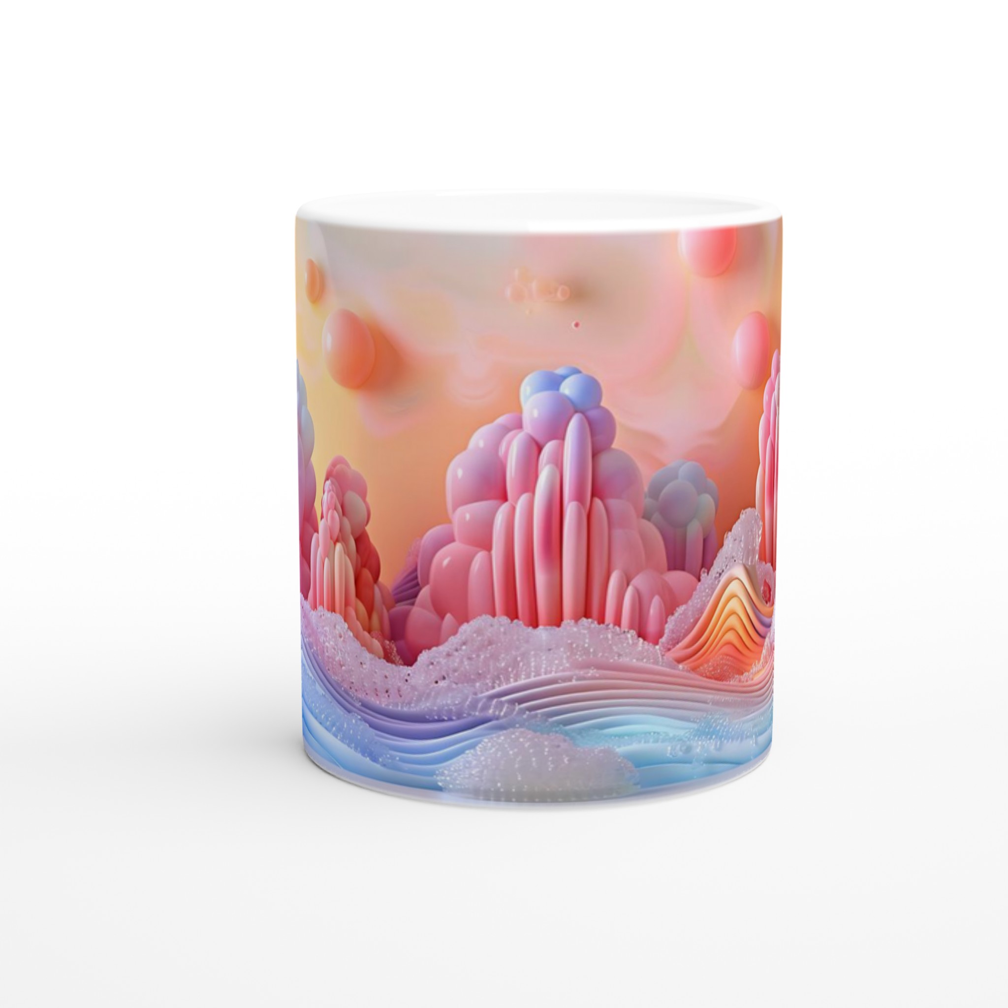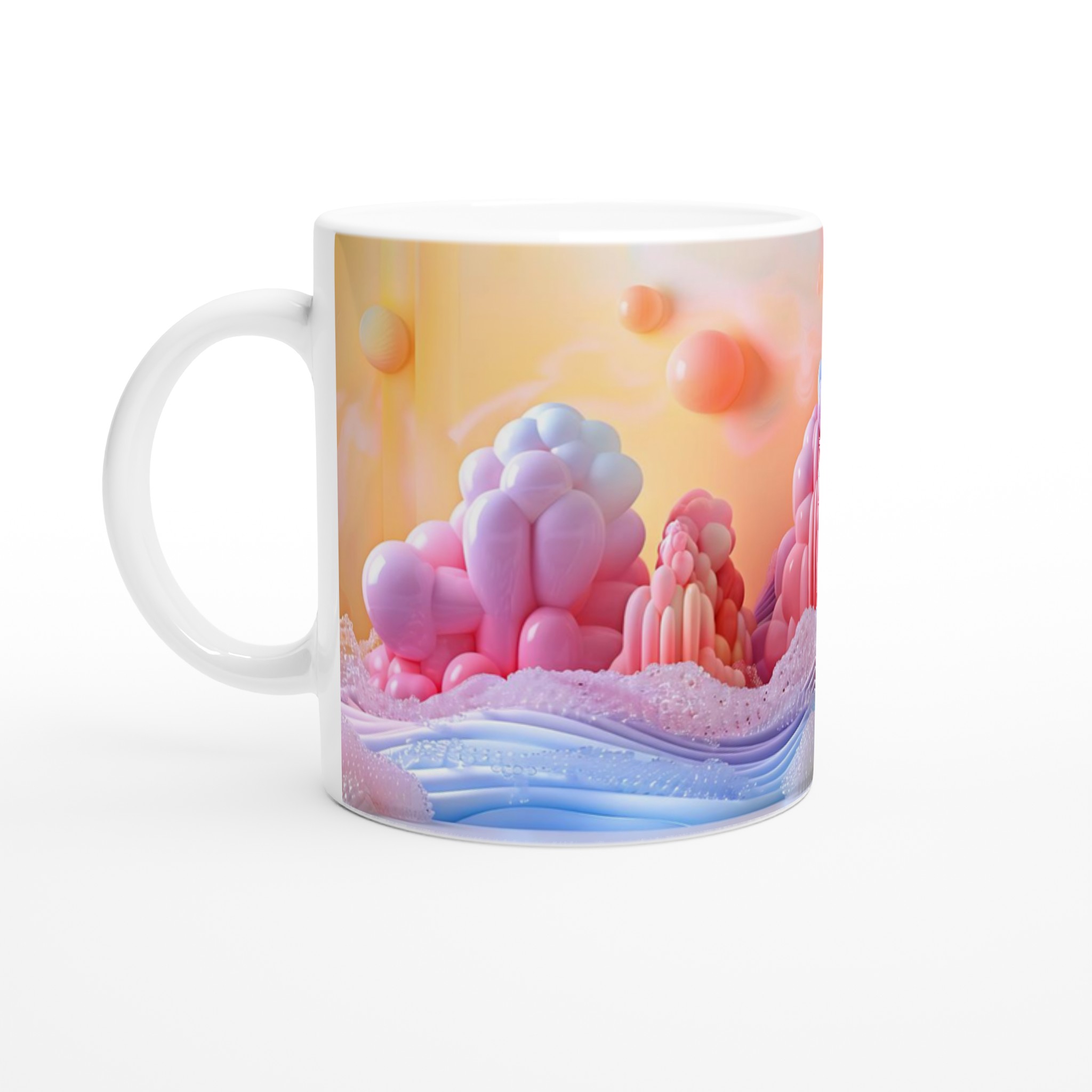 Kliv in i en värld av mjukhet och drömska nyanser med vår Pastell Keramiska Mugg. Inspirerad av bilden som för tankarna till ett lekfullt landskap av sockervadd och moln, blir denna mugg snabbt en vardagsfavorit. Perfekt för morgonkaffet, kvällens varma choklad eller när du bara vill njuta av en kopp te.
