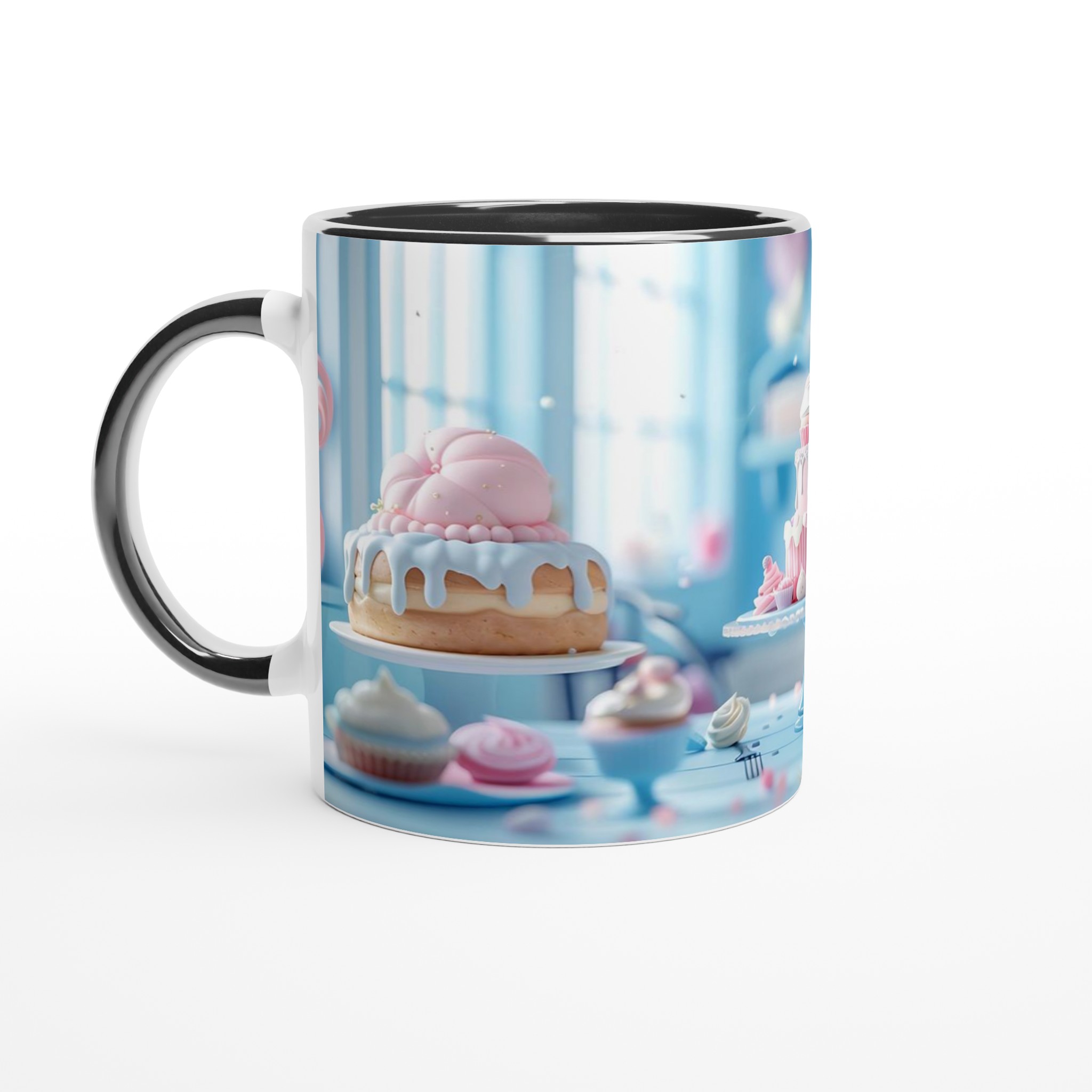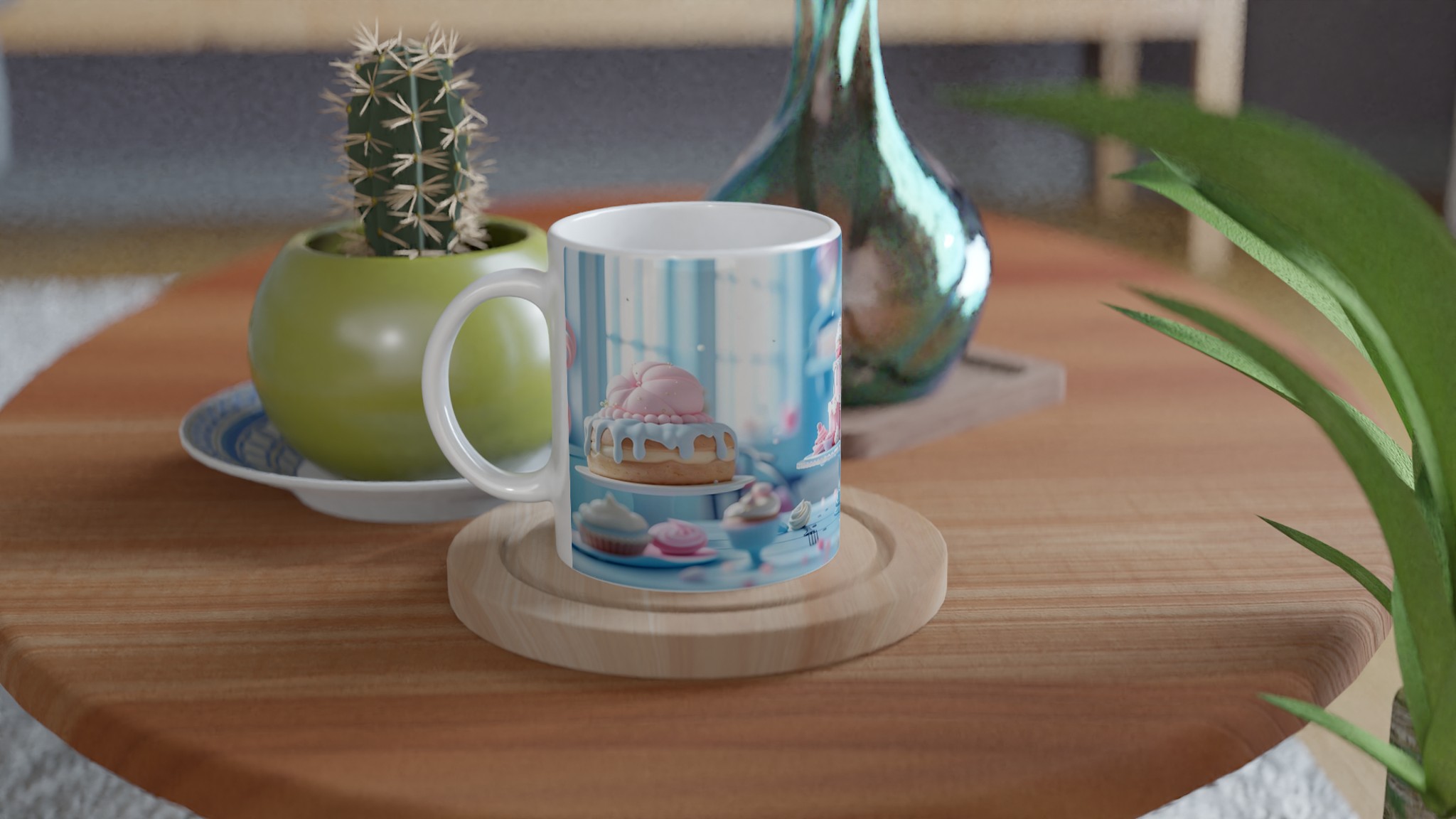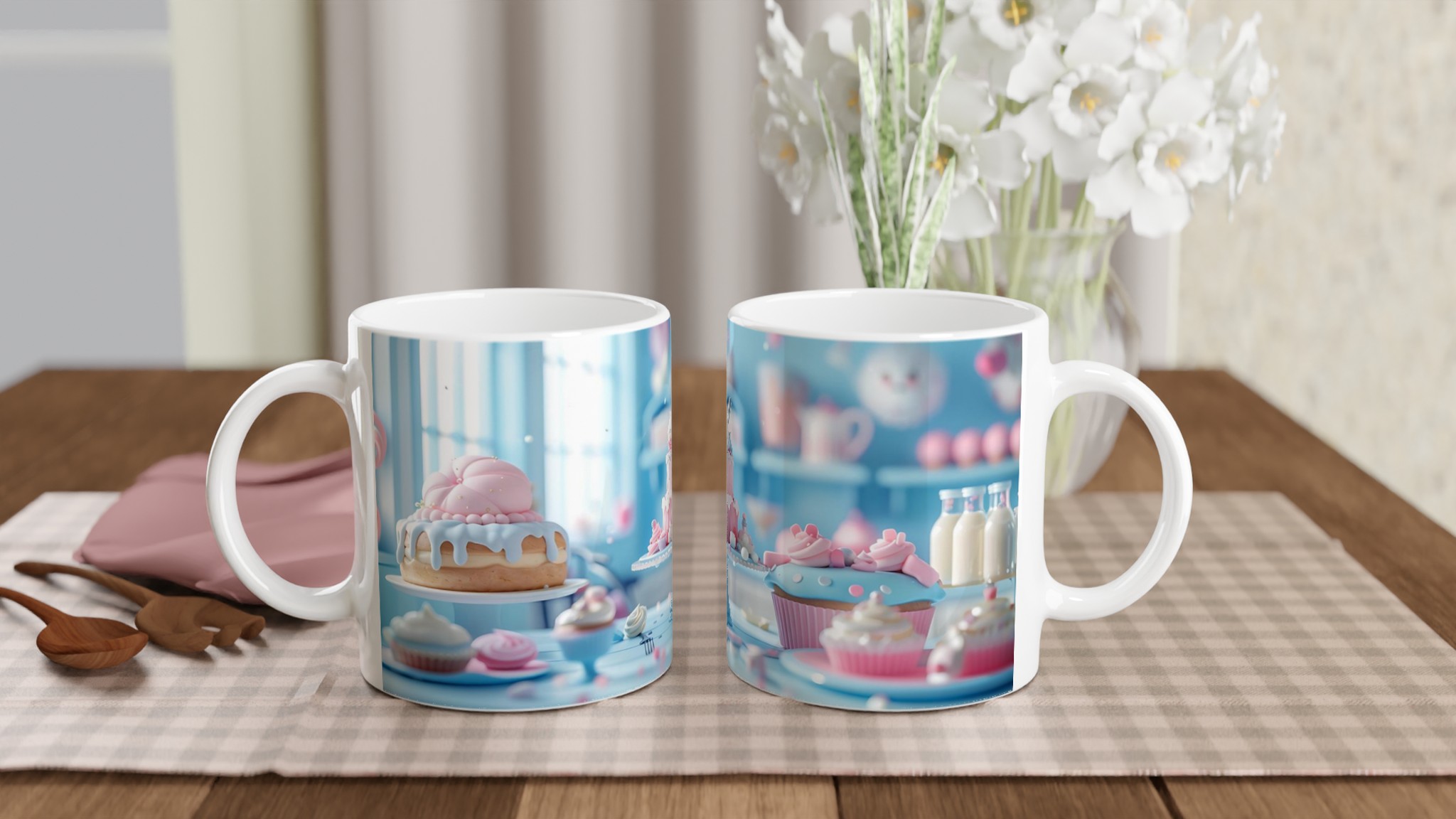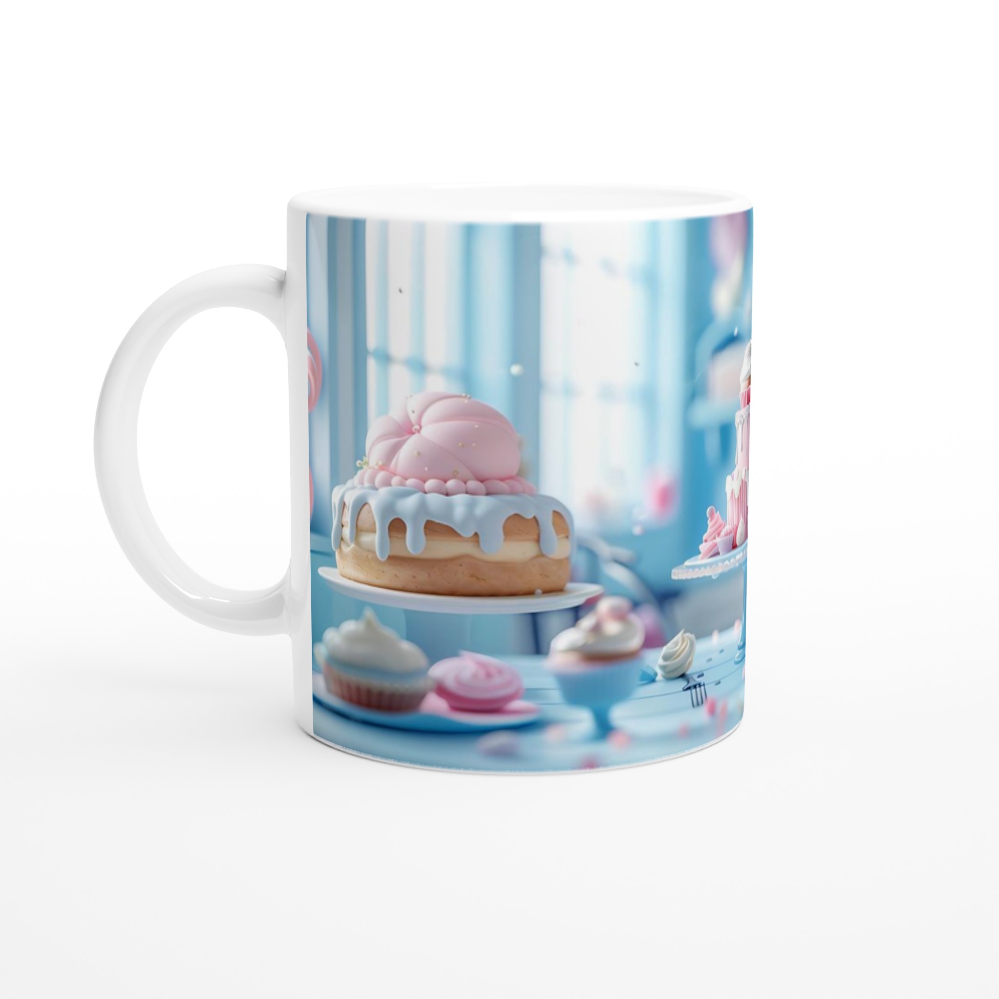 Väck din inre bakälskare med vår förtrollande pastellmugg! Den här stilrena keramiska muggen blir snabbt en vardagsfavorit. Inspirerad av ljuvliga bakverk i en drömsk palett av rosa och babyblått, tillför den en dos sötma till din fikastund. Perfekt för morgonkaffet, kvällens varma choklad eller när du bara vill njuta av en kopp te. Den blanka ytan framhäver tryck med klara och levande färger, som håller sig fina även efter många turer i mikron och diskmaskinen.