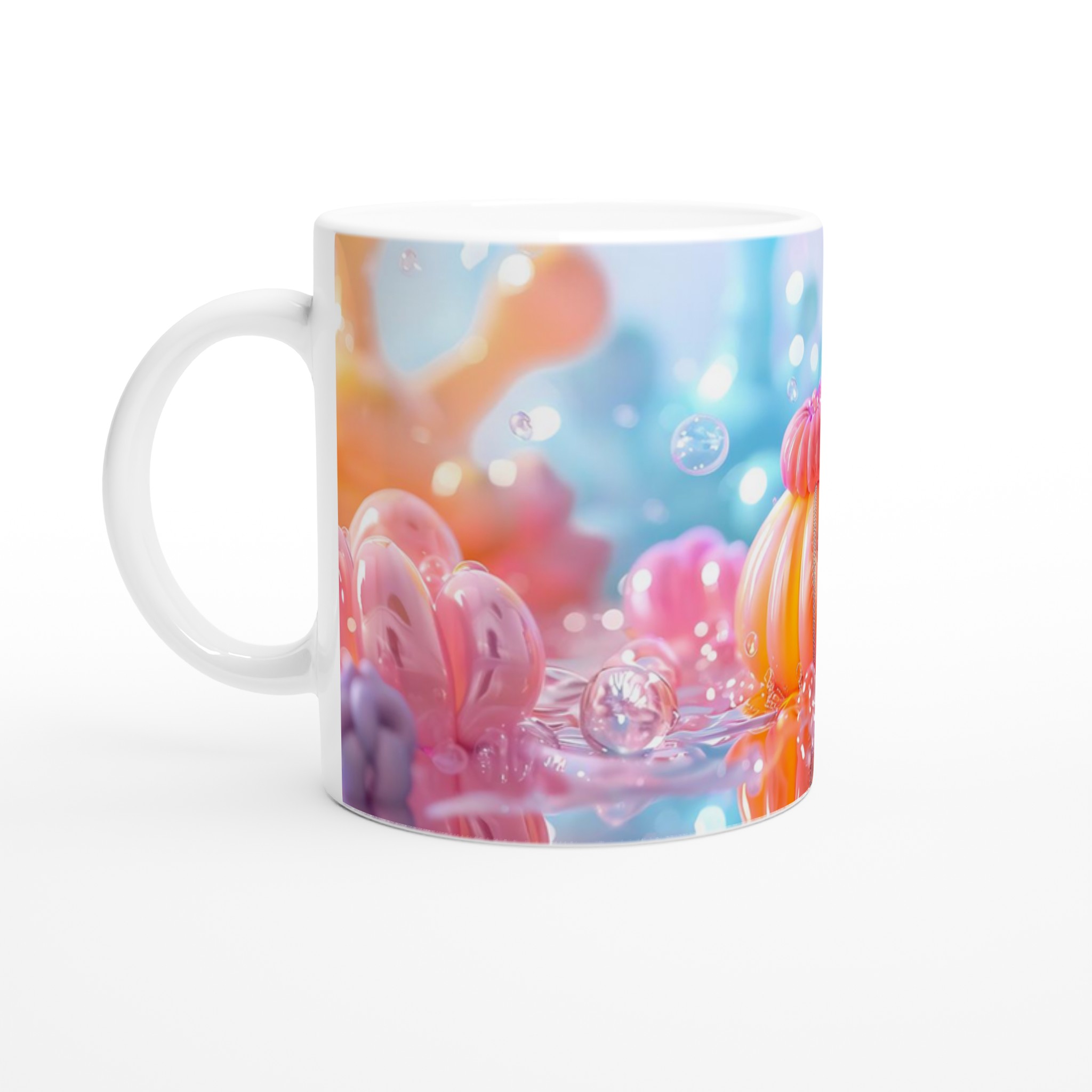 Inspirerad av den drömlika paletten av pastellfärger och glittrande bubblor, bjuder denna mugg in till en stund av lugn och glädje med varje klunk. Den blanka vita ytan ger ett skarpt och levande tryck som verkligen sticker ut, oavsett om det är en personlig design, ett roligt citat eller en present till någon du tycker om.