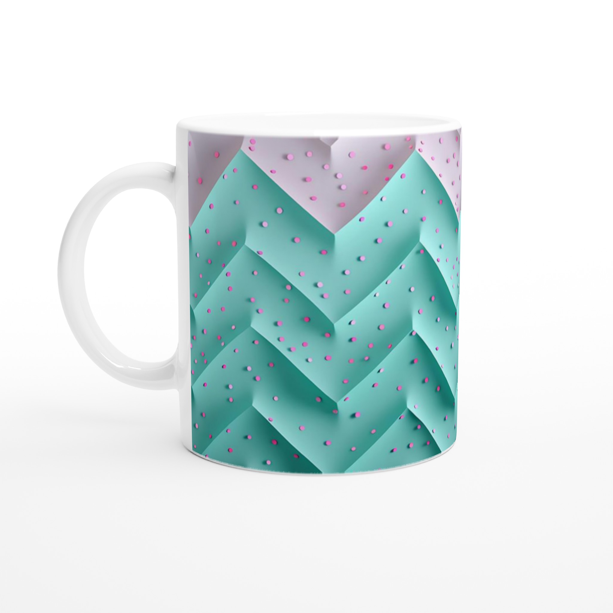 Vår Pastell Popp-mugg är inspirerad av bilden, med dess lekfulla ”vågiga” mönster i lugna pastelltoner av mintgrönt och vitt, prydd med livliga rosa prickar. Denna design är perfekt för dig som älskar en touch av glädje och modern estetik. Låt din personlighet stråla med ett tryck som smälter samman med denna unika bakgrund. Muggen är tillverkad av högkvalitativ keramik som tål både diskmaskin och mikrovågsugn utan att tappa färg eller glans. Den håller formen och färgerna tvätt efter tvätt – en riktig vardagsfavorit som består.