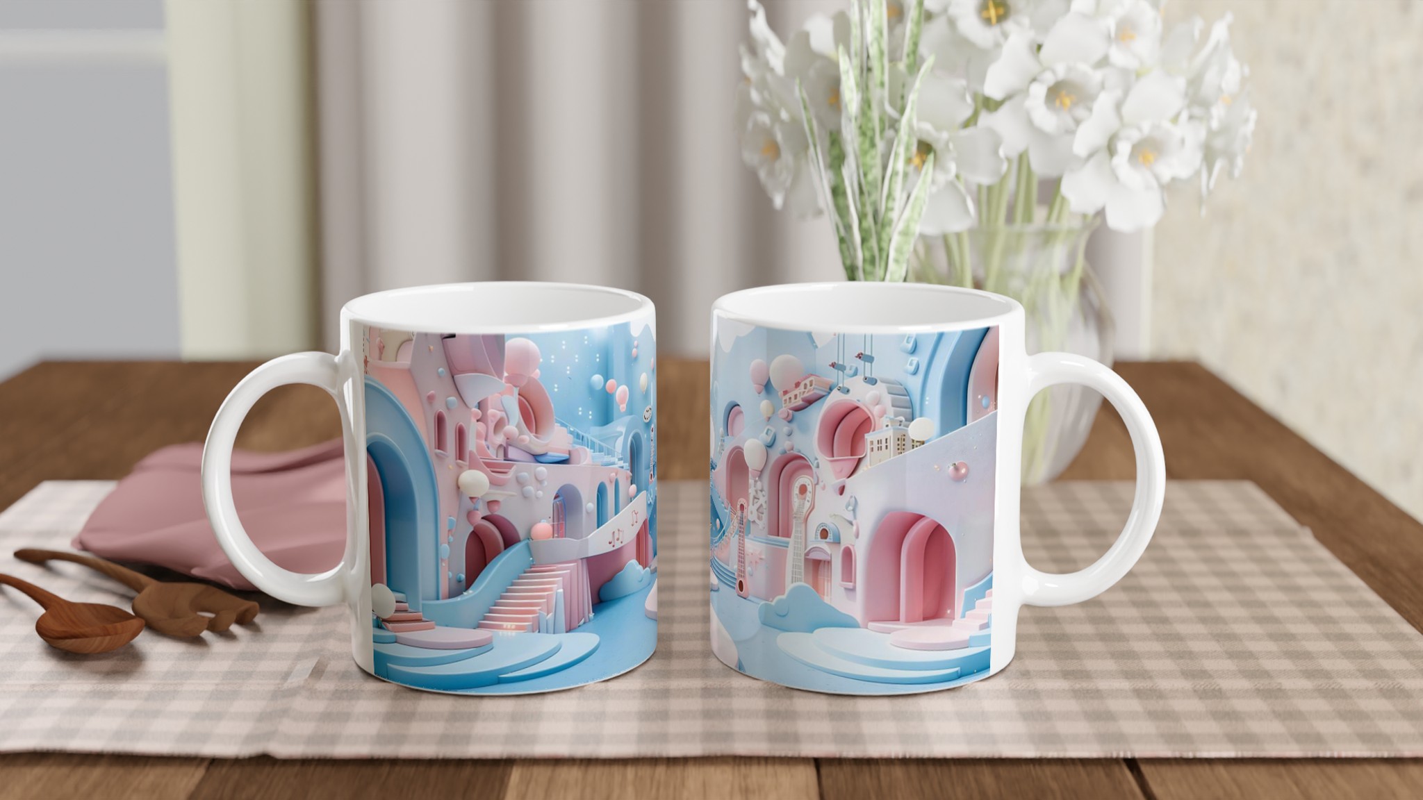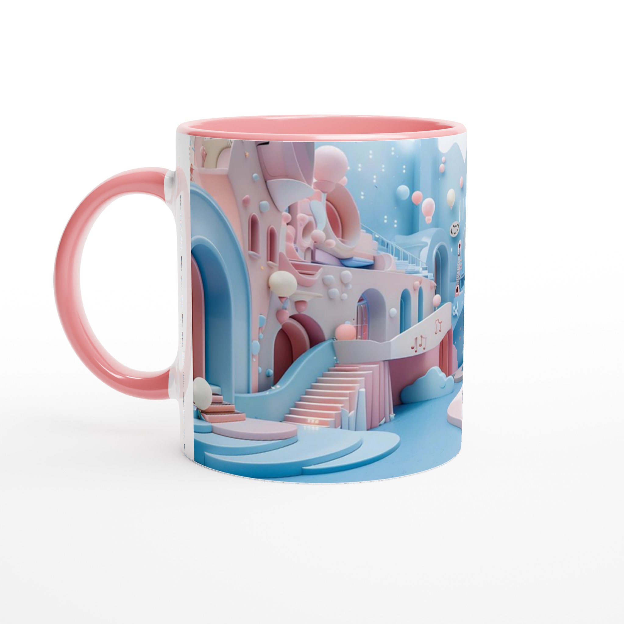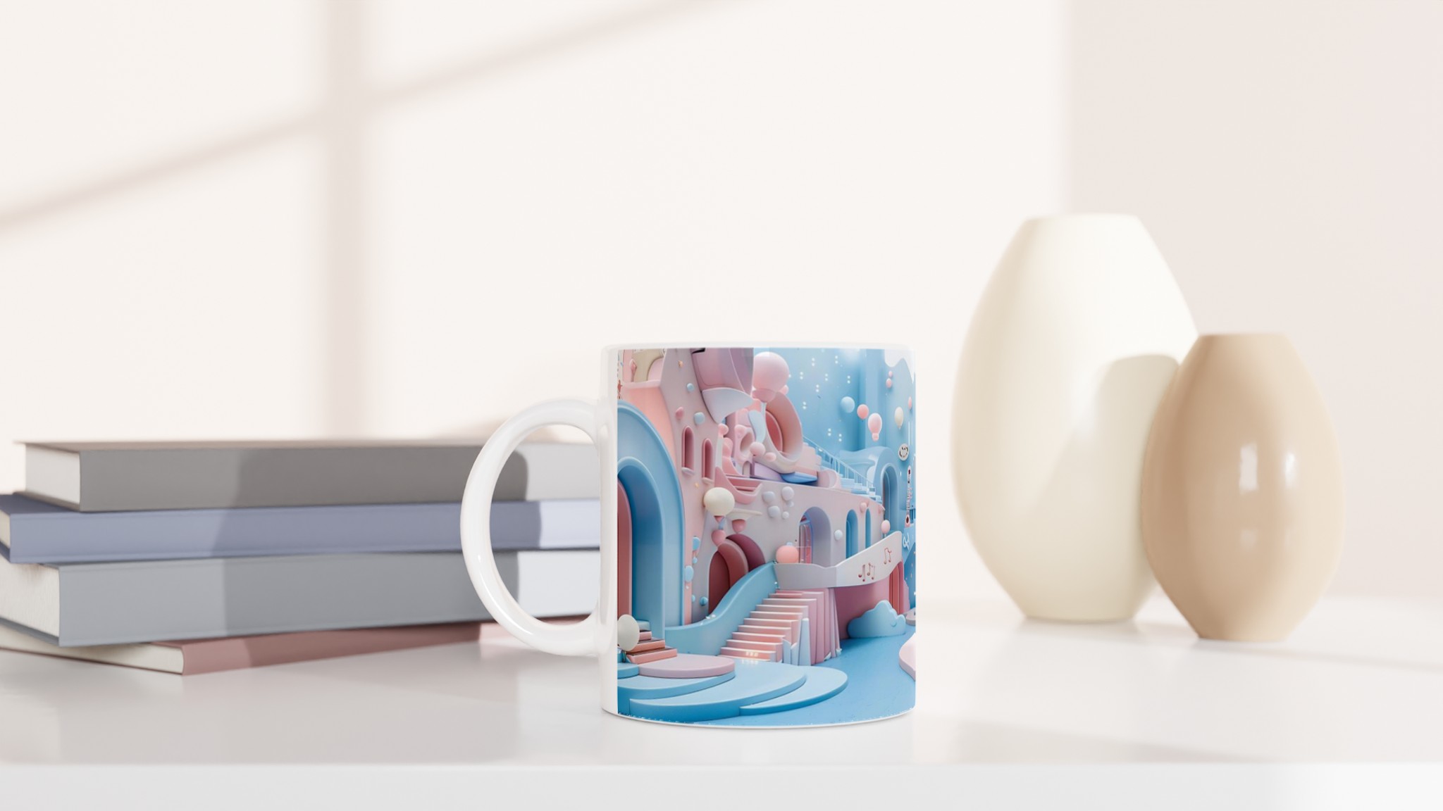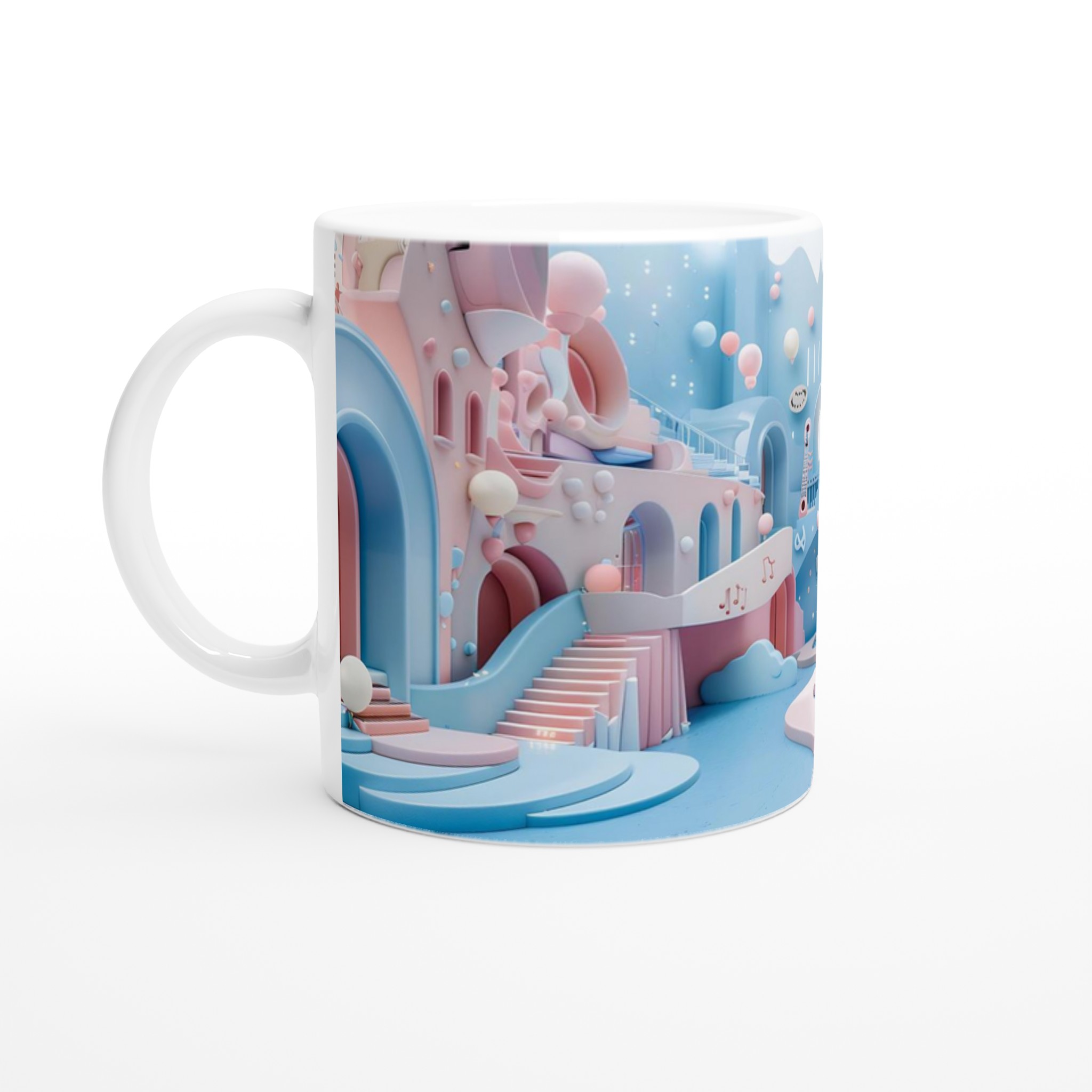 Stig in i en drömvärld varje gång du tar en klunk med denna förtrollande keramiska mugg. Med inspiration från sagolika landskap i mjuka pastelltoner av rosa och blått, förvandlar denna mugg din fikastund till en magisk upplevelse. Perfekt för morgonkaffet, kvällens varma choklad eller när du bara vill njuta av en kopp te och låta tankarna vandra till en lekfull och harmonisk plats. Den blanka ytan framhäver trycken med klara och levande färger, som håller sig fina även efter många turer i mikron och diskmaskinen.