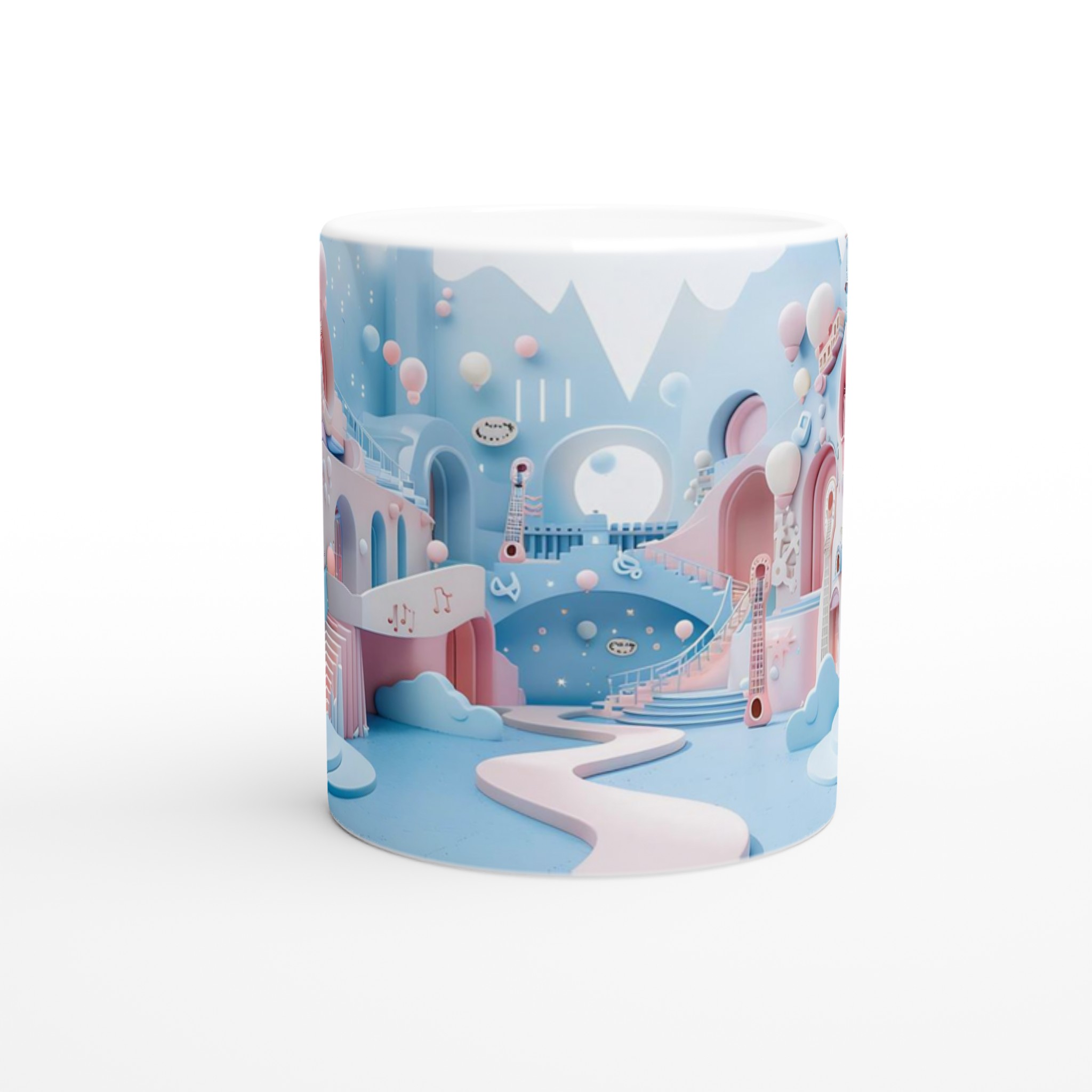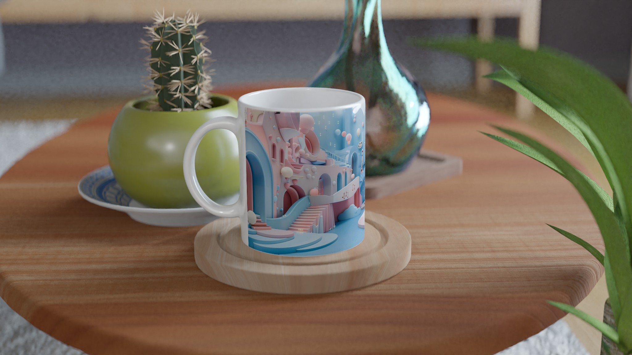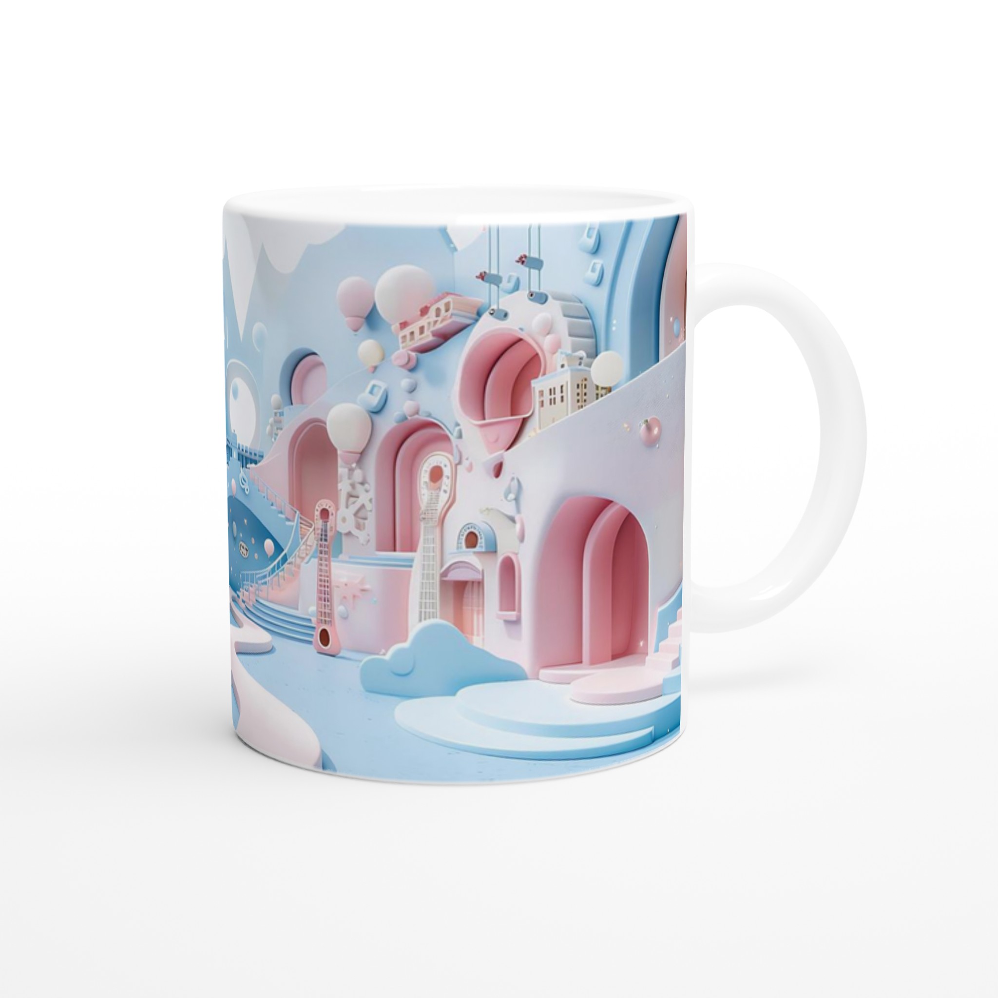 Stig in i en drömvärld varje gång du tar en klunk med denna förtrollande keramiska mugg. Med inspiration från sagolika landskap i mjuka pastelltoner av rosa och blått, förvandlar denna mugg din fikastund till en magisk upplevelse. Perfekt för morgonkaffet, kvällens varma choklad eller när du bara vill njuta av en kopp te och låta tankarna vandra till en lekfull och harmonisk plats. Den blanka ytan framhäver trycken med klara och levande färger, som håller sig fina även efter många turer i mikron och diskmaskinen.