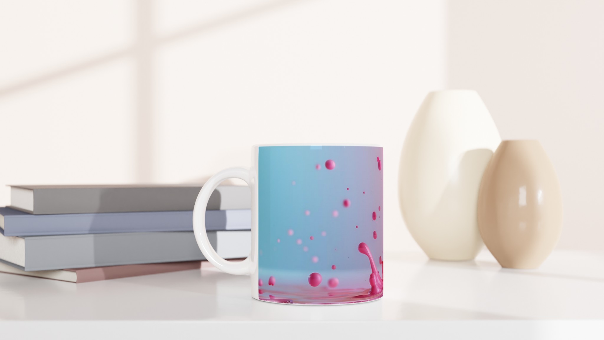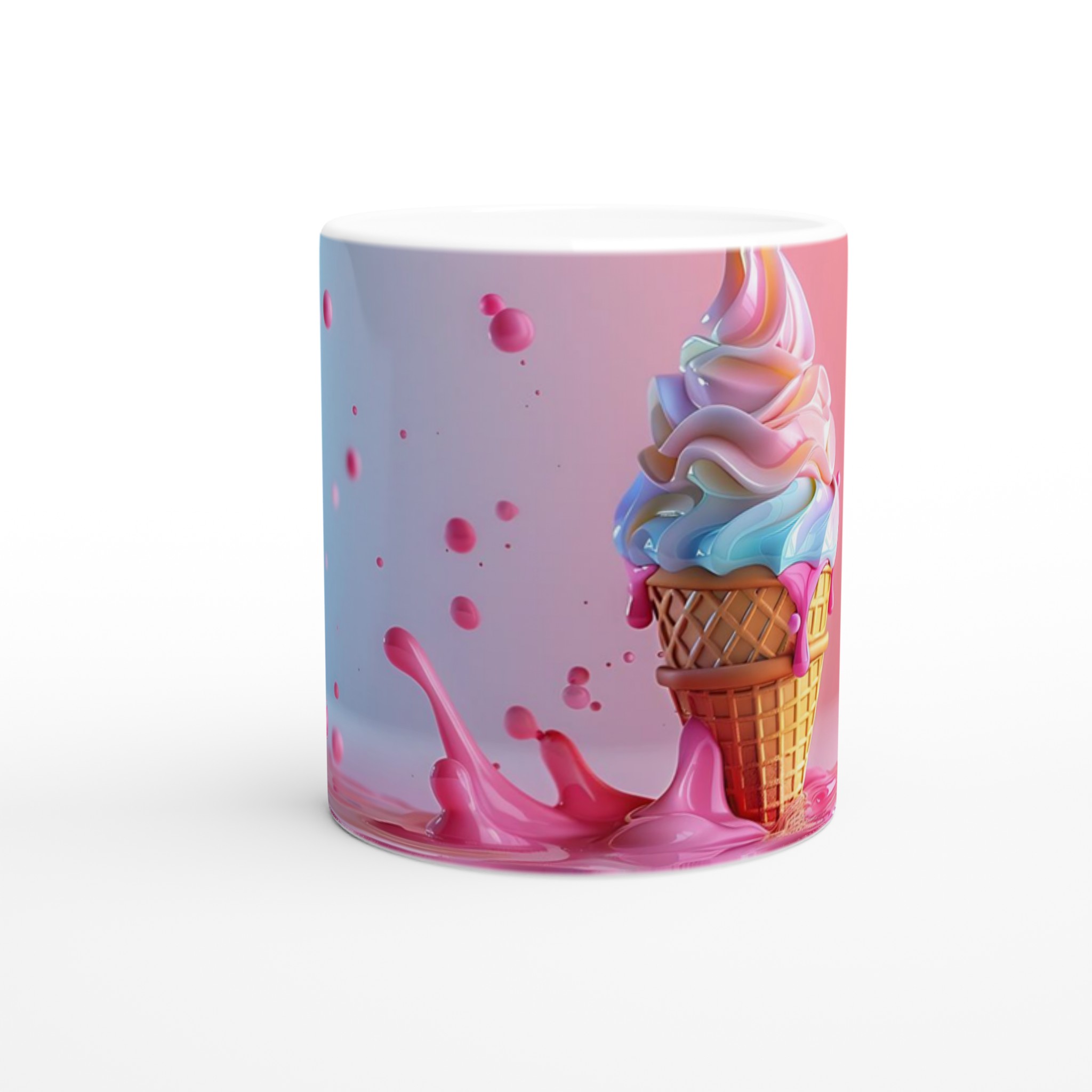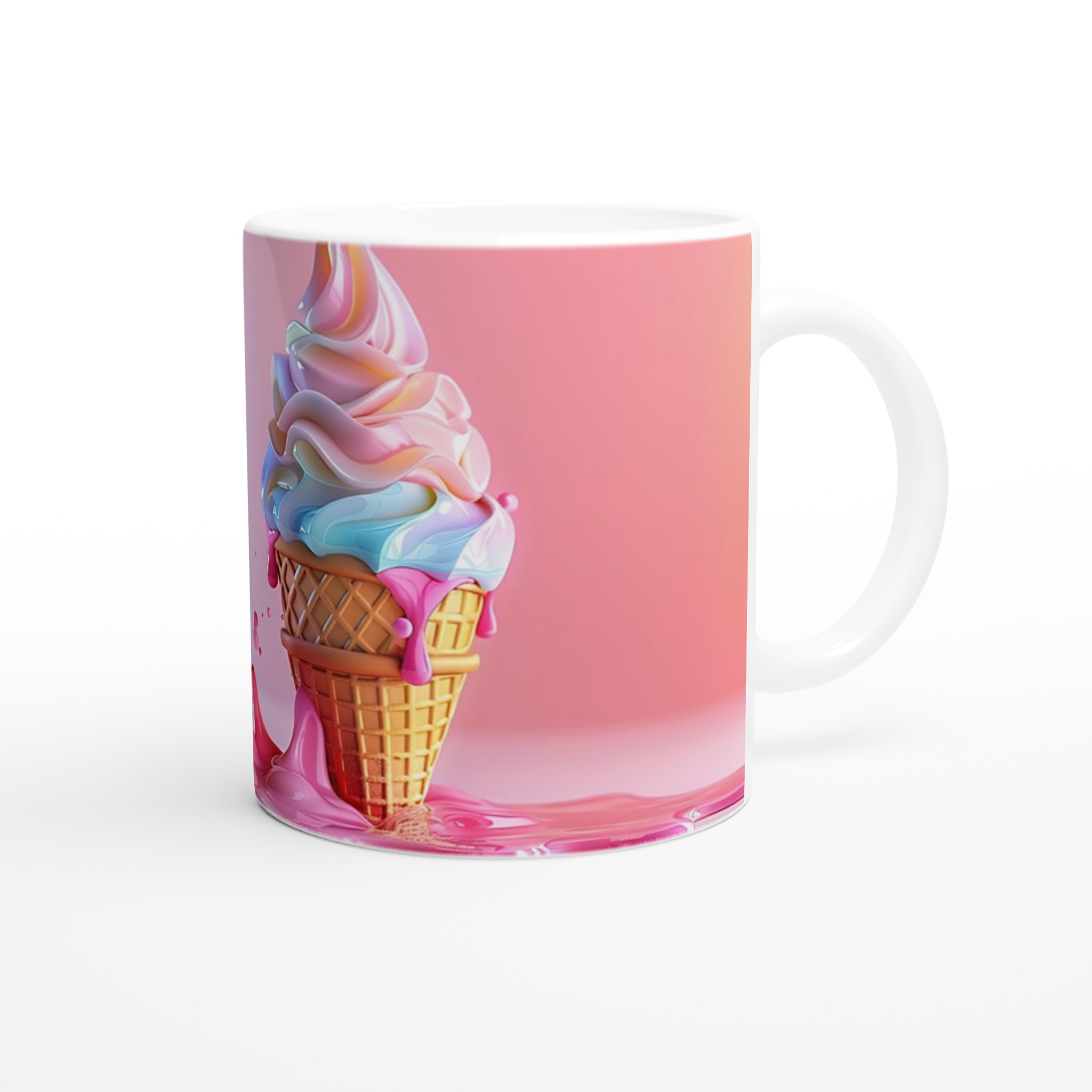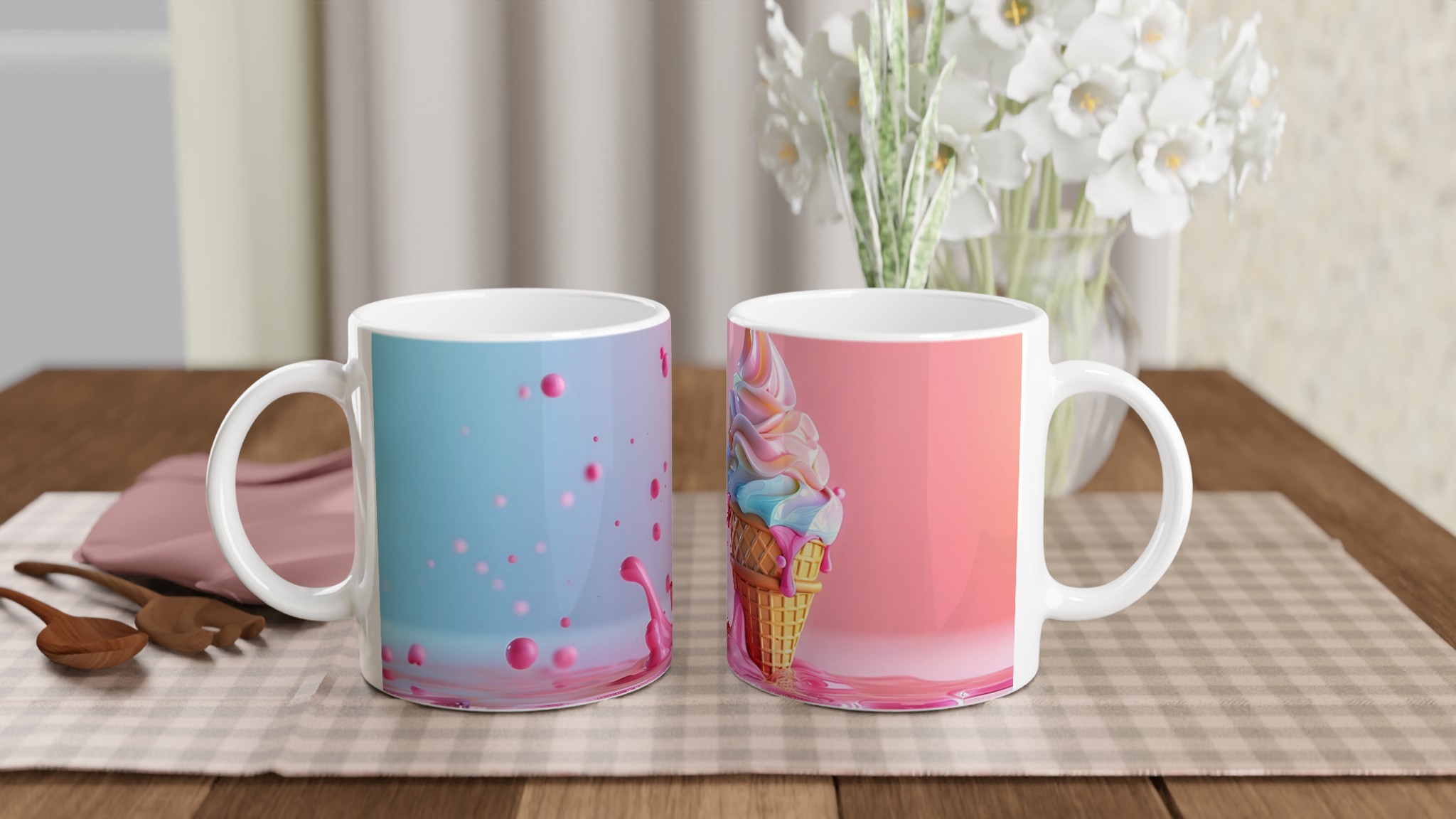 Fånga den lekfulla magin från pastellfärgad glass och en skvätt av sommarglädje med denna charmiga keramikmugg. Inspirerad av bilden av mjukglassens ljuva nyanser och den sprudlande energin från rosa stänk, är denna mugg designad för att bringa en känsla av glädje och lätthet till din dag. Den är perfekt för alla dagens stunder – morgonkaffet, en värmande kopp te eller en härlig varm choklad. Den blanka vita ytan gör att trycken framträder klart och färgstarkt, vilket gör muggen till en riktig favorit i vardagen.
